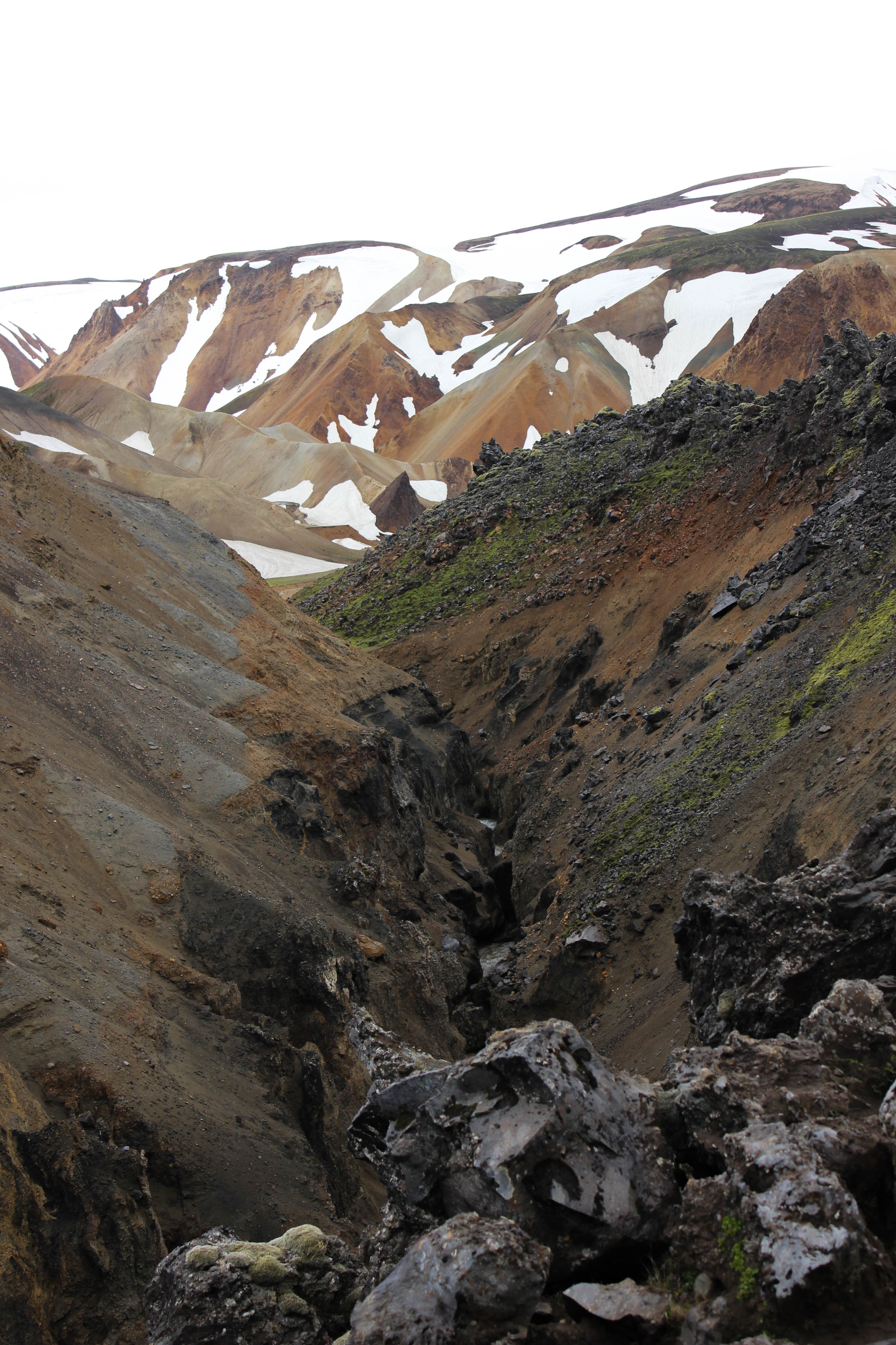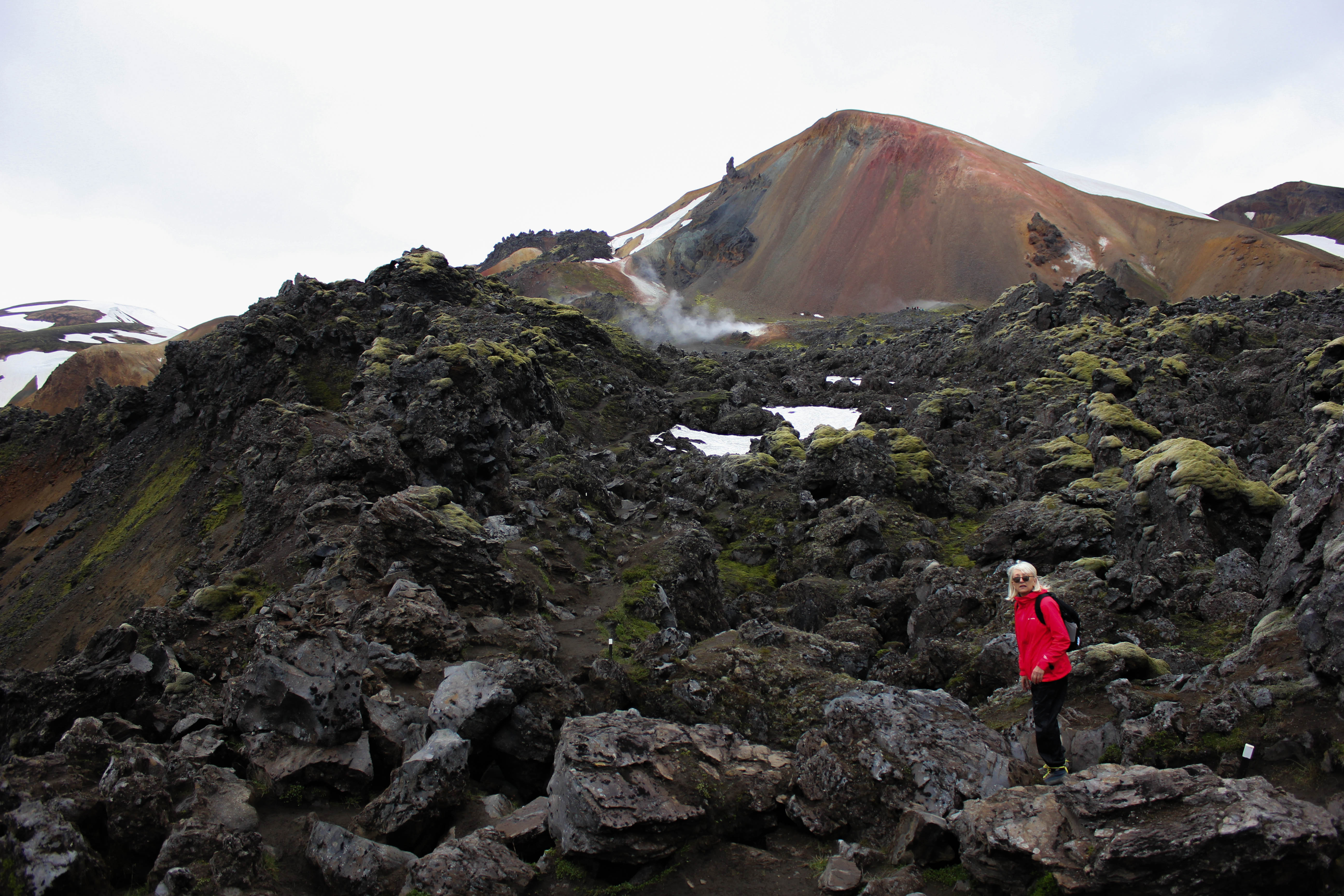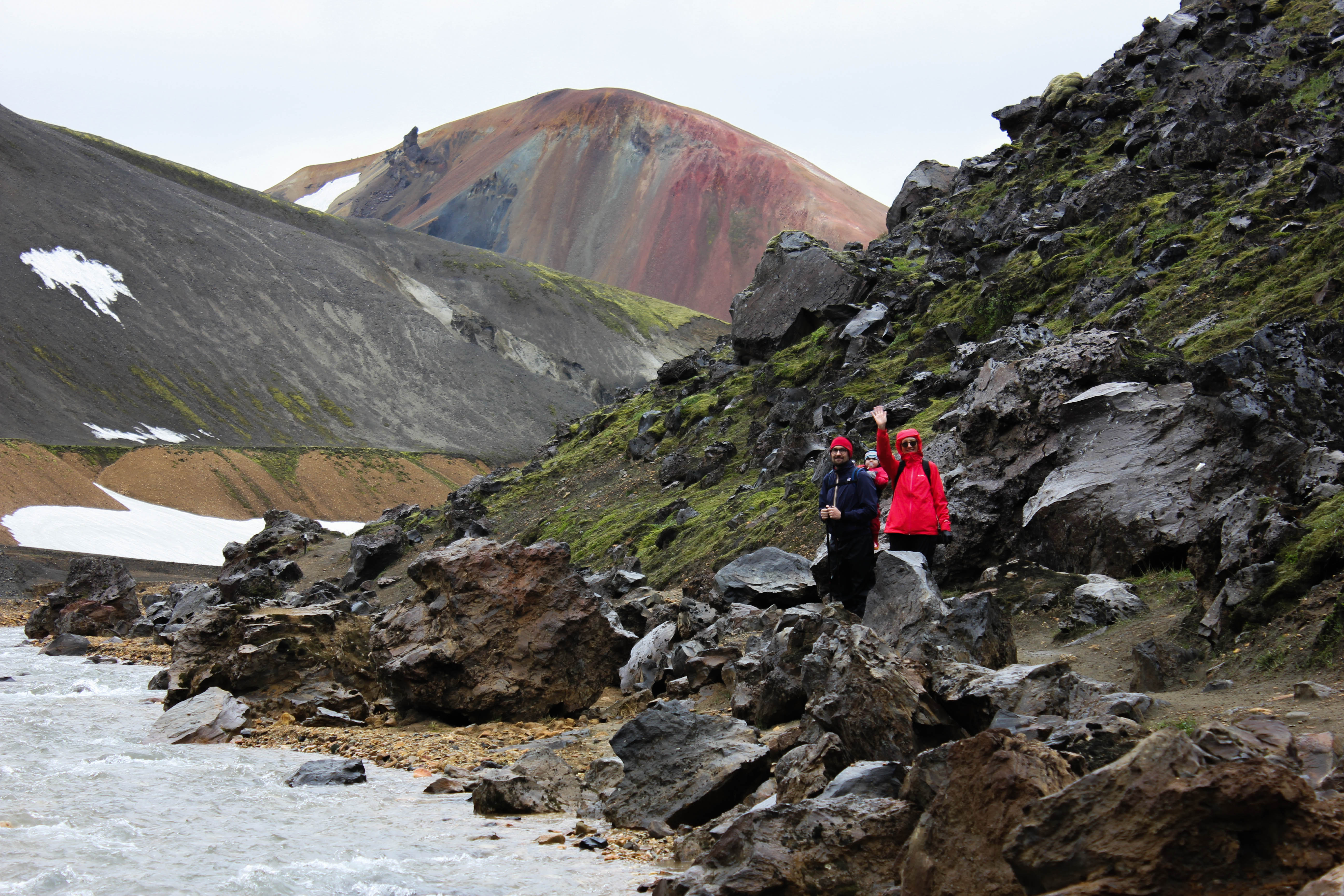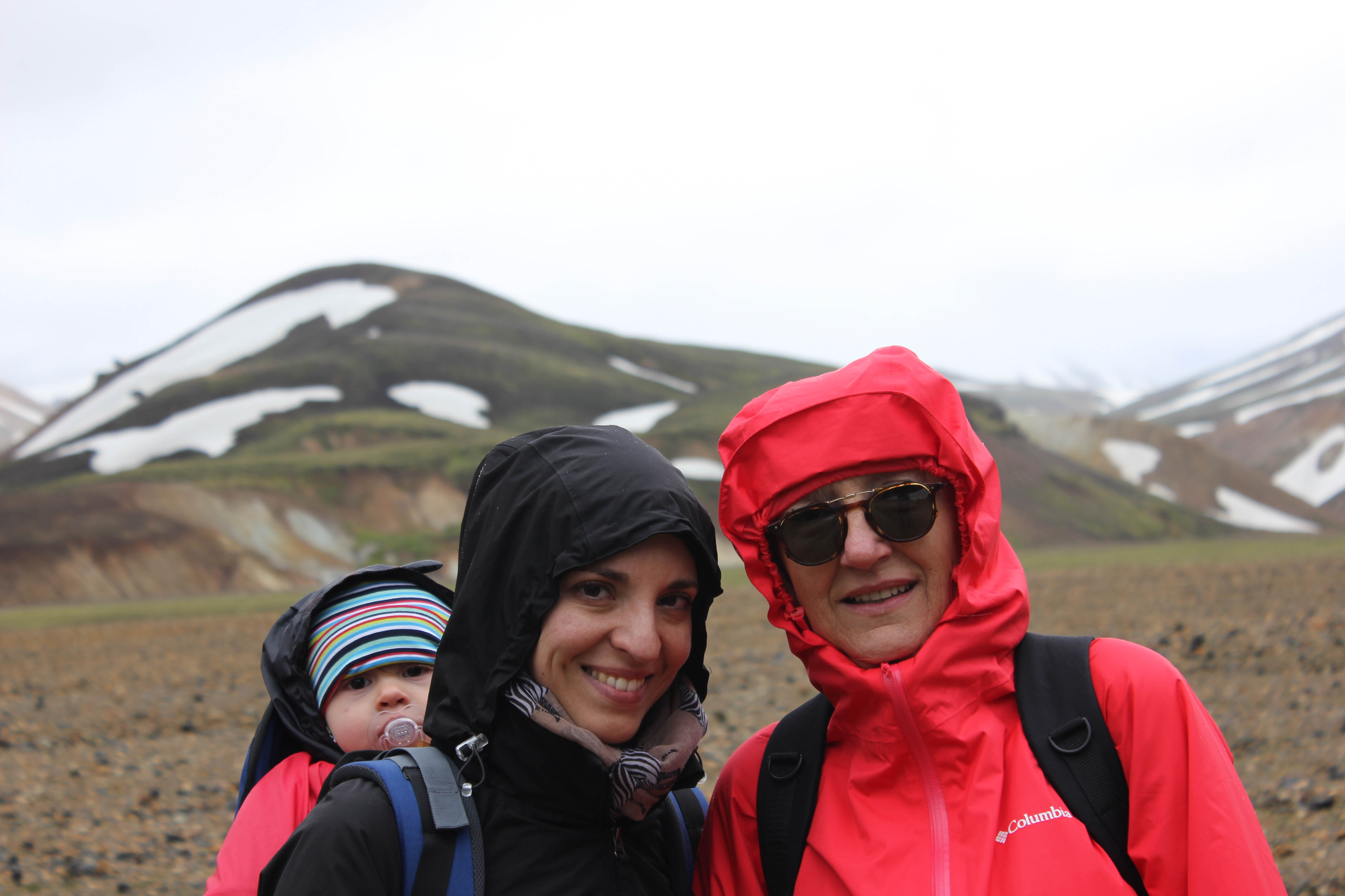 Nous trouvons finalement l’accès à la piste blanche que nous recherchions, nous n’avons perdu que 45min au final, enfin, pas totalement perdus non plus, vu le paysage. Je prends Léon sur mon dos, afin de ne pas trop nous fatiguer, et ce coup-ci c’est la bonne, en route! Névés, cours d’eau, champ de lave, montagnes colorées au possible, fumerolles, c’est tout simplement grandiose. Le temps a beau toujours être aussi incertain, oscillant entre bourrasques et fine pluie, le plaisir est total. Arrivés au niveau des fumerolles, l’odeur semble incommoder Nathalie et Marie-Line, Léon est plus focalisé sur le fait de descendre et gambader que sur l’odeur, de mon côté n’ayant plus d’odorat suite à plusieurs opérations des sinus cela ne fait aucune différence. J’en profite donc pour immortaliser l’instant, on peut avoir une très belle vue sur la vallée. Magique, je me répète je sais, mais vraiment, quel plaisir que d’être ici, tous ensembles!