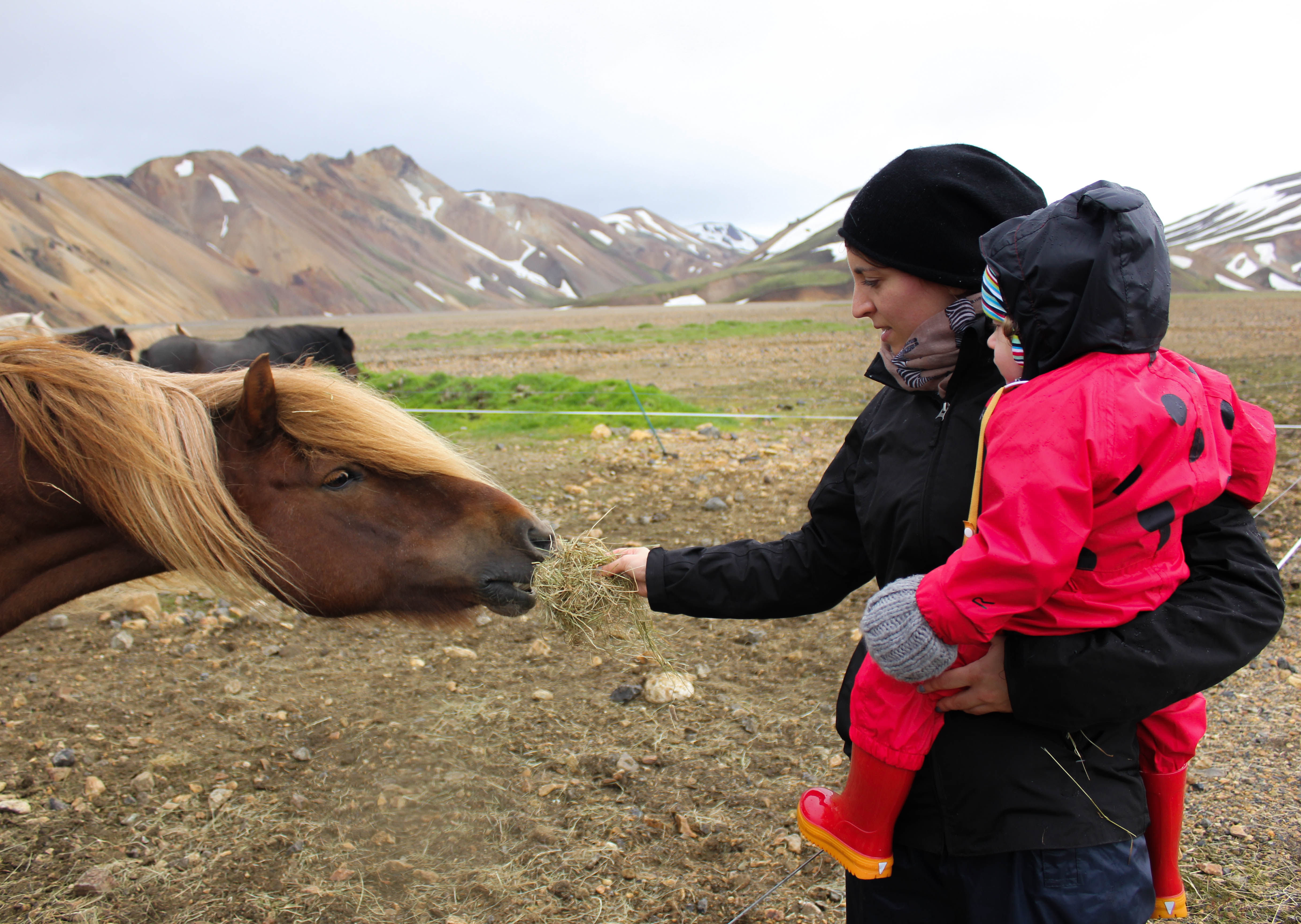 Toutes les bonnes choses ayant une fin, nous reprenons le chemin du retour, et redescendons vers le campement de base. Cela fait déjà un petit bout de temps que nous sommes partis (enfin, 2h quoi), et on ne voudrait pas tirer trop sur nos organismes, et jouer trop avec la bonne volonté de Léon. Mais que dire de plus si ce n’est que nous n’avons aucun regret d’être venus, que ce site est absolument splendide! Arrivés proche du campement, nous faisons une halte près de chevaux, c’est toujours l’occasion de passer un bon moment pour notre petit bonhomme, mais aussi pour nous, qui n’avions pas encore pu approcher de près les fameux chevaux islandais. Oui, un nouveau symbole, c’est ça!