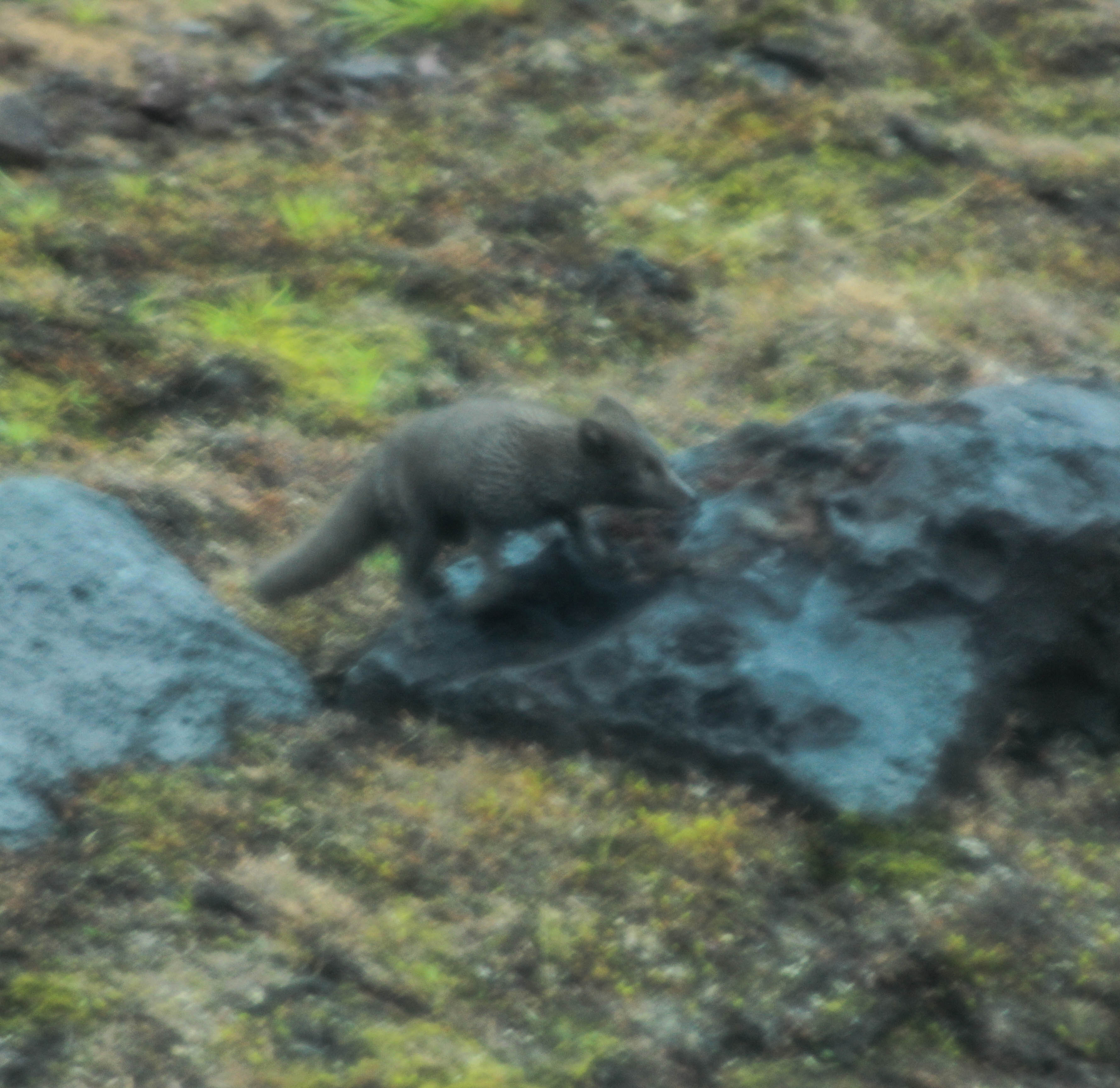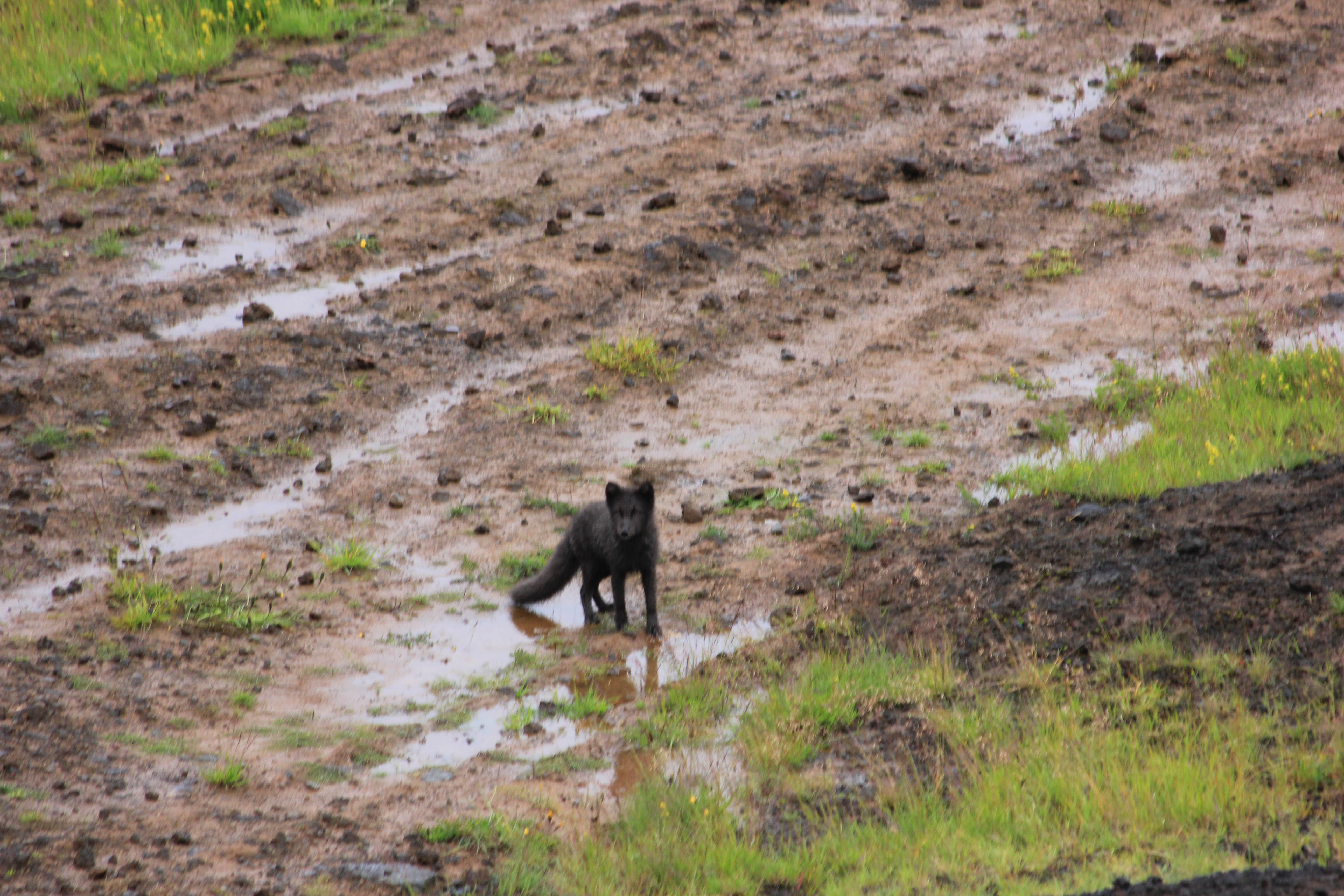 Passons outre ce cadrage digne des plus grandes galeries londonniennes consacrées aux photos animalières, survolons cette luminosité fantastique digne des plus belles journées Made In Iceland, et venons-en aux faits: en ouvrant ses rideaux, elle qui avait la chambre avec vue côté « vallée », elle a pu observer un jeune renard arctique, qui se baladait aux alentours de l’hôtel, et venait taquiner un groupe de trois moutons. Fugace, l’animal n’était donc vraiment pas facile à photographier, et c’est donc avec un joli « Dites les enfants, vous savez ce que c’est comme animal ça? J’en ai vu un ce matin, mais je ne connais pas du tout » qu’elle attaque la journée. Nous sommes tout simplement sur le cul (pardonnez-moi cette familiarité, mais qui retranscrit plutôt bien notre attitude à ce moment précis), je suis à deux doigts de manger mon assiette en porcelaine, complètement dégouté. Surtout qu’au final, ces trois mêmes moutons sont toujours au bas de l’hôtel, sous nos yeux, et que la scène reste désespérément vide de son acteur principal. Je maudis celui ou celle qui attribue les chambres, et qui nous a proposé, à nous, la vision de l’usine sous la flotte ce matin, et plonge le nez sans rien dire dans mon petit déjeuner, histoire de passer à autre chose. Mais c’est tout simplement impossible! Nathalie et moi-même ne pouvons nous empêcher d’épier la zone où se trouvent les moutons, le regard vide. Léon ne se pose pas trop de question de son côté, nullement intéressé par cette petite bête poilue, mais plutôt par ce qu’il y a en face de lui dans son assiette. Le petit-déjeuner passe, nous convenons que vu le temps qu’il fait, et qui risque de durer encore au minimum toute la matinée, nous allons prendre notre temps avant de quitter l’hôtel, pour retourner directement sur Reykjavik et passer cette dernière journée à l’abri. Nous sommes vraiment au bout du bout de notre petit-déjeuner, lorsqu’en levant la tête et regardant les fameux trois petits moutons, j’aperçois dans un éclair de lumière une boule aux poils bruns se déplaçant à quelques mètres d’eux. Hallelujah, il est revenu! Mon coeur ne fait ni une ni deux et se met à battre la chamade, mais je parviens tout de même avec l’euphorie à prévenir le reste de notre petite équipe. Il faut croire que j’y ai mis un peu trop de coeur, même les voisins ont été avertis (pardonnez-moi, vous visiteurs de l’hôtel Ion, si j’ai troublé la quiétude de votre petit déjeuner!). La star tourne donc autour des moutons, en semble vouloir tester sa vélocité, ce qui n’est pas du goût du patriarche qui le met en fuite à plusieurs reprises. Je réalise ENFIN que je n’ai pas mon appareil, resté dans la chambre, et que si je continue ainsi, personne ne nous croira. Je fonce donc le récupérer, et tente en vain de prendre quelques photos, gâchées par une mise au point approximative et les vitres ruisselantes d’eau. Et puis une petite ampoule s’illumine dans ma tête, il y a bien un endroit où e pourrais faire d’autres tentatives de photos de l’animal: le bar!