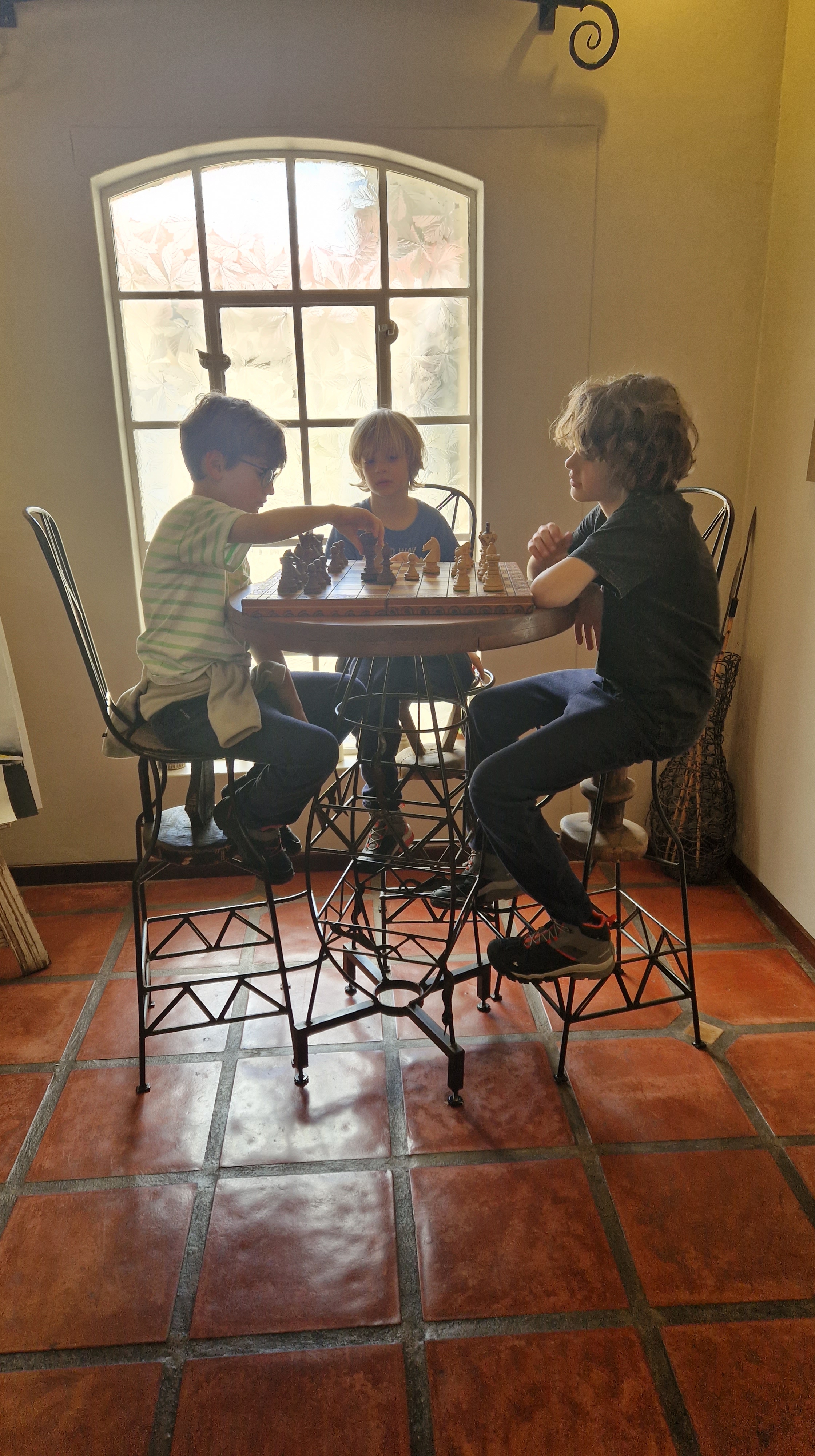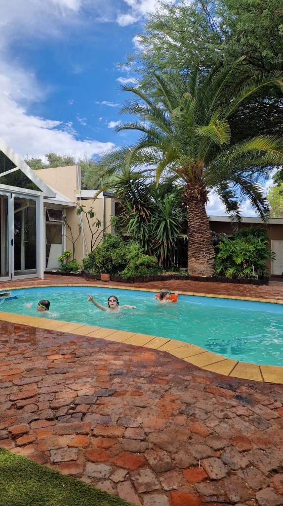 Nous rentrons en traversant l’une des artères principale de Windhoek, où je crois reconnaître un bâtiment d’époque, une église au milieu d’un rond point, des maisons aux couleurs chaudes. Impression confirmée plus ou moins par Nathalie, qui reconnait certains bâtiments. Nous sommes heureux. Difficile de dire si à ce moment précis nos regards se croisent avec un grand sourire, la fatigue est bien présente et je dois me concentrer sur la conduite, mais je devine un sourire de bonheur sur son visage, et ses yeux qui brillent de curiosité. Les enfants eux? Ils sont vidés, forcément. Cela fait maintenant plus de 24H que nous avons quittés la maison, la fatigue est visible sur leurs doux visages, il faut presque secouer Jacob pour ne pas qu’il cède à 5min de notre arrivée. Consigne est donnée, sieste & temps calme, et ensuite, piscine pour tout le monde! Personne ne se fait prier, et même si nous ne dormons pas vraiment tous les deux avec Nathalie, ce repos est salvateur au possible. L’horloge interne des garçons est déjà bien réglée, la consigne était pour 16H, et bien à 15H59, qui voyons-nous débarquer sur nos lits, pour nous demander s’ils peuvent enfin y aller! Mais oui, bien entendu, nous sommes là aussi pour ça, se détendre un peu! Détail tout de même, nous avions demandé au TO Tourmaline, à Carole (mille merci si vous lisez ces mots pour vos conseils et votre professionnalisme) plus précisément, de cibler autant que possible des campings ou guesthouse avec une piscine. La piscine, c’est la promesse pour eux, même en leur annonçant 4, 5, voir 6H de route, qu’au bout ils pourront s’éclater dans l’eau. Ce sera souvent le cas, et nous gardions parfois le secret jusqu’au bout pour les entendre crier de plaisir, genre on en sait pas pendant les 3/4 du trajet, et puis 10min avant d’arrivée, « bon les gars, les maillots de bain sont prêts? » Maintient du suspens, plaisir de les voir crier de bonheur, et aussi de pouvoir se garder des surprises et de quoi les faire vibrer sur des choses plus simples et intéressantes pour eux.