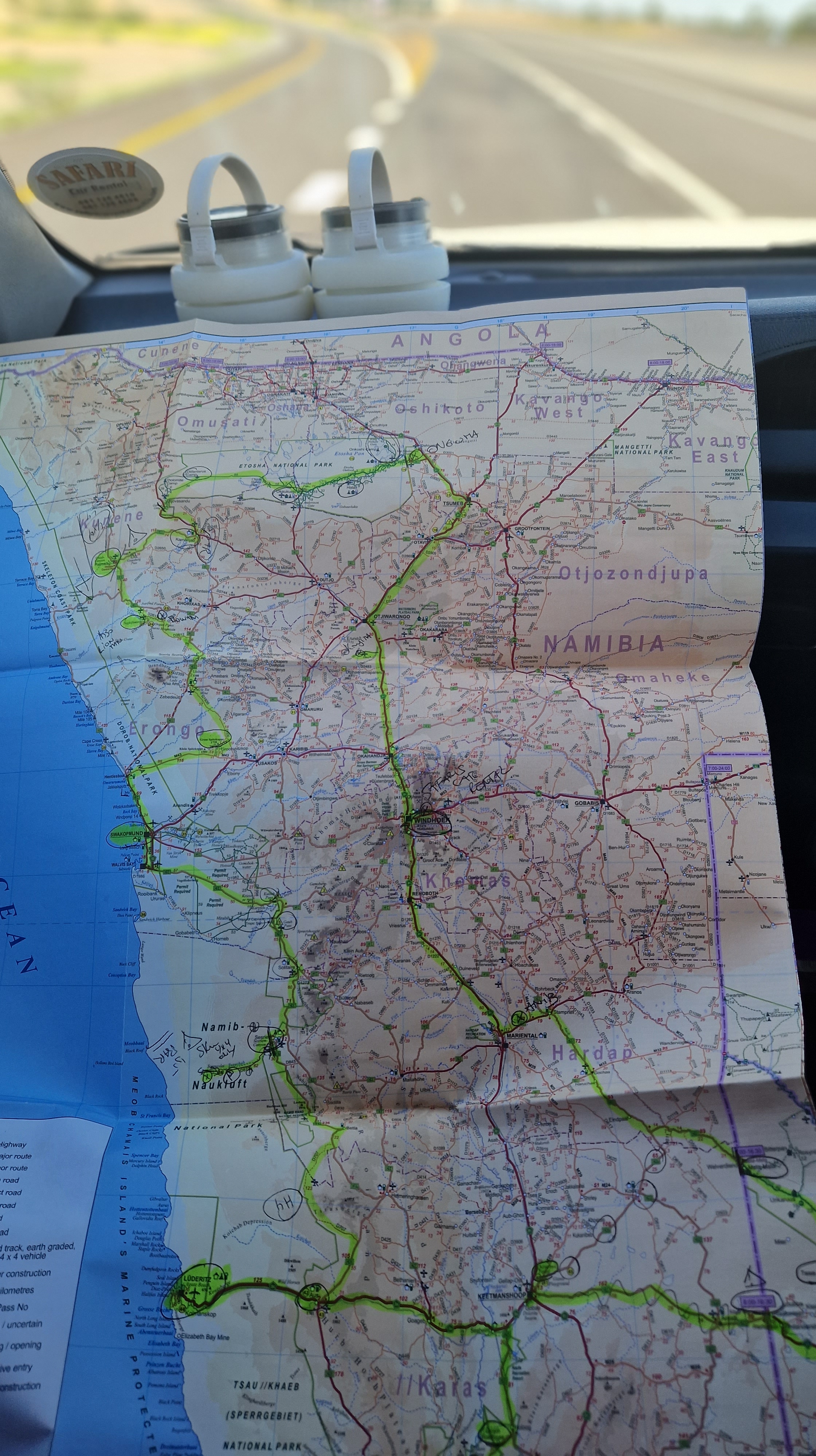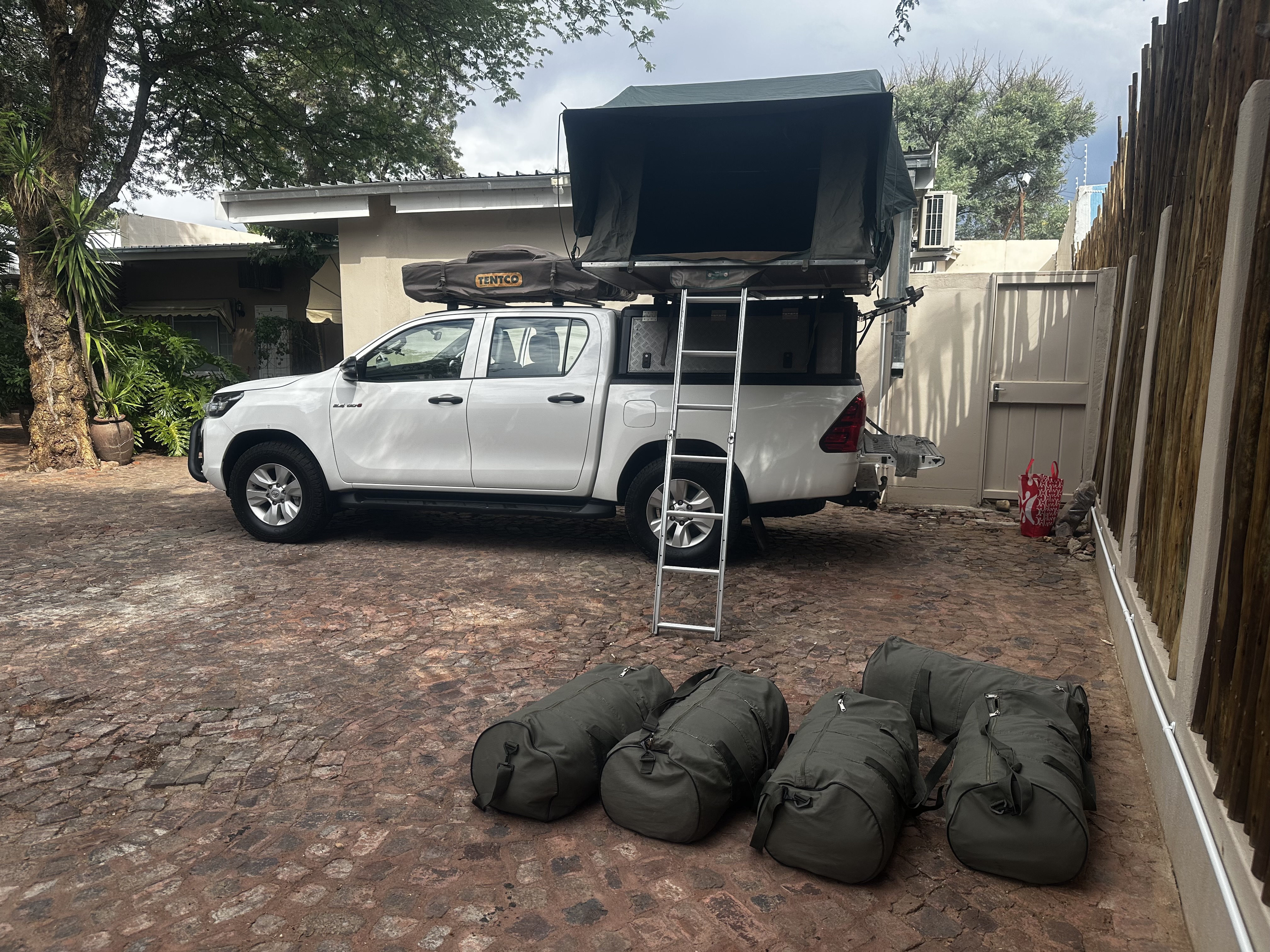 Nous voici donc en fin de matinée sur une jolie route goudronnée, à une vingtaine de kilomètres de Windhoek, où nous passerons notre première nuit. Le stress de la conduite à droite n’est plus, la concentration par contre si. Nous reconnaissons approximativement les paysages que nous avions quittés, la route qui mène à la capitale namibienne n’est pas une belle piste comme sur les cartes postales, mais elle est vallonnée, verte, avec des paysages au loin qui invitent le regard à s’y perdre. Et je me permets de répéter un mot, très important pour ce pays d’Afrique Australe, verte! Oui, nous sommes en plein dans la saison des pluies, en suivant un peu les informations sur le forum du routard nous avons pu voir qu’il avait beaucoup plu début janvier, avec même des débordements de rivière. Le ciel est quelque peu parsemé de nuages, mais rien de bien méchant. Ce paramètre, nous l’avons bien pris en compte, la saison des pluies peut-être piégeuse dans ces pays, et nous surprendre, mais encore plus dramatique, elle pourrait ne pas faire son apparition. Bref, nous avons de quoi nous protéger en cas de pluie, et deux tentes solidement arrimées au toit de a voiture 🙂 Notre destination sur Windhoek a elle aussi comme un air de déjà vu, puisque nous dormirons au guesthouse Londiningi, mais cette fois-ci pas dans la chambre au magnifique lit rond. Une chambre double et une chambre triple qui communiquent, voilà qui fait parfaitement l’affaire! Le GPS nous conduit sur place en un petit 30 minutes, et nous franchissons la grille du guesthouse autour de midi, le sourire aux lèvres pour Nath et moi. Voiture garée, premier épreuve physique avec la sortie des 4 valoches, la piscine est tjs là, c’est je crois la première chose que les garçons ont repérés. La seconde? un jeu d’échec, le défi est lancé entre Léon et Matisse, et même si Matisse est un novice dans ce jeu, les voir s’installer comme ça a un côté reposant, rassurant. Check-in, on ouvre les valises, et on commence à organiser les valises de telle sorte que les affaires des 2 jours suivants soient le plus accessible possible. Le constat est implacable pour nous, le coffre est blindé, s’il reste de la place, c’est vraiment en tassant! Et nous n’avons même pas encore fait de courses! LOL Rapide concertation, je laisse la spécialiste des valises organiser tout ça, pendant que je procède au premier montage de tente dans la cour, pour y glisser les couvertures, qui n’empêcheront pas la fermetures de la housse de protection, mais nous ferons gagner un peu de place dans le coffre arrière. Tout seul, pour cette première, il me faudra une bonne heure pour installer tout ça, manque de repères et aussi concentré à bien faire pour ne rien abîmer. Lol, j’avais juste oublié que d’ici 24 à 48H, notre maison roulante allait subir la présence de 5 personnes dans l’habitacle, mais surtout la poussière omniprésente en Namibie 🙂 Pas grave, au moins je suis rassuré, je n’ai pas perdu la main, et je pourrais dire à ma coach que c’était tout de même un bel exercice physique à faire au quotidien 🙂