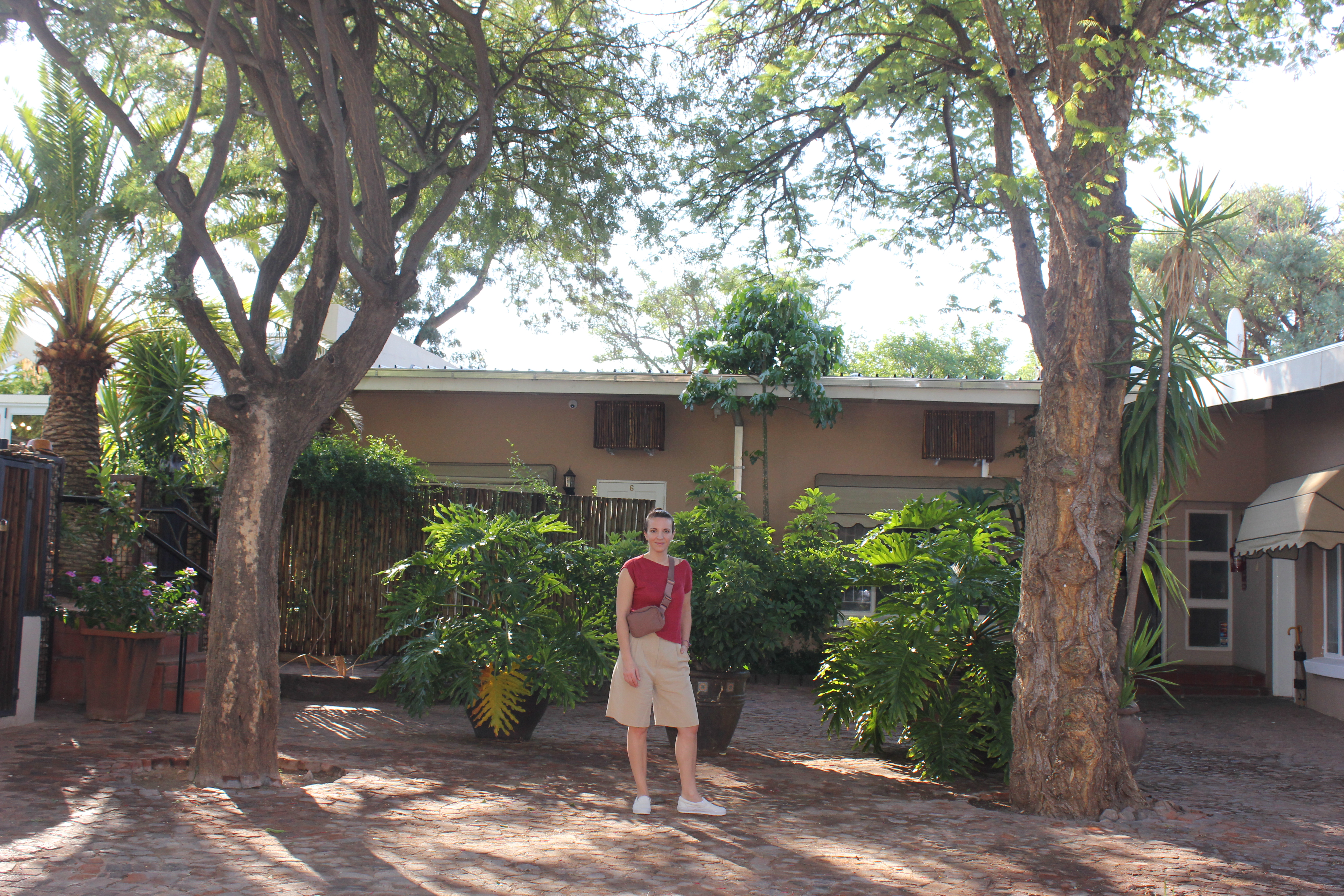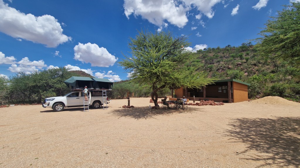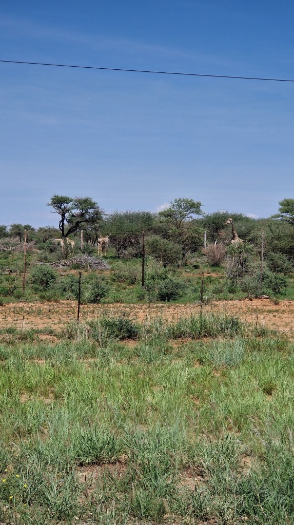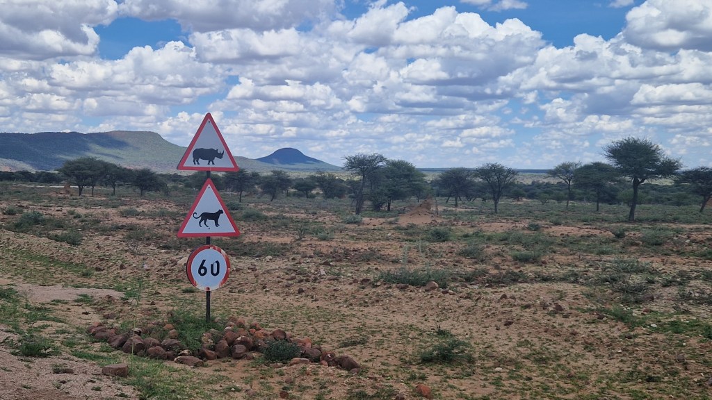 Notre première nuit en Namibie aura été salvatrice, nous avions tous grand besoin de récupérer après ces dernières 36H éprouvantes, et c’est sur les coups de 7H que nous nous levons. Je crois en toute honnêteté que c’est la seule fois ou nous nous lèverons aussi « tard ». Il fait déjà bien jour dehors, le soleil commence déjà à prendre de la hauteur. Il fait bon, tous les signaux sont au vert! Nous nous installons au bord de la piscine pour le petit-déjeuner, abondant et très frais. L’estomac bien rempli et tous un peu excités à l’idée de prendre la route, nous procédons à la fermeture des valises, préparation d’une petite collation au cas ou, et il est temps de charger la voiture. Ça réveille, 4 grosses valises à soulever et à caser dans le coffre! Nous quittons Londiningi autour de 8H30, faisons le plein d’essence, et rejoignons sans difficulté la B1 vers le Nord.