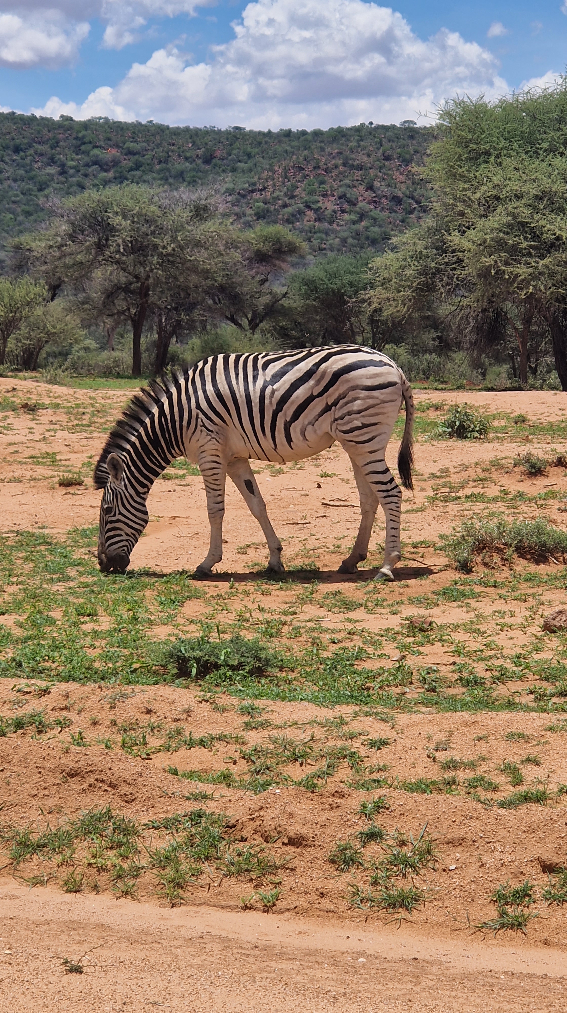 Pour le côté « pratique », la voiture dispose de deux réservoirs de 80L chacun, ce qui nous laisse tout de même une autonomie entre 800 et 1000km sur le papier, selon la consommation. Route goudronnée car fréquentée, il nous faudra attendre un peu avant de passer sur des pistes de sables, elle est comme il y a 12ans, assez monotone et sans grand intérêt. C’est très confortable tout de même, rythme de croisière autour de 100km/h, on peut enfiler les premiers kilomètres tout en prenant nos marques dans la voiture. Nous avons environ 3H de route pour atteindre Okonjima, notre première étape, que nous avions déjà eu la chance de découvrir en 2012. Nous lançons le débat avec les enfants et leur donnons une lourde responsabilité, il faut donner un nom à notre voiture maison! Et tous les 3 doivent se mettre d’accord! Passez les propositions un peu fantasques qui sortent de leur imagination fertile, la discussion se focalise sur le manga favori de Léon, et que ses deux frères connaissent aussi, One Piece. C’est décidé, et pour le coup, nous trouvons que le nom choisi lui va très bien, notre voiture s’appellera désormais Luffy! C’est comme si elle déjà partie de la famille tiens! C’est en fin de matinée que nous rallions Okonjima, profitant des derniers kilomètres pour donner quelques précisions sur le lieu ses activités aux enfants. La fondation Africat le le lodge aident à la protection des grands félins, principalement les léopards, mais aussi les guépards qui pourraient être recueillis blessés, pour les soigner et leur offrir un espace de vie ou ils ne seront pas menacés par la vie humaine, s’ils venaient à ne pas pouvoir être relachés dans la nature. La réserve d’Okonjima est immense, environ 22.000 hectares! Si le lodge, magnifique par ailleurs, est hors budget pour nous, les campements restent très abordables, et permettent de profiter des activités proposées par le lodge. Nous finissons par apercevoir au loin le symbole du lodge, l’excitation monte d’un cran dans l’habitacle.