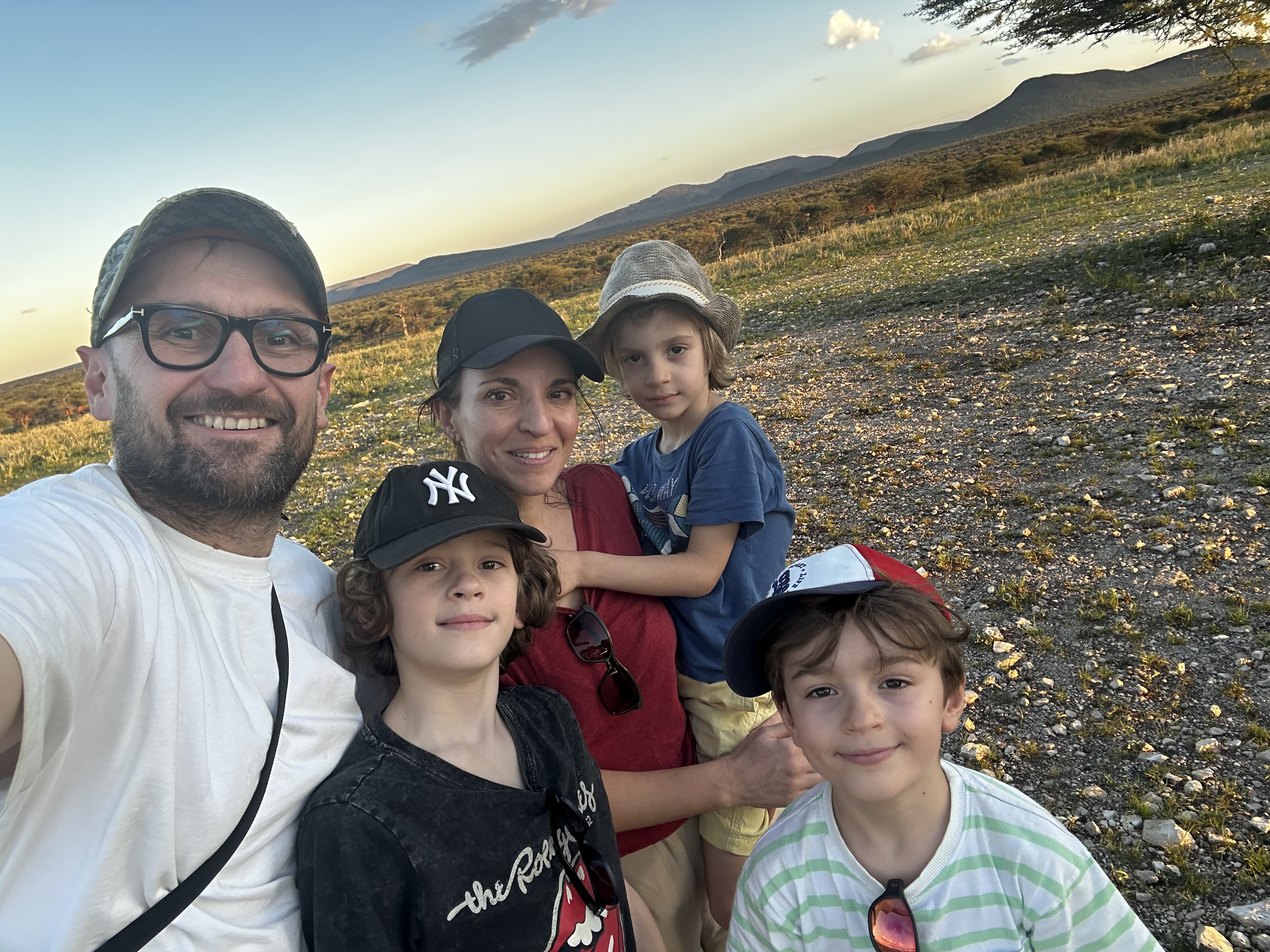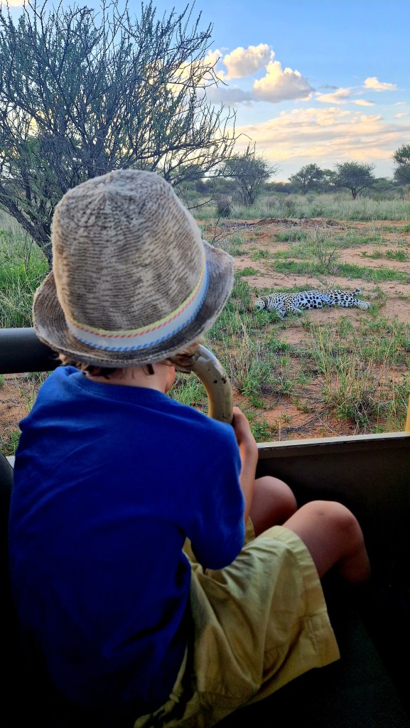 Le temps s’arrête, le véhicule aussi, l’animal est calme, nous adresse un regard. Premières photos, pas bien cadrées ni réglées (mais on s’en fout on appuie quand même, avant de se ressaisir) les garçons sont je pense très impressionnés, on entend les mouches voler. Yebo finit par se lever et partir, nous contournons le point d’eau et le retrouvons quelques encablures plus loin. Il est a quoi, 10 ou 20 mètres de nous? Le véhicule s’arrête à nouveau, comme le temps. Yebo prend la pause, baille tel un pacha, nous regarde de temps en temps, fait semblant de s’intéresser à un gnou un peu plus loin, puis se rallonge. Au bout de quoi, 20 ou 30 minutes, impossible de savoir combien de temps, il est déjà temps de laisser l’animal seul, le soleil commence à descendre doucement dans le ciel, comme dans tout drive qui se respecte, un petit apéro est prévu pour observer le coucher de soleil. Nous avons une vue imprenable sur les terres d’Okonjima , les couleurs deviennent plus chaudes, le paysage est splendide. Les enfants se permettent de nous poser une question tout à fait judicieuse: mais du coup, les léopards ils pourraient venir là? Alors, techniquement, oui, ils pourraient venir, mais vous savez, la viande de champenois, c’est pas trop leur truc. Excuse bidon, blague bidon, regard blasé de Léon, j’aurais au moins essayé… Nous faisons encore quelques photos sur place, mais il y a un petit bout de trajet avant de rejoindre Duffy, il est temps! Le crépuscule prend le pas sur la lumière, la pénombre s’installe rapidement, des silhouettes sombres se dessinent dans le paysage, des girafes sont venues nous dire au revoir. Le silence se fait dans la voiture, le garçons luttent pour ne pas s’endormir, nous nous répartissons les tâches avec Nathalie pour la suite. Le braai est encore possible, mais bon, ça veut dire encore 45min d’attente, et nous ne sommes même pas arrivés. On a un souvenir un peu particulier de 2012, ou nous nous étions perdus au retour d’un drive, avions roulé de nuit, pour arriver dans un camping sans lumière, à devoir s’installer à la lumière des frontales. On a pas besoin de se le dire, on est pas spécialement chauds pour retenter l’expérience.