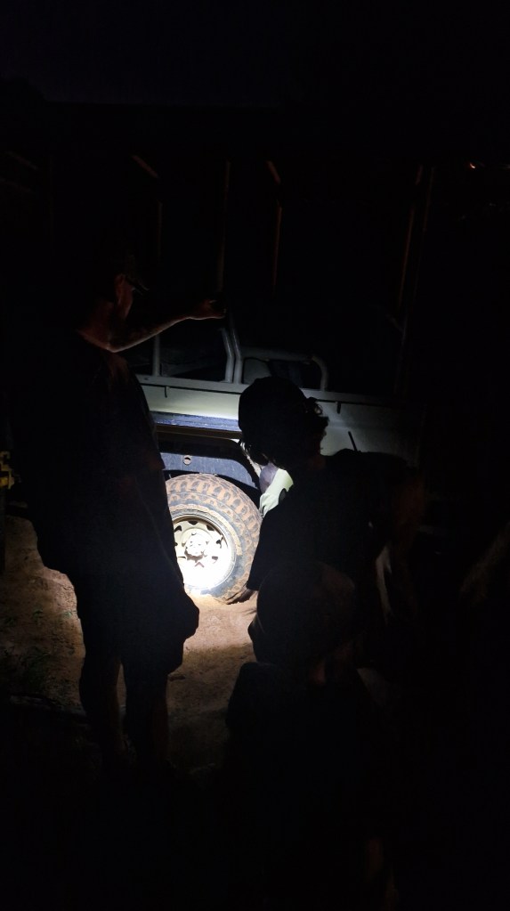 Et puis… Et puis… Alors que l’on devine des lumières non loin de là, signe que nous ne sommes plus très loin, au moment de franchir un lit de rivière ensablé, le véhicule patine, ralentit, s’arrête, se bloque. Tentatives de sortir de là, le véhicule est normalement taillé pour ça, mais non, le truc improbable, nous sommes coincés. Hahaha, la bonne blague! Dans la réserve, dans le noir, dans un lit de rivière, la totale. LE guide et moi descendons du véhicule, je remercie le bon dieu d’avoir pris une lampe avec moi, et le constat est implacable. Le cric est sorti, il a l’air d’avoir déjà bien vécu, difficile de surélever la voiture pour désensabler les roues. Honnêtement là, je stresse. Tout le monde stresse. Le guide parce qu’il est ensablé avec des clients, nous parce qu’on se dit qu’on va se faire bouffer par un léopard, ou que des serpents/scorpions et autres joyeusetés vont croire à un festin. Après plusieurs essais, appel radio pour avoir du soutient, on ne pourra pas le sortir seuls. Attente… Enfants un peu déboussolés… Parents toujours pas rassurés… Après 15 bonnes minutes d’attente, une lueur apparait, un bruit de moteur se fait entendre, salvateur. Un véhicule arrive, avec… une seule personne, lol Bon ben on va s’en sortir maintenant qu’on est un de plus, hein?! Les guides discutent entre eux, je pense que le dernier arrivé est plus expérimenté que notre guide, le ton de sa voix est ferme envers son collègue. Le verdict tombe qqes instants plus tard, nous montons dans le véhicule « de secours », tous, sauf notre guide. J’ai du mal à y croire, on demande si c’est vraiment ok et pas trop risqué, mais visiblement nous sommes les seules personnes inquiètes. Et pour ce qui est des derniers kilomètres pour rejoindre notre campement, cela aura été des montagnes russes grandeur nature! On avance a une allure improbable, les garçons sont morts de rire, ça monte et descend à tout va, on est bien secoués, mais il est clair que notre 2nd chauffeur à une connaissance totale du terrain et du véhicule. Wow, bluffant!