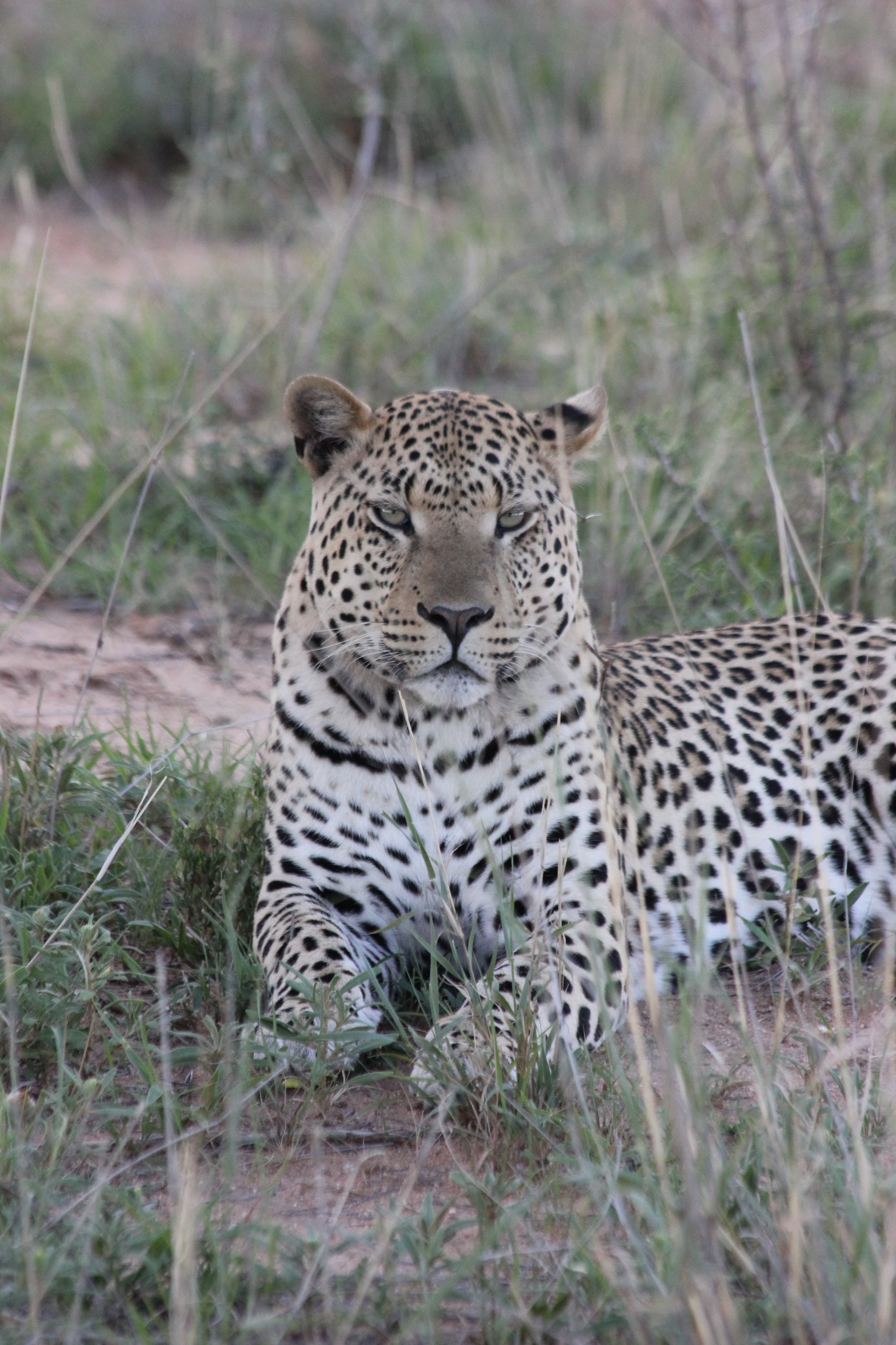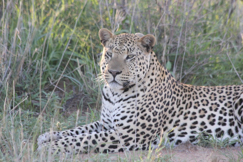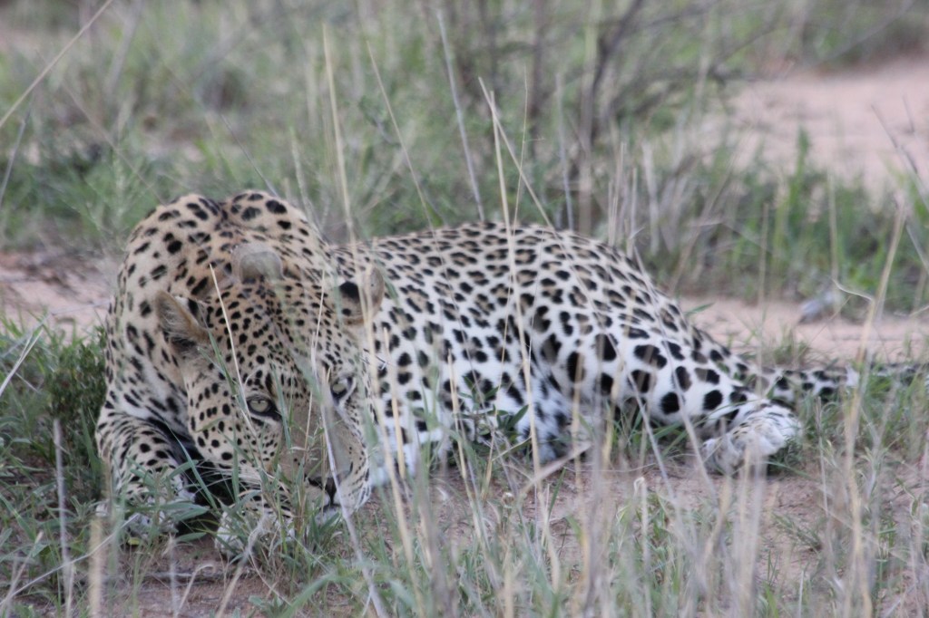 Communication par radios entre les guides, forcément on ne comprend absolument rien à ce qui se raconte, tout est un peu confus. Les garçons ne bougent pas trop, même si le temps commence à être long. Nous prenons une autre direction, le guide semble confiant, sourire de mise. Le temps passe, défile trop vite même, on doit garder espoir et surtout tenir les enfants en alerte, sinon le retour va être morose. Une entrée en matière comme cela, c’est tout simplement pas envisageable, on reste positif! Nous finissons par déboucher sur un point d’eau entouré d’un terre plein avec des broussailles, et la le guide se retourne, tout sourire: vous le voyez? Heu… j’ai une tête à avoir vu un léopard là? on se ressaisit, tout le monde sur le pont, et soudain, soudain: « là! il est là » la délivrance. derrière un arbuste, allongé à quelques dizaines de mètres de nous, ça y est, nous devinons ses tâches, il est là, sous nos yeux. Un joli mâle léopard répondant au doux nom de Yebo.