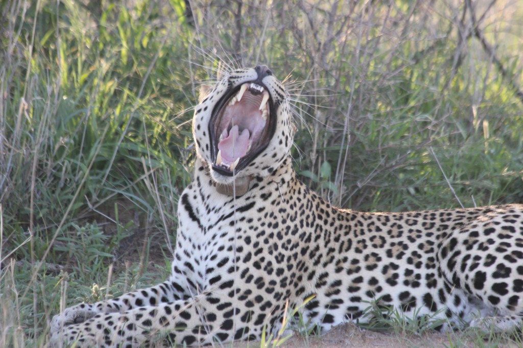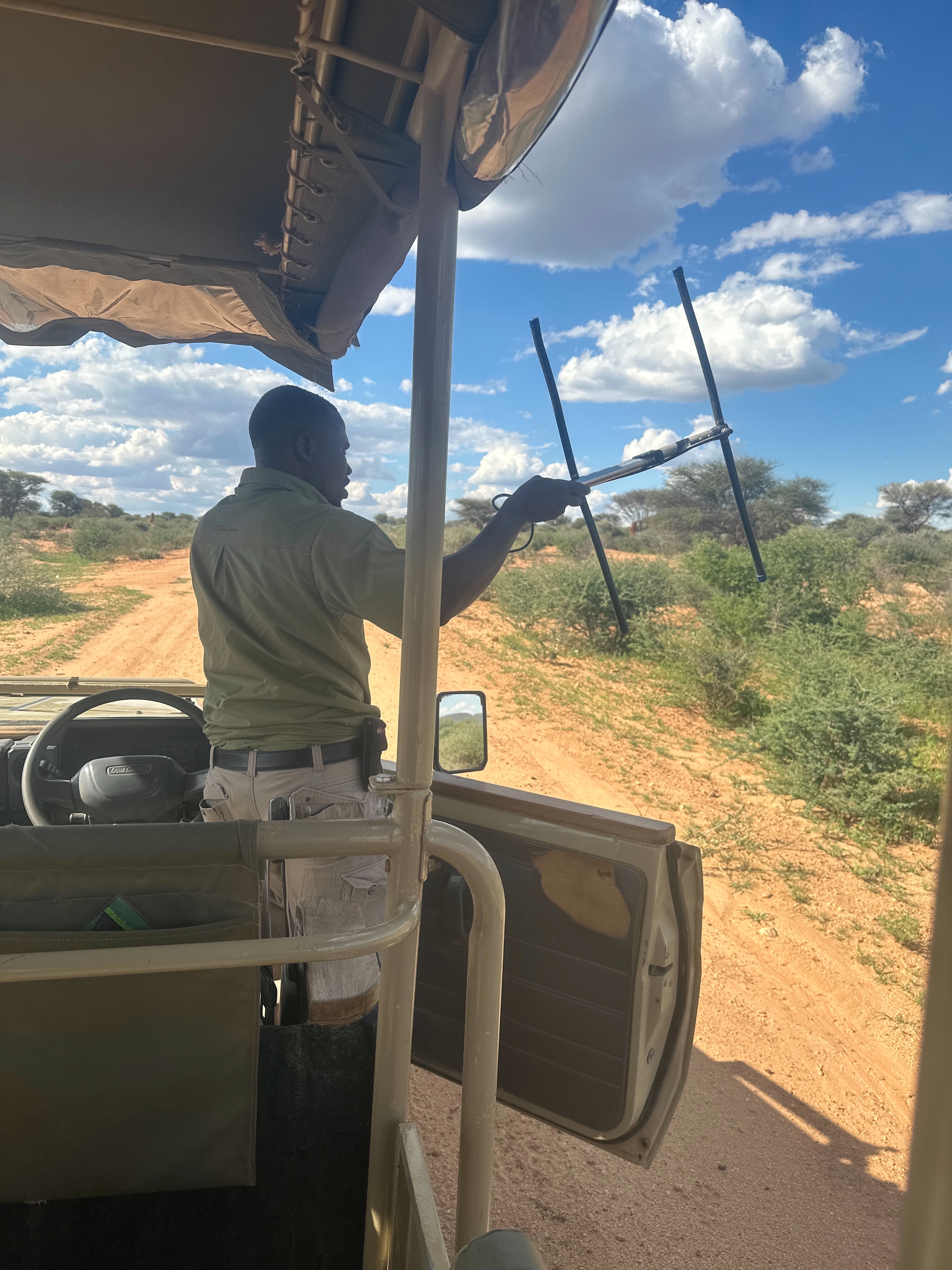 Nous préparons nos sacs peu avant l’arrivée de notre guide avec son 4×4, les gourdes sont remplies, appareil photo prêt, casquettes vissés sur la tête, crème solaire étalée sur les visages, on grimpe dans le véhicule. Consignes de sécurité expliquées, il nous indique que les trackings sont d’excellents moyens de suivre l’évolution des léopards, que chaque sortie est différente et permet de récolter des informations importantes sur les individus observés. Notre objectif aujourd’hui sera d’aller à la rencontre si possible de deux femelles. Le véhicule démarre, c’est parti pour 3h de sortie! Le décor est verdoyant, vallonné, et les animaux commencent à apparaitre comme par enchantement. Quelques zèbres par ci, un troupeau de springbocks par là, tiens au fond là-bas ce sont 3 koudous que nous apercevons, nous sommes aux premières loges de tout ce magnifique spectacle. Euphorie totale pour notre trio de choc, ils sont au taquet! Le radar est sorti pour tenter de capter un signal, et indiquer une direction approximative vers où aller. On se prend au jeu en tentant de d’écouter nous aussi, et participer aux recherches. Nous roulons vers on ne sait trop où, Nord ou Sud, Est ou Ouest, mais on y va et c’est bien là le principal. On sait juste qu’il y aura un léopard à déceler dans le décor environnant.