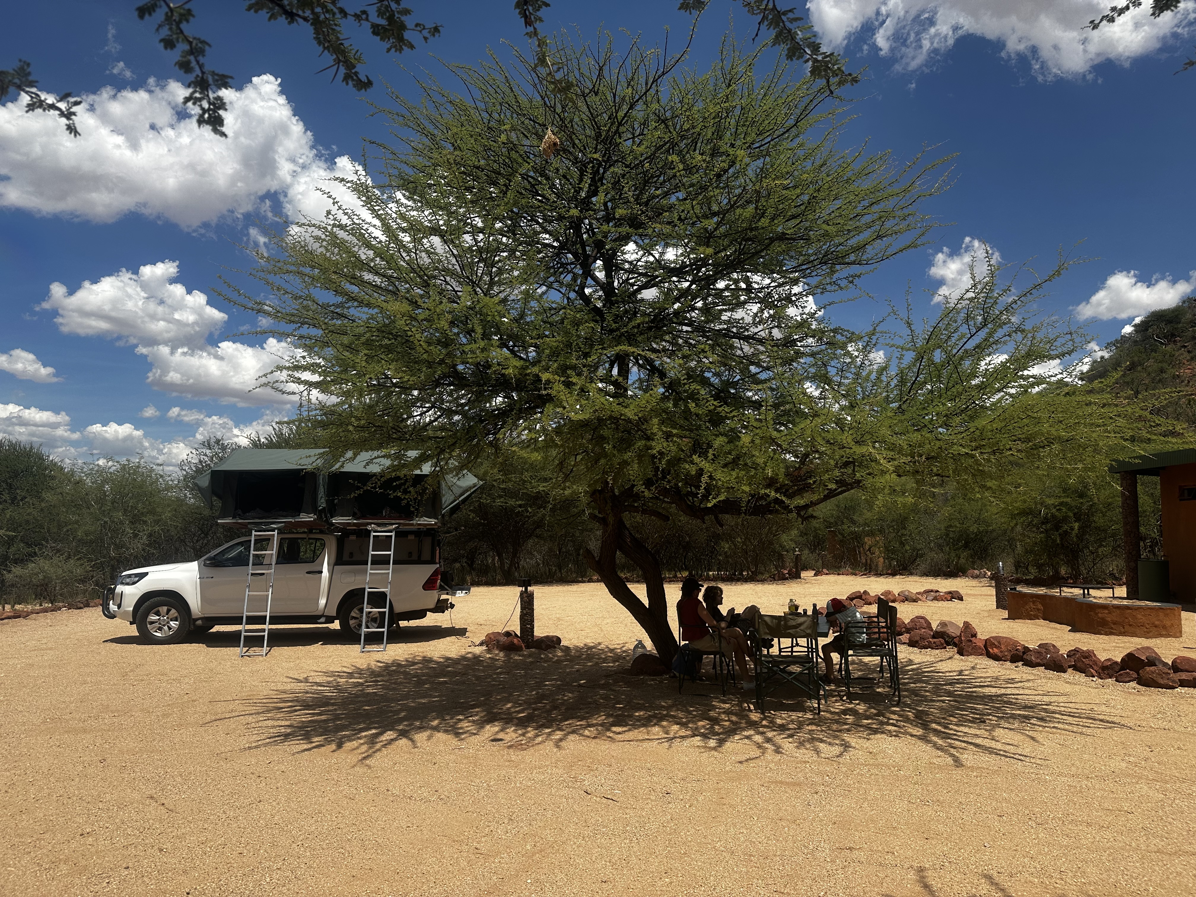 Tels de vrais experts du camping, nous nous concertons pour le meilleur placement pour la voiture, vérifier la hauteur de l’arbre, trouver un maximum d’ombre, et allez hop, tout le monde descend! Le campsite est toujours aussi complet, douche privative, emplacement pour le braai, toilettes, lavabos, etc… Le grand luxe! N’ayant pas encore pris tous nos repères et nos automatismes pour l’installation des deux tentes, nous procédons en binôme avec Nathalie, appliqués et concentrés. Pour cette première, il nous aura fallut un bon 30min, et nous finissons en sueur, ce n’était peut-être pas la meillleure idée que de faire ça sous un soleil de plomb et par 33 degrés. Mais au moins, ce qui est fait, est fait! Les garçons sont euphoriques et nous appellent vivement, Jacob a vu 2 geckos sur le mur du WC en allant faire pipi. Nathalie reste à bonne distance, pendant que eux essayent de grimper sur la cuvette pour les voir de plus prêt, c’est l’anarchie totale dans les WC. Les pauvres bestioles finissent par se lasser de notre brouhaha et filent se cacher sous la toiture, c’en était trop pour eux! Mais c’est pas tout ça, l’aventure ça creuse! Les estomacs crient famine! Nous faisons des sandwichs, le premier braai, ce sera pour ce soir, au retour de notre exploration. Petit moment de répos pendant la digestion, profitant au maximum de l’ombre, pour ne pas surchauffer. Jacob lui est captivé par une colonie de fourmis, elles sont beaucoup plus balaises que celles de notre jardin, il ne perd pas une miette de l’activité qui se déroule à ses pieds.