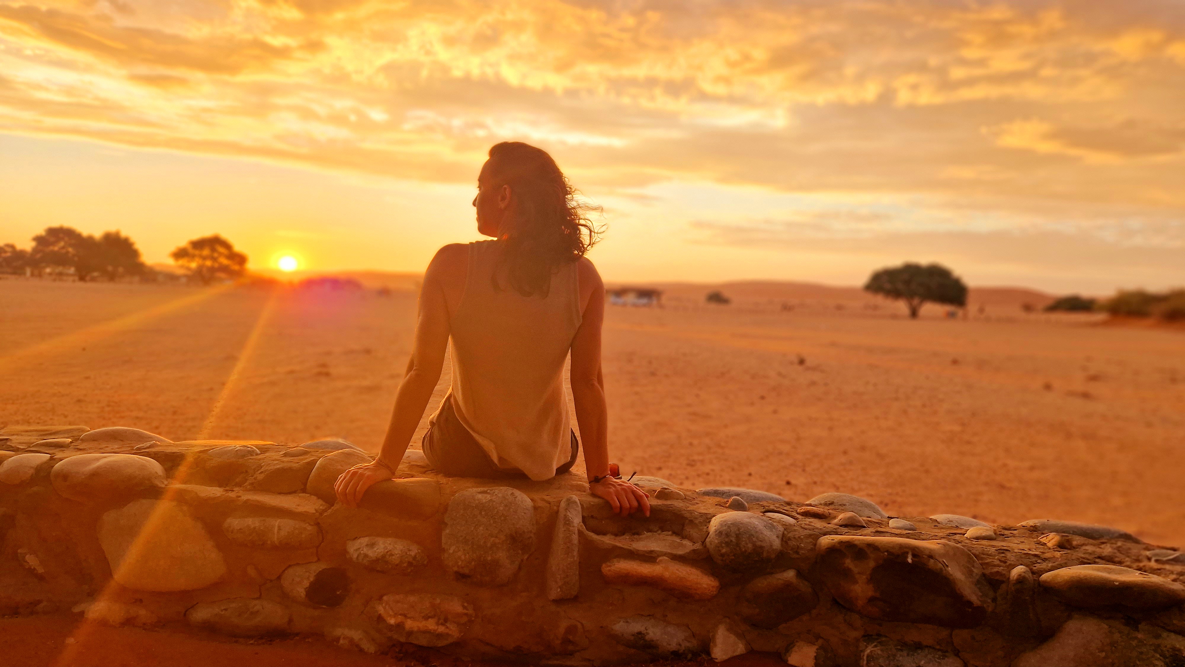 Après cette nuit ponctuée de bruits de chacals et d’imitations de lion (ou tigre, ou léopard, de chat, ou caméléon, c’est selon), le réveil sonne à 4H30 ce matin, ça pique tout de même un peu! Mais pour rien au monde nous n’aurions manqué ce réveil-là, avant l’arrivée du soleil, pour aller à sa rencontre, mais depuis un endroit si particulier. Lampe frontale sur la tête, nous finissons de vérifier nos 2 sacs à dos avec Nathalie pour faire le point, eau, appareil photo, encas pour se restaurer, crème solaire, casquettes, etc… Vient ensuite le moment de sortir les garçons de leur sommeil, avec un maximum de douceur tout de même, pour qu’ils s’installent à l’étage inférieur, dans les fauteuils, pour se rendormir pendant que nous plions les affaires et rangeons les tentes. Efficacité redoutable, nous parvenons même à prendre un café plutôt tranquillement avec Nath, on fonctionne quand même bien dans ce genre de situation. Nous laissons tout de même table et chaises sur place, puisque nous dormirons sur place cette nuit encore. Nous montons dans le véhicule, allumage des lumières, démarrage du moteur, le tableau de bord s’illumine, notre premier réflexe est de vérifier la température, et là, c’est un peu le choc. 29 degrés. Oui, 29! Pas un de plus, pas un de moins. Il est 5H30 du matin, nous allons faire une excursion dans le désert, et il fait déjà 29 degrés! Bon, on rajoute une gourde dans nos sacs, par sécurité!