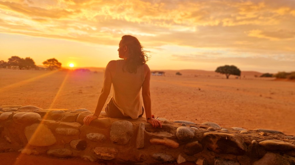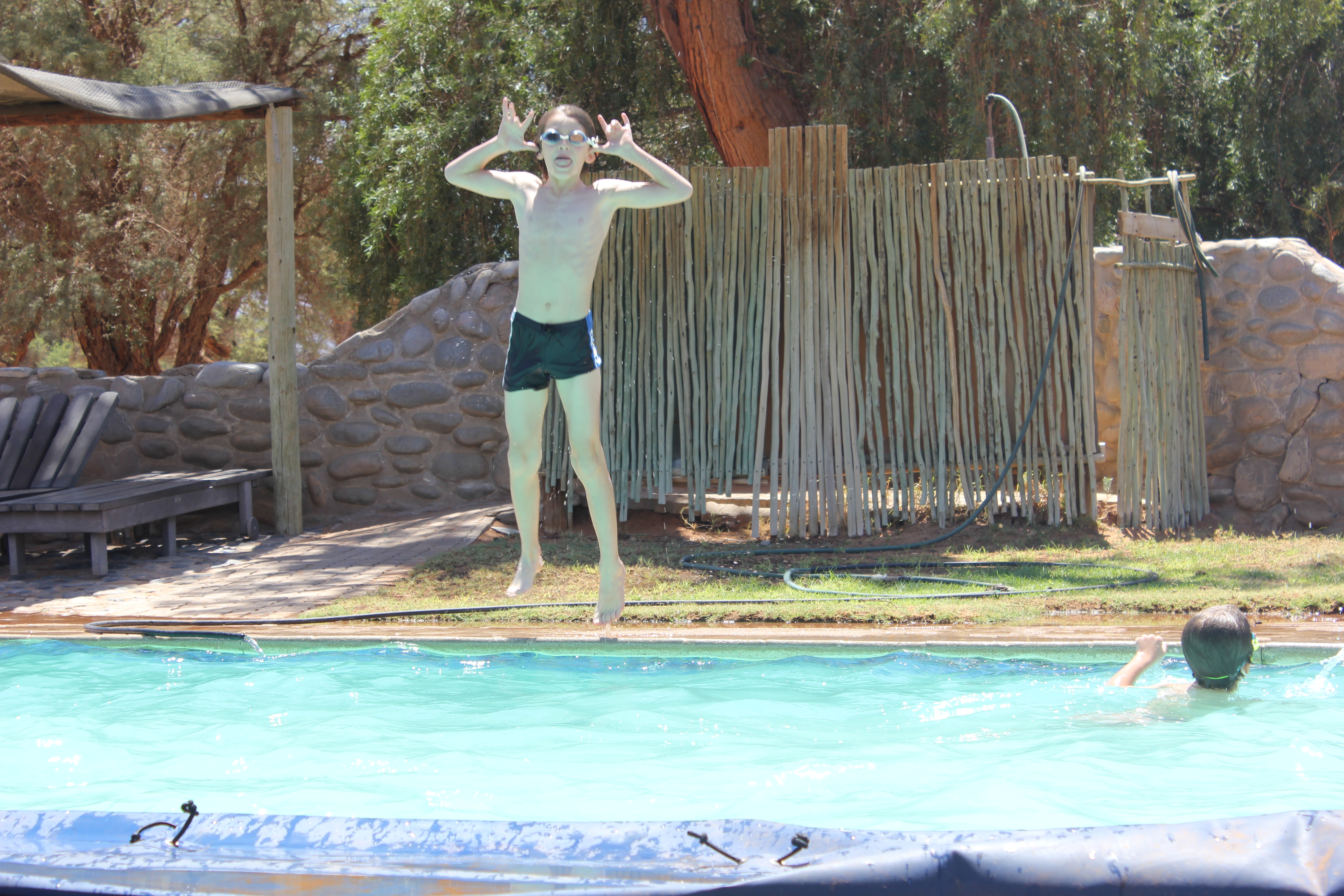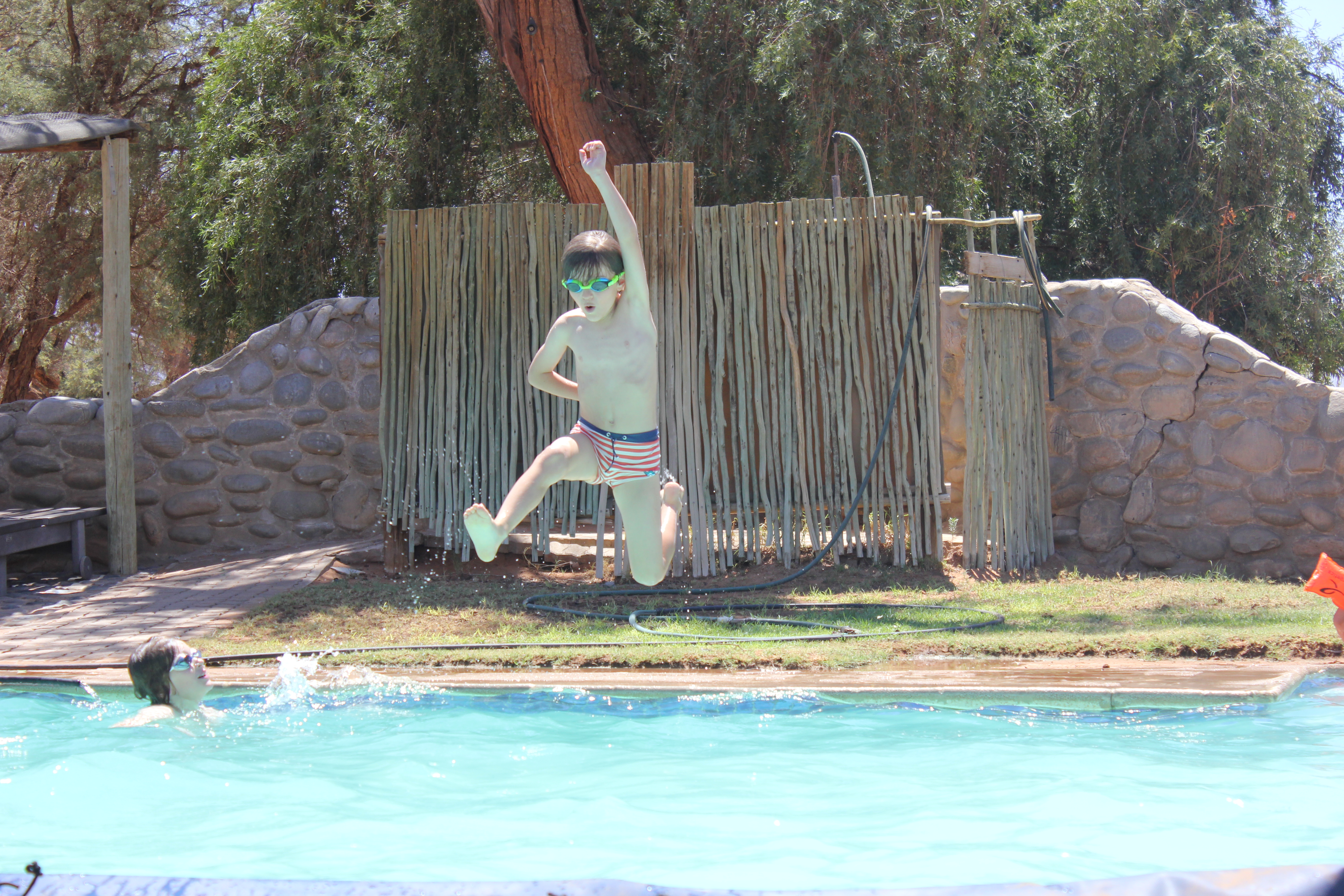 Les garçons lâchent un peu les chevaux et jouent sans retenue, personne n’est présent autour de la piscine, tant mieux! Nous restons un bon et long moment autour de cette dernière, en fin d’après-midi de gros nuages commencent à poindre le bout de leur nez autour du camp, avec de gros orages à l’horizon. Un vent très chaud se lève, on voit les éclairs fendre l’horizon, mais il ne passera pas au-dessus de nous, au final comme hier nous n’essuierons que quelques gouttes. En rentrant la routine s’installe, dépliage des tentes, séchage des affaires, et préparation pour un bon braai, cela nous manquait tiens! Saucisses et belles pièces de viande au menu, accompagnées de… chips… Ok j’ai honte, repas pas équilibré du tout! Mais allez-y vous, allez trouver une tomate ou un concombre dans le désert! J’aimerais vous y voir tiens! C’est exténués, mais mille fois heureux et reconnaissants pour cette journée merveilleuse que nous allons nous coucher sur les coups de 21H00. Personne ne se fait prier, malgré la chaleur les garçons s’endorment sans trop de difficulté, Nathalie et moi lisons un peu dans nos tentes respectives, je regarde une dernière fois également les photos du jour avant de m’endormir. Mes yeux brillent, c’est avec un sourire béa que je ferme mes yeux, rempli de toutes ces émotions formidables. Demain nous avons au programme une longue route, c’est encore ce qu’on pourrait appeler une journée de transition, nous allons quitter l’itinéraire que nous connaissions déjà avec Nathalie, pour descendre toujours plus au sud. Au programme, la plus belle piste de Namibie parait-il, et avec un peu de chances, des chevaux sauvages. Nous allons de surprise en surprise, et c’est tant mieux!