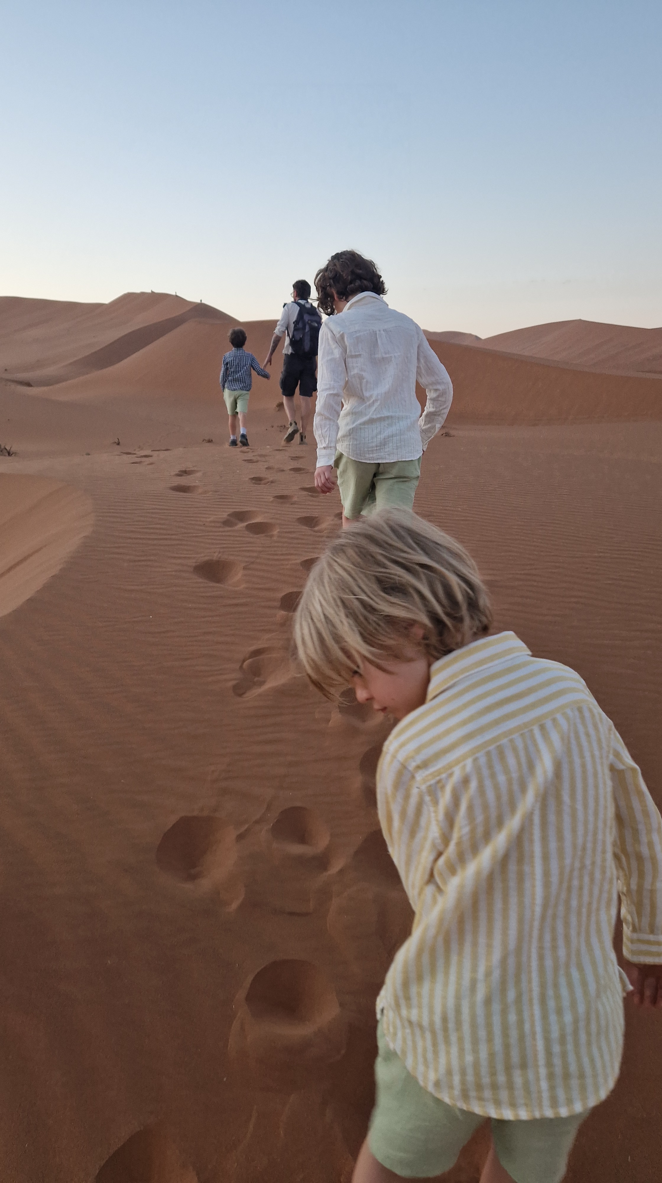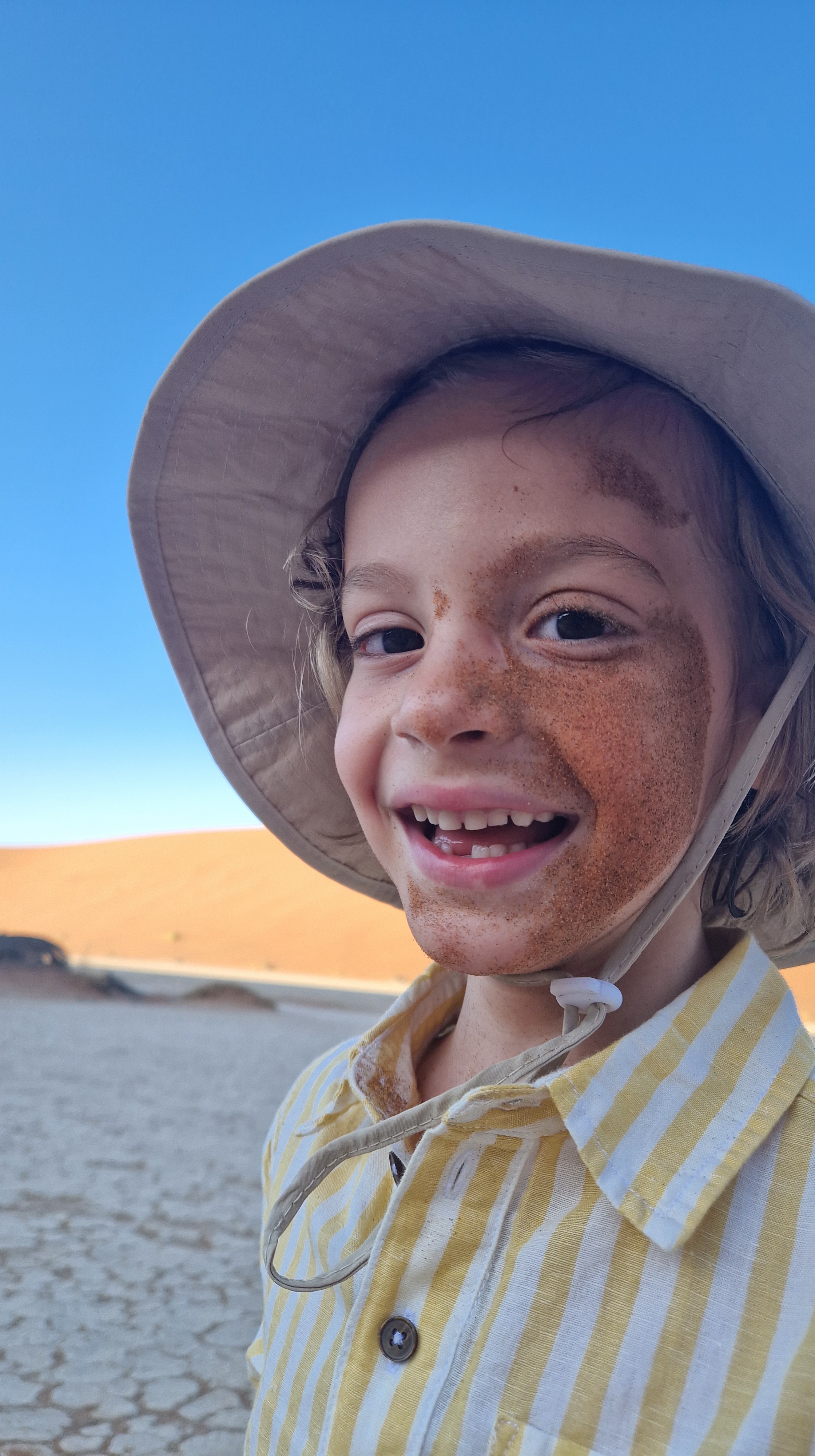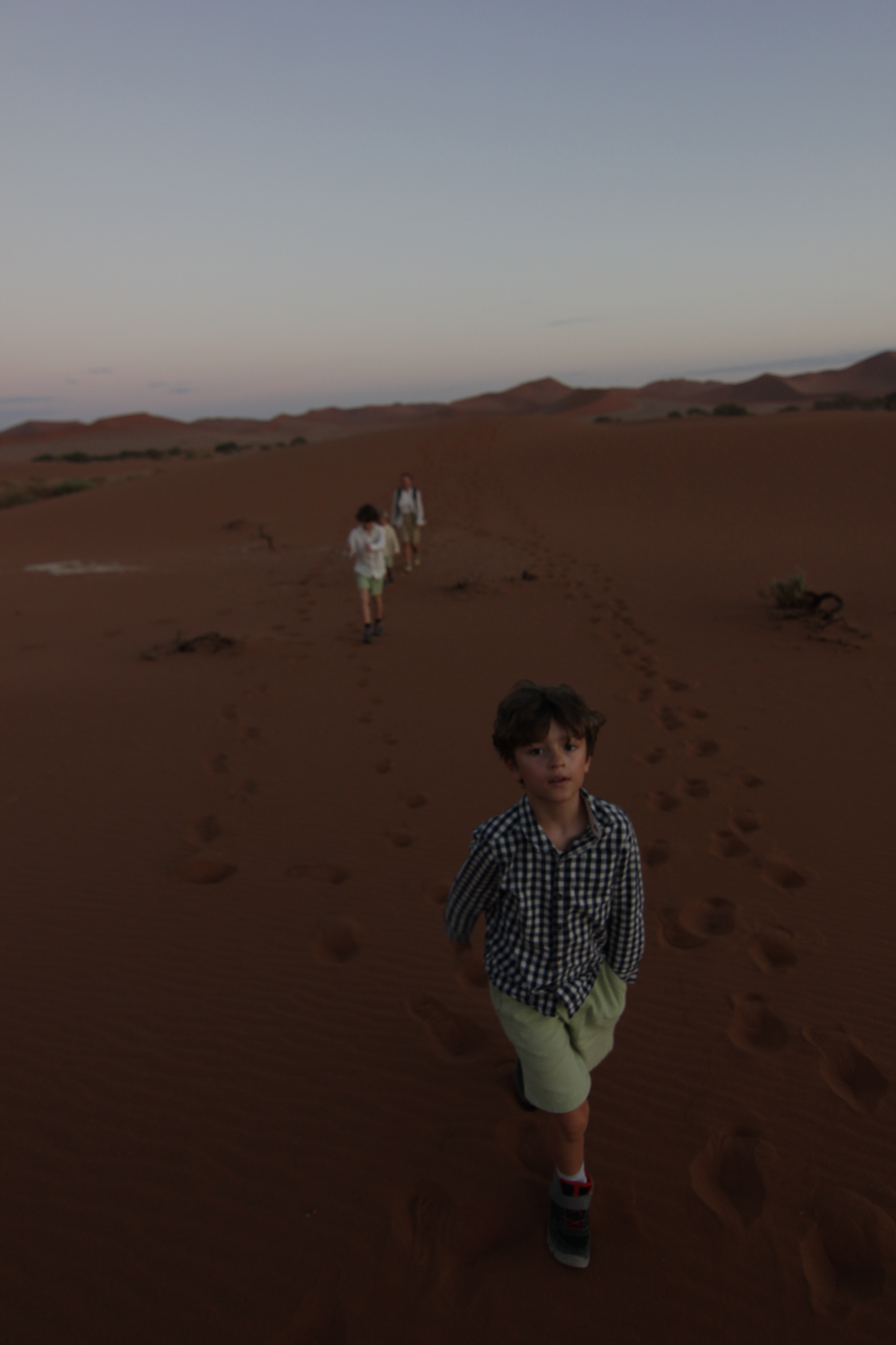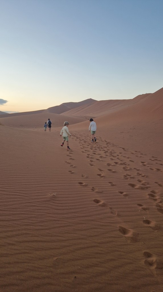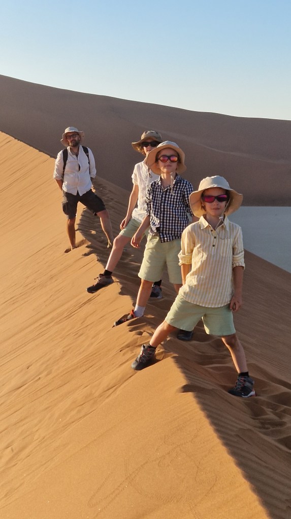 Nathalie a profité du trajet pour tartiner les garçons de crème solaire, hors de question d’y couper également pour les adultes, la lumière du jour est de plus en plus présente, il est désormais évident, même si cela ne faisait déjà guère de doute, que la journée qui s’annonce sera l’une des plus chaude que nous connaîtrons. Pas de vent du tout, pas de nuage du tout, malgré l’excitation liée à notre exploration du jour, il faudra faire preuve de la plus grande vigilance, les organismes seront mis à rude épreuve! Nous descendons du véhicule, mangeons quelques gâteaux secs et prenons un peu d’eau avant de débuter l’ascension de la dune Big Daddy, vantée en Namibie comme étant la plus haute du monde, mais étant en réalité la 3ème ou 4ème avec ses 390 mètres de hauteur. Cela reste un très belle bête, il ne faut pas se méprendre, la Tour Eiffel fait à titre de comparaison 300m de hauteur. C’est donc un vrai challenge que nous nous imposons aujourd’hui, et même s’il est clair que nous ne pourrons pas aller jusqu’au bout, l’envie de grimper le plus haut possible prédomine, pour pouvoir observer l’un des plus beaux lever de soleil qui soit sur notre planète. Et puis bon, les enfants eux, les challenges, ils aiment ça! Ce qu’ils ne réalisent pas, c’est la difficulté de l’effort que cela demande! Ils ne tardent pas à le découvrir, passés les premiers pas sur la zone de plat avant de commencer à grimper sur la ligne de crête de la dune, le sable commence très rapidement à se glisser dans les chaussures, et il ne nous quittera plus!