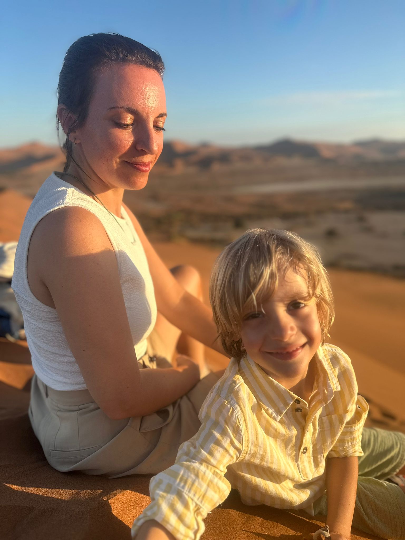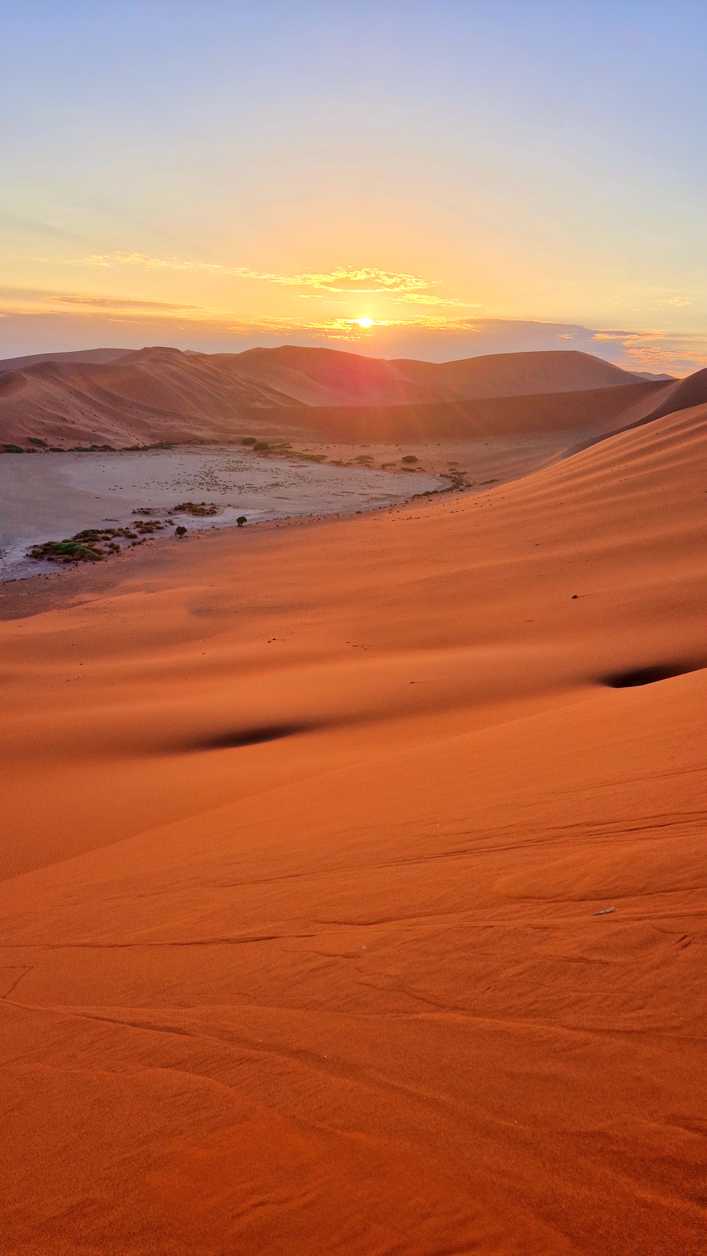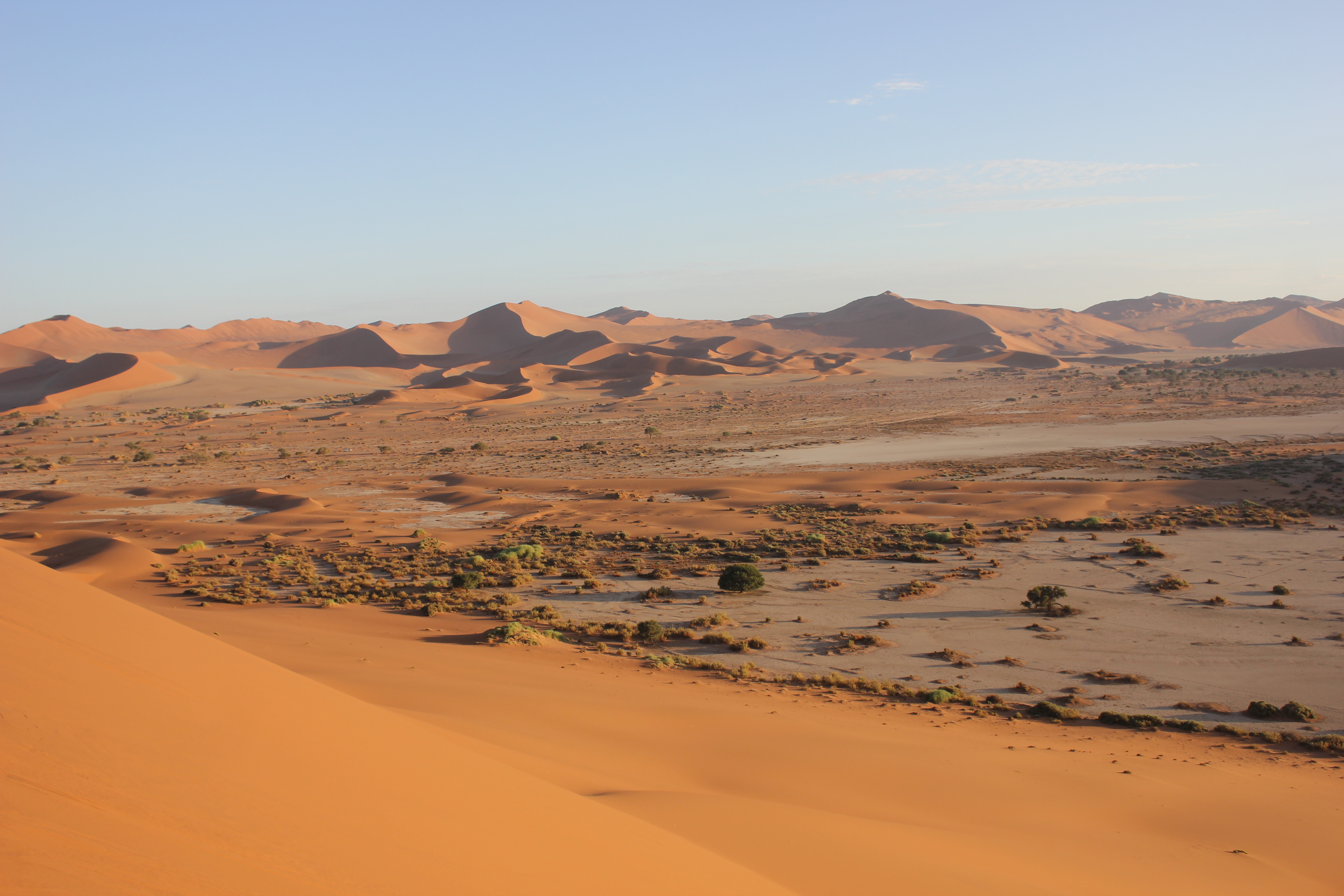 Nathalie a profité du trajet pour tartiner les garçons de crème solaire, hors de question d’y couper également pour les adultes, la lumière du jour est de plus en plus présente, il est désormais évident, même si cela ne faisait déjà guère de doute, que la journée qui s’annonce sera l’une des plus chaude que nous connaîtrons. Pas de vent du tout, pas de nuage du tout, malgré l’excitation liée à notre exploration du jour, il faudra faire preuve de la plus grande vigilance, les organismes seront mis à rude épreuve! Nous descendons du véhicule, mangeons quelques gâteaux secs et prenons un peu d’eau avant de débuter l’ascension de la dune Big Daddy, vantée en Namibie comme étant la plus haute du monde, mais étant en réalité la 3ème ou 4ème avec ses 390 mètres de hauteur. Cela reste un très belle bête, il ne faut pas se méprendre, la Tour Eiffel fait à titre de comparaison 300m de hauteur. C’est donc un vrai challenge que nous nous imposons aujourd’hui, et même s’il est clair que nous ne pourrons pas aller jusqu’au bout, l’envie de grimper le plus haut possible prédomine, pour pouvoir observer l’un des plus beaux lever de soleil qui soit sur notre planète. Et puis bon, les enfants eux, les challenges, ils aiment ça! Ce qu’ils ne réalisent pas, c’est la difficulté de l’effort que cela demande! Ils ne tardent pas à le découvrir, passés les premiers pas sur la zone de plat avant de commencer à grimper sur la ligne de crête de la dune, le sable commence très rapidement à se glisser dans les chaussures, et il ne nous quittera plus!