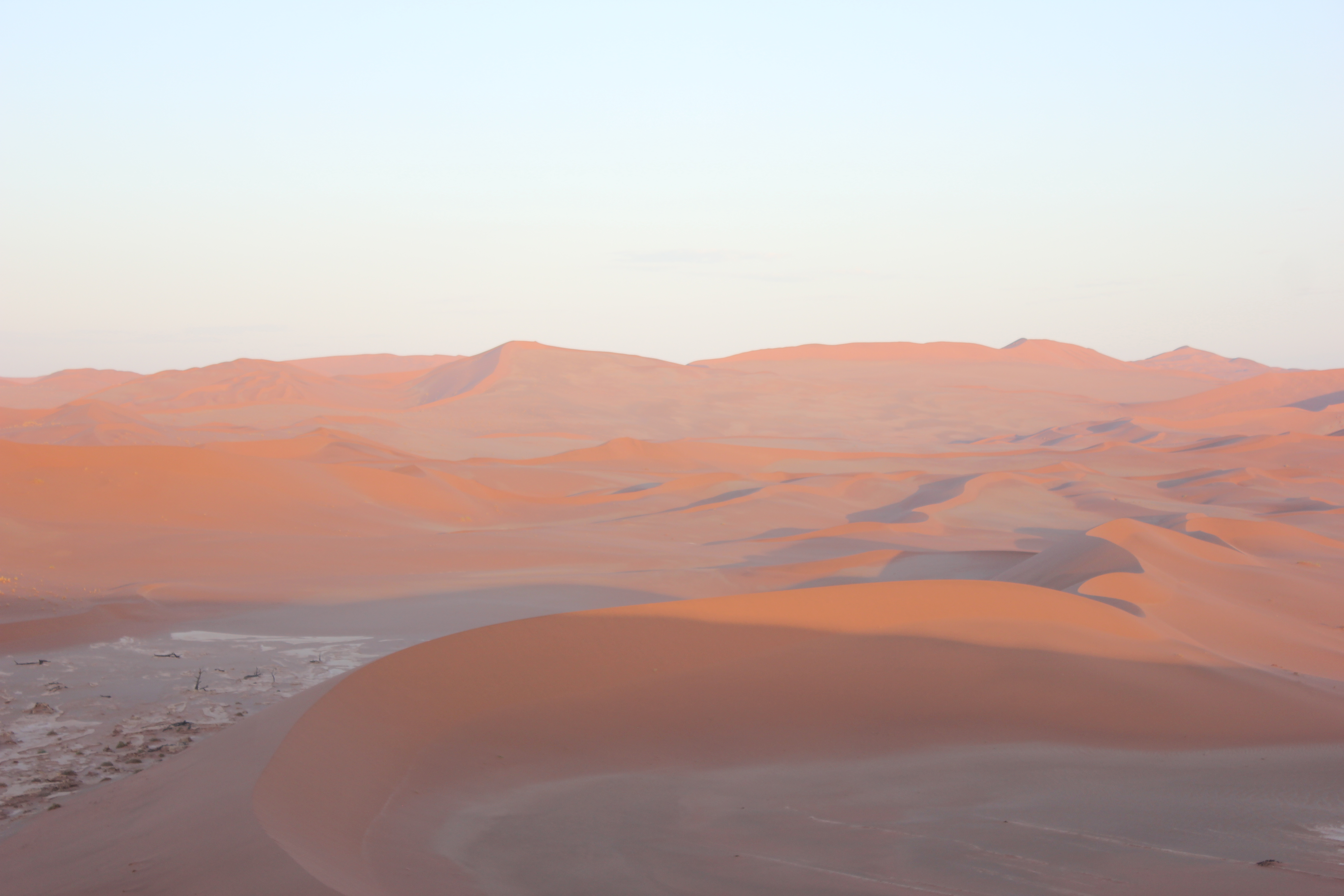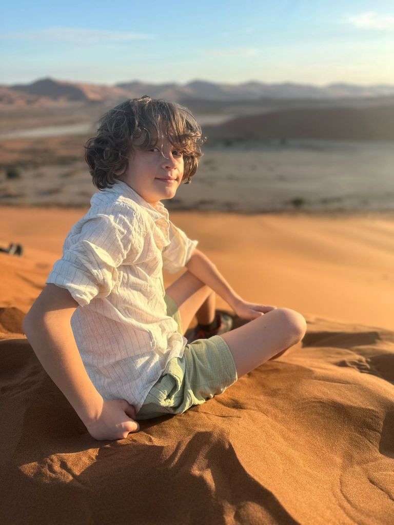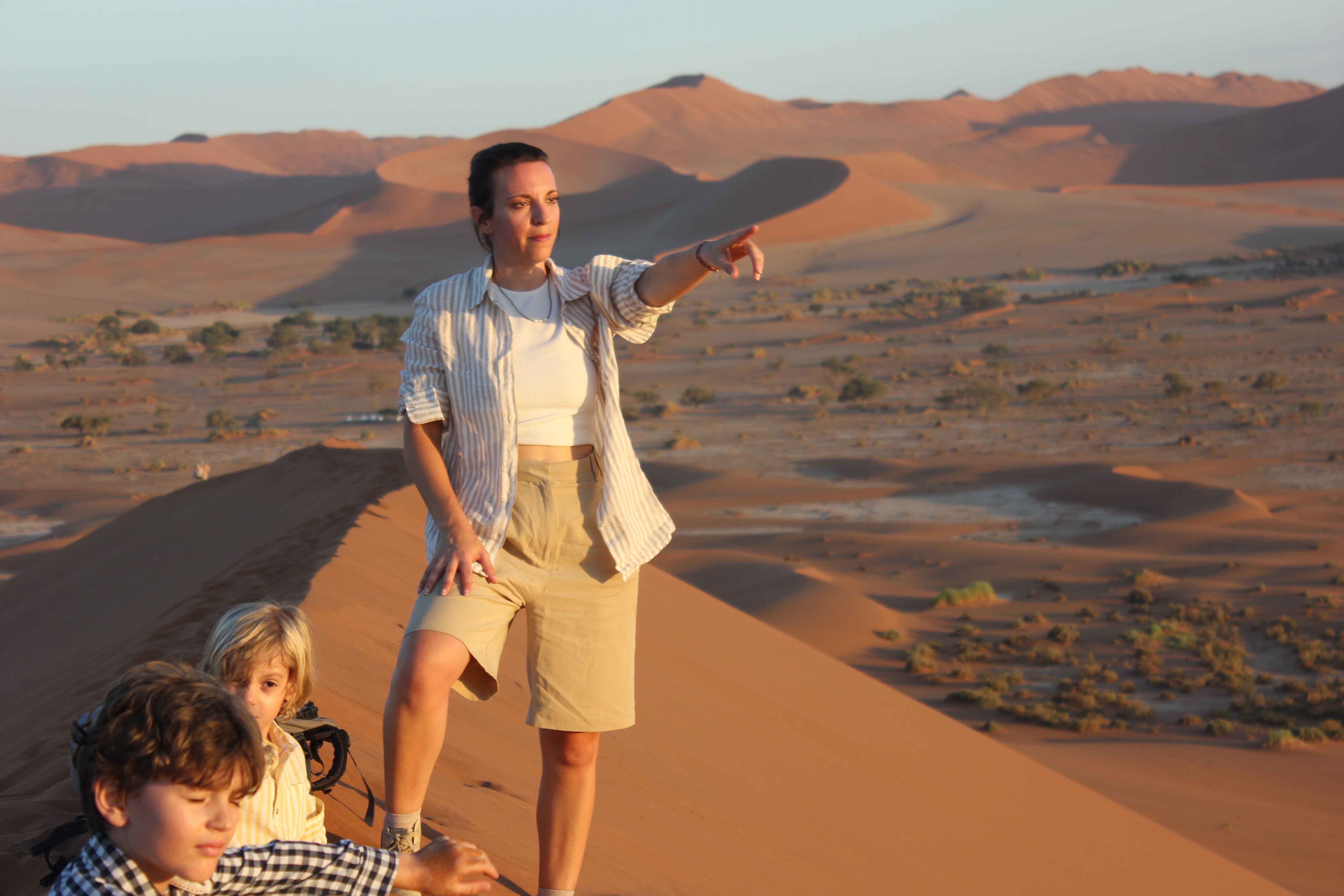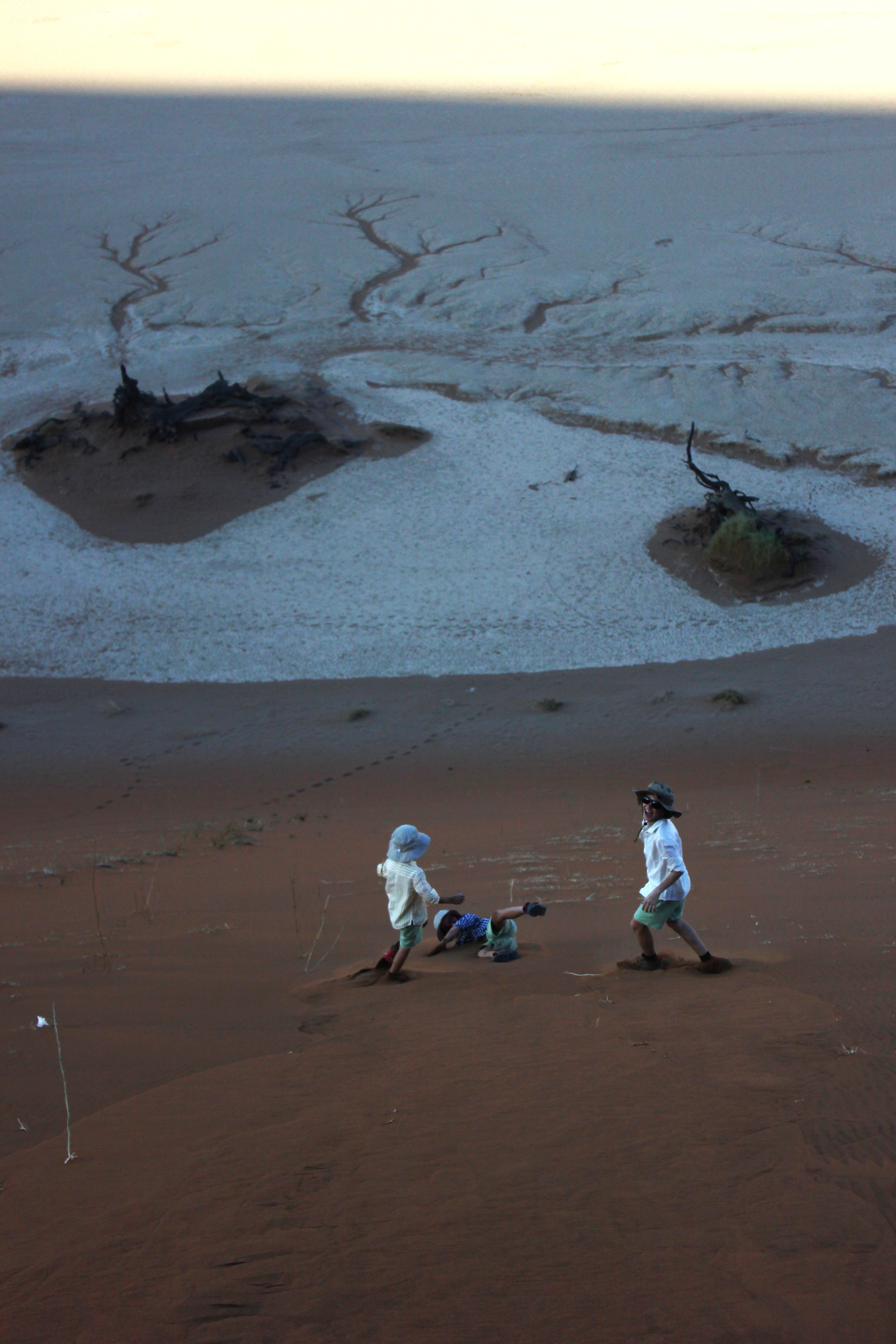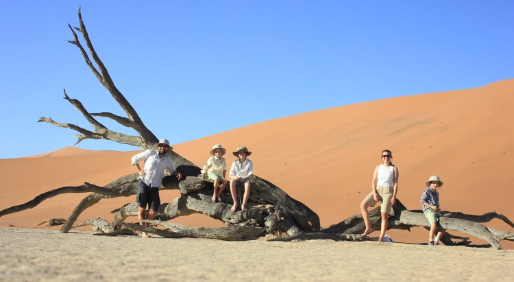 C’est donc d’un pas à la fois déterminé mais lourd que nous entamons notre marche le sable est d’une finesse incomparable, nécessitant une certaine concentration pour ne pas tomber ou avoir un faux appuis. On a beau essayer de caler nos pas sur les traces laissées par les premiers randonneurs, l’ascension reste quelque peu laborieuse et exigeante pour nous 5, il nous faut nous arrêter régulièrement, ne pas trop forcer, et nous hydrater très régulièrement. Au fur et à mesure que nous prenons de la hauteur, c’est un paysage lunaire, non fantastique, qui se dévoile à nos yeux. A droite nous pouvons voir les arbres pétrifiés de Deadvlei, sur notre gauche la vallée qui s’étend sur des dizaines de kilomètres avec les dunes qui se terminent tout au long, face à nous c’est la cime de Big Daddy que nous voyons au loin, et derrière c’esst une étendue infinie de sable, avec les silhouettes de quelques marcheurs derrière nous. Si au départ, avec l’entrain et l’excitation nous parlions tous ensembles, là les paroles se font plus rares pour nous économiser et garder notre souffle, laissant place à un silence d’or, un or ocre qui s’étend à perte de vue. Le soleil semble être sur le point d’apparaître, nous faisons une première grosse halte, avec Deadvlei, pour prendre le petit-déjeuner le plus grandiose que nous ayons déjà vus tous les 5 ensembles. C’est beau, magique. Il n’y a pas d’autre mot. Nous voir tous les 5 ensemble, sur cette crête de dune, perdus au milieu de l’infini, dans un décor de rêve, c’est un moment que j’ai attendu, espéré, fantasmé, pendant des semaines, non des mois. Et maintenant, nous y sommes. Quel meilleur endroit qu’ici, quel meilleur moment que maintenant, qui mieux que nous 5? Et voilà que le soleil apparaît sur les hauteurs des dunes, nous éblouissant de sa puissance, et nous chauffant un peu plus. A partir de maintenant, et même s’il ne fait pas encore trop chaud, nous savons que le temps nous est compté, nos efforts vont prendre une autre dimension, avec la chaleur qui va se mettre à grimper. Mais pour le moment, rien d’autre n’existe, nous profitons de ce bon moment, les enfants semblent aussi être impressionnés et respectueux par ce qu’ils vivent, c’est très touchant. Quelques photos plus tard nous reprenons notre route, pour nous arrêter à environ 40-50% du trajet qu’il faudrait pour rejoindre la cime de Big Daddy, pour refaire quelques photos, et refaire une bonne halte. Le soleil rend les choses beaucoup plus compliquées, sans oublier que chacune de nos chaussure pèse 1 voir 2kg de plus avec le sable, et qu’il nous faut rester raisonnable. Mais être raisonnable, quand on est avec trois enfants, sur la crête d’une dune majestueuse, et que notre prochain objectif ce sont les arbres de Deadvlei, situé en contrebas, vous croyez que c’est possible? Vous nous croyez vraiment que l’on va refaire le chemin en sens inverse, plutôt que de dévaler la dune directement, quitte à se prendre des gamelles? Impossible! Après l’effort, place à un bon moment de rigolade, avec la descente de la dune, qui contrairement à la montée, aura pris 2-3 min à se faire, alors que nous venons de grimper plusieurs heures. Je fais le gars sérieux en faisant le premier de cordée et en essayant de faire des diagonales dans le sable, pour ne pas tout dévaler en courant, mais il était entendu que cela se terminerait en course entre nos trois loustics, pour rendre ce moment très fun, les photos que vous allez voir parlent d’elles-même! Arrivés en bas, premier réflexe, enlever les sable dans nos chaussures de marche, boire un coup, reprendre notre respiration. Puis se rendre compte que ça y est, face à nous s’ouvre un nouveau terrain d’exploration, fantastique lui aussi, à savoir Deadvlei et ses arbres millénaires, pétrifiés dans le temps…