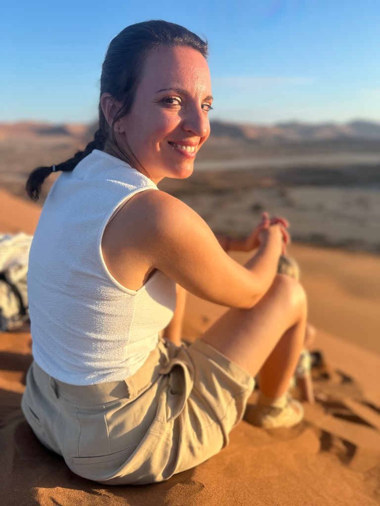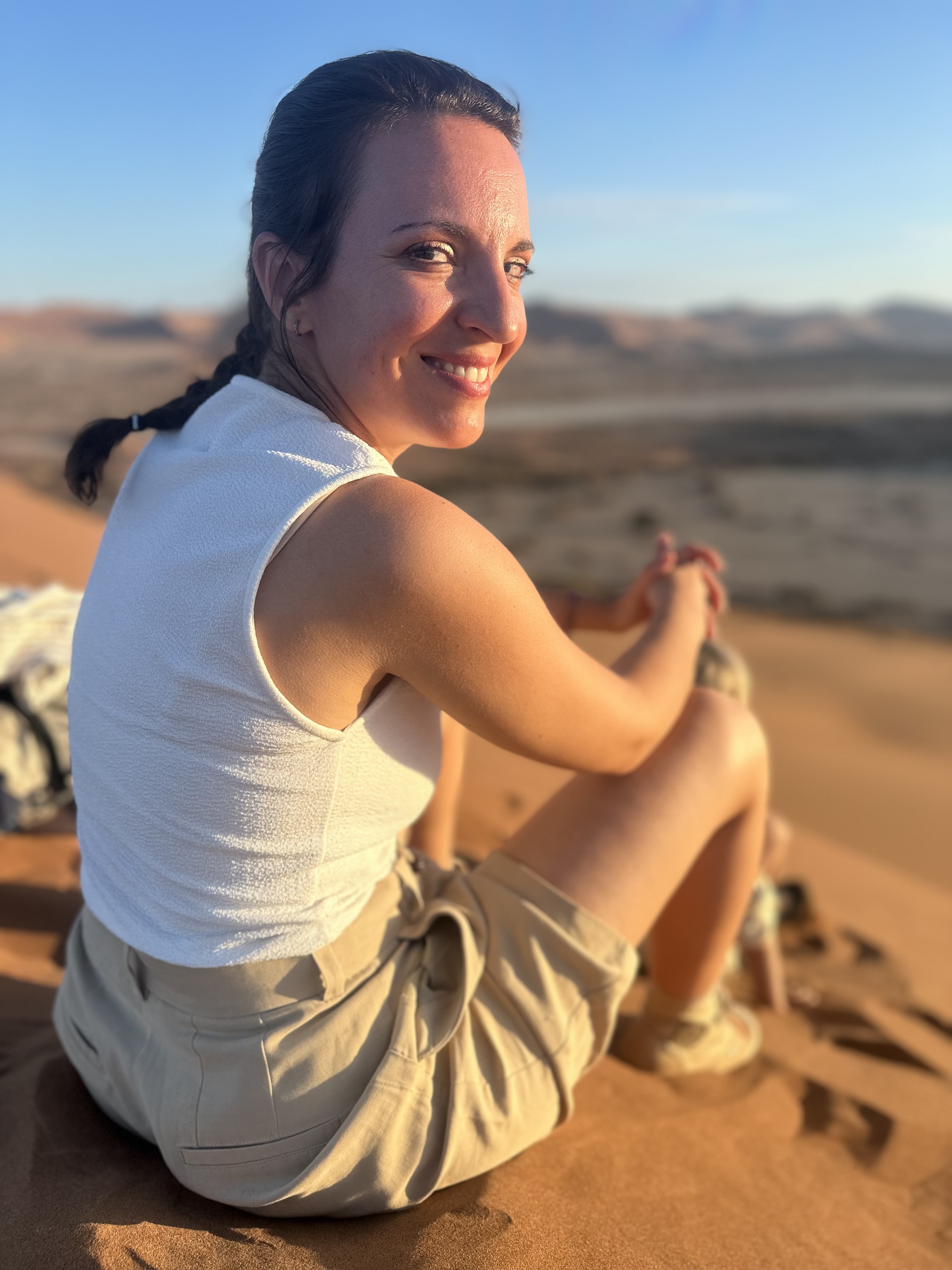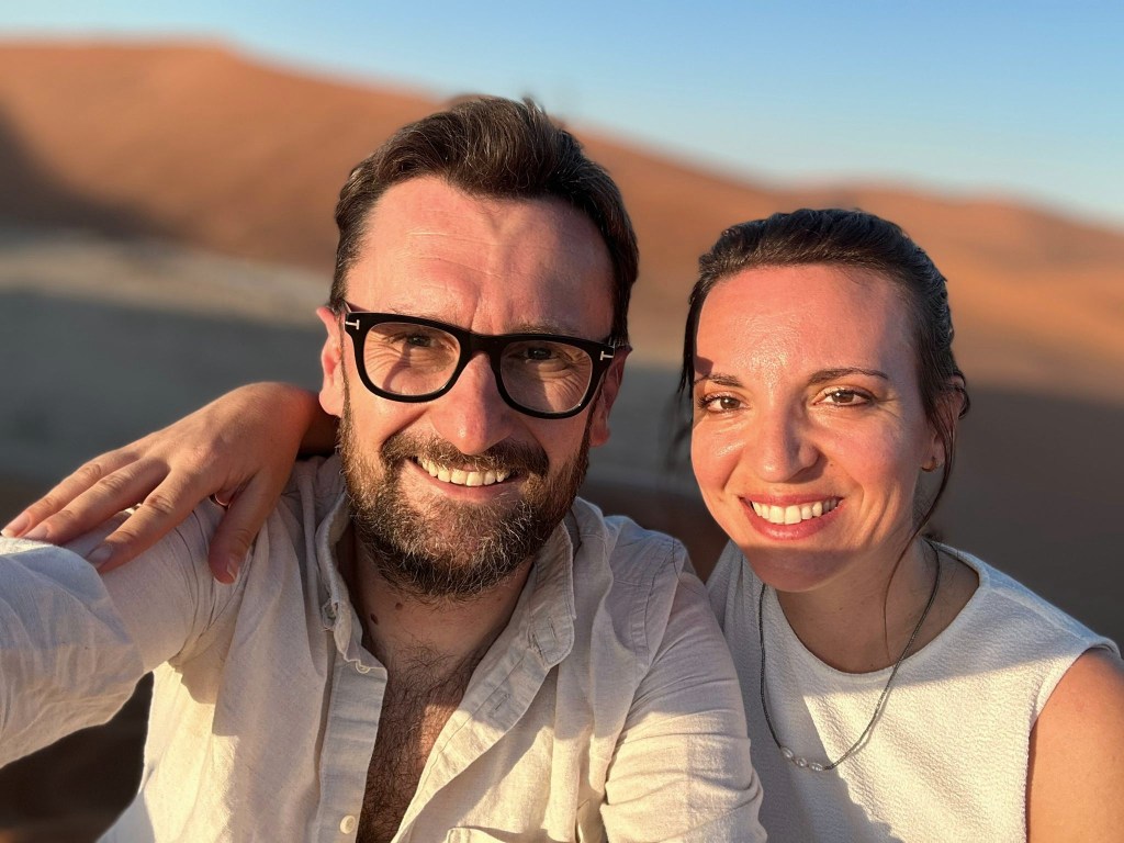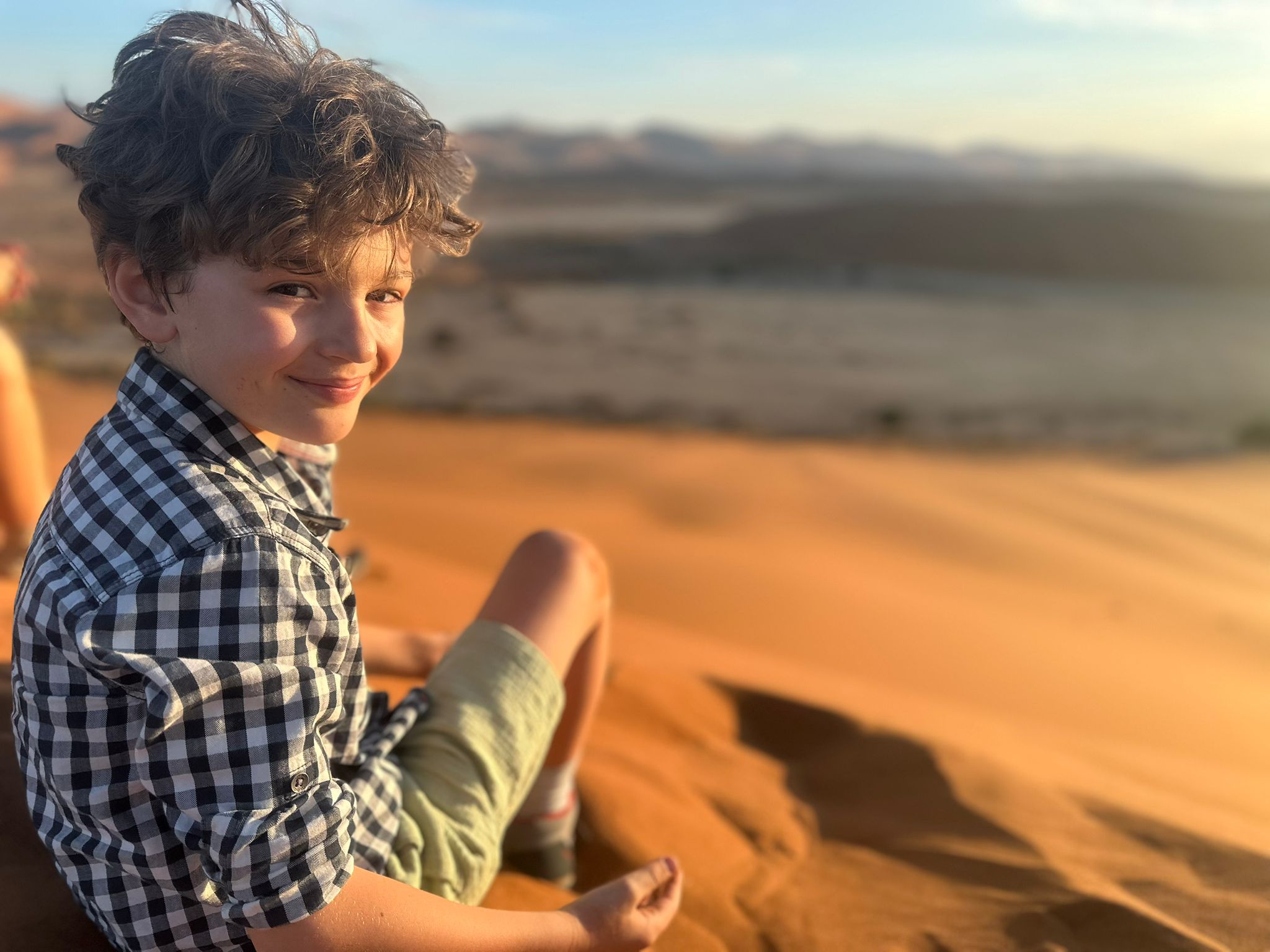 C’est donc d’un pas à la fois déterminé mais lourd que nous entamons notre marche le sable est d’une finesse incomparable, nécessitant une certaine concentration pour ne pas tomber ou avoir un faux appuis. On a beau essayer de caler nos pas sur les traces laissées par les premiers randonneurs, l’ascension reste quelque peu laborieuse et exigeante pour nous 5, il nous faut nous arrêter régulièrement, ne pas trop forcer, et nous hydrater très régulièrement. Au fur et à mesure que nous prenons de la hauteur, c’est un paysage lunaire, non fantastique, qui se dévoile à nos yeux. A droite nous pouvons voir les arbres pétrifiés de Deadvlei, sur notre gauche la vallée qui s’étend sur des dizaines de kilomètres avec les dunes qui se terminent tout au long, face à nous c’est la cime de Big Daddy que nous voyons au loin, et derrière c’esst une étendue infinie de sable, avec les silhouettes de quelques marcheurs derrière nous. Si au départ, avec l’entrain et l’excitation nous parlions tous ensembles, là les paroles se font plus rares pour nous économiser et garder notre souffle, laissant place à un silence d’or, un or ocre qui s’étend à perte de vue. Le soleil semble être sur le point d’apparaître, nous faisons une première grosse halte, avec Deadvlei, pour prendre le petit-déjeuner le plus grandiose que nous ayons déjà vus tous les 5 ensembles. C’est beau, magique. Il n’y a pas d’autre mot. Nous voir tous les 5 ensemble, sur cette crête de dune, perdus au milieu de l’infini, dans un décor de rêve, c’est un moment que j’ai attendu, espéré, fantasmé, pendant des semaines, non des mois. Et maintenant, nous y sommes. Quel meilleur endroit qu’ici, quel meilleur moment que maintenant, qui mieux que nous 5? Et voilà que le soleil apparaît sur les hauteurs des dunes, nous éblouissant de sa puissance, et nous chauffant un peu plus. A partir de maintenant, et même s’il ne fait pas encore trop chaud, nous savons que le temps nous est compté, nos efforts vont prendre une autre dimension, avec la chaleur qui va se mettre à grimper. Mais pour le moment, rien d’autre n’existe, nous profitons de ce bon moment, les enfants semblent aussi être impressionnés et respectueux par ce qu’ils vivent, c’est très touchant. Quelques photos plus tard nous reprenons notre route, pour nous arrêter à environ 40-50% du trajet qu’il faudrait pour rejoindre la cime de Big Daddy, pour refaire quelques photos, et refaire une bonne halte. Le soleil rend les choses beaucoup plus compliquées, sans oublier que chacune de nos chaussure pèse 1 voir 2kg de plus avec le sable, et qu’il nous faut rester raisonnable. Mais être raisonnable, quand on est avec trois enfants, sur la crête d’une dune majestueuse, et que notre prochain objectif ce sont les arbres de Deadvlei, situé en contrebas, vous croyez que c’est possible? Vous nous croyez vraiment que l’on va refaire le chemin en sens inverse, plutôt que de dévaler la dune directement, quitte à se prendre des gamelles? Impossible! Après l’effort, place à un bon moment de rigolade, avec la descente de la dune, qui contrairement à la montée, aura pris 2-3 min à se faire, alors que nous venons de grimper plusieurs heures. Je fais le gars sérieux en faisant le premier de cordée et en essayant de faire des diagonales dans le sable, pour ne pas tout dévaler en courant, mais il était entendu que cela se terminerait en course entre nos trois loustics, pour rendre ce moment très fun, les photos que vous allez voir parlent d’elles-même! Arrivés en bas, premier réflexe, enlever les sable dans nos chaussures de marche, boire un coup, reprendre notre respiration. Puis se rendre compte que ça y est, face à nous s’ouvre un nouveau terrain d’exploration, fantastique lui aussi, à savoir Deadvlei et ses arbres millénaires, pétrifiés dans le temps…