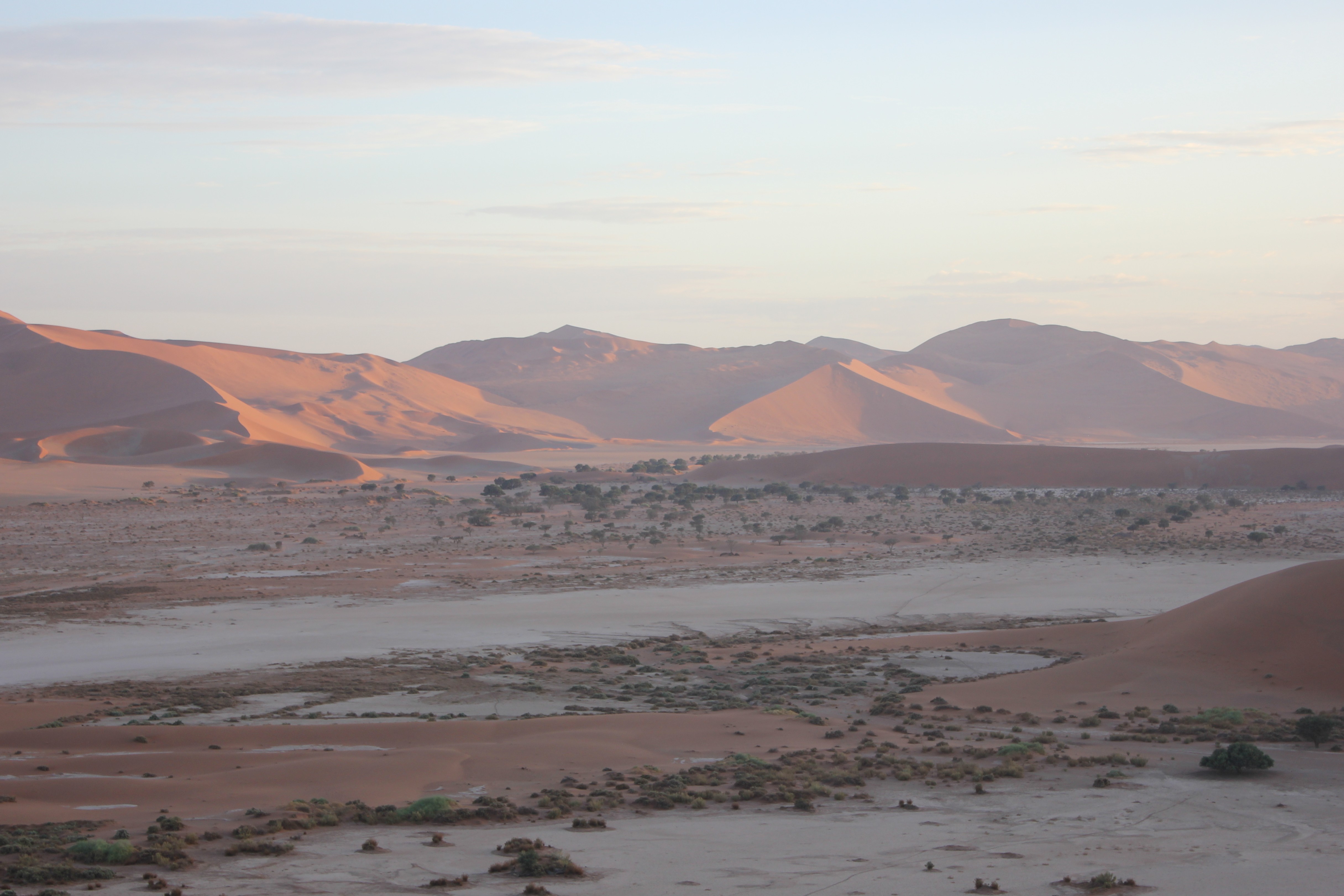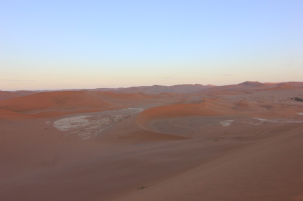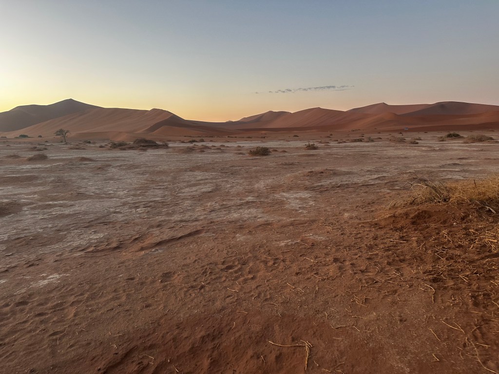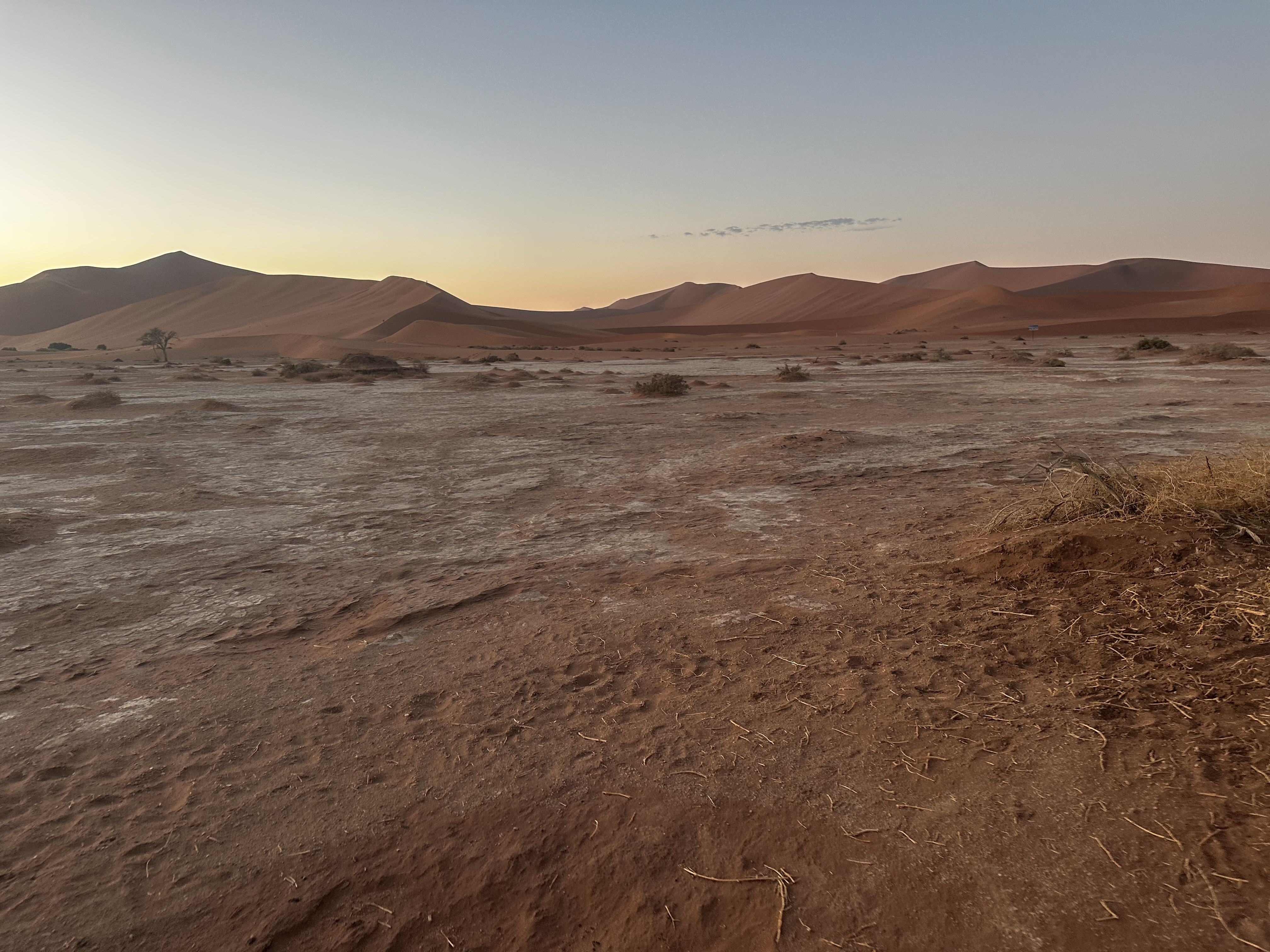 Nous franchissons les portes du National Naukluft Park à 5H30, nous ne sommes bien entendu pas les seuls à prendre la route en direction des dunes de Sossusvlei, nous pouvons observer quelques phares devant et derrière nous. Mais au final, pas tant que cela, ce qui est en soit une excellente nouvelle, ce ne sera pas la cohue pour grimper sur les dunes, et nous pourrons profiter une fois de plus d’un moment privilégié. Les 55 premiers kilomètres se font dans le noir ou à la faible lueur du ciel qui commence à se lever, nous nous arrêtons au niveau du parking afin de prendre une navette qui nous conduira jusqu’à Sossusvlei. En effet, les 5 derniers kilomètres du trajet se font dans un sable mou, ou les enlisements peuvent survenir assez vite. Bien qu’équipés de tout le matériel nécessaire pour ajuster la pression des pneus, je ne souhaite pas prendre le risque de perdre du temps pour observer le lever de soleil, et nous préférons largement payer quelques centaines de dollars namibiens pour assurer le coup. Au final, pour nous 5, nous en avons pour 700 dollars, soit 32 euros pour le trajet aller-retour, ce qui est peu et beaucoup à la fois. Mais comme dit, je ne me sens pas de prendre le risque de perdre ce temps précieux, et c’est donc bien installés dans un van que nous effectuons les derniers kilomètres pour rejoindre le parking. Et comme nous nous en doutions, nous croiserons 2 ou 3 véhicules ensablés dès les premières centaines de mètres, nous confortant un peu plus dans notre choix. Le chauffeur lui n’a peur de rien avec son van, bien au contraire, et file à bonne allure, nous faisans arriver sur le dernier parking vers 6H30.