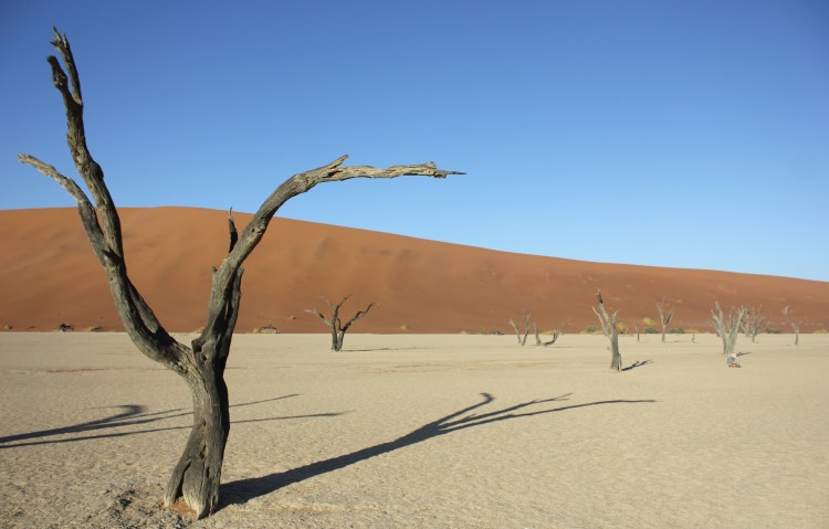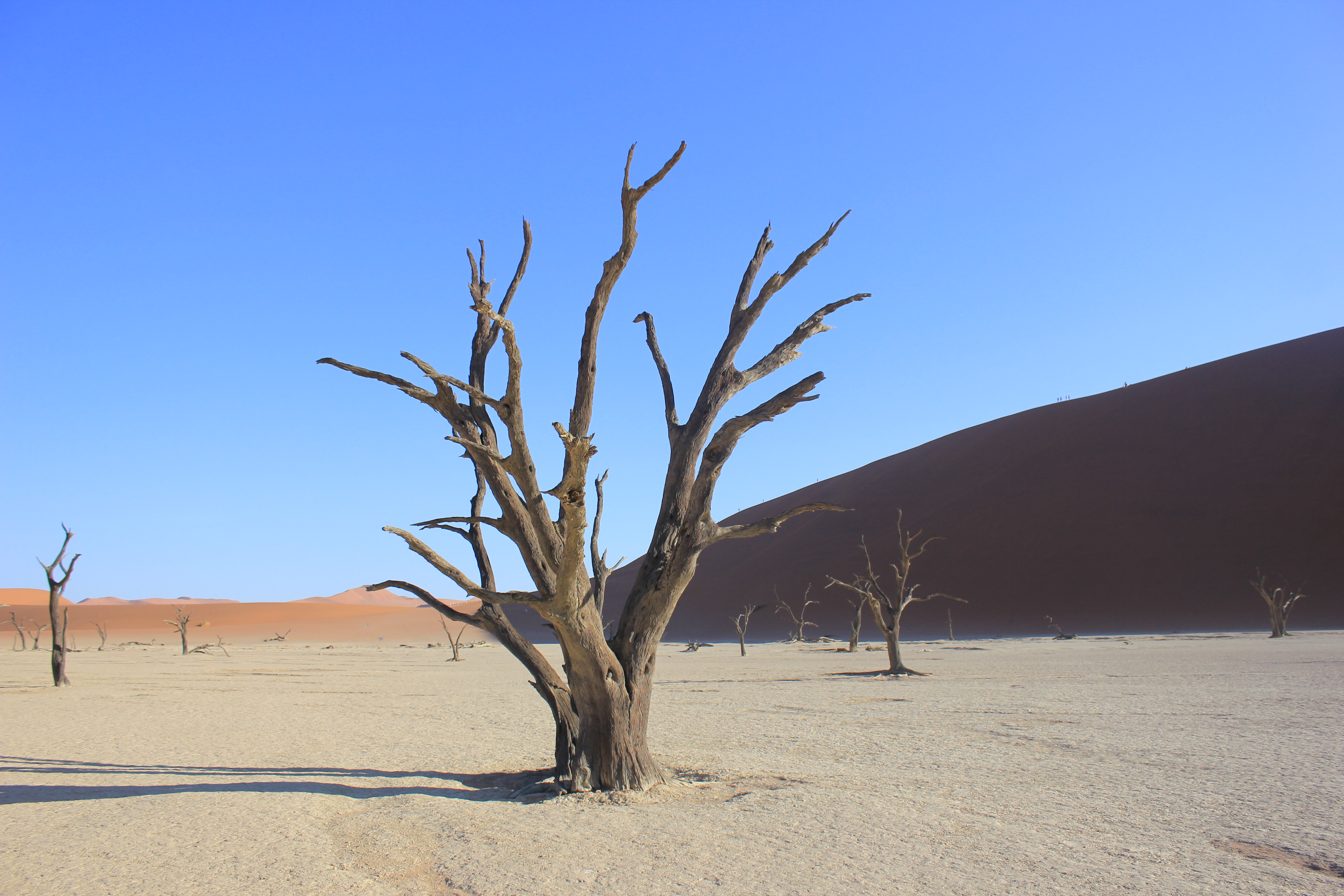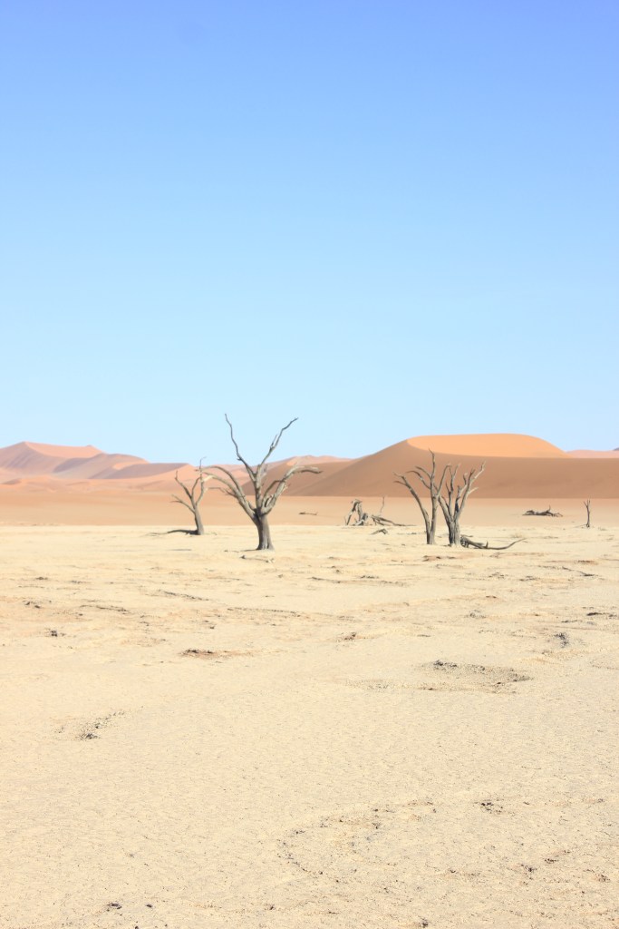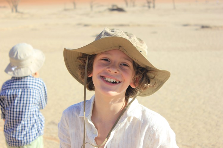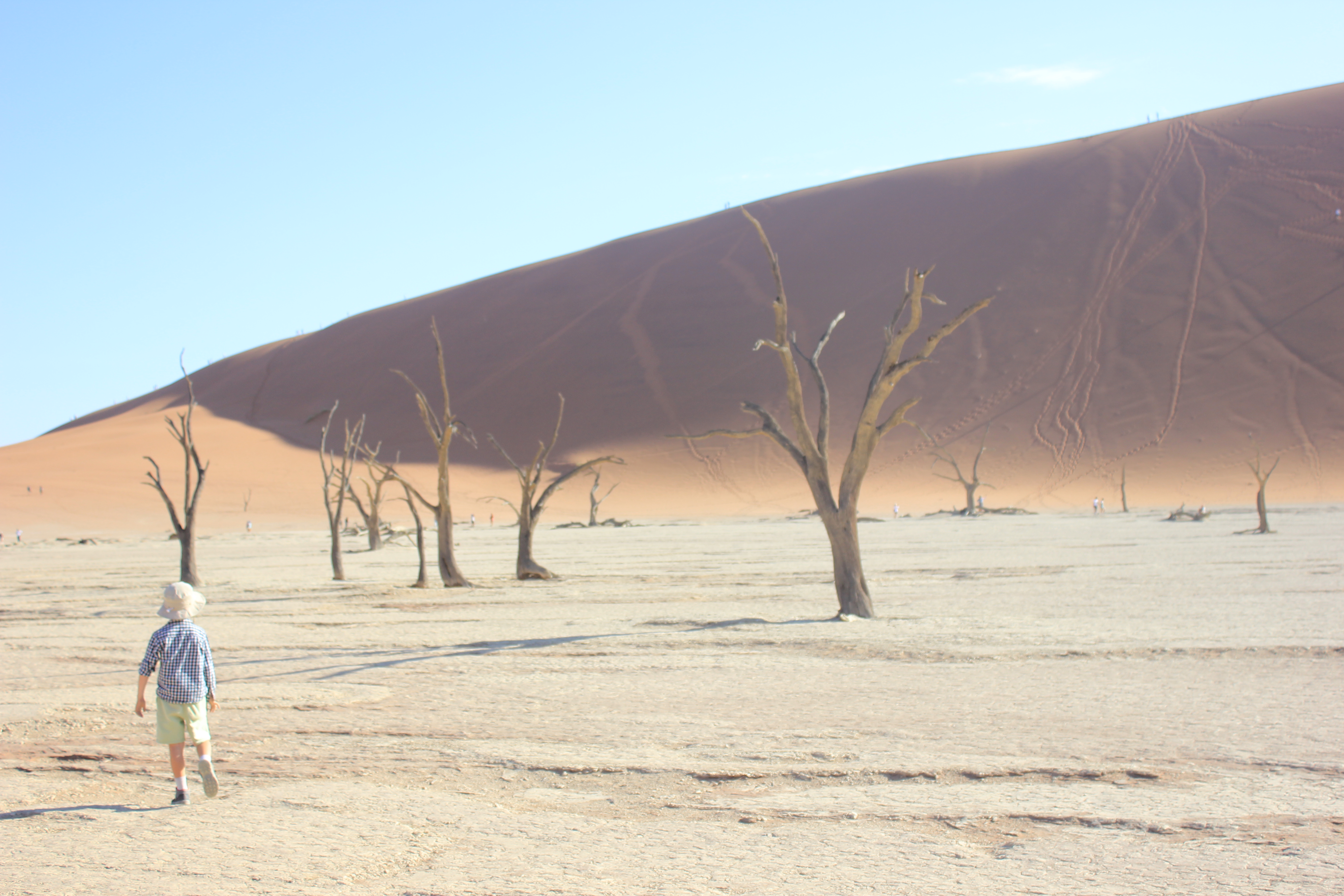 Une fois que nous avons pu reprendre notre souffle, remettre nos chapeaux à peu près en place, nous voici donc face à la beauté de Deadvlei. Avant de se lancer dans une exploration ou chacun va pouvoir librement déambuler entre les arbres millénaires, nous faisons une petite présentation aux enfants. Les souches d’arbres qu’il voient ici ont vécues il y a plus ou moins 1000ans, et ne sont jamais entrés en décomposition à leur mort. Le climat chaud, sec, et sans aucune humidité (ou presque), n’a pas permis aux arbres de retourner à la Terre, et sont restés ainsi, figés dans le temps. C’est une formidable histoire à raconter, lorsque l’on caresse doucement l’écorce d’un arbre, on peut sentir toutes les fibres qui le composaient. La couleur grisâtre, ajoutée aujourd’hui à ce soleil de plomb, rend Deadvlei encore plus fantastique que dans mes souvenirs, Les couleurs sont exacerbées, que ce soit le sable rouge des dunes, la terre jaunie, ou encore le ciel d’un bleu infini. Tout est graphique, tout prête à la contemplation. Chaque pas que l’on fait ajoute un intérêt encore différent du précédent, les angles de fuite courent dans tous les sens, c’est le paradis pour les photographes, et les amoureux de la nature. Les enfants eux de leur côté regardent aussi les formes très variées des arbres, mais finissent par s’organiser une partie de cache-cache, à se planquer un peu partout derrière les arbres. Nous profitons que Deadvlei ne soit pas encore pris d’assaut par trop de touristes pour faire des photos, prendre la pause, ou tout simplement s’assoir pour contempler ce miracle de la nature. De mon côté, les photos s’emmagasinent dans la carte mémoire de l’appareil, j’y vais même à contre-jour, peu importe si je crame mon boitier, ce dernier aura déjà vécu de très belles histoires, et je me dis que s’il doit rendre l’âme, autant que ce soit dans cet endroit. Bon, j’en ai encore quand même un peu besoin pour la suite du voyage, je tâche de faire un minimum attention, mais j’avoue prendre un plaisir énorme à jouer avec les réglages manuels, essayer tel ou tel angle, les cadrages. Je me prends pour Yann Arthus Bertrand, pour Nicolas Hulot, ou je ne sais quel explorateur. Nathalie elle aussi explore, regarde, contemple, sourit en regardant les enfants s’amuser dans cet endroit. Nous restons autant que possible à profiter d’être dans cet endroit unique, mais nous sommes vite rattrapés par la chaleur, il est déjà environ 10H, le soleil est maintenant haut dans le ciel, et nos réserves d’eau commencent à fondre. Tout le monde se met en ordre de marche pour retourner au parking retrouver notre chauffeur, à contrecœur. Mais au final nous sommes tous assez épuisés par la marche dans le sable et l’exploration de Deadvlei, et la chaleur ne rend pas les choses plus faciles.