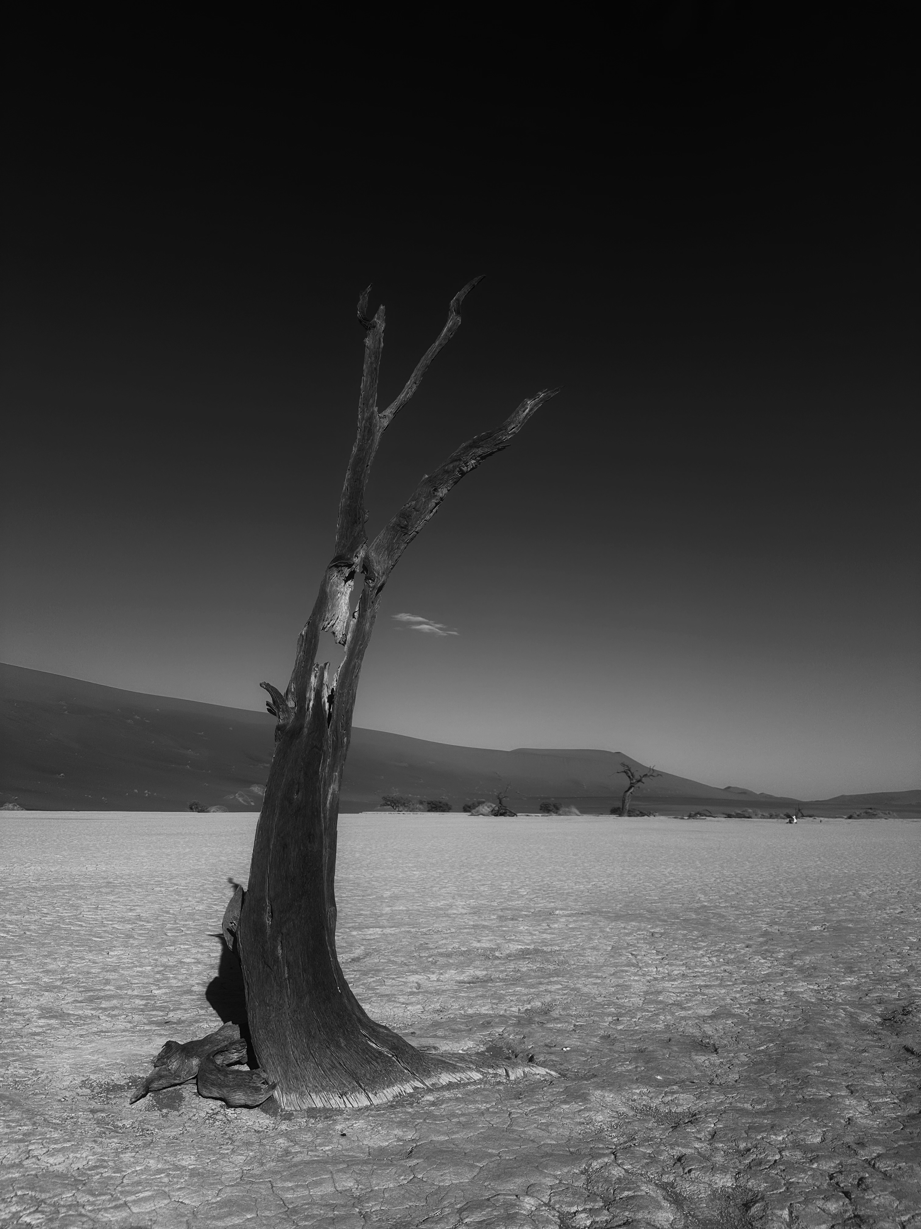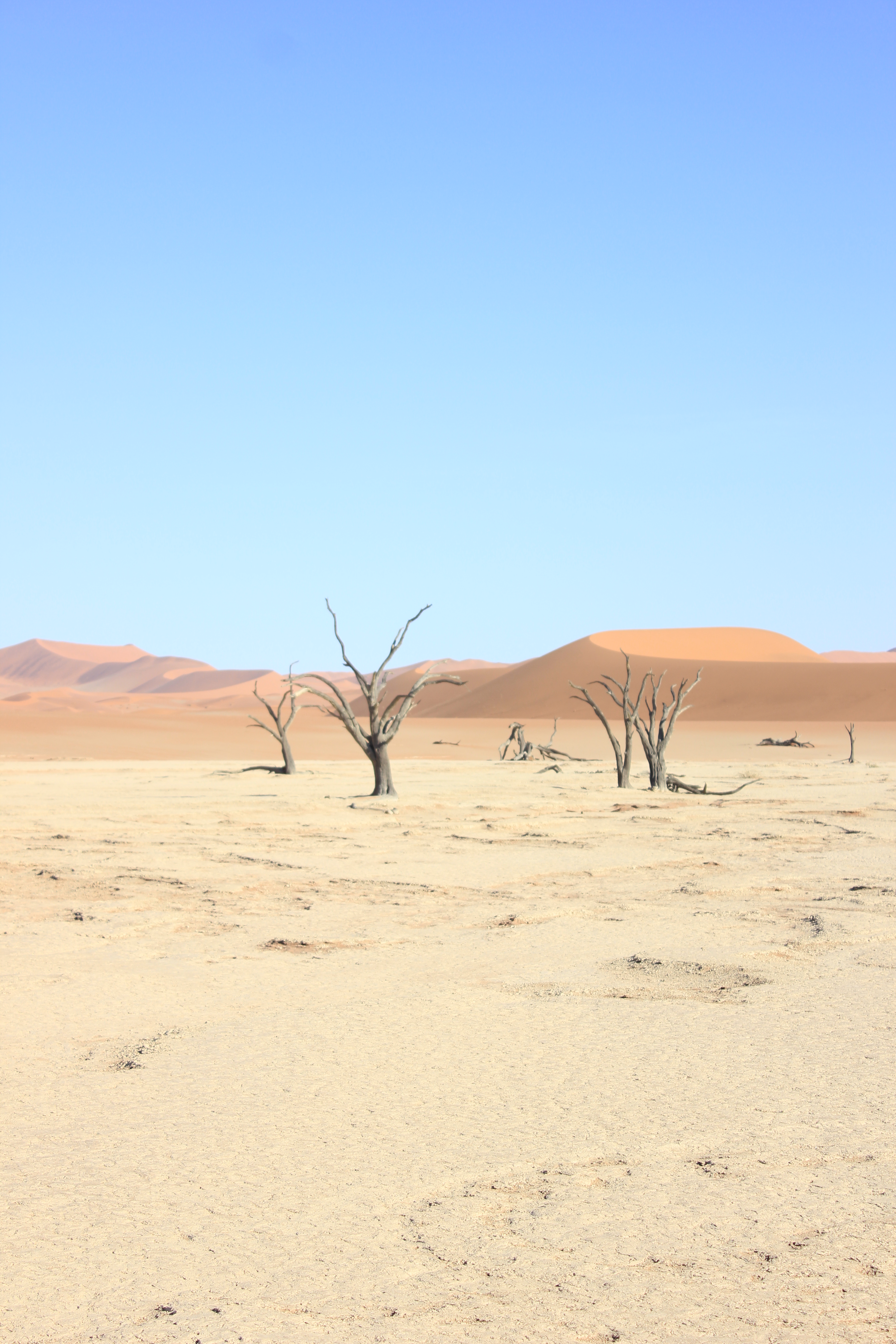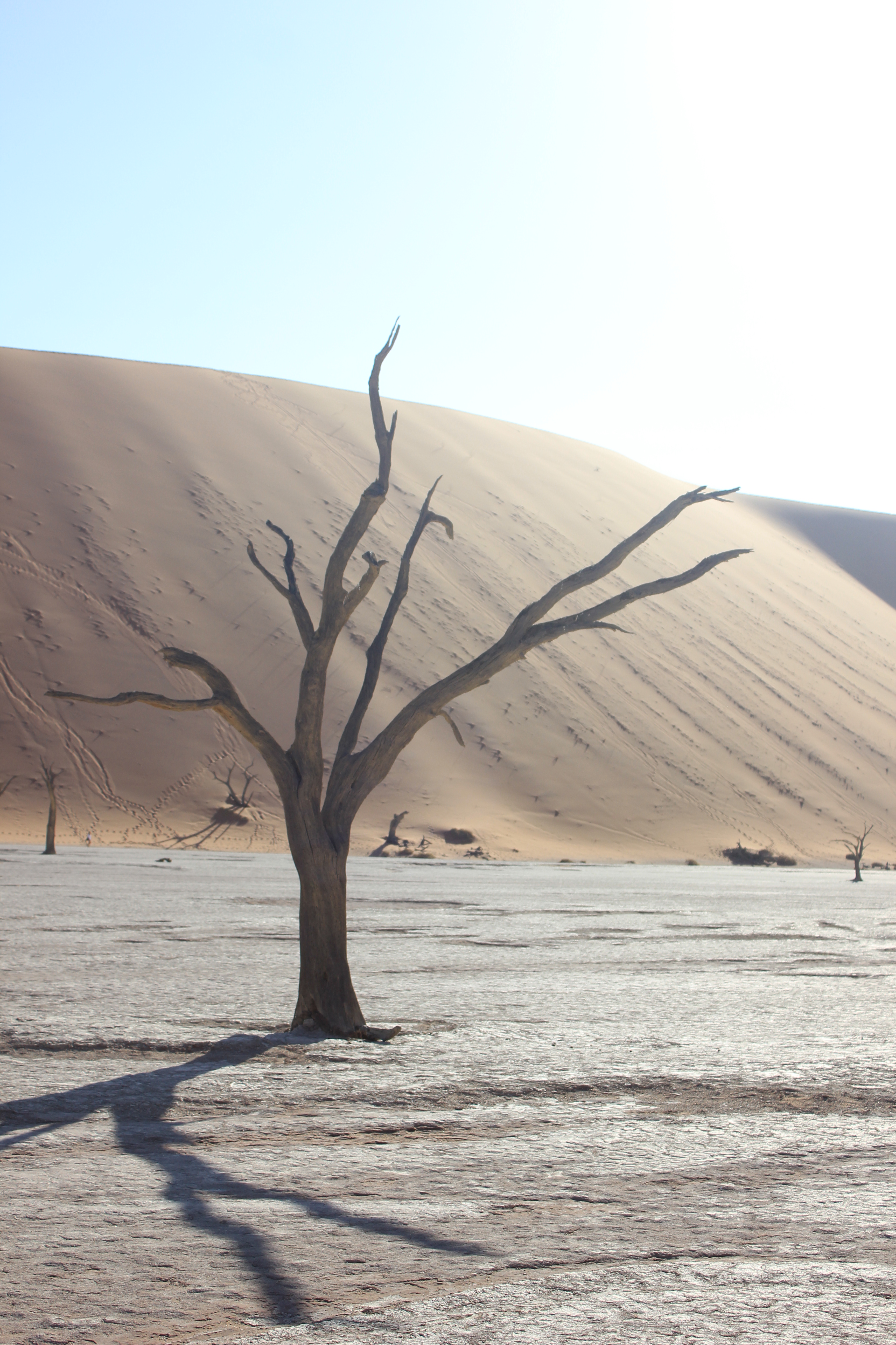 Une fois que nous avons pu reprendre notre souffle, remettre nos chapeaux à peu près en place, nous voici donc face à la beauté de Deadvlei. Avant de se lancer dans une exploration ou chacun va pouvoir librement déambuler entre les arbres millénaires, nous faisons une petite présentation aux enfants. Les souches d’arbres qu’il voient ici ont vécues il y a plus ou moins 1000ans, et ne sont jamais entrés en décomposition à leur mort. Le climat chaud, sec, et sans aucune humidité (ou presque), n’a pas permis aux arbres de retourner à la Terre, et sont restés ainsi, figés dans le temps. C’est une formidable histoire à raconter, lorsque l’on caresse doucement l’écorce d’un arbre, on peut sentir toutes les fibres qui le composaient. La couleur grisâtre, ajoutée aujourd’hui à ce soleil de plomb, rend Deadvlei encore plus fantastique que dans mes souvenirs, Les couleurs sont exacerbées, que ce soit le sable rouge des dunes, la terre jaunie, ou encore le ciel d’un bleu infini. Tout est graphique, tout prête à la contemplation. Chaque pas que l’on fait ajoute un intérêt encore différent du précédent, les angles de fuite courent dans tous les sens, c’est le paradis pour les photographes, et les amoureux de la nature. Les enfants eux de leur côté regardent aussi les formes très variées des arbres, mais finissent par s’organiser une partie de cache-cache, à se planquer un peu partout derrière les arbres. Nous profitons que Deadvlei ne soit pas encore pris d’assaut par trop de touristes pour faire des photos, prendre la pause, ou tout simplement s’assoir pour contempler ce miracle de la nature. De mon côté, les photos s’emmagasinent dans la carte mémoire de l’appareil, j’y vais même à contre-jour, peu importe si je crame mon boitier, ce dernier aura déjà vécu de très belles histoires, et je me dis que s’il doit rendre l’âme, autant que ce soit dans cet endroit. Bon, j’en ai encore quand même un peu besoin pour la suite du voyage, je tâche de faire un minimum attention, mais j’avoue prendre un plaisir énorme à jouer avec les réglages manuels, essayer tel ou tel angle, les cadrages. Je me prends pour Yann Arthus Bertrand, pour Nicolas Hulot, ou je ne sais quel explorateur. Nathalie elle aussi explore, regarde, contemple, sourit en regardant les enfants s’amuser dans cet endroit. Nous restons autant que possible à profiter d’être dans cet endroit unique, mais nous sommes vite rattrapés par la chaleur, il est déjà environ 10H, le soleil est maintenant haut dans le ciel, et nos réserves d’eau commencent à fondre. Tout le monde se met en ordre de marche pour retourner au parking retrouver notre chauffeur, à contrecœur. Mais au final nous sommes tous assez épuisés par la marche dans le sable et l’exploration de Deadvlei, et la chaleur ne rend pas les choses plus faciles.