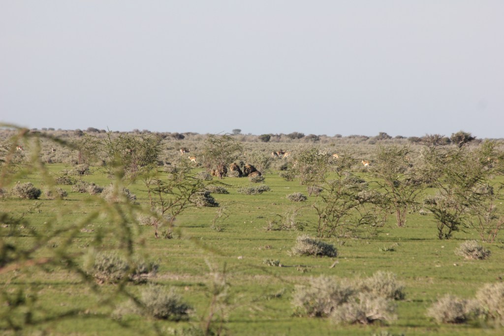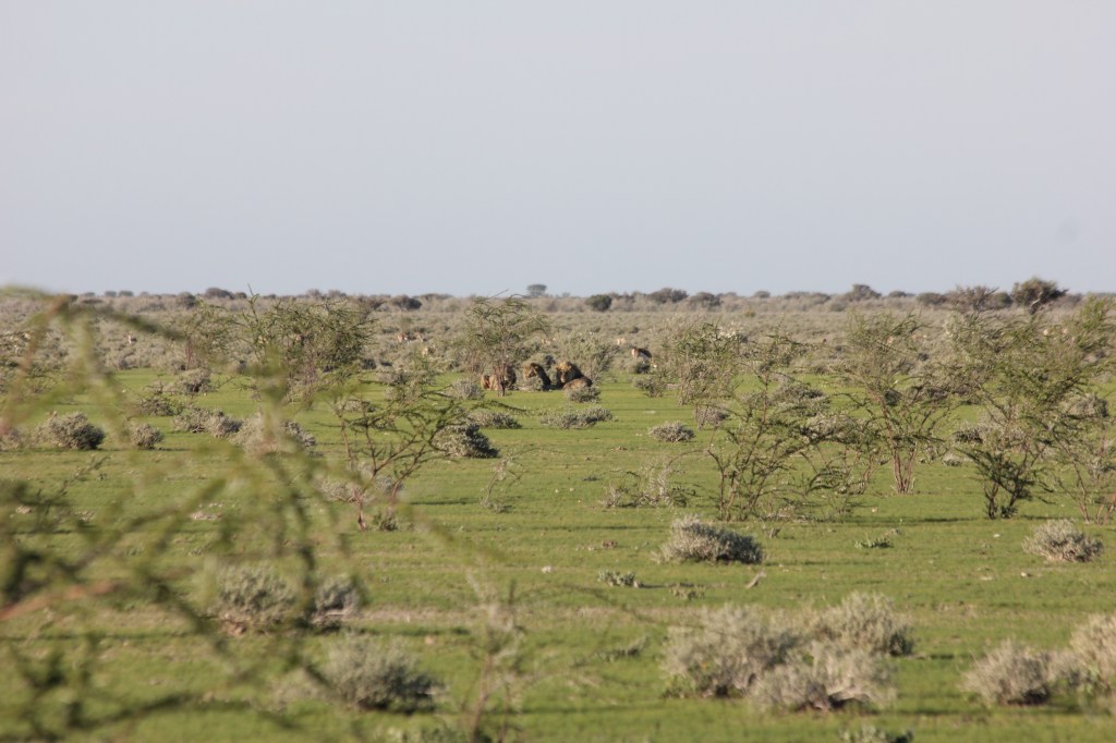 Puis arrive notre première belle surprise, puisque nous observons une hyène solitaire, qui semble tout de même avoir le ventre bien rempli. Impossible de dire si une naissance est à venir ou si un animal a été englouti il y a peu, l’animal est assez loin tout de même, et ne va pas dans la direction idéale pour nous. Je réussi à faire quelques photos, mais l’animal finit par disparaître au bout de quelques minutes. C’est tout de même de très bonne augure nous trouvons, de beaux troupeaux d’herbivore, plus ce prédateur, dans cette première partie de journée, voilà qui nous met en joie! Nous continuons de rouler, et arrivons à notre seconde surprise, à savoir un rhinocéros, solitaire qui se fond littéralement dans la végétation. Là encore l’animal es tassez éloigné de la piste et difficile à observer, mais la vue d’un rhinocéros reste toujours un grand moment, pour les enfants comme pour nous. Mais le meilleur est encore à venir, puisque quelques kilomètres après avoir laissé le rhino, c’est avec une réelle excitation que nous apercevons un animal que nous n’avions jusqu’à présent pas encore vu, à savoir… Le lion. Non, je rectifie, ce n’est pas le lions, mais LES lions, puisque nous arrivons à en dénombrer 3. Trois beaux mâles, probablement une fratrie, paisiblement allongés près d’un arbuste, et non loin d’un grand troupeau de springbocks. Vous me pardonnerez les photos, là encore nous étions éloignés de la scène, il nous était difficile de faire mieux. En zoomant sur mon appareil depuis le véhicule, on arrive tout de même à parfaitement distinguer les 3 fauves, qui nous suivent du regard. Nous patientons un moment en espérant que les animaux se mettront en action à un moment ou à un autre, mais les coquins ne bougeront pas d’un pouce, à part pour… bailler. Pour les enfants cela reste un très bon moment, on commence à avoir vu à peu près tous les grands animaux dont nous parlions depuis des semaines et des semaines avant notre départ, cela leur fera des souvenirs en plus à raconter.