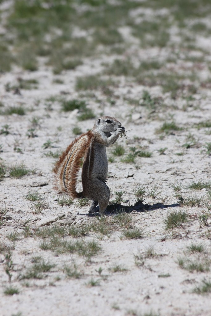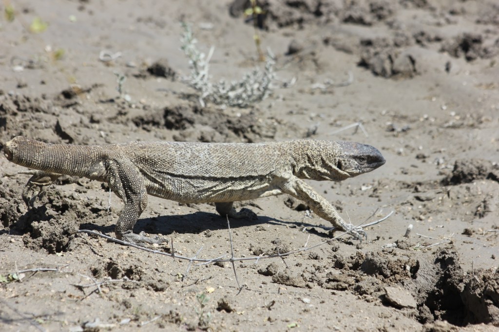 Nous arrivons à Okaukuejo sur les coups de 9H, ravis par cette balade matinale tout à fait passionnante! Mais pas le temps de niaiser, nous fondons sur le buffet du petit-déjeuner, et engloutissons un bon repas pour reprendre des forces. Les garçons sont très rigolos à observer, ils font tout comme les grands et vont se servir eux-même, et même jusqu’à demander ce qu’ils veulent auprès des serveurs. C’est intéressant de les voir grandir, gagner en confiance et en autonomie, la barrière de la langue n’en est vraiment pas une pour eux. Une fois repus, nous allons faire une petite pause brossage de dents et ablutions à notre chambre, et remontons directement en voiture. Nous allons refaire l’itinéraire de ce matin, en faisant moins de pause certes, dans le but d’essayer de retrouver les jolies bestioles aperçues lors du drive. Nous parvenons à retrouver les lieux où les lions étaient il y a encore 1H de cela, mais il n’y a plus personne malheureusement. Tout comme le rhino et la hyène d’ailleurs… Arrivés au niveau d’un point d’eau causé par la pluie Léon parvient tout de même à observer un nouvel animal, pour le plus grand plaisir de Nathalie! Un magnifique lézard, ressemblant à un varan, mais en plus petit. Il a quand même une drôle de tête, pas très attrayant, et à surtout une particularité plutôt cocasse, puisqu’il n’a plus sa queue. Les enfants se marrent bien en le regardant, d’autant que sa démarche n’est pas la plus élégante. En plus de quelques oiseaux que nous parviendrons à observer, ce seront les moments les plus notables de notre boucle, nous finissons par rentrer au camp pour le repas du midi. Pas de gastronomie de fou pour ce midi, ce sera petit-pois carottes, et riz blanc.