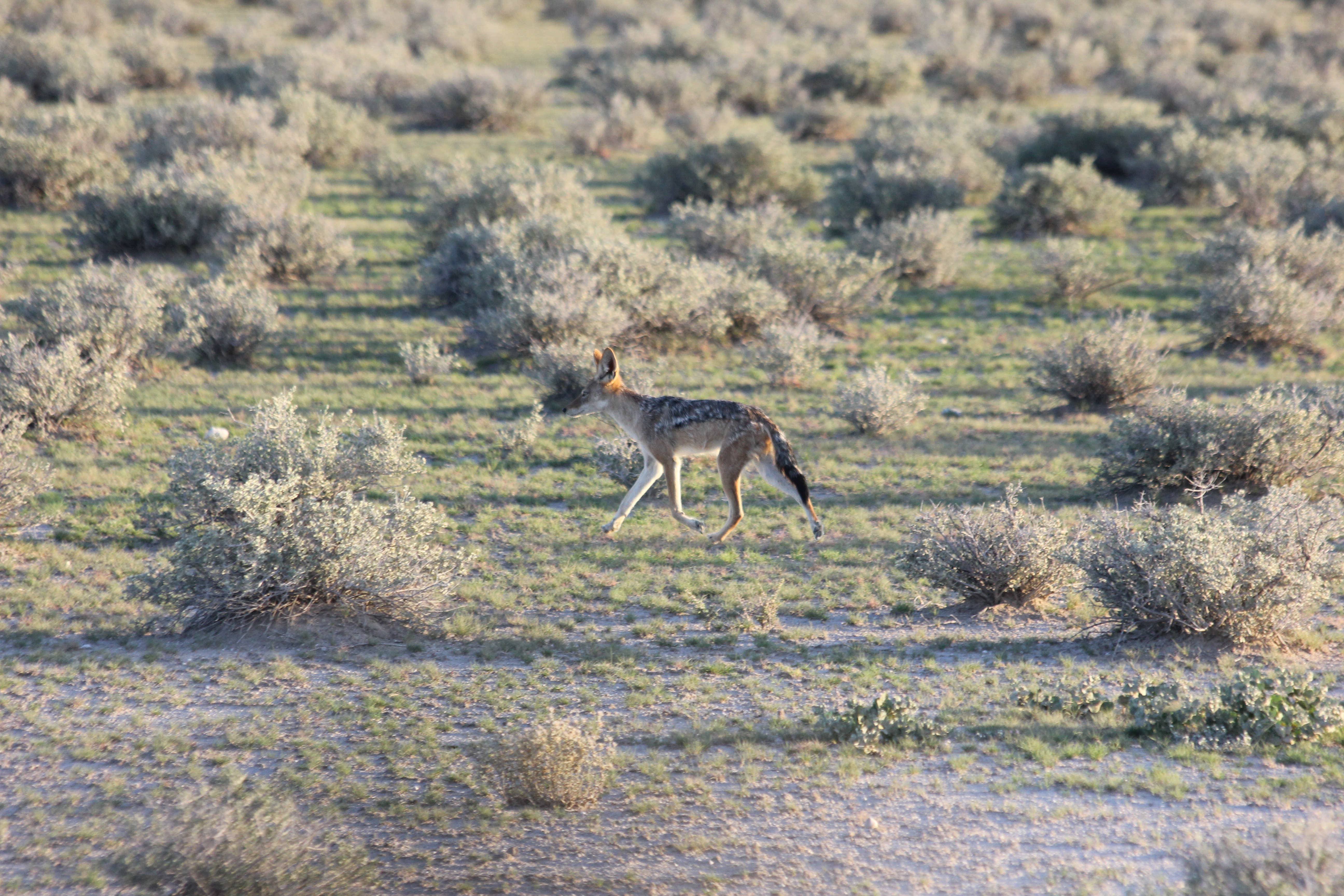 Après quelques minutes passées à les observer, notre véhicule redémarre, ainsi que celui qui était derrière nous, pour avancer sur les pistes. Les guides discutent entre eux par radio afin de se partager les tâches, nos véhicules se séparent, permettant ainsi de ratisser un peu plus large, et être avertis en cas de spot intéressant ++. Nous prenons donc la route vers les points d’eau situés au nord du campsite, il n’y a pas de haute végétation en bord de piste, nous prenons donc le vent directement, les garçons sont emmitouflés dans leurs capes, visage baissé, à la fois pour se tenir chaud, mais aussi pour terminer leur nuit. Au bout d’un certain temps le paysage semble évoluer quelque peu, il y a un très joli tapis vert tout autour de nous, les couleurs sont magnifiques avec le lever du soleil. Parmis les animaux que nous observons tout d’abord, il y a les incontournables springbocks et les zèbres, que nous observons ici en plus grands troupeaux. Quelques impalas, et enfin un peu plus d’oryx, nous étions vraiment impatient d’en voir de manière plus régulière, l’animal emblématique de la Namibie et absolument magnifique, il est impossible de se lasser de les regarder évoluer dans la nature, leurs couleurs et leurs silhouettes sont si belles.