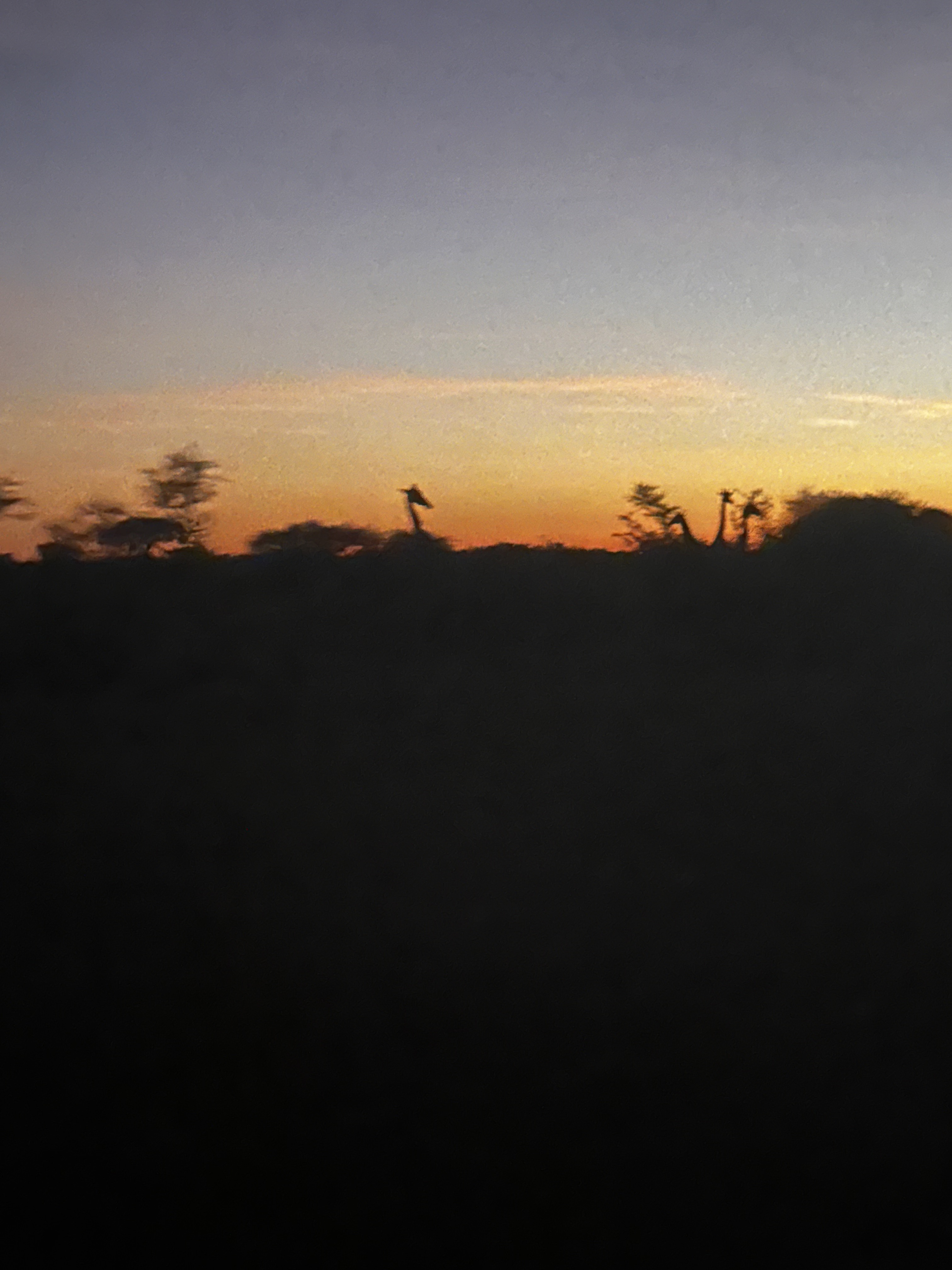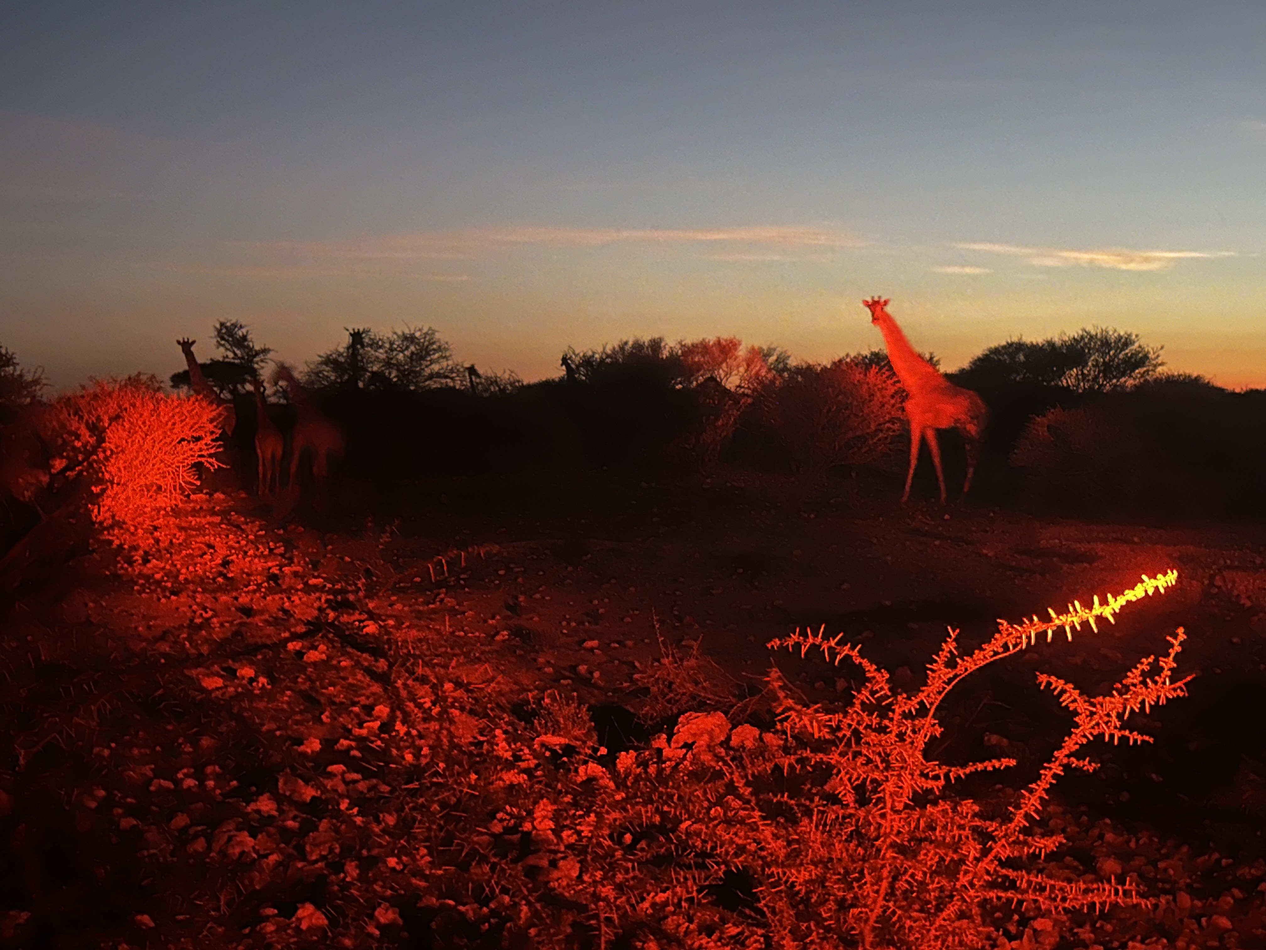 Les véhicules sont équipés avec des couvertures ou des ponchos chauds pour les clients, c’est vrai que ce matin il fait plutôt frais, il y a un peu de vent et nous enfilons nos capes avec plaisir. Nous décollons du camp pour 6H, et comme il y a 1é, nous n’avons pas le temps de faire 500m que nous pouvons déjà apercevoir les premiers animaux. Ce ne sera pas une horde de lions ce coup-ci, mais un troupeau de girafes, tant mieux pour nos estomacs qui ne seront pas retournés dès le réveil. Il fait encore bien noir au dehors, l’horizon est très rouge, comme la lampe qui permet d’éclairer les alentours du véhicule sans perturber les animaux. Nous distinguons plutôt des silhouettes au tout début, se détachant au-dessus de la végétation, signe que ce ne sont pas des écureuils géants, mais bel et bien des girafes que nous pouvons deviner dans la pénombre.