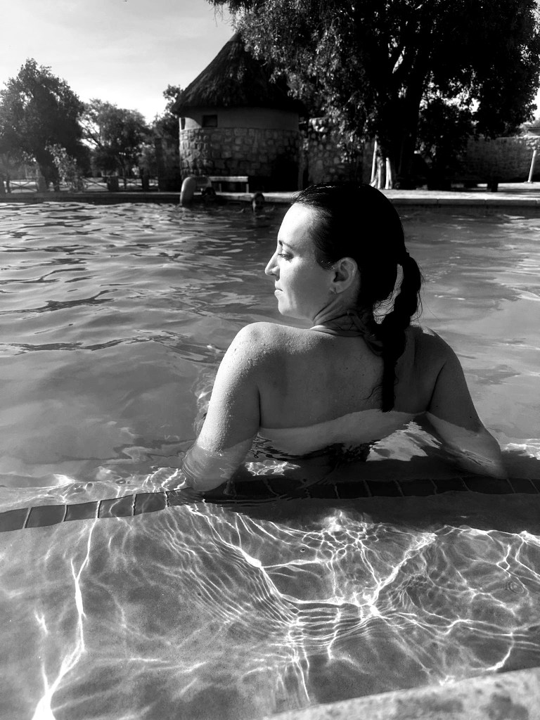 J’avais des velléités de ressortir sur les pistes pour tenter d’observer des animaux, mais personne ne semble vraiment motivé, fatigués par la chaleur et les kilomètres parcourus. Nous passons tout de même par la réception pour booker un drive demain matin, n’ayant pas de campement à ranger, nous pourrons profiter de partir tôt sur les pistes avec les guides, et tenter notre chance. Les garçons ne se font naturellement pas prier et se jettent dans l’eau sans retenue, il y a quelques personnes autour de la piscine, mais rien de bien méchant. Nous discutons avec des personnes venues de Belgique et de Suisse, et échangeons quelques infos et nos ressentis sur la Namibie. Il y a même une autre famille avec 3 enfants, allemands il me semble, mais eux ont 3 filles 🙂 Comme quoi, nous ne sommes pas les seuls à tenter cette aventure! L’après-midi se déroule donc tranquillement en bord de piscine, tantôt avec une glace, tantôt avec une bière ou un soda. Nous avons également réservé une table au restaurant pour le soir, table en extérieur, les conditions sont idéales. Les garçons dévorent de belles pièces de bar, accompagné de riz, Nathalie se délecte elle d’un repas veggie ( elle pousse un ouf de soulagement, les légumes ne sont pas trop dans notre régime alimentaire depuis le début du voyage), quand à moi je déguste de la viande de zèbre, accompagnée d’une sauce légèrement relevée et de riz. Le repas est franchement de bonne qualité, nous finissons les estomacs bien remplis, comblés.