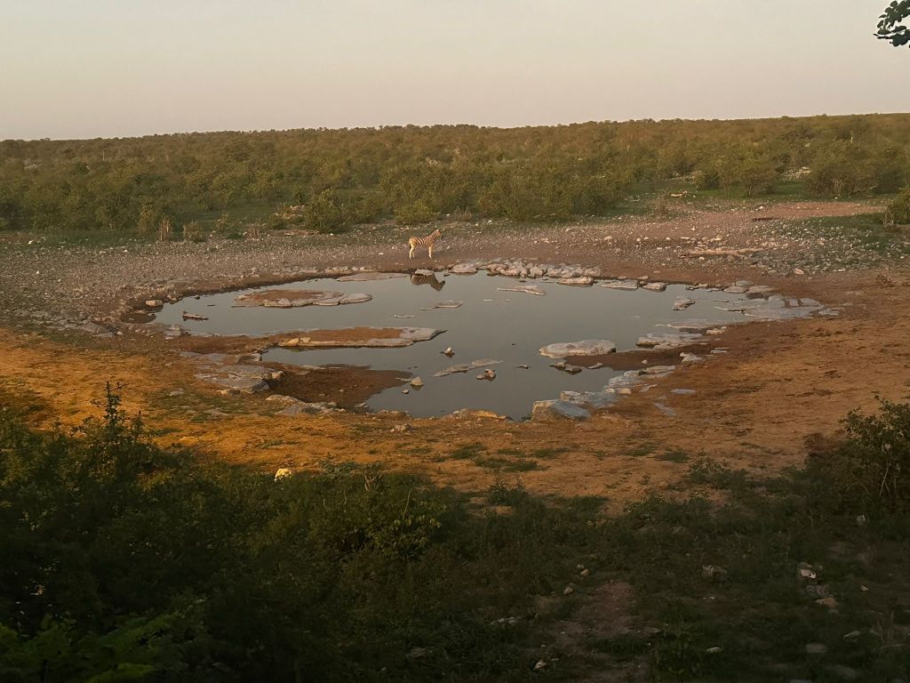 S’il y a bien une chose à faire absolument lorsque l’on est à Okaukuejo, c’est d’aller inspecter le point d’eau à la nuit tombée, c’est probablement le meilleur endroit pour faire de belles observations. Malheureusement pas grand monde sur place, les animaux ne sont toujours pas là, il fait encore un peu trop jour. Matisse et Jacob semblent crevés, nous montons un stratagème avec Nathalie et Léon: nous allons retourner à notre logement, je retournerais seul au point d’eau, et je reviendrais les prévenir si un animal est à observer. Ai-je besoin de préciser que Léon refusera de s’endormir en attendant mon retour? Je vois dans son regard qu’il piaffe d’impatience d’y aller, mais s’il part avec moi de suite, ses frères ne lâcheront pas l’affaire et voudront revenir aussi. Je me mets donc en direction du point d’eau, laissant Nathalie et les garçons. Je me remets donc en route vers le point d’eau qui est à 2min de marche, et vous savez quoi, à peine 5min après être arrivé, bingo, un rhinocéros pointe le bout de sa corne. Cruel dilemne pour moi, mais je me dis que je dois prévenir tout de suite Nathalie et Léon, il n’est pas encore tard, et c’est une occasion en or d’observer l’animal d’un peu plus près. Retour donc à notre chambre, Léon est Nathalie s’habillent en vitesse et filent vers le point d’eau pendant que je reste pour veiller sur les deux plus petits. Je tourne un peu en rond et essaye de ne pas m’installer trop confortablement pour ne pas sombrer, attendant sagement leur retour. Environ 30min plus tard, Nathalie revient, et me prévient que Léon voulait rester encore un peu, et m’attend du coup là-bas.