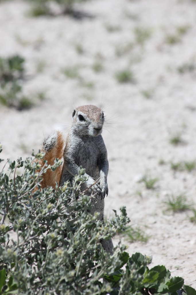 Petit déjeuner pris avec le soleil qui se lève dans le ciel et vient réchauffer nos visages, le café a définitivement une meilleure saveur lorsqu’il est pris dans de telles conditions. Notre petite organisation se met en place tout naturellement, je désinstalle les 2 tentes pendant que Nathalie et les garçons rangent le petit déjeuner et s’habillent. Une fois que notre Luffy est chargé, tout le monde se met en voiture, nous expliquons un peu aux garçons le parcours que nous allons réaliser aujourd’hui dans Etosha, avant de rejoindre Okaukuejo, situé rappelez-vous à 150km de là. Nous décidons de faire la boucle du « Rhino Drive », qui démarre au sud du campement, pour une boucle de quelques dizaines de kilomètres. Son nom est très prometteur, on se dit que les rhinos aperçus hier ne sont peut-être pas très loin, et que ce serait bête de ne pas tenter notre chance. Si la piste est assez sympa, avec d’énormes flaques d’eau à traverser (il y a 4 enfants dans ces cas-là dans la voiture, Nathalie est la seule personne responsable dans le lot), il faut avouer que nous ne verrons pas un chat durant cette boucle. Un peu déçus forcément, nous nous trainons encore un peu sur la piste longeant le Pan asséché en espérant croiser des animaux, mais sans succès. Le décor change au fil des kilomètres que nous parcourons, et mis à part quelques zèbres et springbocks aperçus le long de la piste, cela reste assez monotone, surtout pour les garçons. Je ne vais pas faire comme ci de rien était et jouer au parent « modèle », parmi l’équipement que nous avons pris pour occuper nos longs trajets, nous avons pris en plus des jeux de cartes 3 petites consoles portables, que nous décidons de dévoiler. Inutile de dire que dès lors l’attention des enfants n’est plus, mais nous essayons au possible de retarder le moment ou ils peuvent jouer, et d’en limiter l’accès.