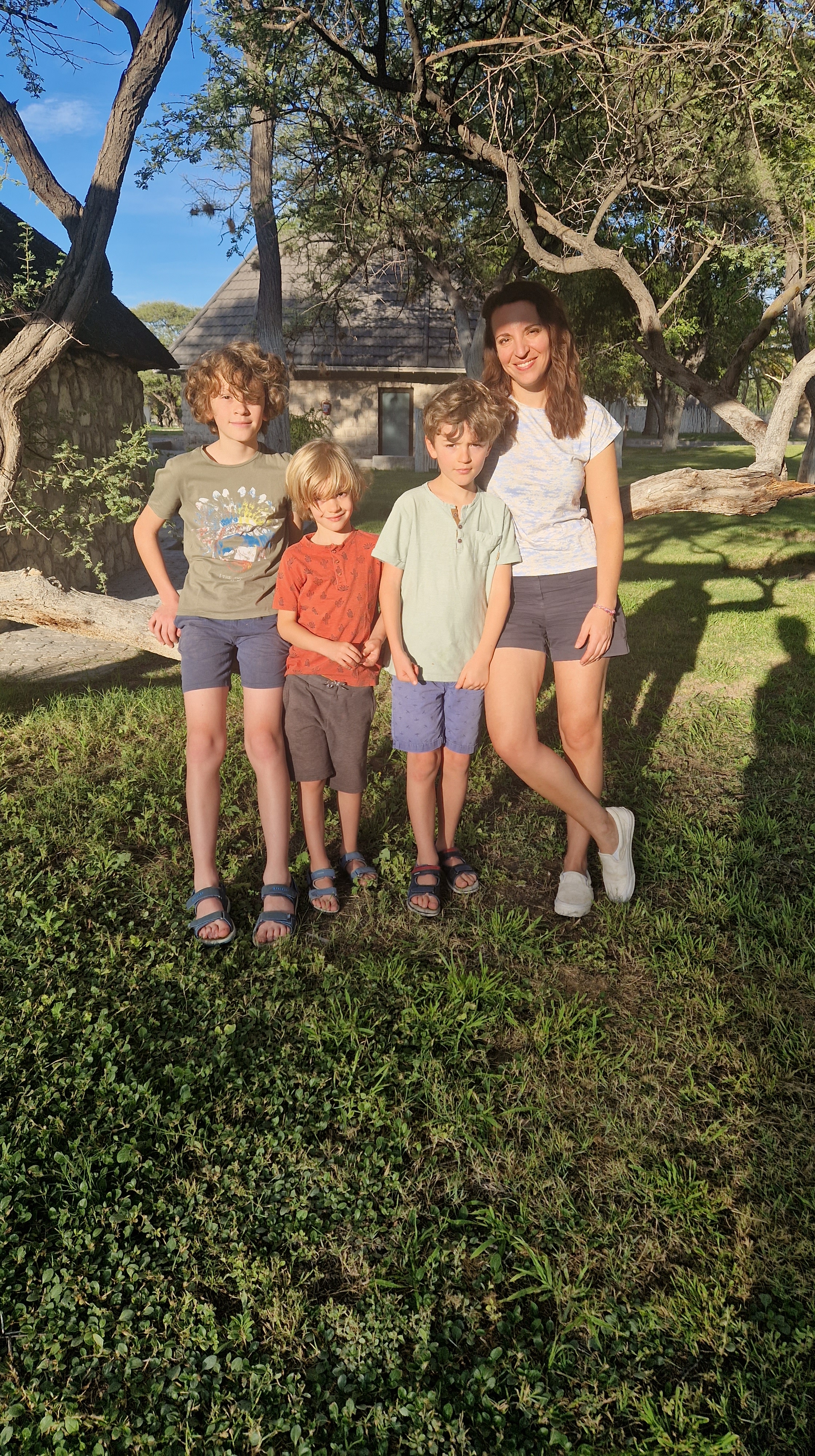 J’avais des velléités de ressortir sur les pistes pour tenter d’observer des animaux, mais personne ne semble vraiment motivé, fatigués par la chaleur et les kilomètres parcourus. Nous passons tout de même par la réception pour booker un drive demain matin, n’ayant pas de campement à ranger, nous pourrons profiter de partir tôt sur les pistes avec les guides, et tenter notre chance. Les garçons ne se font naturellement pas prier et se jettent dans l’eau sans retenue, il y a quelques personnes autour de la piscine, mais rien de bien méchant. Nous discutons avec des personnes venues de Belgique et de Suisse, et échangeons quelques infos et nos ressentis sur la Namibie. Il y a même une autre famille avec 3 enfants, allemands il me semble, mais eux ont 3 filles 🙂 Comme quoi, nous ne sommes pas les seuls à tenter cette aventure! L’après-midi se déroule donc tranquillement en bord de piscine, tantôt avec une glace, tantôt avec une bière ou un soda. Nous avons également réservé une table au restaurant pour le soir, table en extérieur, les conditions sont idéales. Les garçons dévorent de belles pièces de bar, accompagné de riz, Nathalie se délecte elle d’un repas veggie ( elle pousse un ouf de soulagement, les légumes ne sont pas trop dans notre régime alimentaire depuis le début du voyage), quand à moi je déguste de la viande de zèbre, accompagnée d’une sauce légèrement relevée et de riz. Le repas est franchement de bonne qualité, nous finissons les estomacs bien remplis, comblés.