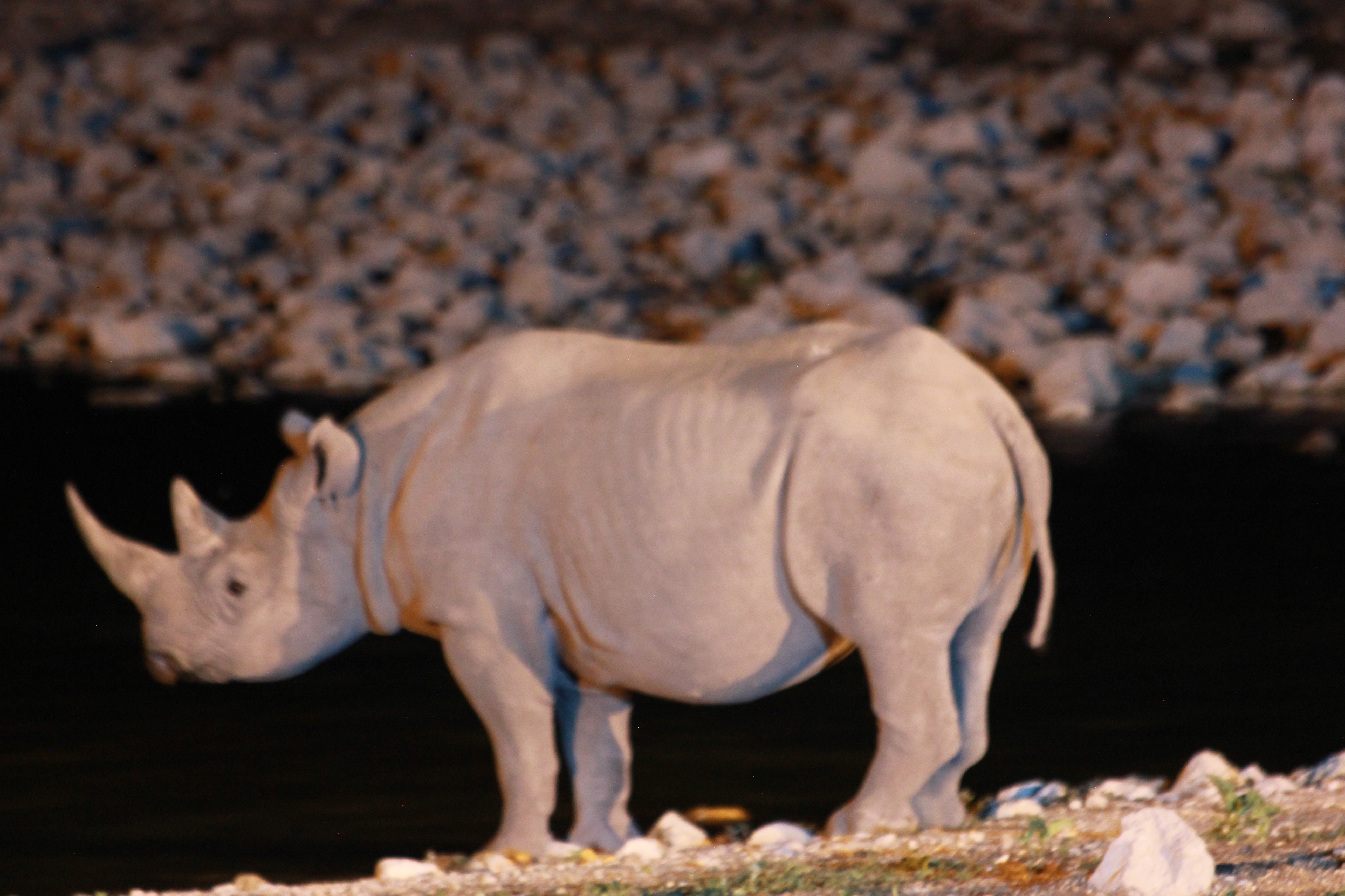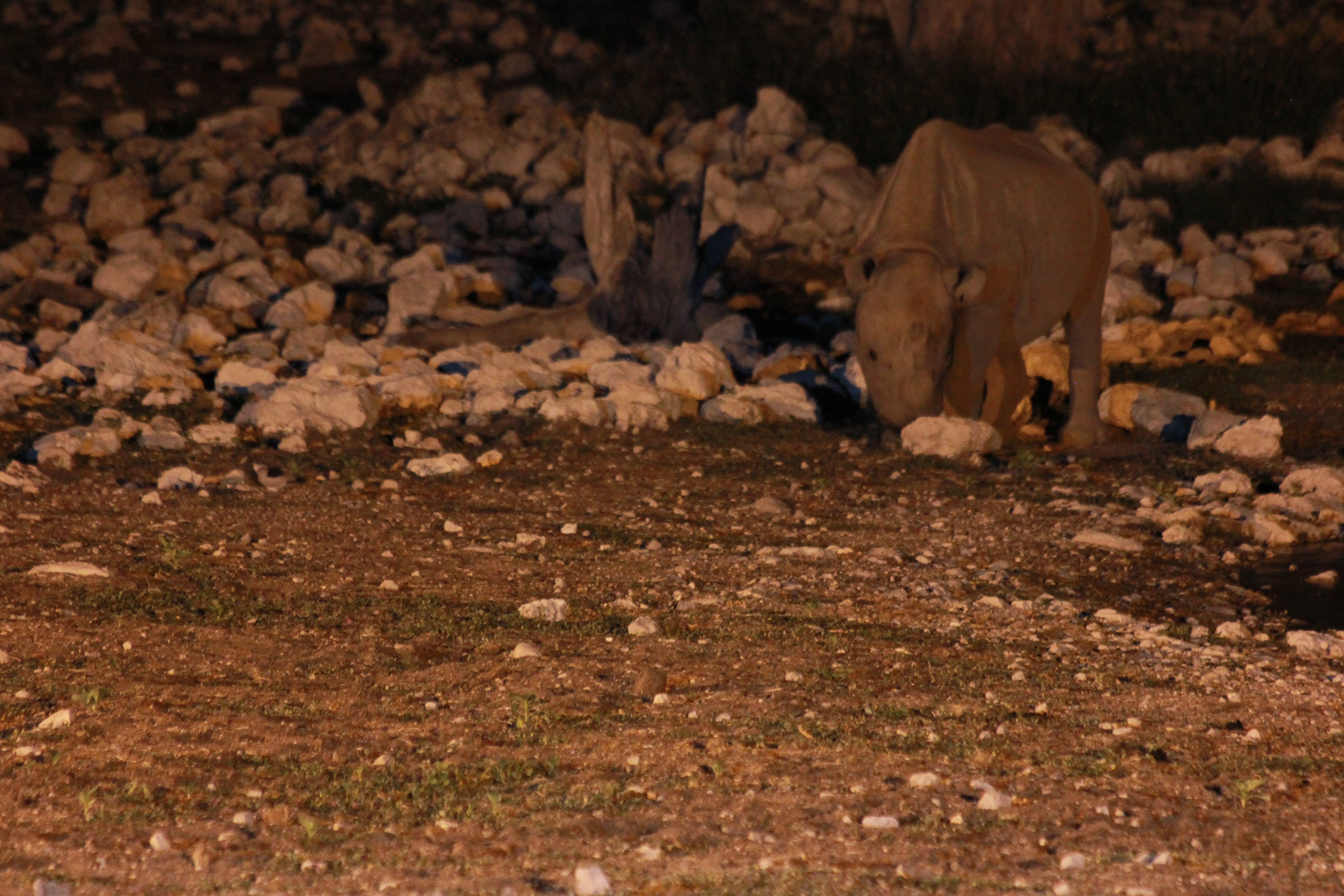 S’il y a bien une chose à faire absolument lorsque l’on est à Okaukuejo, c’est d’aller inspecter le point d’eau à la nuit tombée, c’est probablement le meilleur endroit pour faire de belles observations. Malheureusement pas grand monde sur place, les animaux ne sont toujours pas là, il fait encore un peu trop jour. Matisse et Jacob semblent crevés, nous montons un stratagème avec Nathalie et Léon: nous allons retourner à notre logement, je retournerais seul au point d’eau, et je reviendrais les prévenir si un animal est à observer. Ai-je besoin de préciser que Léon refusera de s’endormir en attendant mon retour? Je vois dans son regard qu’il piaffe d’impatience d’y aller, mais s’il part avec moi de suite, ses frères ne lâcheront pas l’affaire et voudront revenir aussi. Je me mets donc en direction du point d’eau, laissant Nathalie et les garçons. Je me remets donc en route vers le point d’eau qui est à 2min de marche, et vous savez quoi, à peine 5min après être arrivé, bingo, un rhinocéros pointe le bout de sa corne. Cruel dilemne pour moi, mais je me dis que je dois prévenir tout de suite Nathalie et Léon, il n’est pas encore tard, et c’est une occasion en or d’observer l’animal d’un peu plus près. Retour donc à notre chambre, Léon est Nathalie s’habillent en vitesse et filent vers le point d’eau pendant que je reste pour veiller sur les deux plus petits. Je tourne un peu en rond et essaye de ne pas m’installer trop confortablement pour ne pas sombrer, attendant sagement leur retour. Environ 30min plus tard, Nathalie revient, et me prévient que Léon voulait rester encore un peu, et m’attend du coup là-bas.