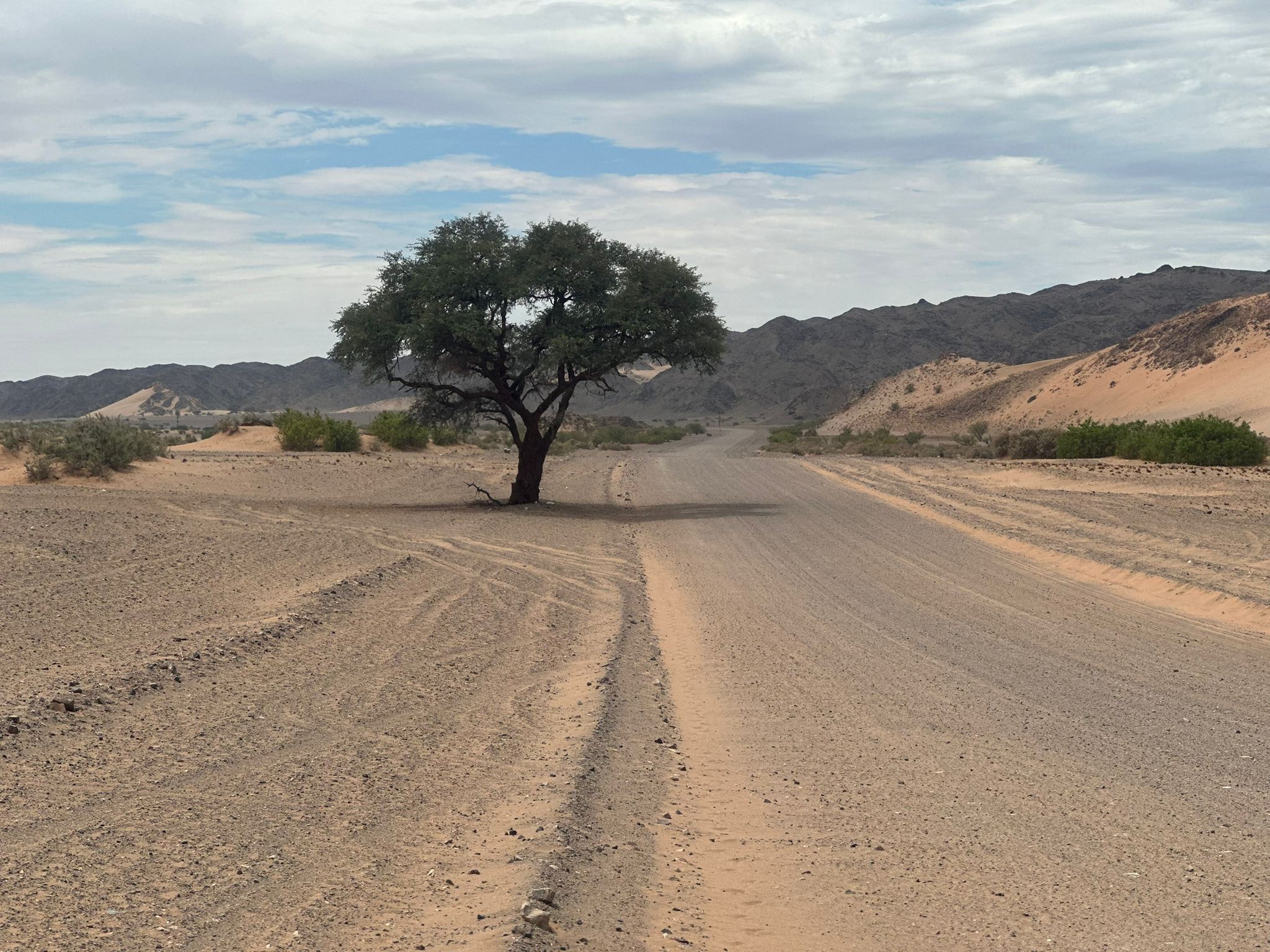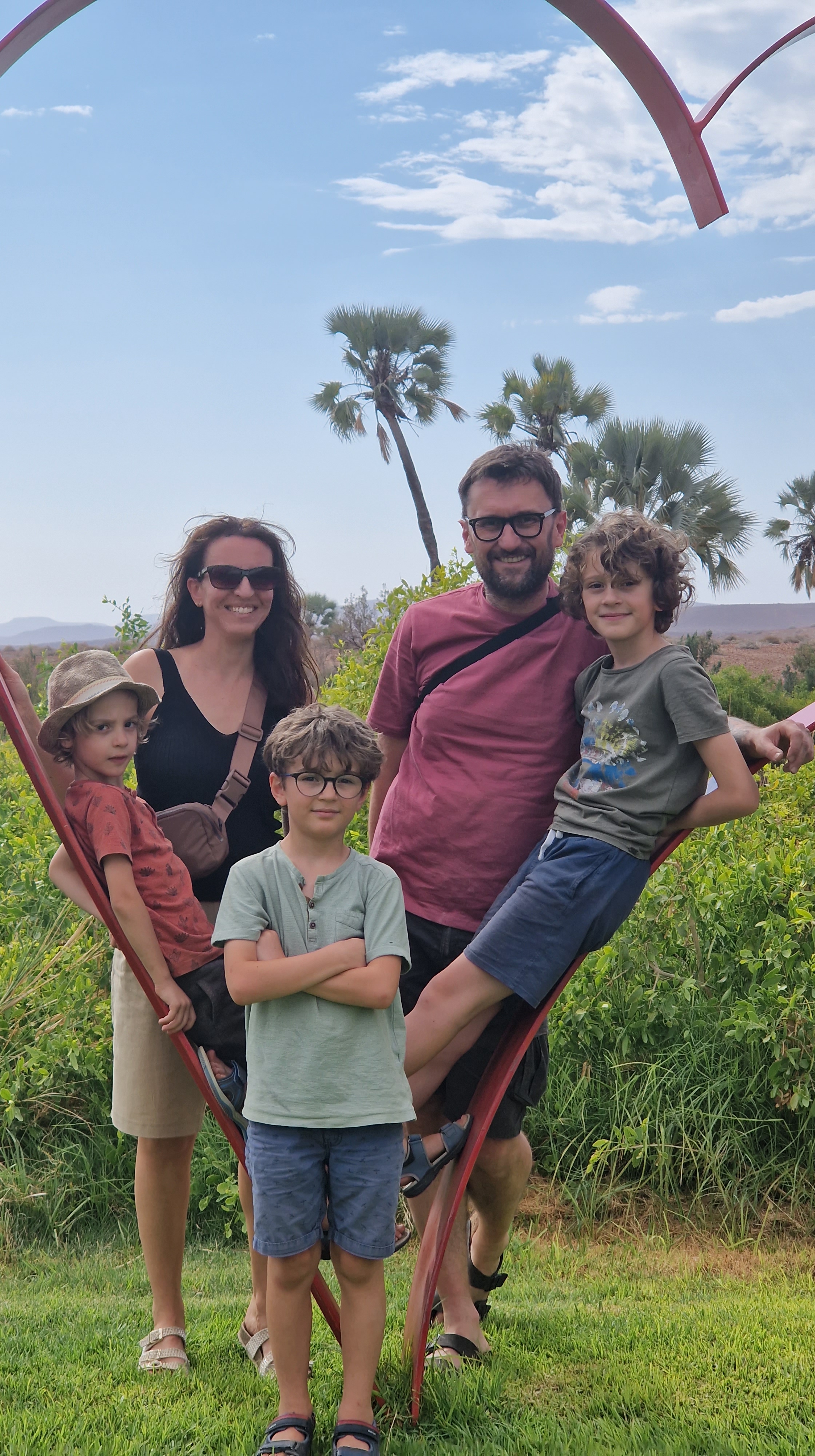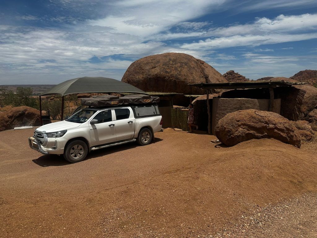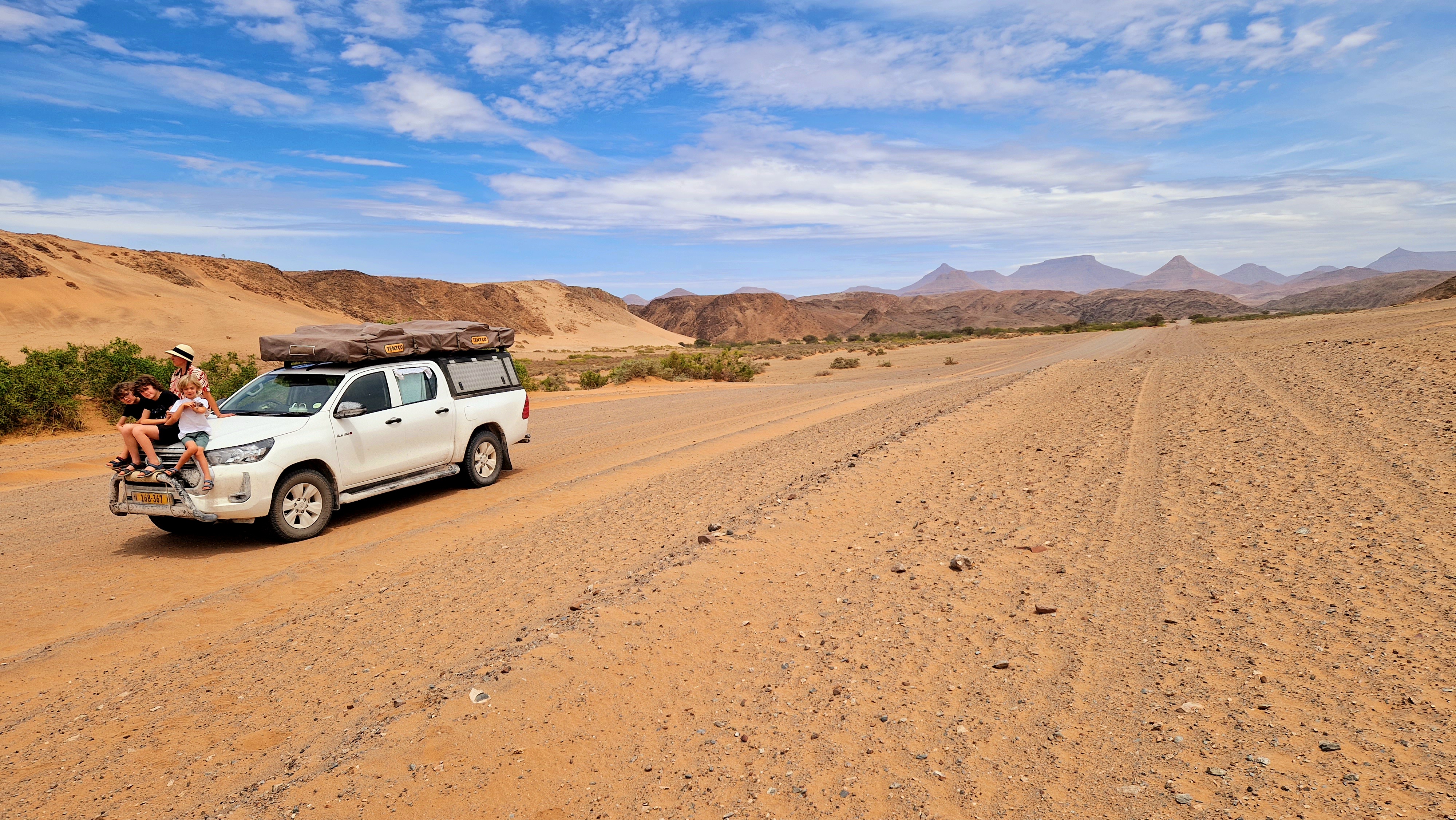 Cette nouvelle nuit en camping aura été très bonne, le calme de la région de Palmwag n’est souvent perturbé que par le chant des oiseaux, et c’est ainsi que nous allons nous réveiller tranquillement en ce mardi 4 février. Pas de réveil d’ailleurs, nous n’avons pas une grande route à réaliser jusqu’à notre prochaine étape, nous avons donc un peu de temps devant nous pour flâner. Petit-déjeuner et pliage du campement réalisés dans le calme, nous allons à la rencontre de Thomas et de Uli pour un dernier au-revoir, le grand avantage de leur mode de fonctionnement est d’être totalement libres et de voyager au gré de leurs envies, Ils ont donc décidé de rester une nuit de plus ici à Palmwag, avant de repartir plus au nord du pays. En prononçant le nom de notre futur destination ils ont tout de suite eu les yeux qui brillaient, à la fois pour la beauté de l’endroit, mais aussi pour les possibilités fantastiques de drive et de trek à faire. Nous échangeons encore quelques minutes au bord de la piscine, les garçons observent de très beaux oiseaux qui viennent profiter de l’herbe fraîche, puis nous réalisons quelques photos avant de prendre la route. Quelques achats de souvenirs dans la très jolie boutique du lodge, il y en a pour tous els goûts! La place dans les valises étant toujours aussi limitée, nous devons faire très attention à ne pas prendre des choses trop volumineuses! Nous franchissons à nouveau la barrière sanitaire, avec cette fois-ci une inspection un peu plus poussée de notre véhicule, du frigo et de la caisse de denrées sèches. Je ne sais pas si l’effet d’avoir les enfants avec nous joue dans l’inconscient des gardes ou des policiers qui nous interpellent, mais leur gentillesse et la rapidité avec laquelle ils inspectent le véhicule est assez déroutante. En l’occurrence, un rapide coup d’oeil dans le frigo, soulever 2-3 trucs 1 ou 2 questions, et c’est déjà fini. Dans tous les cas il n’y avait trop rien à inspecter, nous étions préparés à cette étape et aux conditions à respecter.