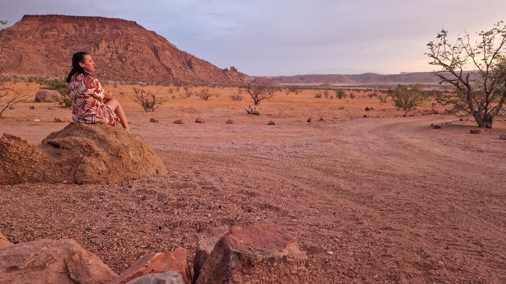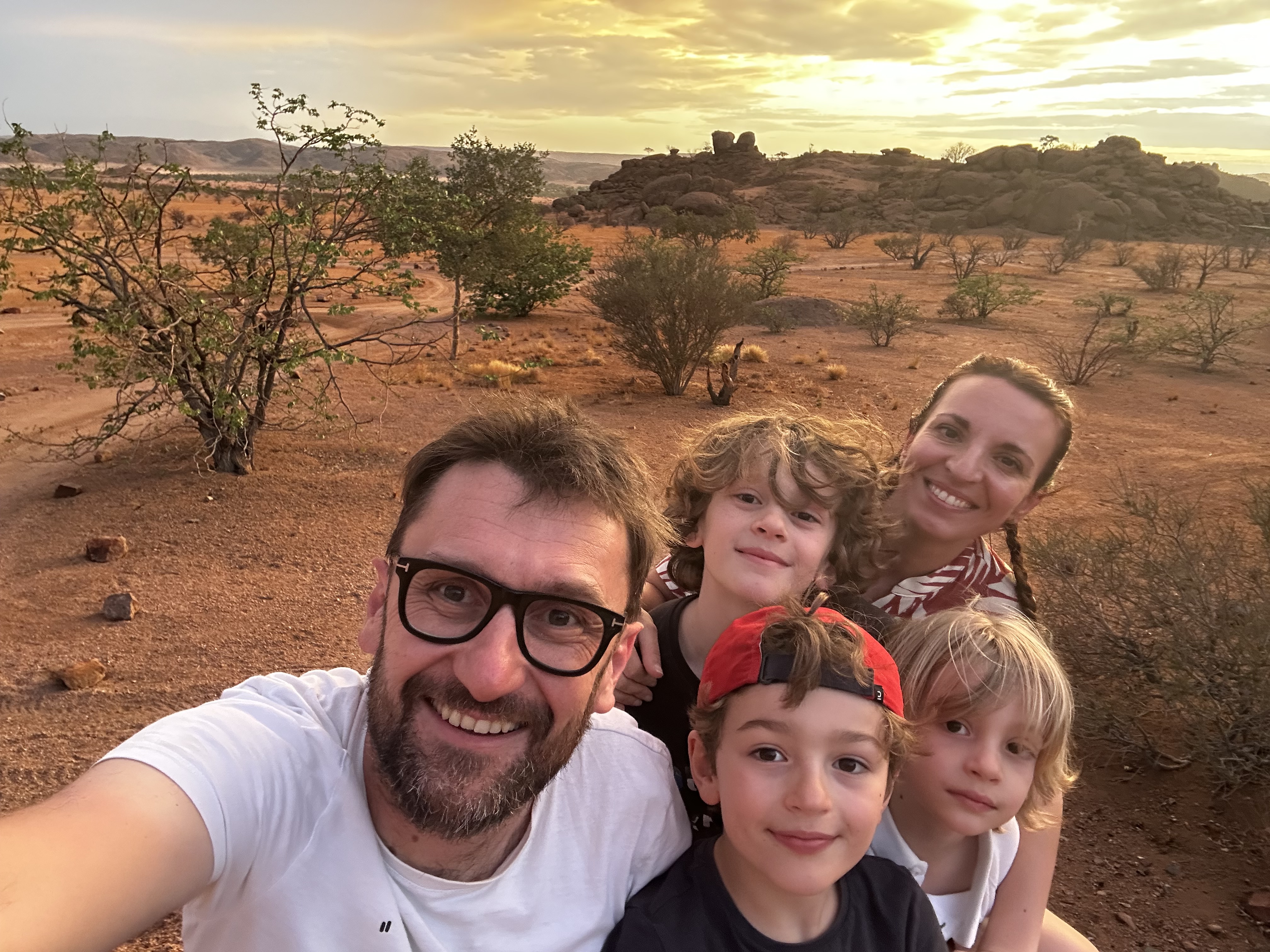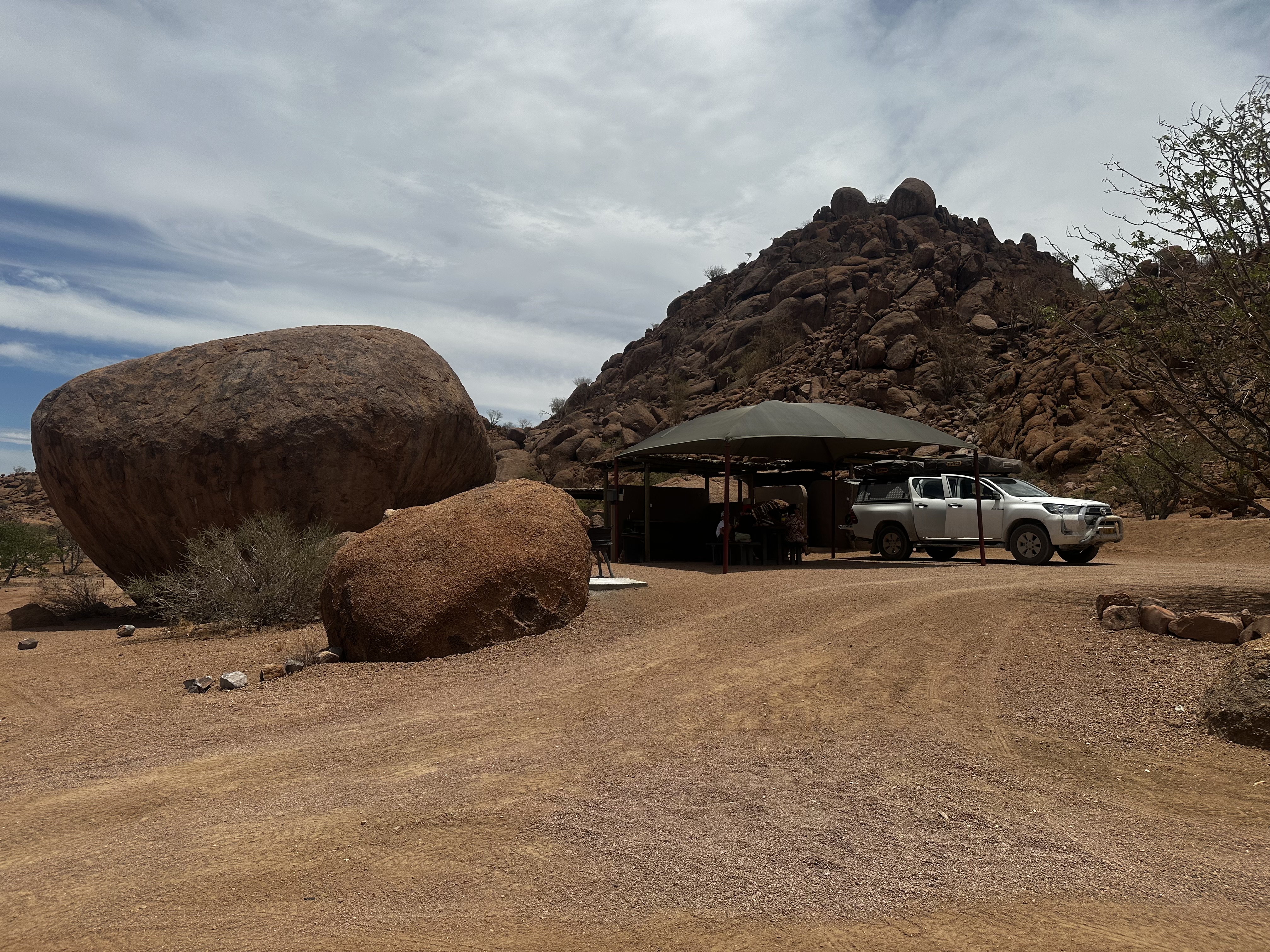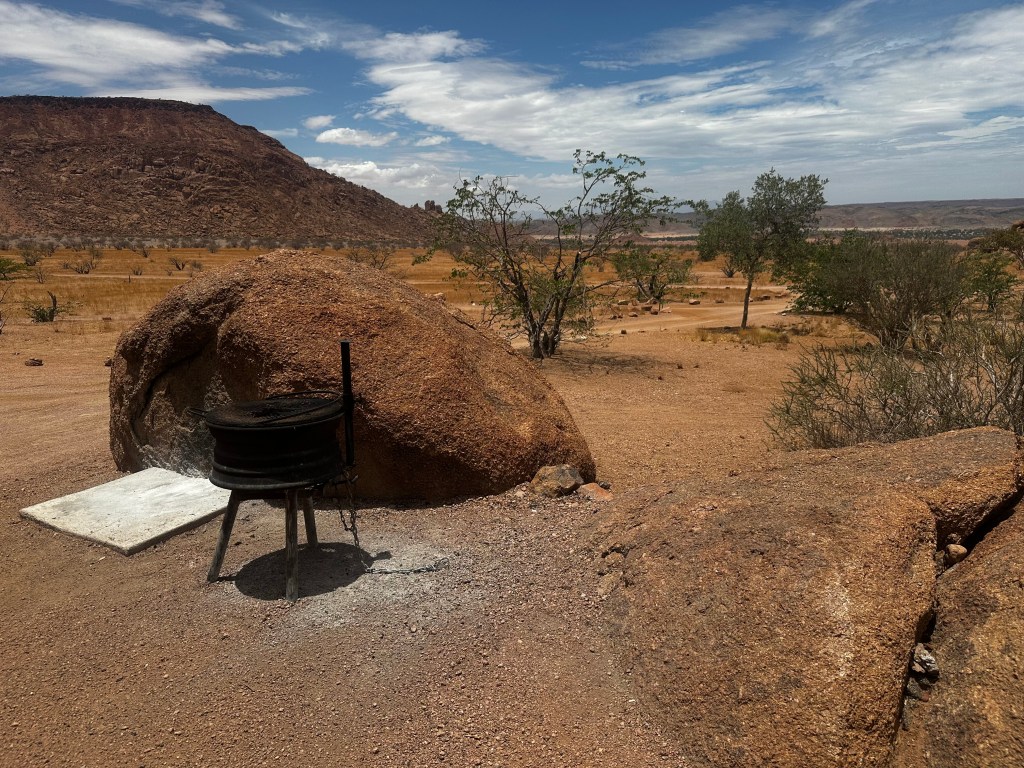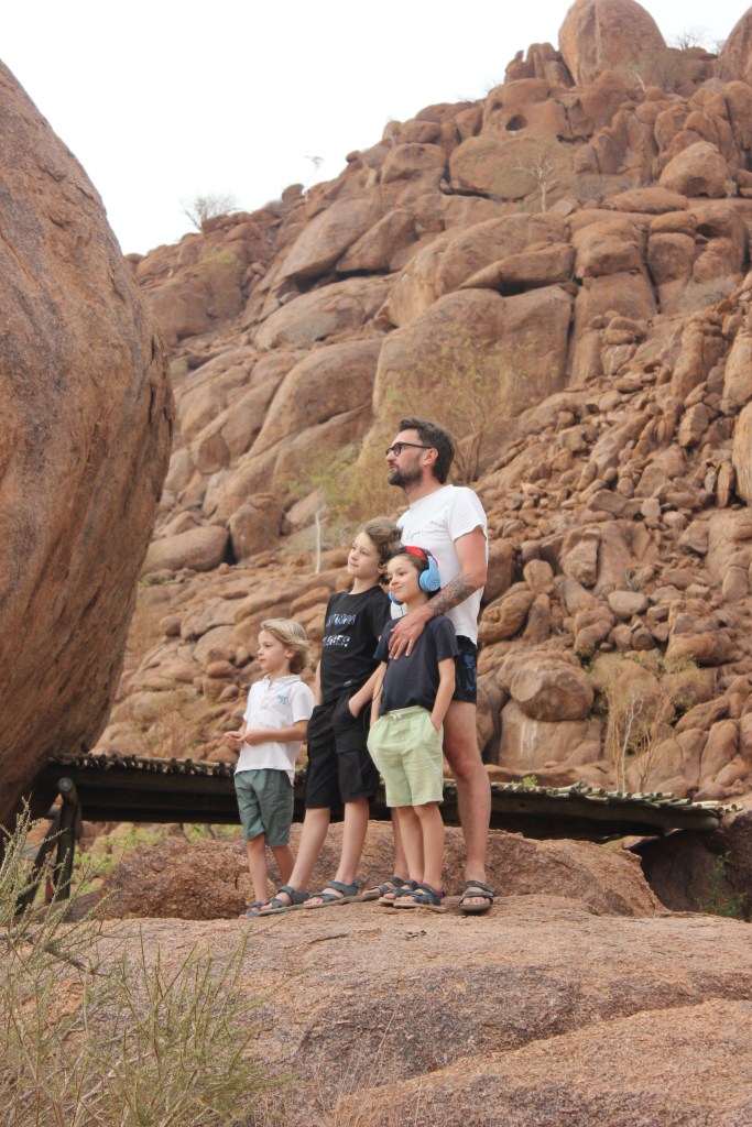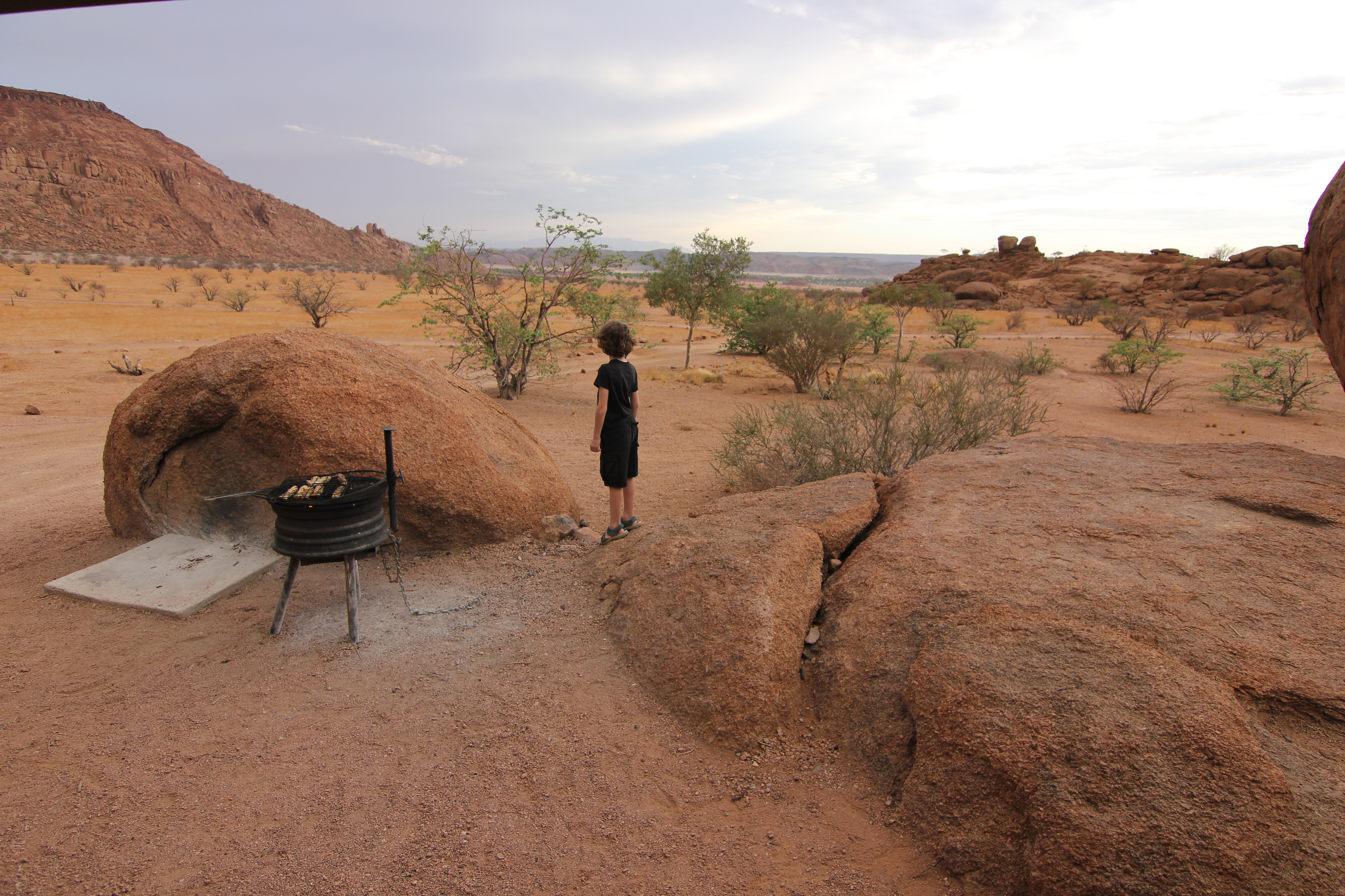 C’est par ailleurs un peu à contre cœur que nous retournons sur le camp, le soleil commence à descendre un peu dans le ciel, les estomacs crient aussi famine. Retour aux habitudes de début de voyage, avec un excellent braai, excellent non seulement par la qualité de la viande dégustée (bon ok, rien de fou, des blancs de poulets marinés), mais surtout de pouvoir le faire dans cet endroit unique qu’est notre campsite. Ce braai-là aura une saveur toute particulière, avouons-le. Les enfants jouent sur les énormes rochers, la douche est à l’air libre, tout comme les toilettes, le tout dans un décor de rêve. Mowani mérite sa réputation d’être parmi les plus beaux campings de Namibie, cela ne fait nulle doute. Pas besoin de tous les connaître pour se le dire quand on y est, le coucher de soleil finit d’achever notre crush pour cet endroit. Le repas se fait dans une ambiance très détendue, zénitude assurée, mais nous n’irons pas faire de prolongations, une fois la nuit tombée, et après avoir pu admirer un ciel étoilé sublime, nous nous mettons au lit. Demain il faudra se réveiller relativement tôt, nous avons rendez-vous avec Charles à 8H30 pour le drive, et on compte être en forme pour en profiter!
