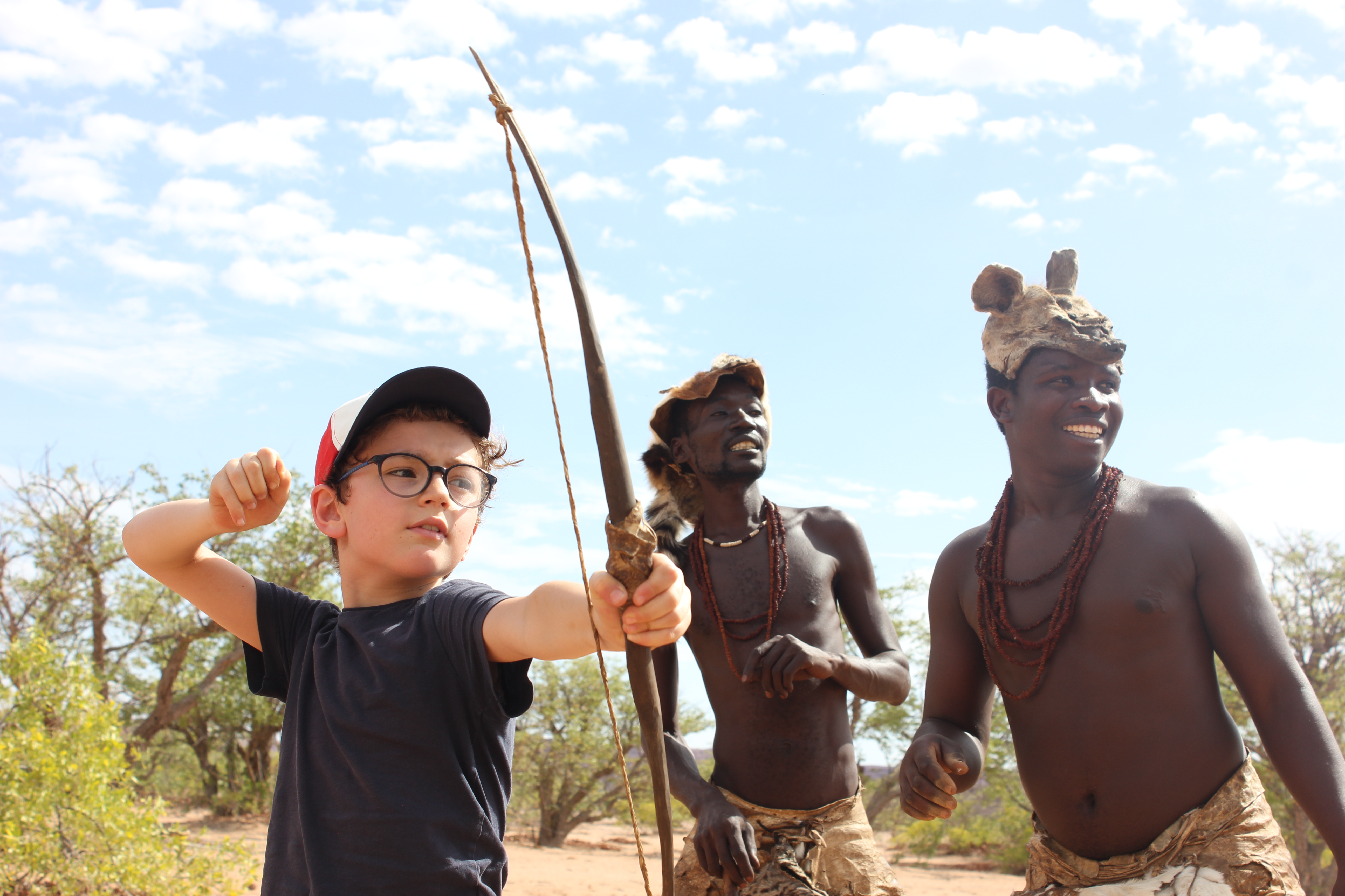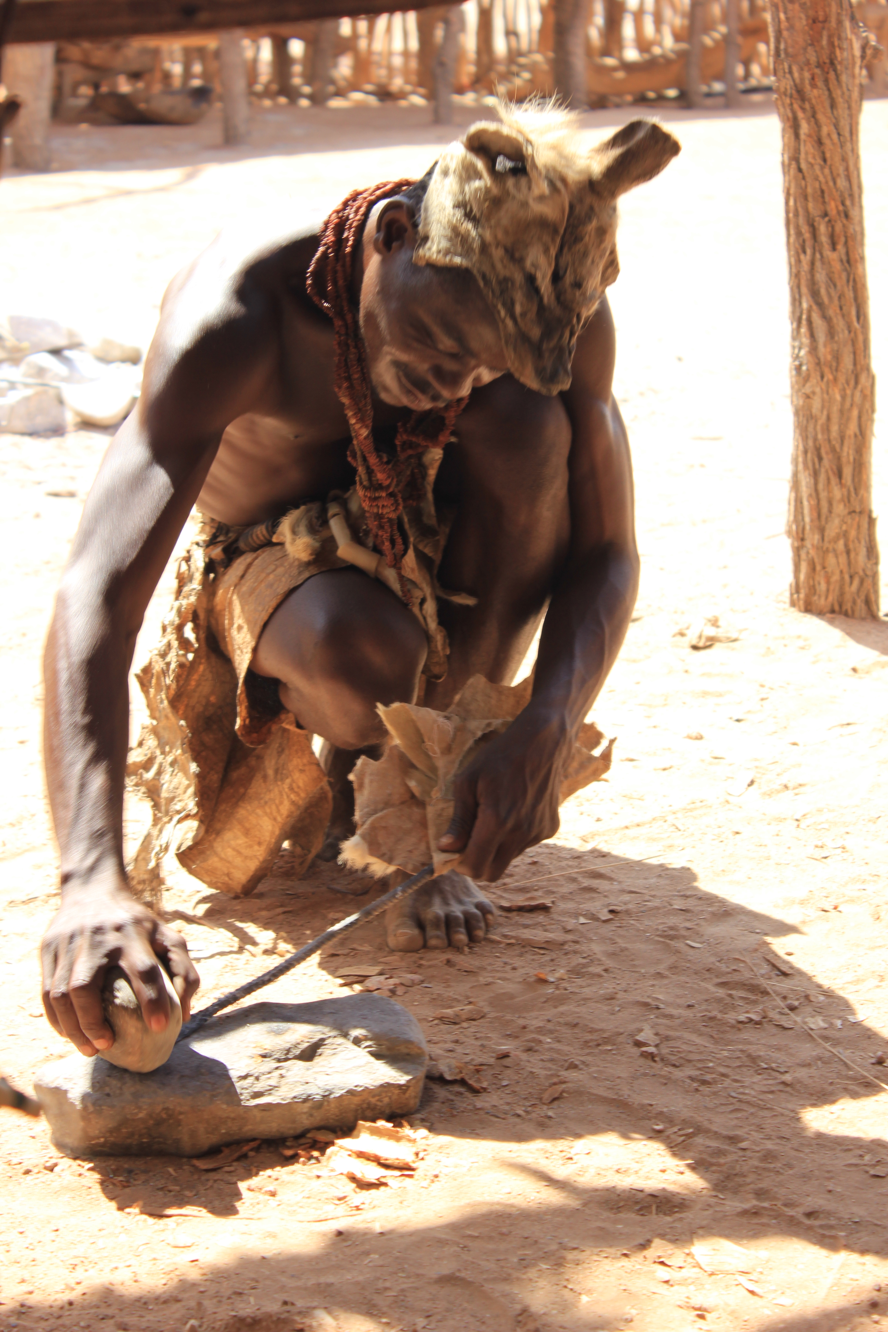 Suite à cela nous reprenons la route en direction de notre activité de l’après-midi, nous aimerions découvrir le Damara Living Museum, un endroit qui consiste en une reconstitution d’un village du peuple du Damaraland, avec les coutumes et les traditions. Nous avons pu lire que la visite valait le coup et était intéressante, après concertation avec Nathalie, nous avions convenu d’y aller, pour au moins avoir une visite plus culturelle sur l’un des peuple de la Namibie. Nous aurions pu choisir d’aller à la rencontre du peuple Himba, des San, des Herreros, mais nous ne voulions absolument pas participer à une économie touristique un peu faussée et perturbant des modes de vie traditionnels. Il y a de quoi en parler pendant des heures et des heures, mais nous nous sommes dit au final que nous sensibiliserions les garçons sur ces peuples en danger de disparition au travers de lectures, et de reportages vidéos. A notre arrivée sur place il n’y a aucune voiture sur le petit parking aménagé, cool, nous allons pouvoir découvrir l’endroit seuls! La visite qui suit est très intéressante, à la fois pour les enfants comme pour nous, nous découvrons la langue des clics, comment faire du feu, les herbes médicinales, ou la confection de bijoux/ d’armes ou d’ustensiles pour la vie courante. Il y a je trouve un petit côté folklorique à cette visite, qui me mettra un peu mal à l’aise à un moment donné, mais la visite restera très intéressante, Le tout se terminera avec des chants réalisés par l’ensemble de la « tribu », de toute beauté. Les enfants semblent très impressionnés par la réalisation du feu, de notre côté se sont vraiment les chants et la découverte de la langue des clics qui nous aura le plus agréablement surprise.