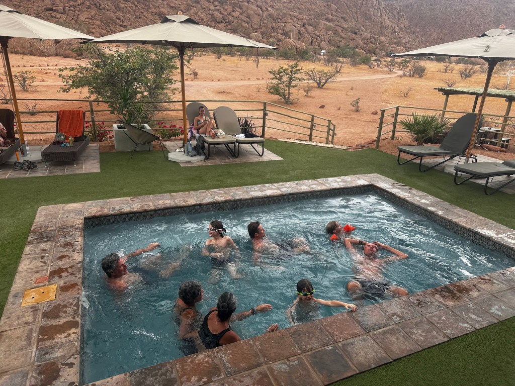 Il est 16H30 lorsque nous repartons du Damara Living Museum, satisfaits de cette découverte. Les enfants eux piaffent d’impatience, la piscine ils lorgnent dessus depuis notre arrivée ce midi, nous leur avons promis d’y faire un tour en rentrant. Ils se mettent donc en tenue et filent à la piscine avec Nathalie, pendant que j’installe les tentes, il est hors de question de se faire piéger une nouvelle fois pour moi. Bref, installation effectuée, je rejoins ma petite équipe, et découvre en faite une véritable colonie de vacances, les enfants sont en train de rigoler à gorge déployée et de jouer avec un petit groupe d’adultes, en provenance du Canada. C’est très amusant à voir, Nathalie n’en revient pas elle-même, l’ambiance est assez folle, inattendue. Quitte à se détendre, autant prendre un petit apéro, et c’est en arrivant au niveau du bar que je vais faire une excellente découverte, à savoir un Gin namibien. J’adore le gin, c’est un alcool que j’apprécie avec un bon tonic, et nous avons la chance à Reims d’avoir deux excellentes marques qui produisent des gin d’excellente qualité. Ni une ni deux, je commande un gin sec pour déguster, et ensuite en version Gin To, que eux composent avec des baies et une agrume séchée. Retour au bord de la piscine, les garçons sont toujours euphoriques, Nous discutons avec les deux couples de canadiens, ainsi qu’un couple de jeunes allemands, cela parait assez improbable mais l’instant est magique. Les canadiens sont en fait en pleine réalisation d’un tour de monde, ils sont arrivés du Malawi il y a quelques semaines, se dirigent vers l’Afrique du Sud, avant de rejoindre l’Inde. Vous suivez? Oui oui, cela fait quelques kilomètres, mais c’est toujours enthousiasmant de partager des histoires de voyage avec des inconnus, à un instant T, qui dure quelques heures ou plus, mais qui reste un moment de partage et de détente.