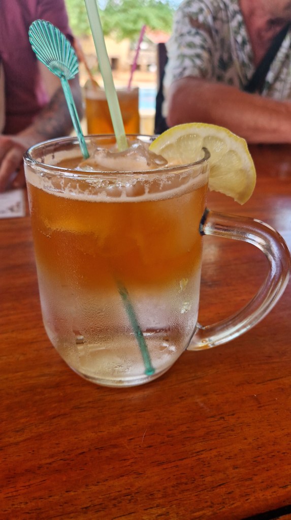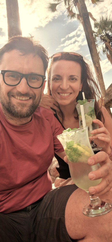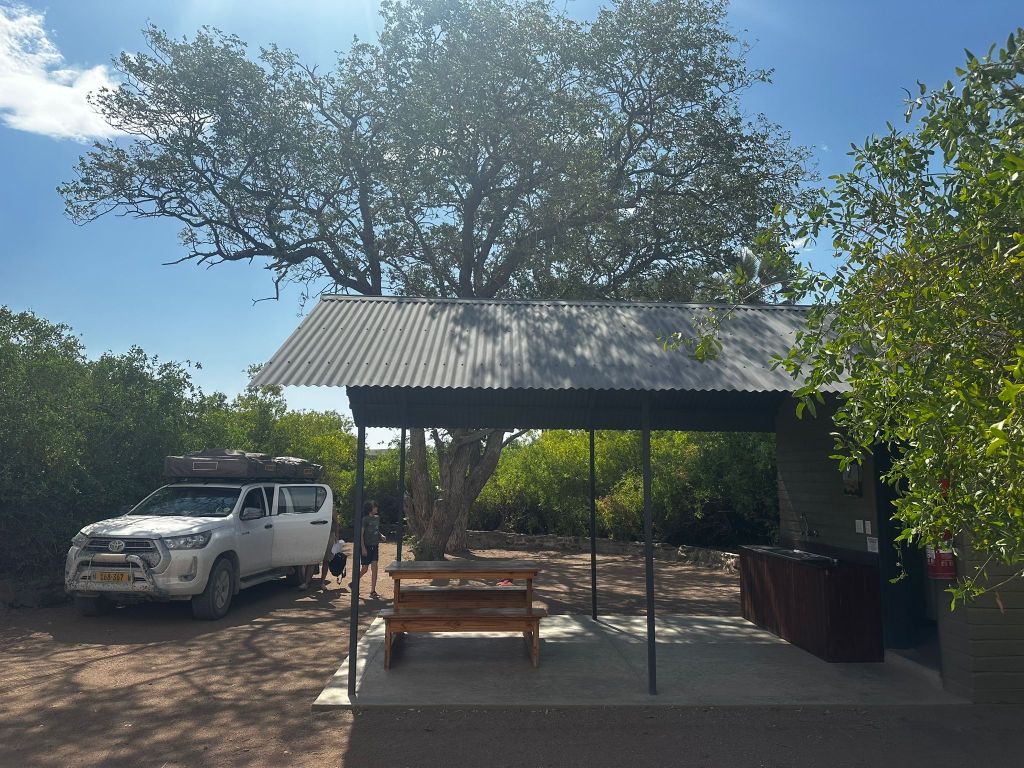 Une fois que nous réalisons les formalités de sortie du parc, nous retrouvons pour quelques dizaines de kilomètres une route goudronnée, ce qui est loin de nous ravir. Nous sommes désormais habitués à rouler sur la piste, à la poussière omniprésente, mais aussi au charme que cela procure. Kamanjab n’a pas spécialement une très bonne réputation, parfois même un peu sulfureuse, mais c’est un passage obligé et un point stratégique pour refaire de l’essence, et refaire quelques courses dans un vrai supermarché, après avoir dû se contenter des petites échoppes des campsites. Dès notre arrivée, nos deux voitures ne passant pas inaperçu, nous sommes entourés d’enfants vendant des colliers ou de « surveillants de voiture », situation qui a toujours le don de me mettre mal à l’aise. Nous nous engouffrons dans le supermarché pour nous ravitailler, surtout en denrées sèches, gâteaux et féculents, mais aussi et surtout en eau, il était temps de reprendre quelques bidons de 5L. Une fois les pleins effectués et les denrées achetées pour nos deux familles, nous faisons une halte au Oppi-Koppi Campsite, qui combine un bar, un restaurant, mais aussi des logements et locations de véhicules type quads. Thomas & Uli nous recommandent vivement de découvrir un cocktail culte que l’on retrouve en Namibie mais que nous ne connaissions pas jusqu’à présent, le Rock Shandy. Il n’y qu’un soupçon d’alcool à l’intérieur, mélangé à de la limonade et du tonic, et le résultat est tout à fait convaincant. Très frais, léger et se dégustant à la paille, il est unanimement adopté! C’est sûr, nous nous équiperons de retour en France pour pouvoir en faire! L’endroit est sympa, déco un peu clichée mais vraiment cool, le repas est simple mais très bien réalisé. Nous parlons, nous découvrons nos deux compagnons de route avec grand plaisir, enfin surtout Nathalie, car même si je parle et comprend mieux l’allemand, leur accent ne me rend pas la tâche facile lol. Ils nous prodiguent de très bons conseils, sont adorables, La principale est qu’il faut que nous restions bien ensemble sur la seconde partie du trajet, il y aurait eu dans la région de Grootberg Pass des tentatives d’effraction dans des véhicules de tourisme, des pirates se faisant passer pour des agents faisant des travaux sur la route. Nous sommes prévenus, si pareille situation se présente, ne pas s’arrêter, surtout pas. Mais que nous devrons aussi profiter, et ça on le sait déjà, de la beauté de cet endroit, la route est tout bonnement magnifique, comme on en voit que dans les documentaires ou les films.
