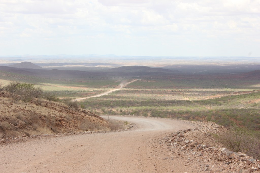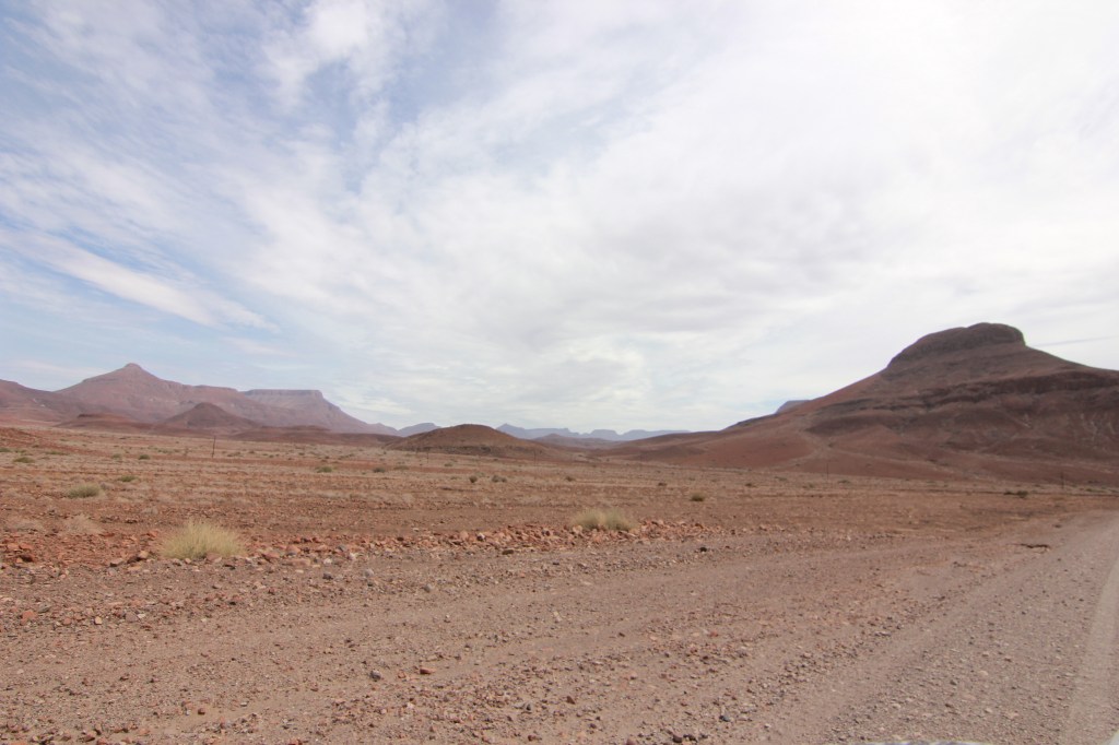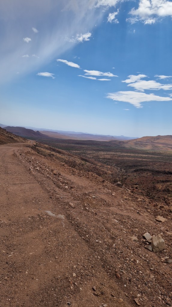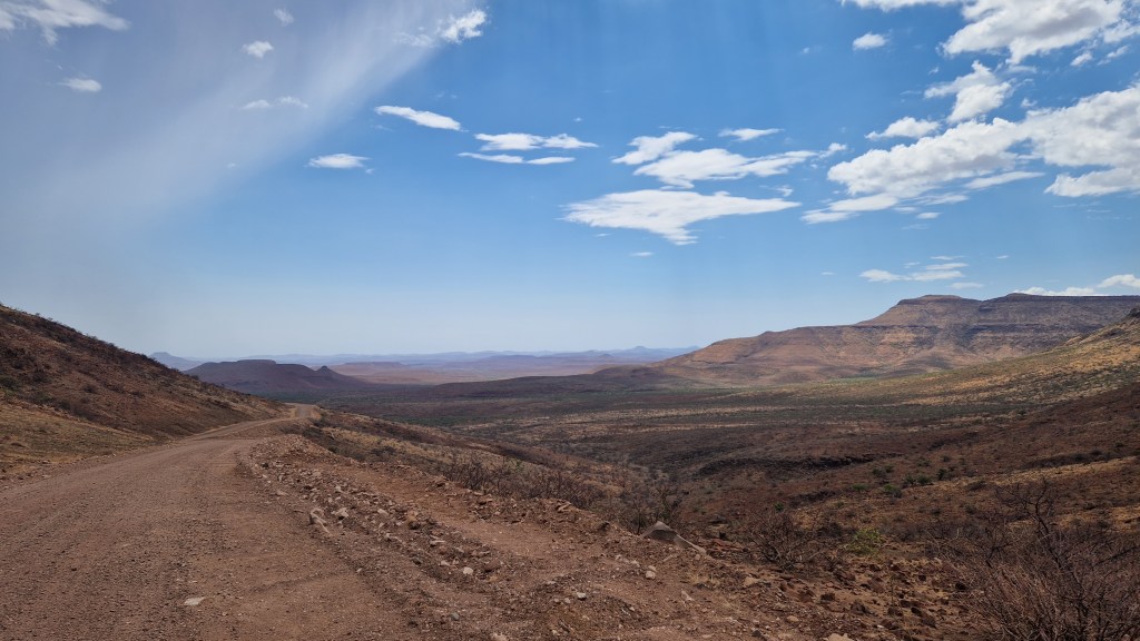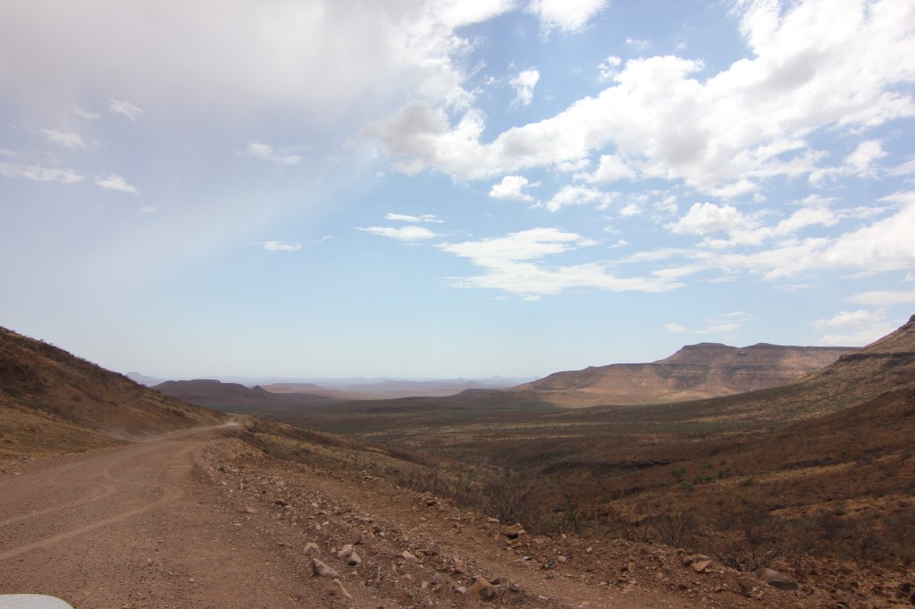 Un peu pris de court par le défilement du temps qui n’est pas tout à fait le même lorsque l’on passe un bon moment, il faut tout de même se résigner et remonter dans nos véhicules, au risque d’arriver trop tardivement à Palmwag. Le convoi se remet en route, bien décidé à veiller à ce qu’il n’y ai aucun contretemps 🙂 Et avec une grande hâte, c’est de retrouver Palmwag! La route devient comme dans notre mémoire, de plus en plus belle, impressionnante, intimidante même. Nous ne croisons presque pas de véhicules, la vue au devant de nous est sur des dizaines de kilomètres, grand beau temps, musique à fond, le bonheur! Nous aurons effectivement une petite frayeur avec une personne au milieu de la piste se faisant passer pour un travailleur, tentant sa chance pour entrer dans le véhicule, mais en montrant bien qu’il n’y avait aucune possibilité que nous nous arrêtions, appels de phare et klaxon, le pirate ne se sera pas essayé plus que cela à nous rouler. Cela reste une situation un peu stressante, il est vrai, mais au final anecdotique dans notre quotidien. L’autre confirmation c’est la beauté de Grootberg Pass, de toute beauté, qui annonce l’arrivée dans cet univers rocailleux et intimidant qu’est la région de Palmwag.