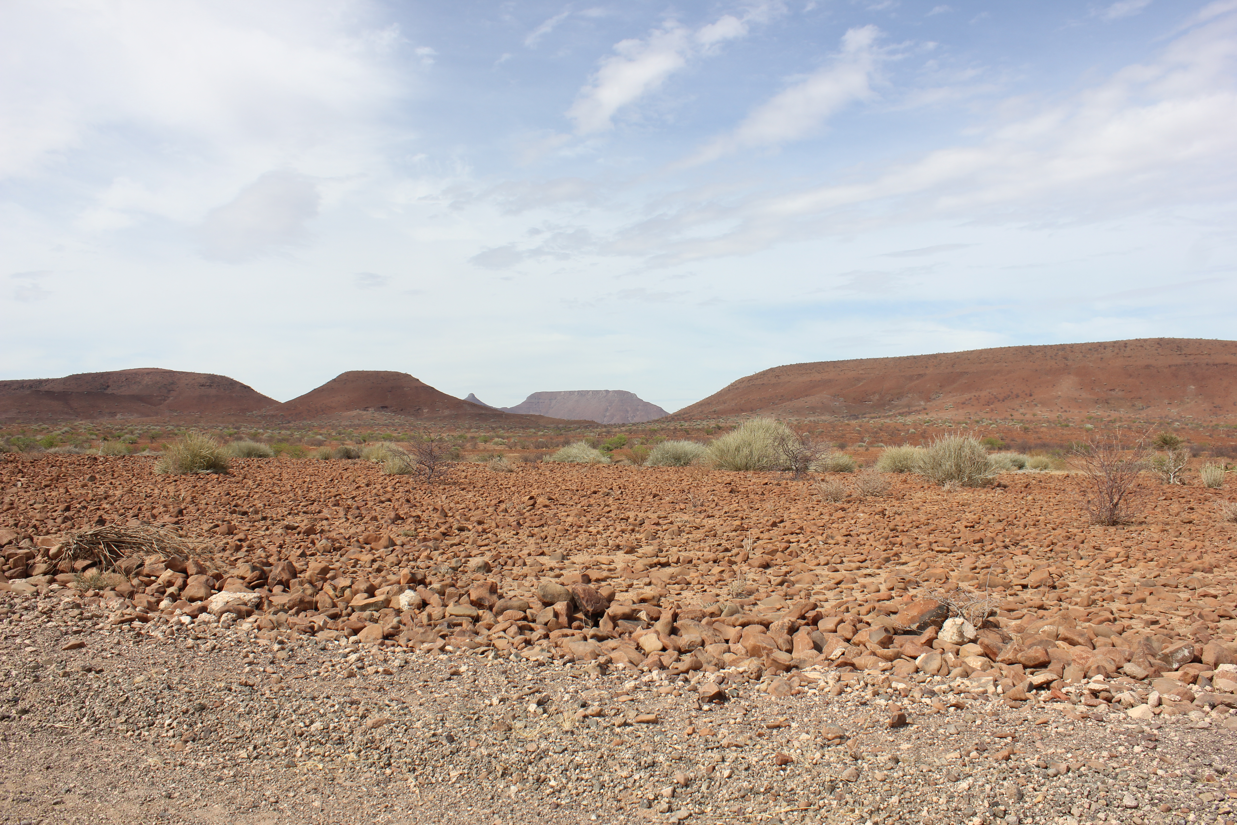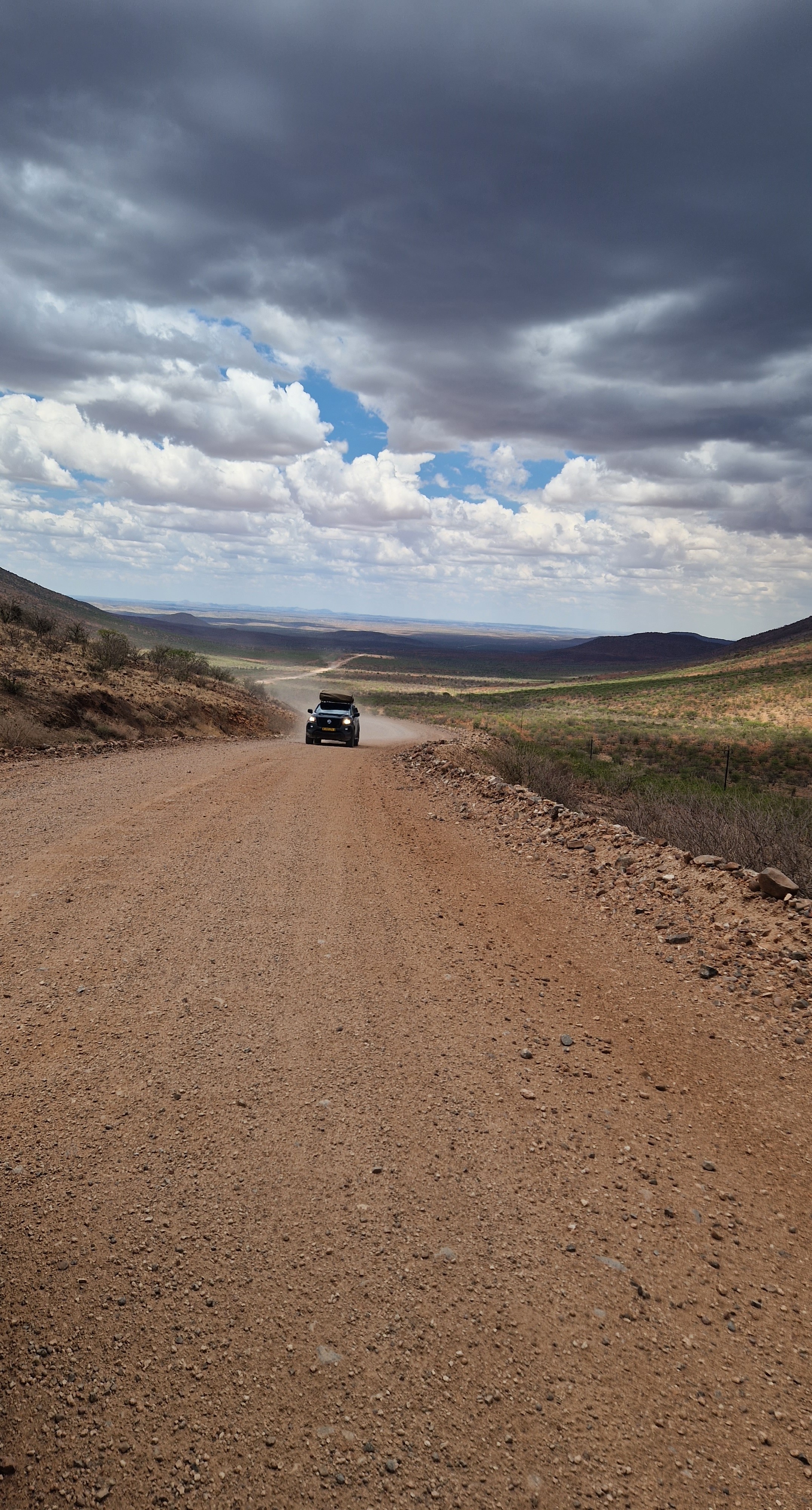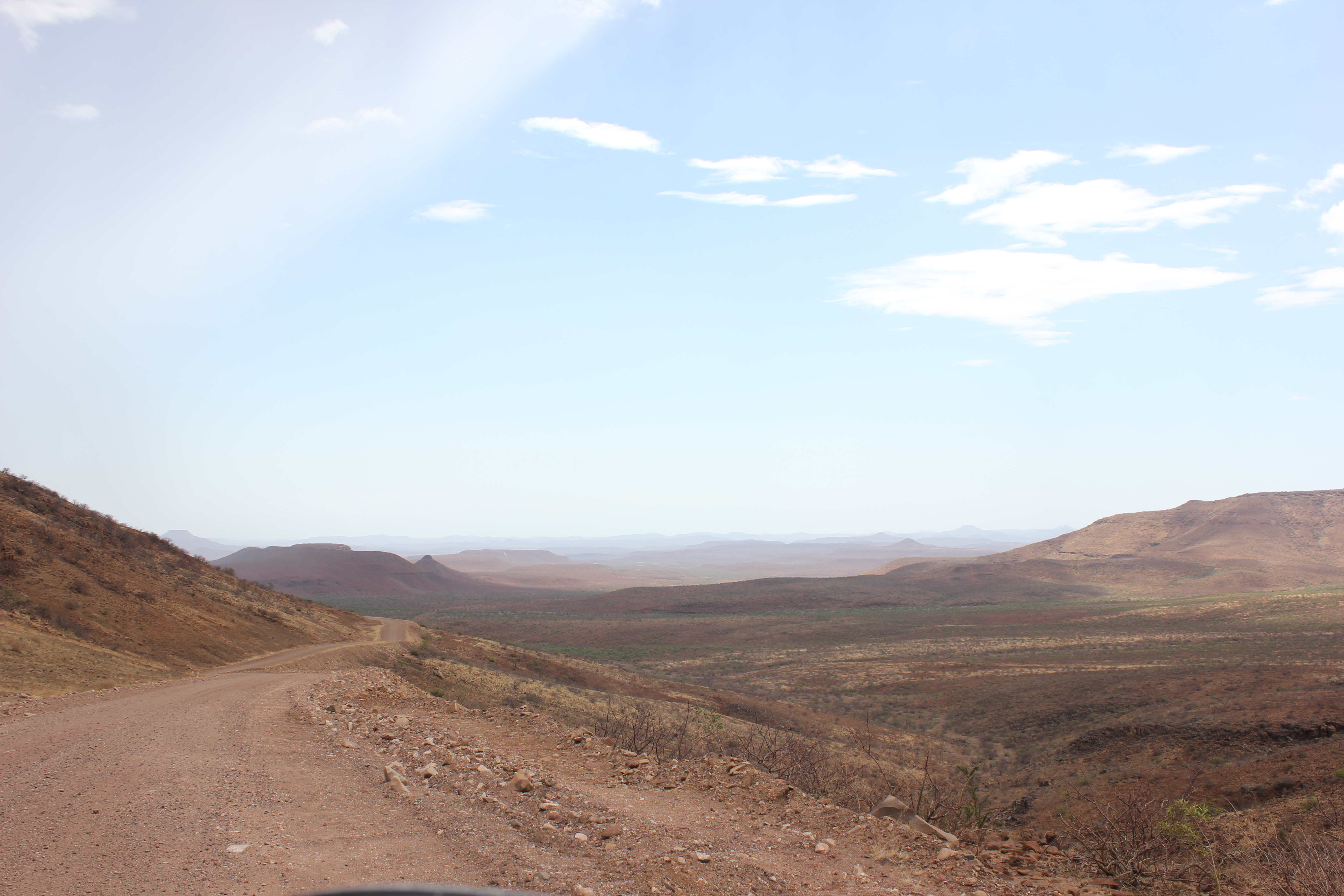 Un peu pris de court par le défilement du temps qui n’est pas tout à fait le même lorsque l’on passe un bon moment, il faut tout de même se résigner et remonter dans nos véhicules, au risque d’arriver trop tardivement à Palmwag. Le convoi se remet en route, bien décidé à veiller à ce qu’il n’y ai aucun contretemps 🙂 Et avec une grande hâte, c’est de retrouver Palmwag! La route devient comme dans notre mémoire, de plus en plus belle, impressionnante, intimidante même. Nous ne croisons presque pas de véhicules, la vue au devant de nous est sur des dizaines de kilomètres, grand beau temps, musique à fond, le bonheur! Nous aurons effectivement une petite frayeur avec une personne au milieu de la piste se faisant passer pour un travailleur, tentant sa chance pour entrer dans le véhicule, mais en montrant bien qu’il n’y avait aucune possibilité que nous nous arrêtions, appels de phare et klaxon, le pirate ne se sera pas essayé plus que cela à nous rouler. Cela reste une situation un peu stressante, il est vrai, mais au final anecdotique dans notre quotidien. L’autre confirmation c’est la beauté de Grootberg Pass, de toute beauté, qui annonce l’arrivée dans cet univers rocailleux et intimidant qu’est la région de Palmwag.