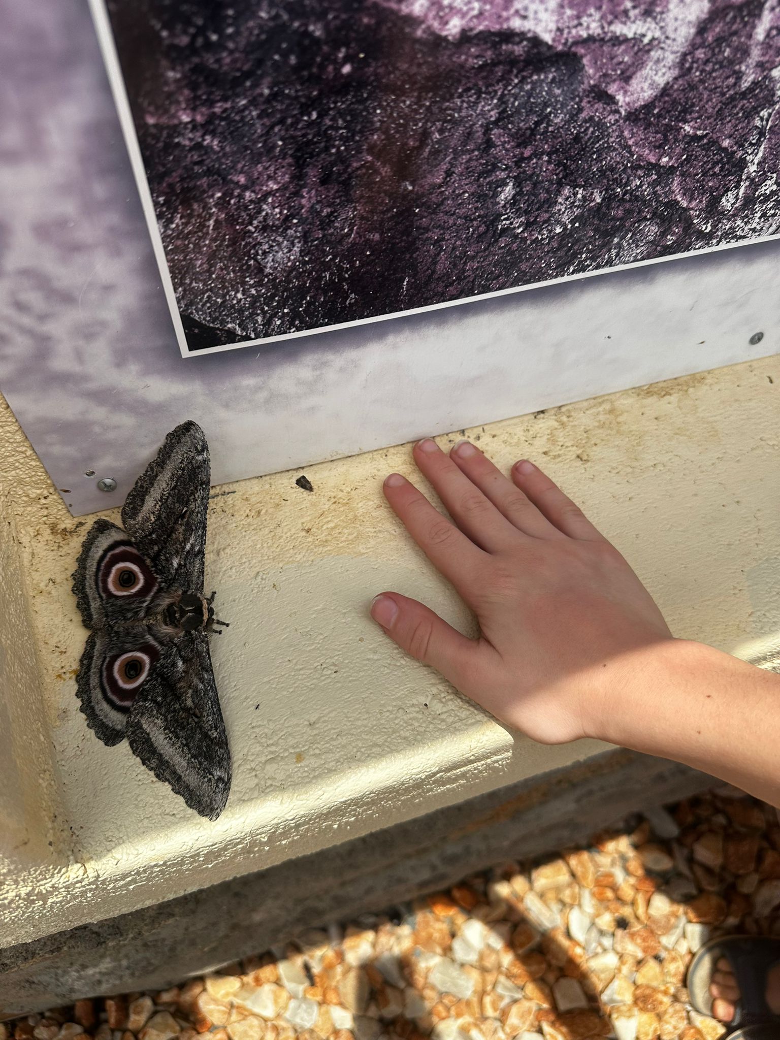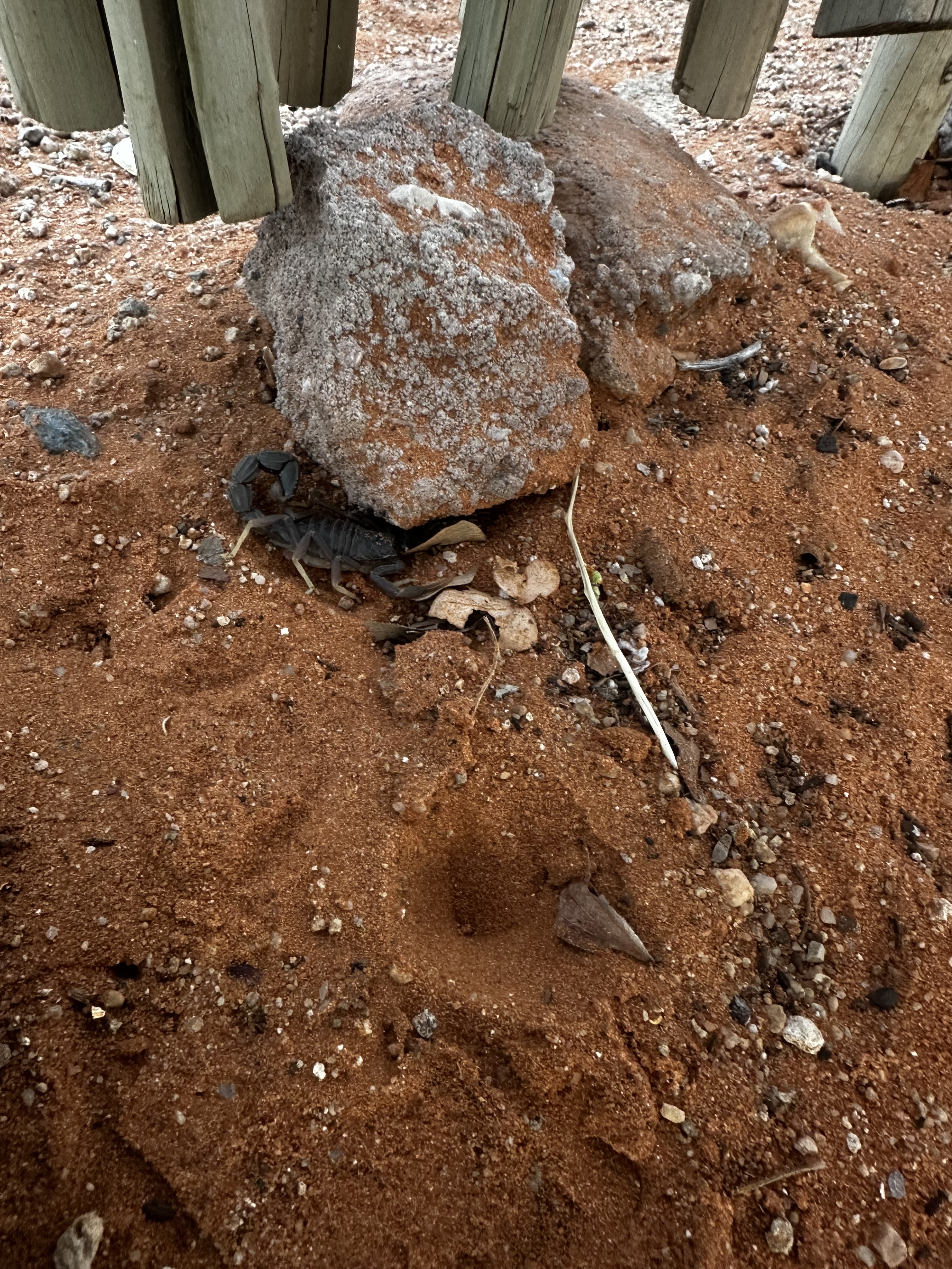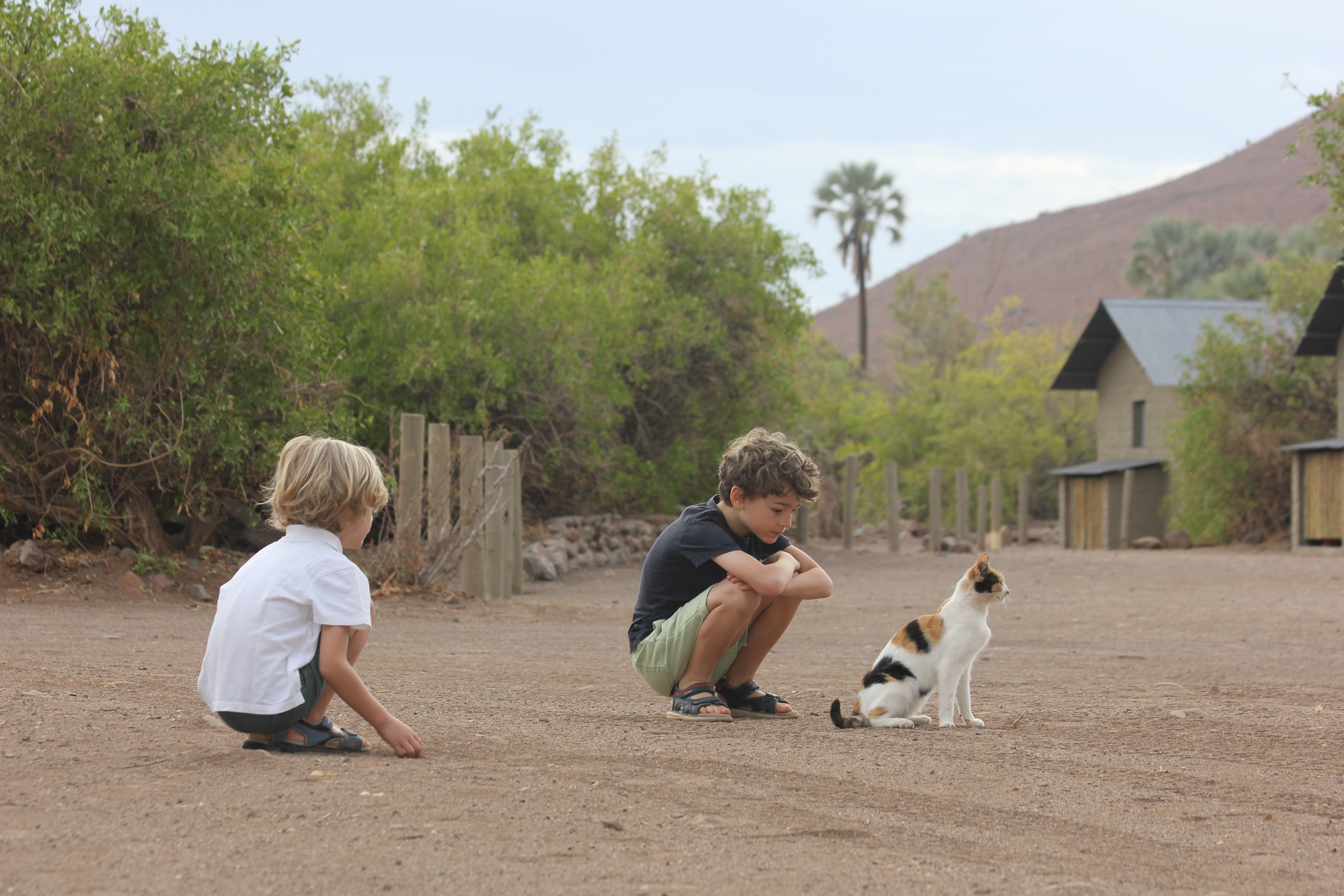 Et puis, avec notre belle rencontre d’hier, Thomas & Uli, nous savons que nous allons voyager en convoi aujourd’hui avec eux, ils nous ont déjà proposer de nous arrêter pour manger le midi dans un endroit qu’ils apprécient, et de passer ensembles dans les endroits à la fois magnifiques de notre itinéraire, mais qui peuvent être un peu sensibles parfois, dans la Grootberg pass. Bref, la journée sera belle. Nous ne sommes pas spécialement pressés de partir ce matin, le petit déjeuner se fait donc tranquillement, tout comme de remballer notre campement dans la douceur. C’est aussi l’occasion d’apprendre deux choses sur la Namibie, à savoir que la grue abandonnée proche de l’accueil servait à soulever les éléphants morts il y a encore quelques dizaines d’années, mais aussi que lorsque la nuit est venteuse, il y a souvent une petite bébête qui est de sortie. C’est ainsi qu’en posant mes mains sur les épaules de Léon, assis tranquillement sur une chaise de camping, et en voulant me baisser pour l’embrasser sur le crâne, nous baissons tous les deux notre regard à quelques secondes d’intervalle vers le sol, et Léon fait ce constat sans appel « Regard papa, un scorpion! », et de voir, à une dizaine de centimètres de la sandale droite de Léon et donc de son pied, un scorpion assez imposant avancer tranquillement. A ce moment là, il n’y a aucun signe d’affolement, nous sommes tous les deux je pense un peu trop médusés par la vision de cet animal dangereux. Je dis dangereux, j’en sais rien du tout en fait, ce machin là pourrait être mortel ou assez inoffensif, je m’en fous, c’est un scorpion! Alors mon premier reflex, c’est d’ordonner à Léon de ne surtout pas bouger, et de demander à Matisse et à Jacob, assis de l’autre côté de la table, de se lever en vitesse et de s’écarter. Comme les éléphants, les scorpions n’aiment pas que l’on se trouve sur leur route, et ne piquent pas si on ne vient pas les embêter. Les deux plus petits posent la question « Pourquoi papa » « il est où le scorpion? » Mais ils comprennent très vite au son de ma voix que je ne rigole pas, et qu’ils doivent s’écarter rapidement. Ce n’est qu’ensuite, quand le scorpion, qui continue tranquillement sa route et s’éloigne tout doucement de nos pieds, que je prends les garçons derrière moi, distance de sécurité, et nous suivons la bête, qui va se loger en dessous d’un cailloux à 2-3 mètres du campement. Nathalie, qui revenait de se laver les dents, est logiquement un peu éberluée par cette annonce, mais vient observer de loin cette curiosité matinale.