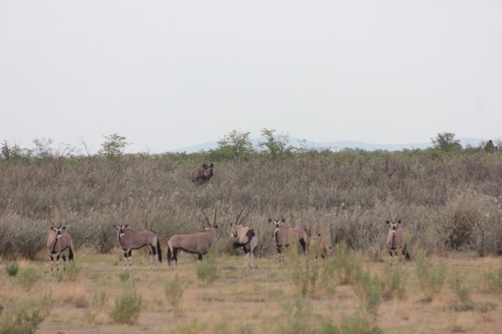 Pour être tout à fait franc et transparent, préalablement à notre voyage, j’avais répertorié des visuels des serpents et scorpions les plus dangereux et que l’on peut retrouver en Namibie, au cas ou. J’avais donc une bonne vingtaine de photo dans mon téléphone, répertoriant les spécificités de chaque spécimen, leurs comportements, leur dangerosité, ce qu’il faut faire en cas de piqûre/morsure. Et bien vous savez quoi, cela ne m’aura servi à rien! J’étais trop absorbé par l’évènement et focalisé sur la sécurité des enfants pour penser à quoique ce soit d’autre. Les garçons sont remontés fissa dans la voiture, et nous avons fini de ranger tout notre bardage. Le temps aussi de d’échanger avec nos compagnons de route du jour, nous allons rouler doucement jusqu’à la Galton Gate, sortir du parc, et faire une halte à Kamanjab pour manger. Nous prenons donc la route en direction du sud, et n’avons même pas roulés depuis 5min que nous mettons un grand coup de pédale à frein, à quelques dizaines de mètres de nous se trouvent 2 rhinos, entourés de quelques oryx. Merci Etosha, merci merveilleux Etosha, quoi de plus splendide que d’observer une dernière fois un tel animal, avant de quitter le parc? Rien. Absolument rien. Alors oui, merci de nous avoir offert un spectacle haletant et fantastique durant tout notre séjour ici. Et merci pour cet au revoir digne des meilleurs films.
