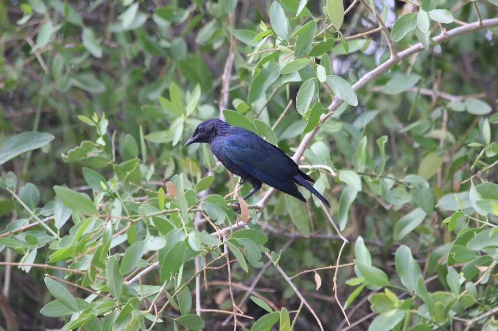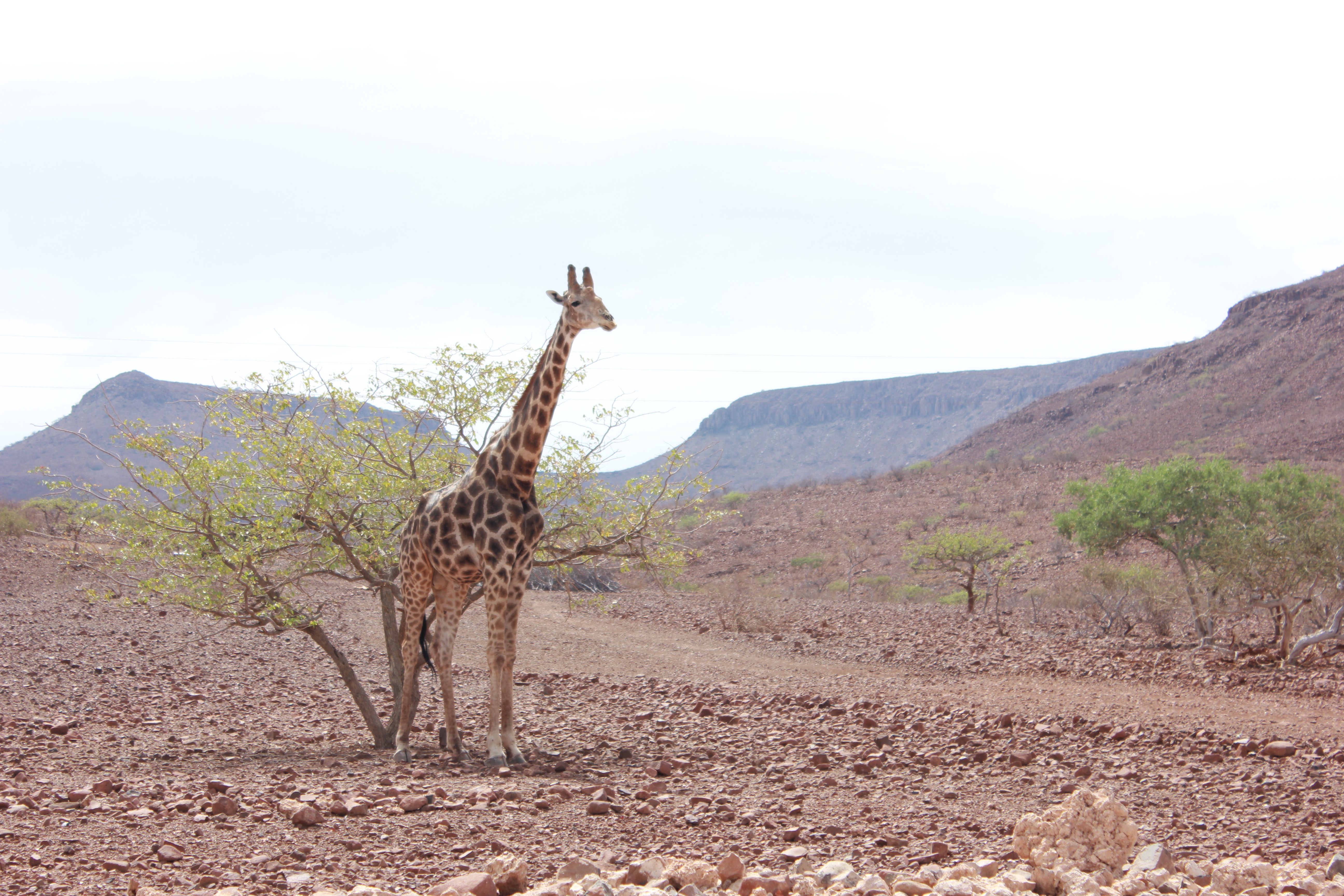 Passée la barrière sanitaire, il ne nous faut que quelques minutes pour rejoindre la réception du lodge, et récupérer la clé de notre campsite. Concernant cette barrière sanitaire, elle est établie pour préserver les cheptels d’animaux d’élevage de maladie contagieuse, surtout dans le sens nord -> sud. Interdiction de faire passer de la viande non cuite, du lait, des produits laitiers. La charcuterie elle passe sans problème, c’est à noter. Et lorsque l’on voyage comme nous dans le sens inverse habituel, ce n’est pas l’arrivée à Palmwag que cela peut poser soucis sur la nourriture, mais bien lorsque l’on en repart en direction du Sud. Le truc qui est complètement fascinant lorsque l’on arrive dans cette région reculée et inhospitalière, c’est de trouver de la présence humaine, mais surtout animale. C’est ainsi que l’on croisera quelques huttes, mais surtout de magnifiques girafes, qui sont au moins aussi étonnées que nous de voir de la vie en face d’eux. C’est d’ailleurs un facteur prépondérant dans notre choix de la Namibie plutôt que tel ou tel autre pays, la présence quasi permanente d’animaux sauvages, en dehors de toute réserve privée ou tout parc national, qui rend chaque observation unique en son sens. Cette girafe en est le meilleur exemple! Mais bref, check-in réalisé, nous prenons nos quartiers sur le campsite, superbement bien équipé. Toilettes et douche privées, tonnelle avec lavabo privatif, le tout dans ce splendide décor. Nous sommes accueillis par une ribambelle d’oiseaux, à la fois des tisserands ou des républicains sociaux, et surtout de magnifiques étourneaux du Cap. Si les deux premiers sont d’un jaune magnifique facilement identifiable, l’Etourneau du Cap a une robe qui vous surprendra en fonction de l’angle par lequel vous l’observerez. A l’ombre, vous penserez qu’il est noir, plus petit qu’un corbeau, et pas forcément très intéressant, alors que dès qu’il passera sous un rayon de soleil, son plumage bleu / bleu vert / pétrole le rend irrésistible. D’autant qu’il n’est absolument pas effrayé, au contraire il profite des denrées que l’on pourrait laisser à terre pour se nourrir. C’est limite s’ils viendraient prendre leur repas à la main. Ils nous réserveront une autre magnifique surprise, mais il vous faudra patienter quelque peu pour la découvrir 🙂