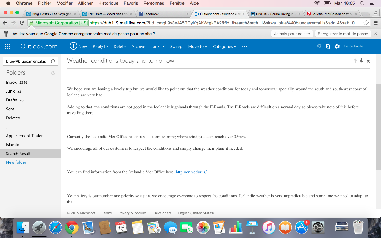C’est donc un peu sur notre faim que nous rentrons au cottage, Léon est pour le coup vraiment crevé par cette journée. Les kilomètres accumulés en voiture, le vent, la découverte de Kerlingarfjoll, le restaurant du soir, autant de facteurs qui auront eu raison de sa patience, et le pousseront à s’endormir en deux temps trois mouvements. Une fois réunis entre grands autour de notre carte routière et touristique, il est grand temps de se concerter afin de mettre en place le programme des réjouissances de demain et de la fin de notre périple. Il faut dire que le temps nous est désormais compté, et que nous souhaitions tout de même faire des activités encadrées, afin de rendre le voyage de notre soixantenaire encore plus inoubliable. Nous souhaitions en effet réserver une sortie Snorkeling dans la fosse de Silfra, dont les eaux sont d’une limpidité unique, et en font l’un des spot de plongée les plus beau du monde puisque situé entre les 2 plaques continentales. Ne disposant pas de brevet de plongée, il nous faut donc nous contenter d’une sortie palme et tuba! Notre hôtel de demain soir propose de faire cette sortie à des heures qui nous conviennent, nous pensons donc voir directement sur place. Nous souhaiterions également offrir à Marie-Line la découverte d’une chambre magmatique à l’intérieur du volcan Thrihnukagigur, une expérience unique en son genre, probablement même unique au monde. Et en fait, il y une autre raison qui nous pousse à rester prudents sur la  réservation de ces deux sorties, au delà de notre timing: en checkant ma boîte mail, je constate que notre loueur de voiture Blue Car Rental nous a envoyé un mail, pas forcément annonciateur de bonnes nouvelles:
