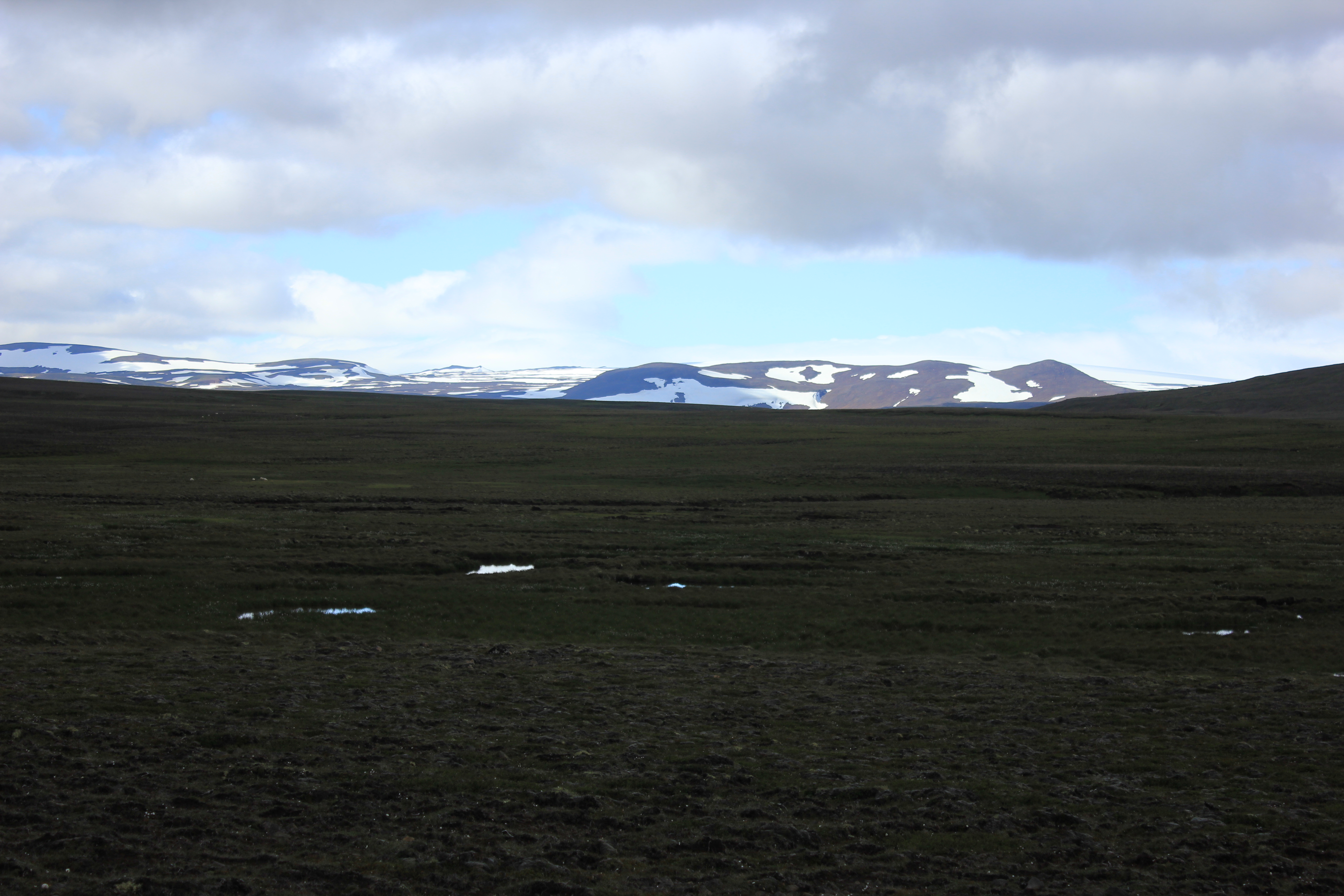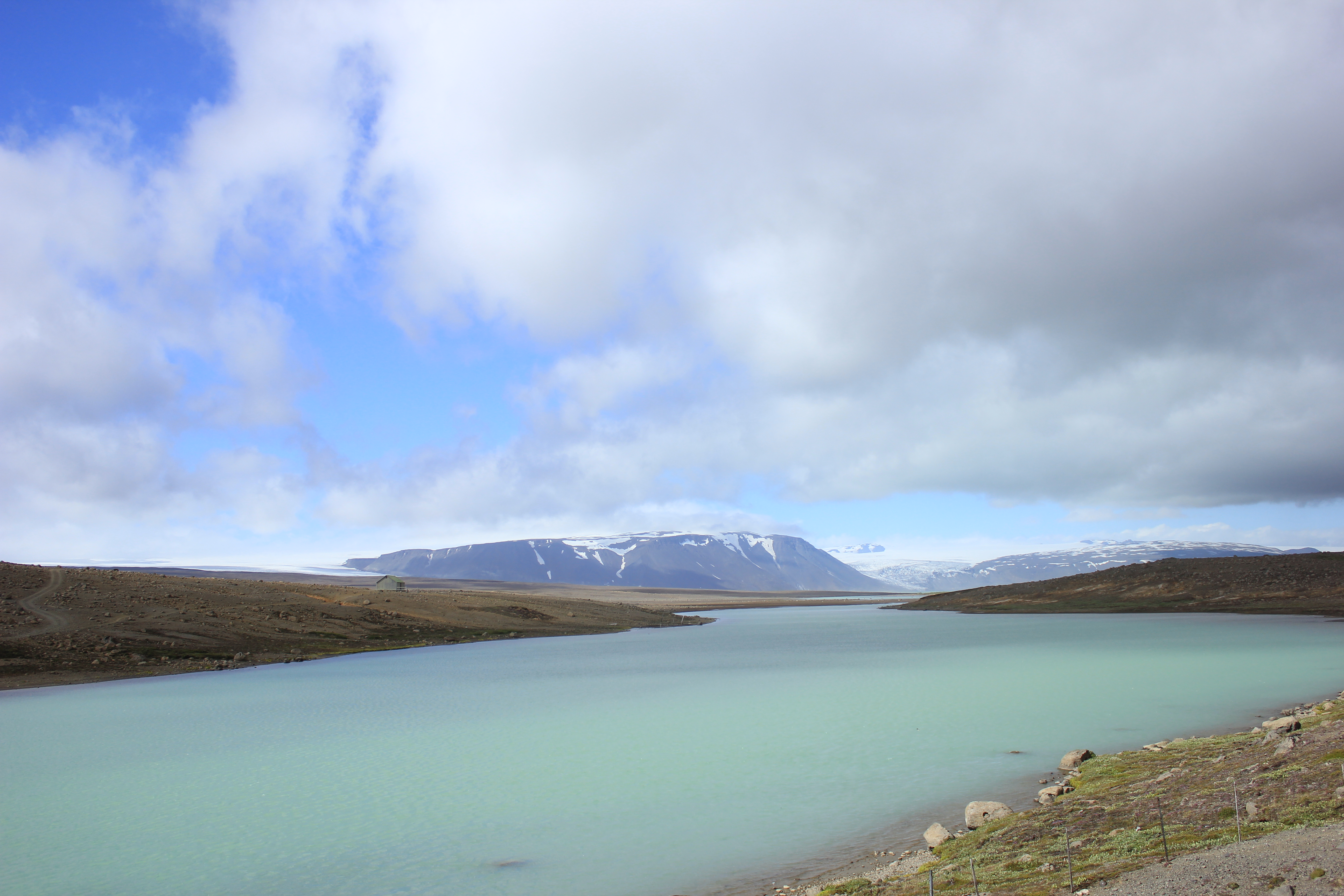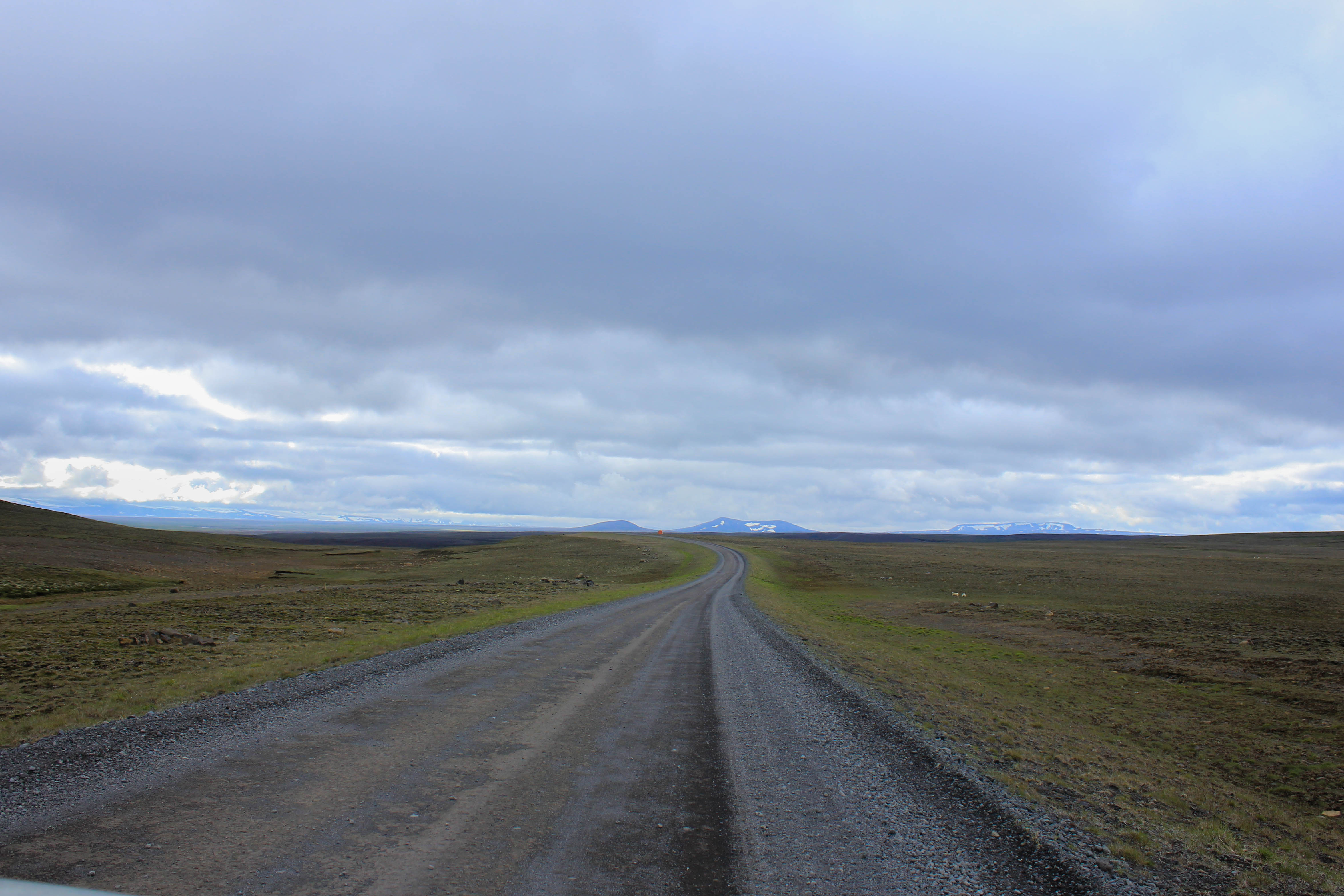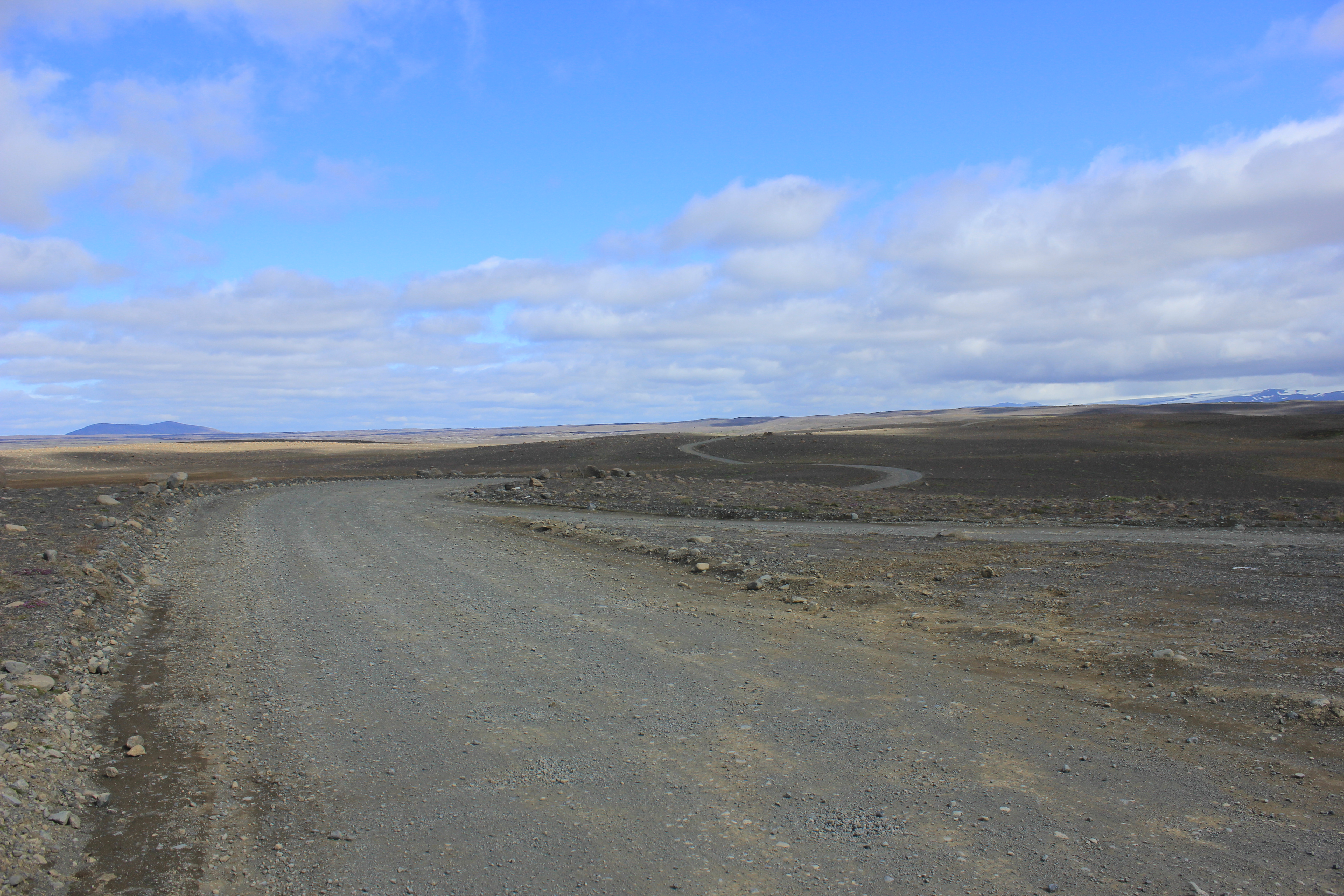 Valises bouclées, sandwichs préparés, nous effectuons nos au-revoir auprès de la maitresse de maison, qui s’enquiert de la qualité de notre nuit. Et bien elle fût très bonne! Nous avons dormis comme des loirs, dans un calme tout à fait reposant.  Nous effectuons nos premiers tours de roue autour de 8H30, le ciel semble désormais aléatoire, mais de belles éclaircies subsistent. Comme je le disais en titre de cet article, la route F35 est une route que l’on pourrait qualifier de légendaire, et ce pour deux raisons. La première, et vous vous en doutez déjà, les paysages y sont absolument splendides, grandioses. Pas ou alors très peu de trace de la présence humaine, ici les seuls traces de vie que nous observons sont les moutons, fidèles au poste. Mais pour le reste, le paysage varie entre lacs, montagnes, roches, etc… La piste n’est pas particulièrement difficile en soit, même si certains passages méritent un peu plus de concentration. La seconde l’est sur un plan plus culturel et lié au peuple islandais, puisque l’intérieur des terres, par sa nature dangereuse, inhabitée, et inhospitalière, avait la réputation d’accueillir des personnes hautes en couleur, qui n’étaient ni plus ni moins que les bandits, qui souhaitaient échapper à la justice. Mais en voyant la dureté de cet environnement, je ne sais pas quelle solution était la plus préférable pour eux: répondre de leurs actes et accepter leur condamnation, ou survivre dans un univers minéral où les ressources sont rares. Les 3/4 de l’année, l’intérieur des terres est inaccessible, les pistes étant fermées, à moins de disposer d’une super jeep, équipée pour ce genre d’expédition extrême. Bref, n’y pensez même pas, parcourir ces terres en twingo en plein hiver, pour faire une ballade digestive avec mamie un dimanche après-midi, c’est tout simplement im-po-ssi-ble! A moins que vous ayez de mauvaises intentions envers cette dernière, mais là c’est un autre problème, et je préfère ne pas trop m’en mêler!