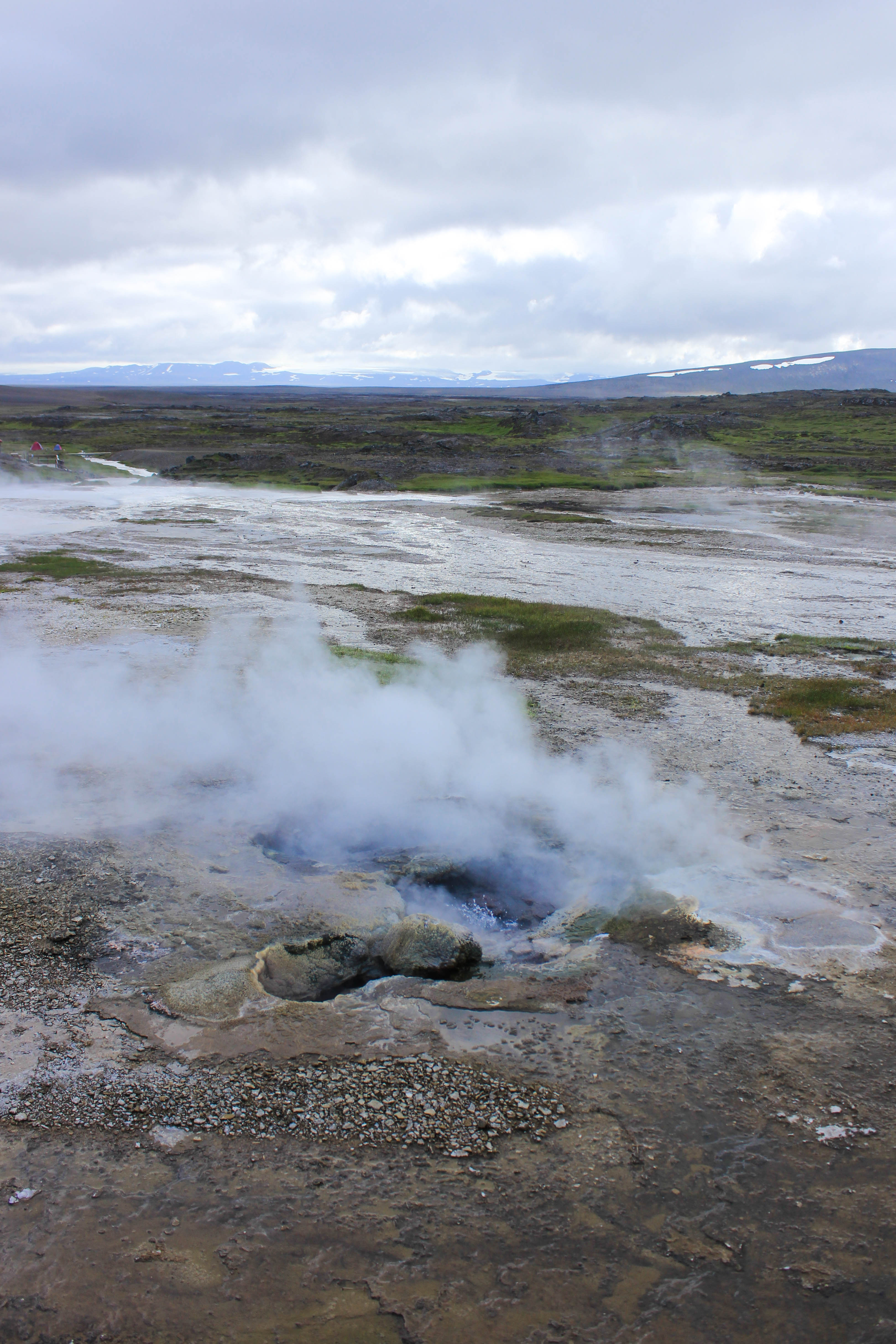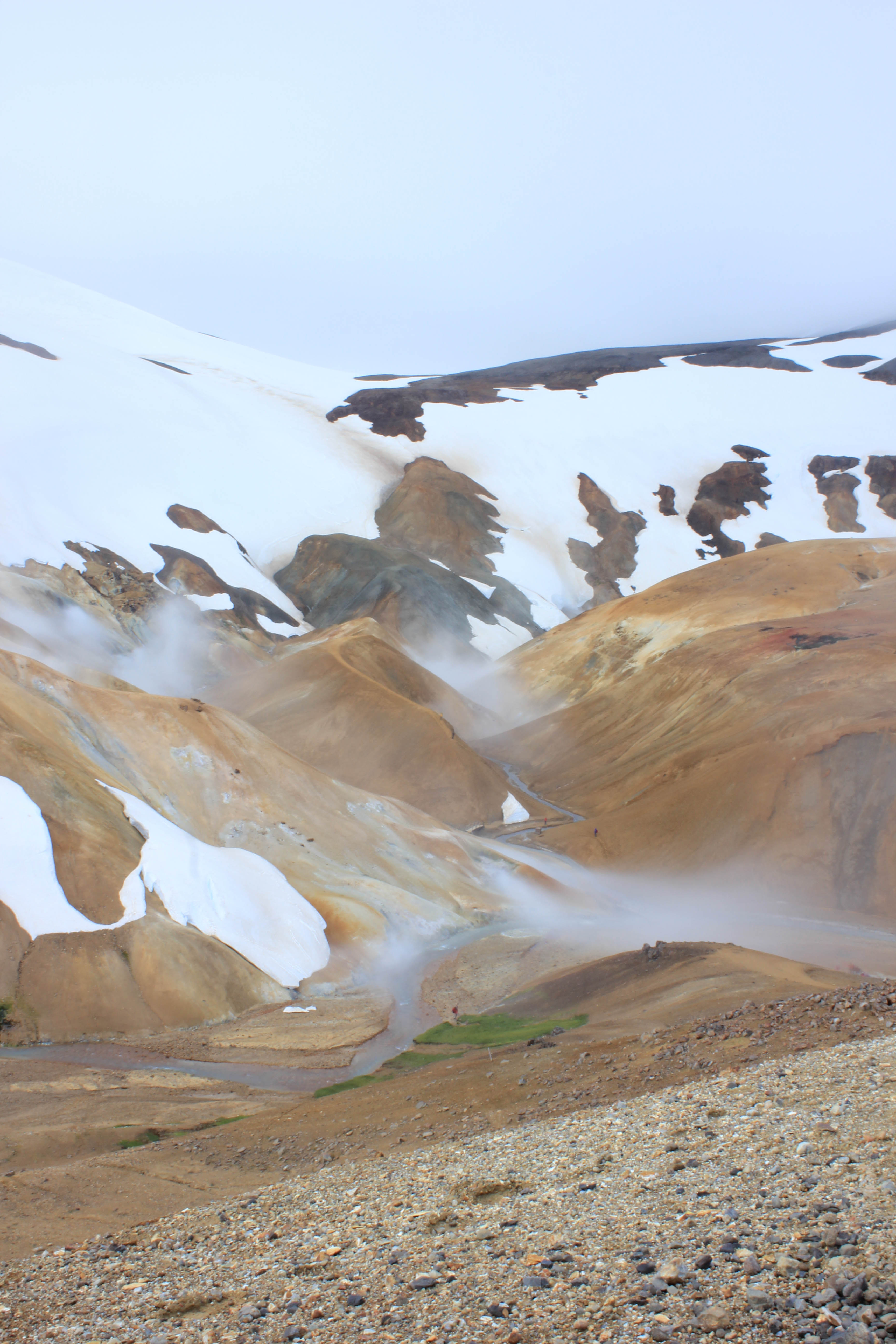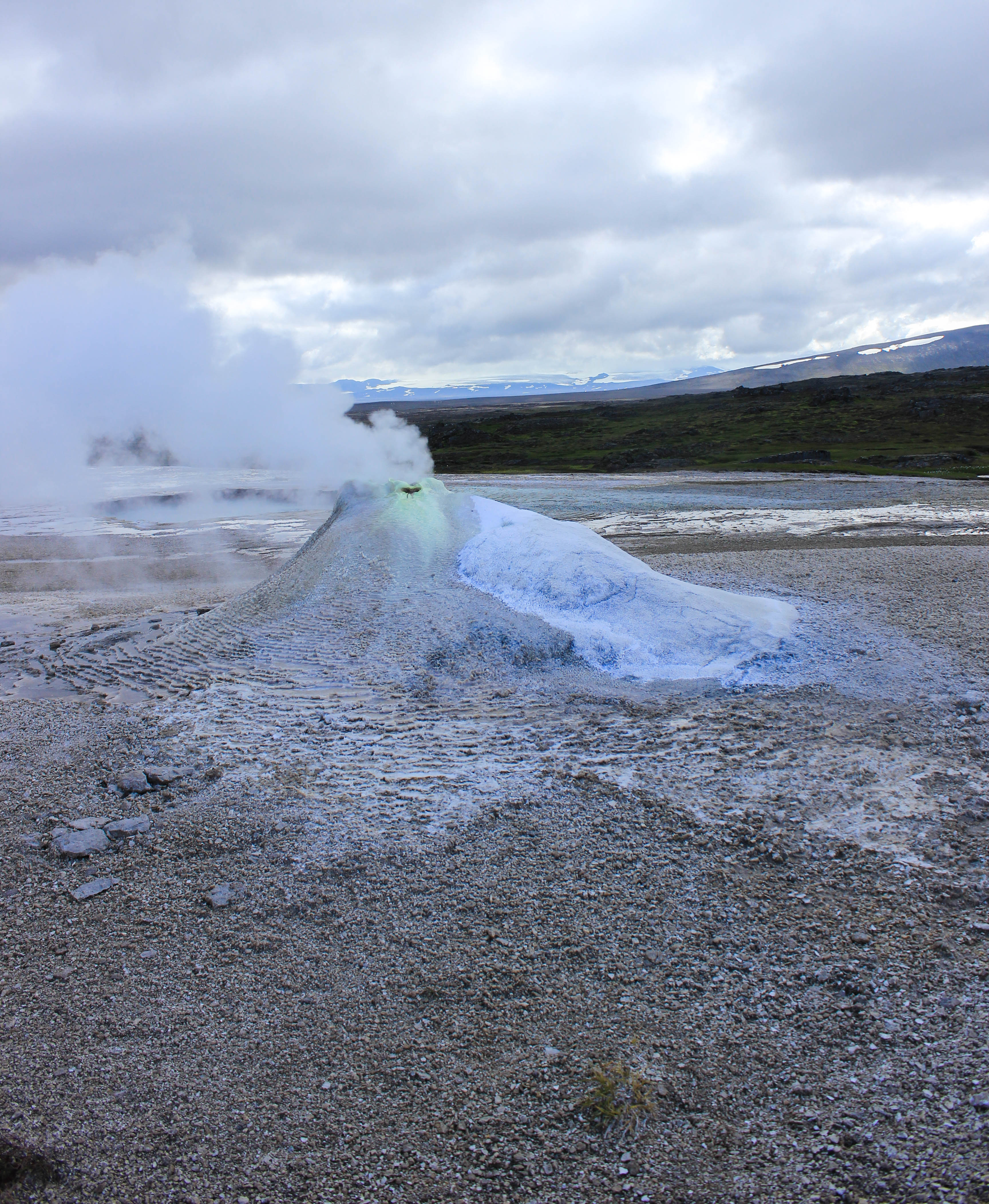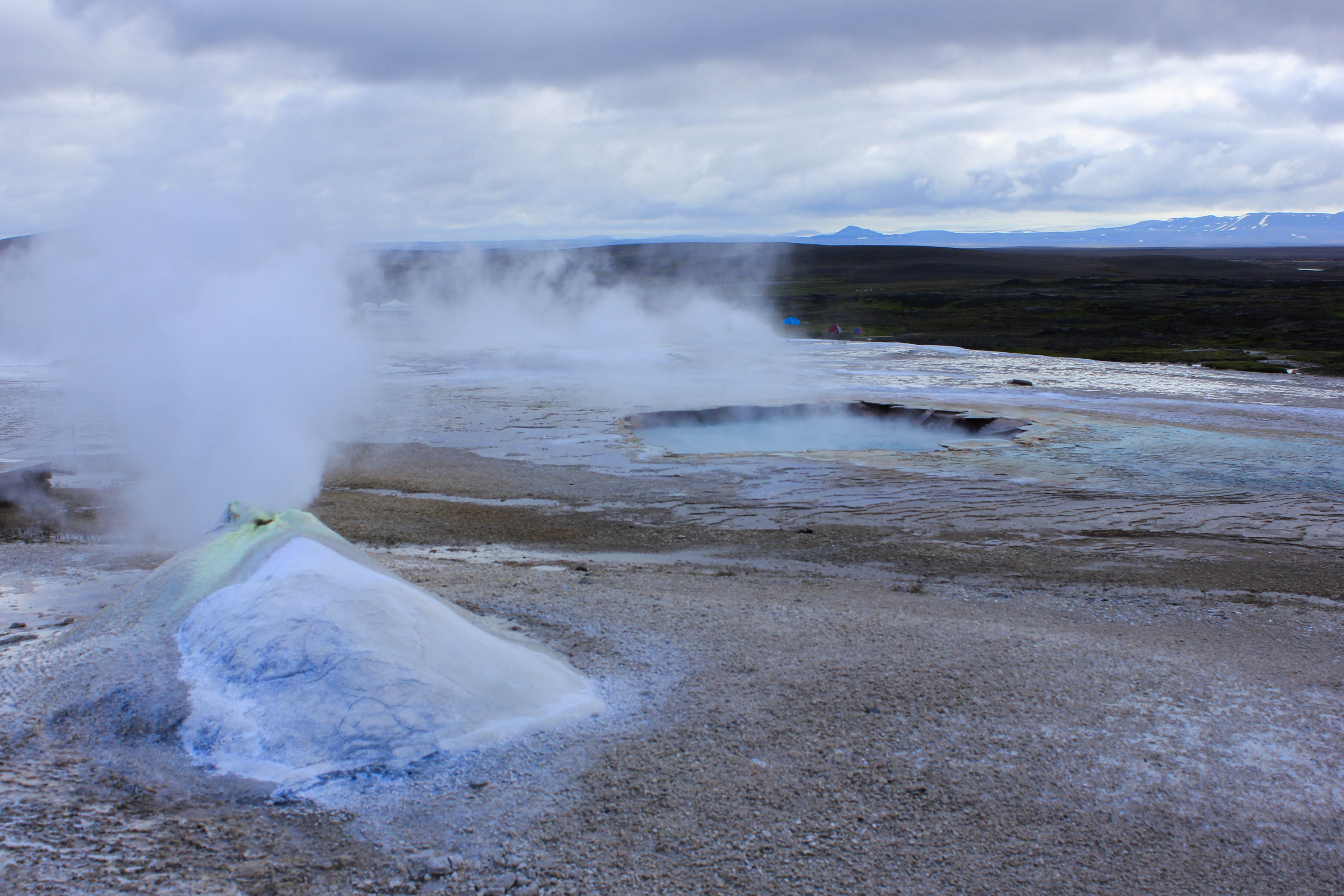 Avec le temps qui est de la partie, c’est un réel plaisir de parcourir cette terre âpre et désolée, et pourtant si belle. Difficile de se rendre compte de la portée de nos regards, on se dit juste que la ligne d’horizon est au minimum à des kilomètres et des kilomètres. Oui bon ok, cela ne veut pas forcément dire grand chose, et ne donne en rien une réelle indication de distance, mais cette impression d’infinie ne se ressent pas si souvent que cela vous ne trouvez pas?! Les kilomètres passent, et voilà que nous arrivons à notre première étape de la journée, une zone géothermique perdue au milieu de cette immensité, Hveravellir. La seule chose dont on ne se rendait pas compte en roulant, c’est que hormis le temps qui était maintenant bien dégagé, il faisait un froid de canard, ce qui aurait pu être supportable s’il n’y avait pas eu un vent à décorner les boeufs! L’intérieur des terres est aussi synonyme de températures bien plus fraîches que sur la côte Sud de l’Islande (du fait de la présence du Gulf Stream), nous aurions dû nous en rendre compte avec cette végétation quasi inexistante. Pour le coup nous ne serons que deux à sortir de la voiture et à affronter les éléments, Marie-Line et moi-même. Des couleurs magnifiques, des formes enivrantes, Hveravellir est vraiment un lieu très particulier et splendide, impossible d’y rester indifférent, surtout lorsque l’on réalise qu’il est au beau milieu de nulle part. Une fois de plus, l’Islande nous surprend là où on s’y attend le moins!