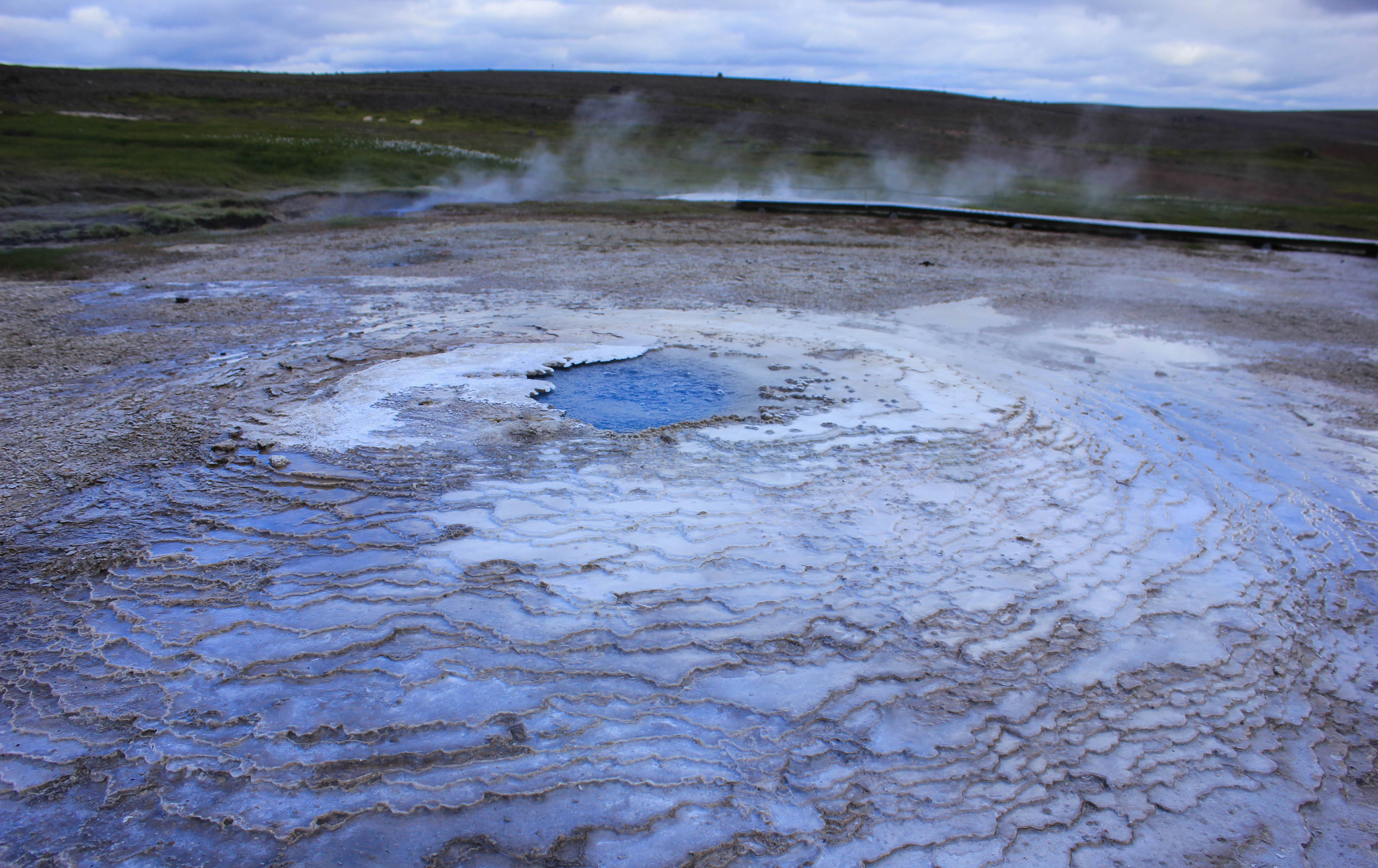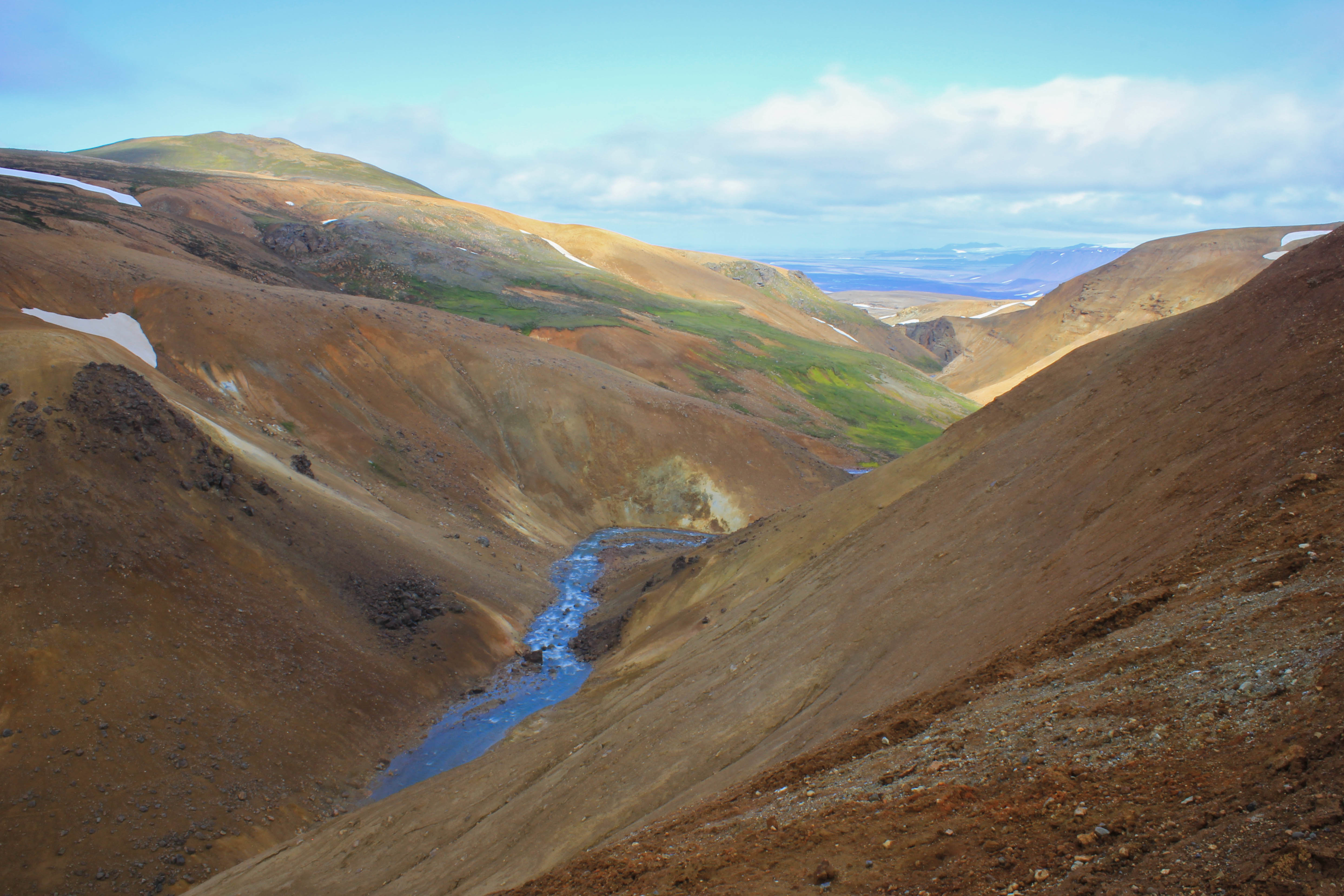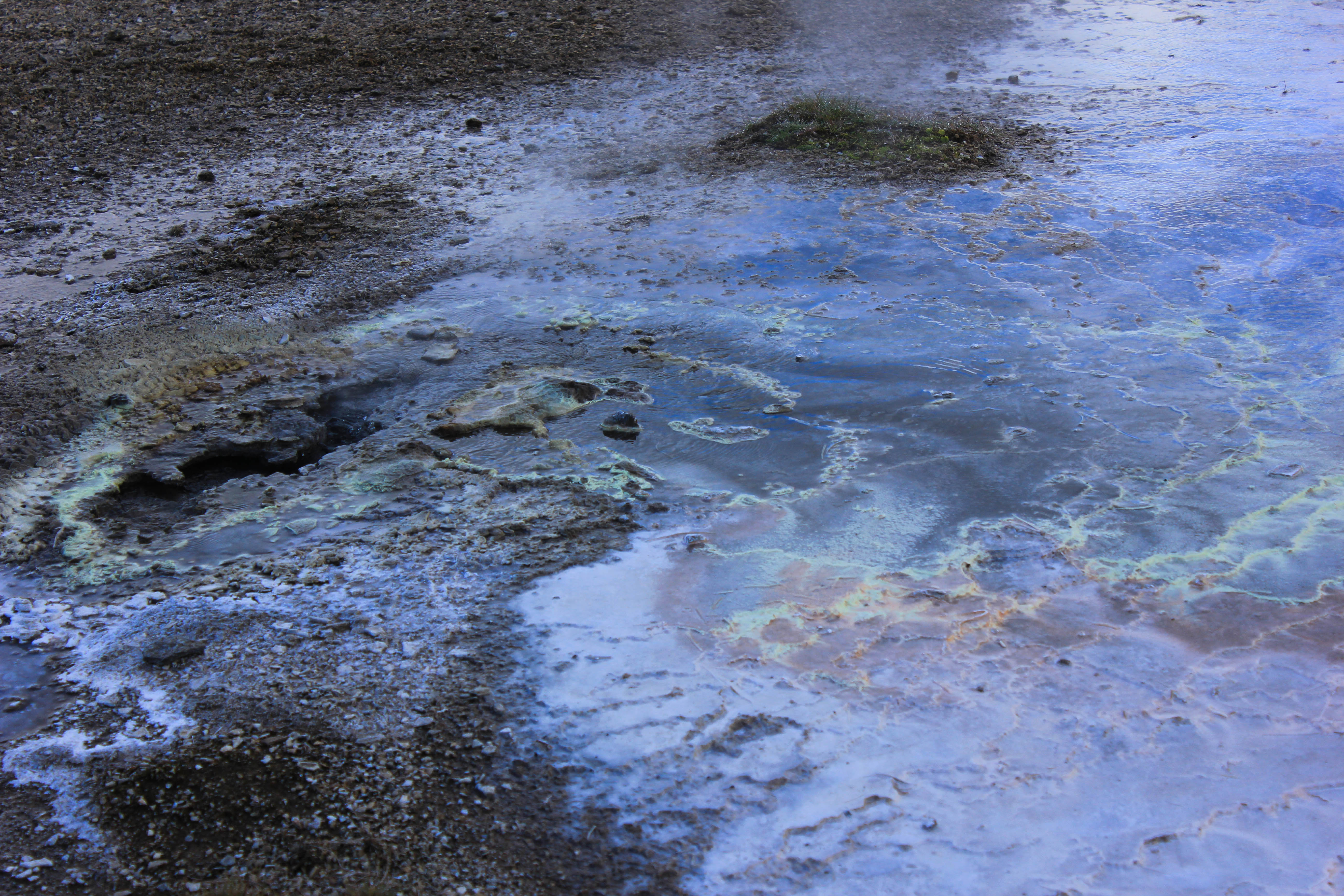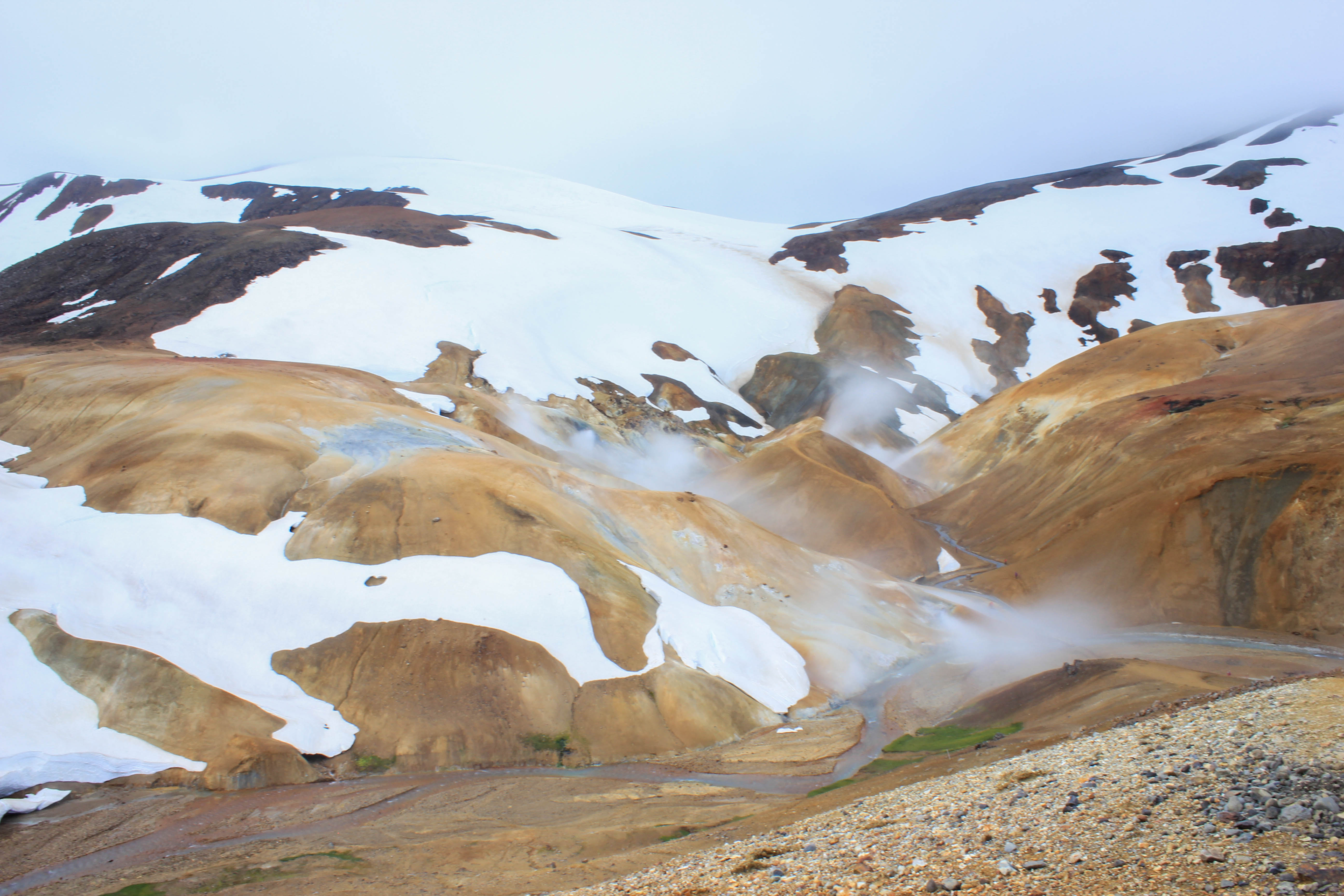 Avec le temps qui est de la partie, c’est un réel plaisir de parcourir cette terre âpre et désolée, et pourtant si belle. Difficile de se rendre compte de la portée de nos regards, on se dit juste que la ligne d’horizon est au minimum à des kilomètres et des kilomètres. Oui bon ok, cela ne veut pas forcément dire grand chose, et ne donne en rien une réelle indication de distance, mais cette impression d’infinie ne se ressent pas si souvent que cela vous ne trouvez pas?! Les kilomètres passent, et voilà que nous arrivons à notre première étape de la journée, une zone géothermique perdue au milieu de cette immensité, Hveravellir. La seule chose dont on ne se rendait pas compte en roulant, c’est que hormis le temps qui était maintenant bien dégagé, il faisait un froid de canard, ce qui aurait pu être supportable s’il n’y avait pas eu un vent à décorner les boeufs! L’intérieur des terres est aussi synonyme de températures bien plus fraîches que sur la côte Sud de l’Islande (du fait de la présence du Gulf Stream), nous aurions dû nous en rendre compte avec cette végétation quasi inexistante. Pour le coup nous ne serons que deux à sortir de la voiture et à affronter les éléments, Marie-Line et moi-même. Des couleurs magnifiques, des formes enivrantes, Hveravellir est vraiment un lieu très particulier et splendide, impossible d’y rester indifférent, surtout lorsque l’on réalise qu’il est au beau milieu de nulle part. Une fois de plus, l’Islande nous surprend là où on s’y attend le moins!