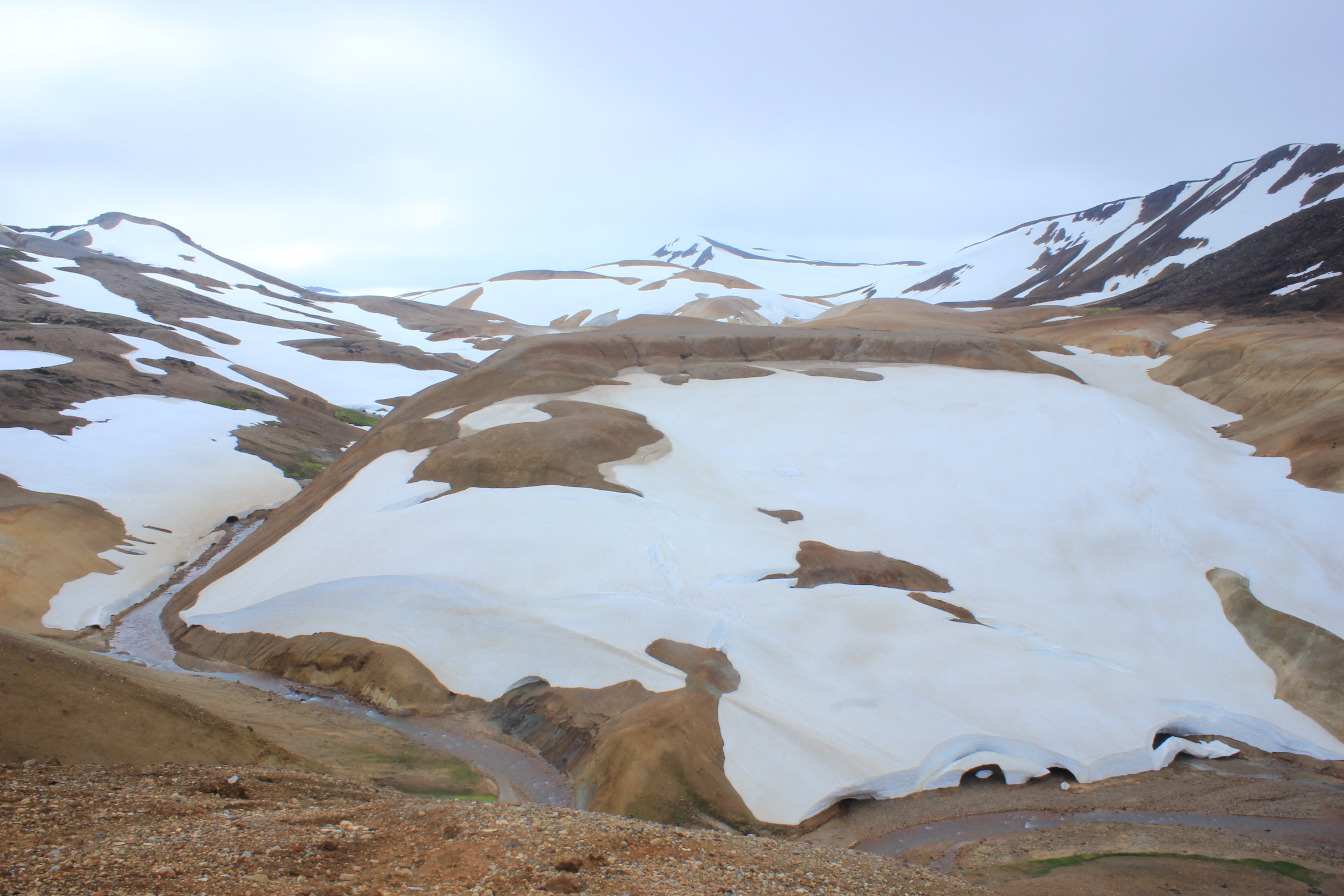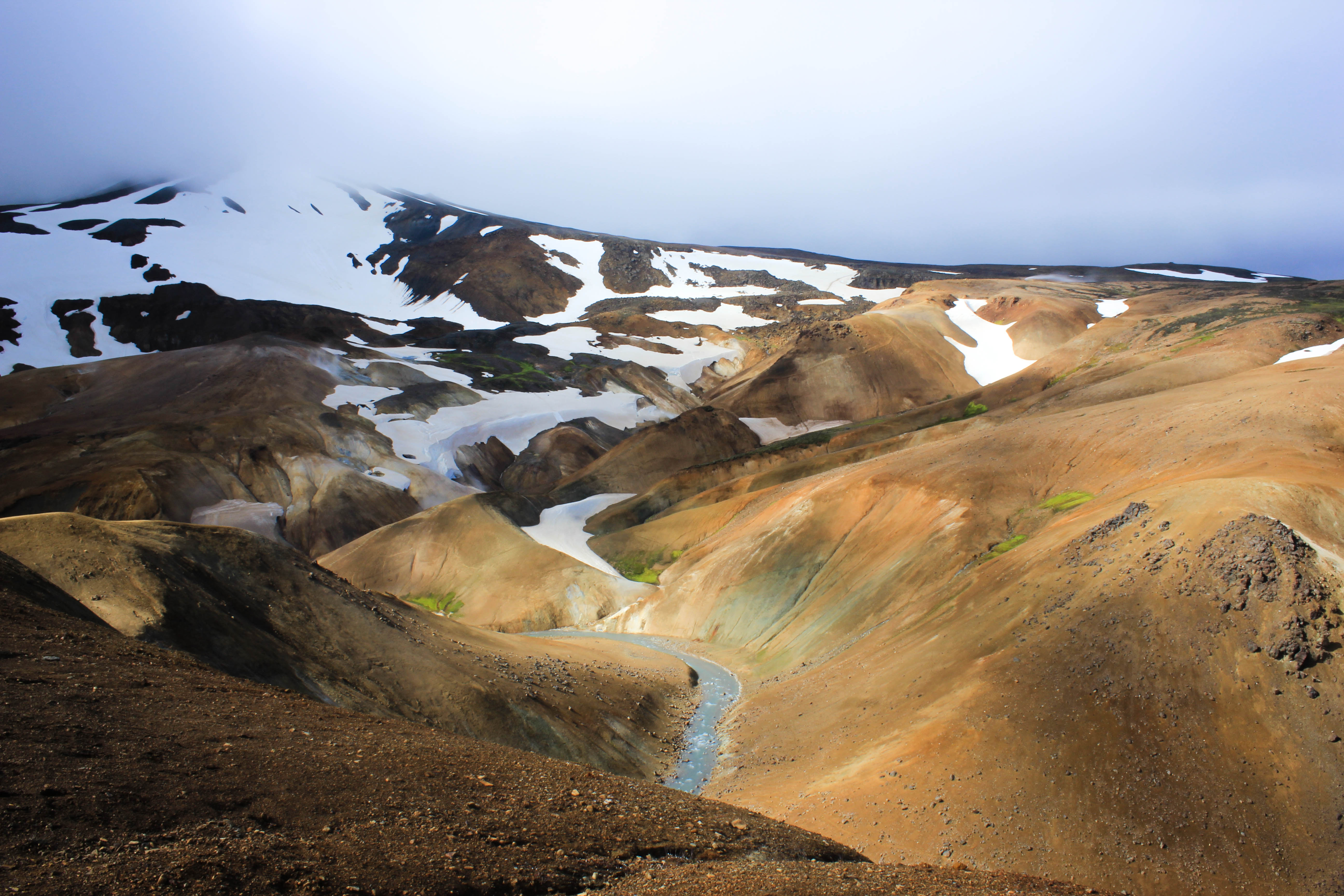 Il est à noter qu’il est possible de se baigner dans une source d’eau chaude naturelle juste en contrebas de cette zone géothermique, mais que nous ne testerons pas tellement nous avons froid! Nous ne nous attarderons pas trop dehors, toutes nos extrémités sont mises à rude épreuve malgré les protections.  Et puis nous avons bon espoir de pouvoir randonner un peu lors de notre deuxième étape de la journée, dans un site exceptionnel, là encore situé dans les hautes terres islandaises. Mais avant d’y arriver, la route reste toujours aussi belle, un peu plus caillouteuse certes, mais tout à fait gérable. Notre deuxième étape, donc, c’est la fameuse zone de Kerlingarfjoll, qui offre aux regards des randonneurs des paysages venus d’un autre monde. Sources thermales, rivière d’eau chaude, fumerolles, et tout ça en pleine montagne, avec des couleurs au moins aussi variées que dans le Landmannalaugar! Sur le papier, tout ceci est vraiment alléchant, non seulement pour nos petits yeux, mais aussi pour mon objectif photo! Arrivés sur zone, le mode 4×4 est vraiment indispensable, la route est très sinueuse, et à quelques semaines près le site était presque inaccessible du fait de l’écroulement d’un pont, et d’un gué redoutable. Mais pour le coup nous avons pu accéder au site sans trop de problème, un pont ayant été aménagé. Nous nous arrêtons au premier parking, à proximité du refuge, et prenons notre déjeuner. Sandwich, chips, skyr, et fruits, pas besoin de plus, on pourrait même encore le simplifier à: skyr, skyr, et encore skyr (si l’estomac n’est pas déjà rempli par les 2 premiers)! Léon commence a en avoir ras la casquette, à juste titre, d’être dans la voiture, du coup nous sortons un peu pour qu’il puisse se dégourdir les jambes. Et là, amère constatation: si déjà le vent était fort présent à Hveravellir, et bien cela n’a pas diminué ici, bien au contraire! Il ne fait également pas plus chaud, ce qui va rendre la rando vraiment compliquée… Nous montons avec le 4×4 sur le second parking un peu plus en hauteur, et il faut se rendre à l’évidence: le sentier est boueux, relativement dangeureux, et malgré les belles éclaircies, les conditions ne sont vraiment pas propices pour la marche, surtout avec notre petit bout sur le dos, qui pourrait avoir vraiment froid. Nous mettons donc plusieurs couches de vêtements bien chauds, afin de sortir un peu, et de profiter tout de même un peu de la vision qui s’offre à nous: fantastique! Sincèrement, cet endroit est irréel, magnifique, splendide, époustouflant, extraordinaire, épatant… Je manque de superlatif tant je suis impressionné par ce que j’ai sous les yeux, tout ici attire le regard. Mais plus que des mots, ce sont les photos qui je pense résumeront le mieux cet endroit: