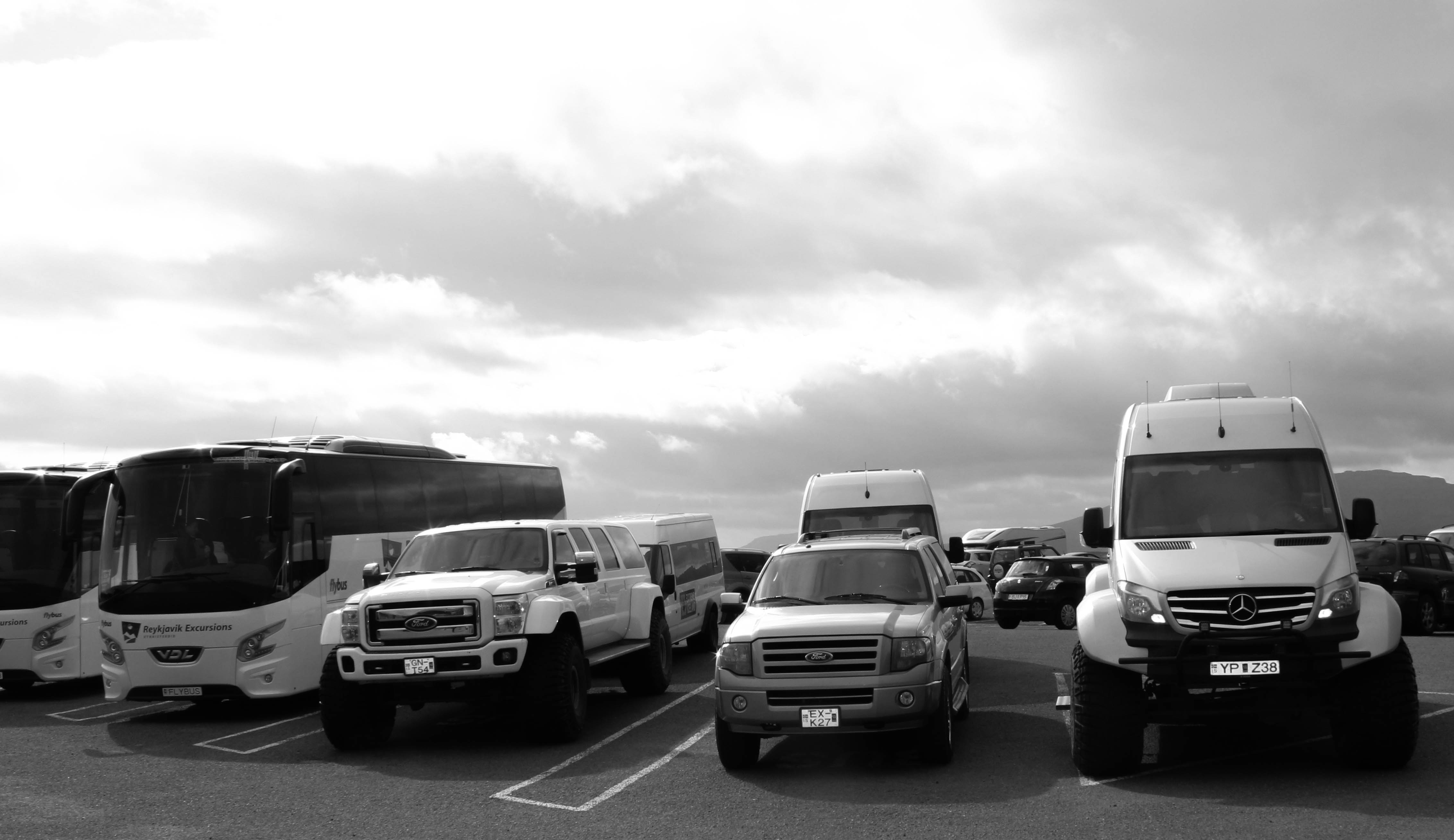 Remontés au niveau du parking, et pendant que ces dames parcourent les allées du magasin jouxtant les abords du parking, avec Léon, nous voyons arriver ces fameux super 4×4, montés sur ressort et responsables de l’impact sur notre pare-brise. En bons mecs que nous sommes, nous ne pouvons qu’être impressionnés par la taille de ces véhicules, montés sur des pneus dont la hauteur doit faire un bon mètre au minimum. Le contraste est d’autant plus saisissant lorsqu’ils sont garés à côté d’autres véhicules, que ce soient des bus, des gros pick-up américains, ou bien même (et c’est le plus marrant), des petites citadines.