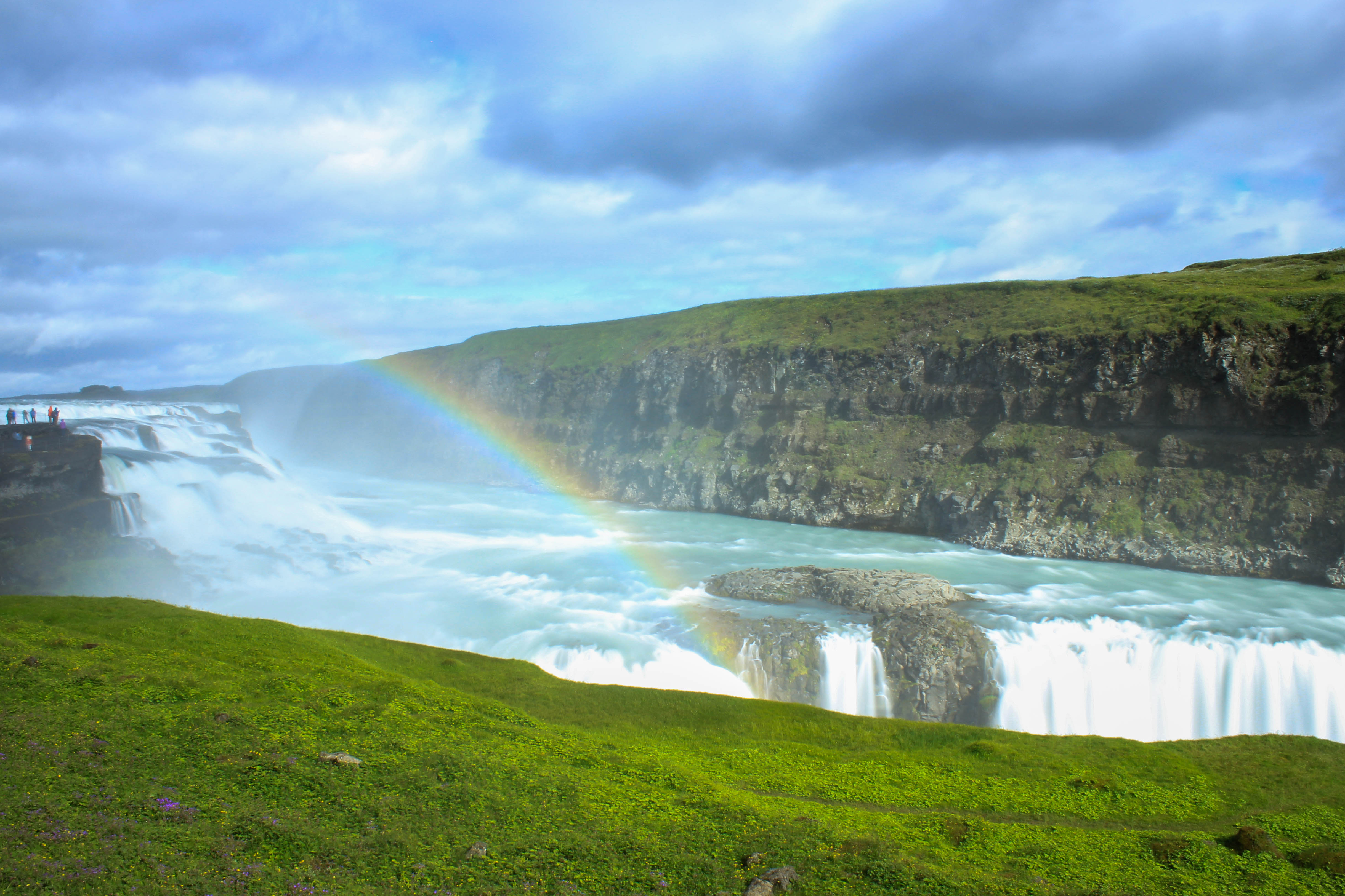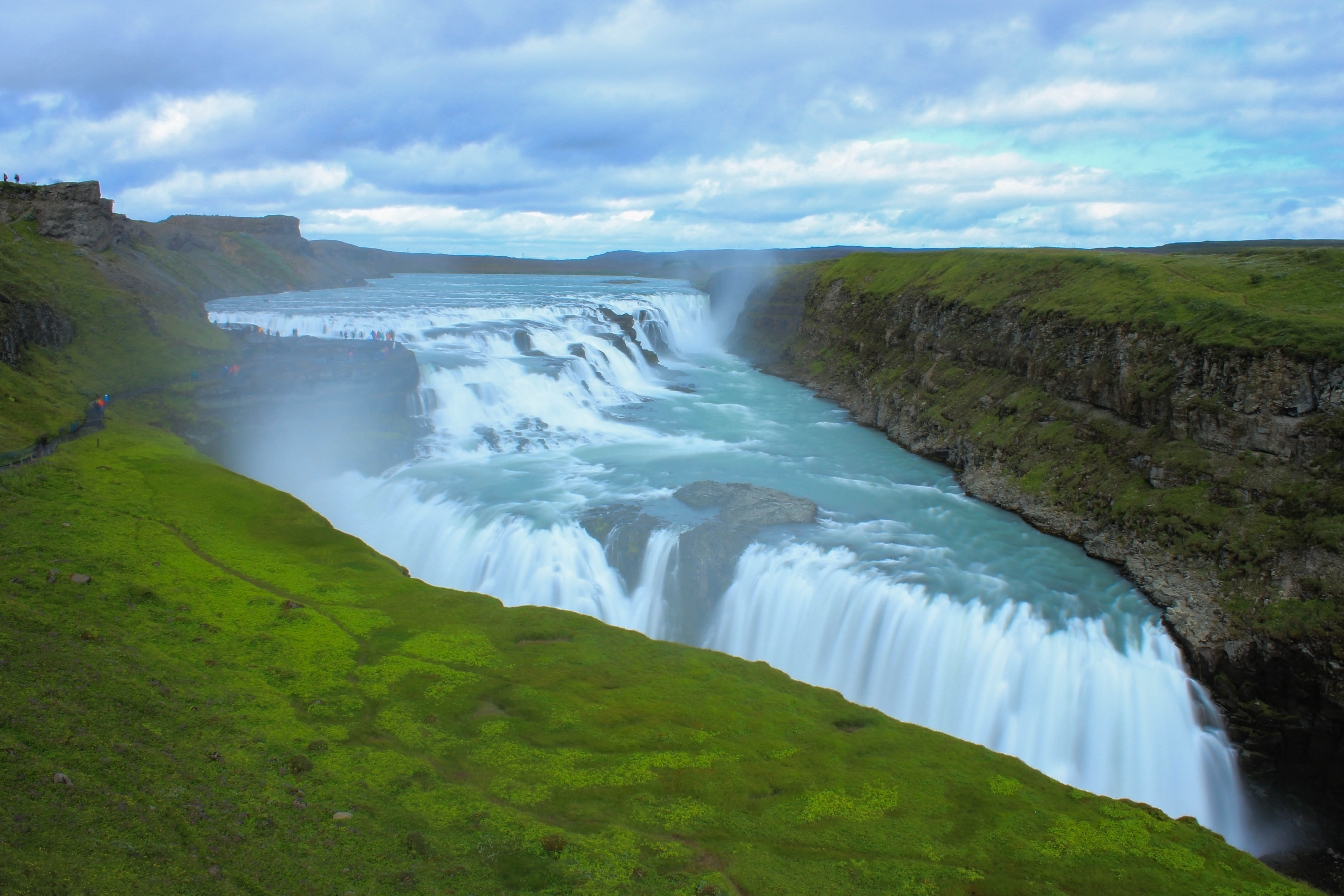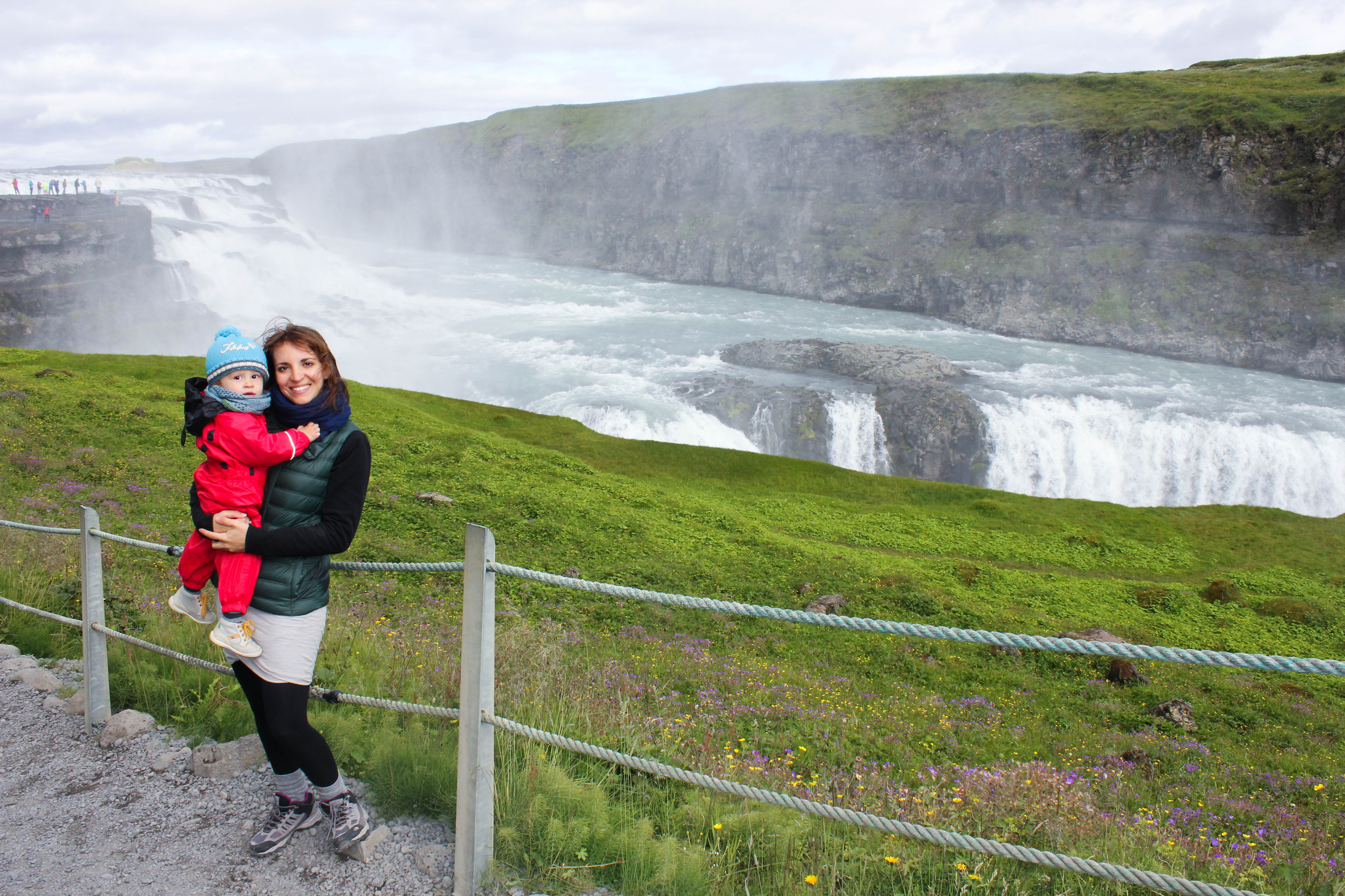 IMG_7337 IMG_7348 IMG_7373IMG_7336 IMG_7349 IMG_7357Ayant encore largement le temps de faire une halte, et c’est tant mieux, nous allons pouvoir retrouver l’une des cascade qui nous a le plus impressionné, à savoir Gulfoss. Le temps étant un peu plus dégagé que la première fois c’est une bonne occasion de faire de nouvelles photos de la cascade, même s’il semble y avoir un peu plus de monde que lors de notre première venue. Mais à vrai dire cela n’a pas vraiment d’importance, Gulfoss attire le regard dès qu’on l’aperçoit, et il est impossible de détourner son regard de cette majestueuse et impressionnante cascade. Léon est tout content de retrouver une cascade, lui qui aura passé la majeur partie du voyage à dire Wo Bist Du Wasserfall?!, littéralement Où es-tu la cascade?! en allemand.
