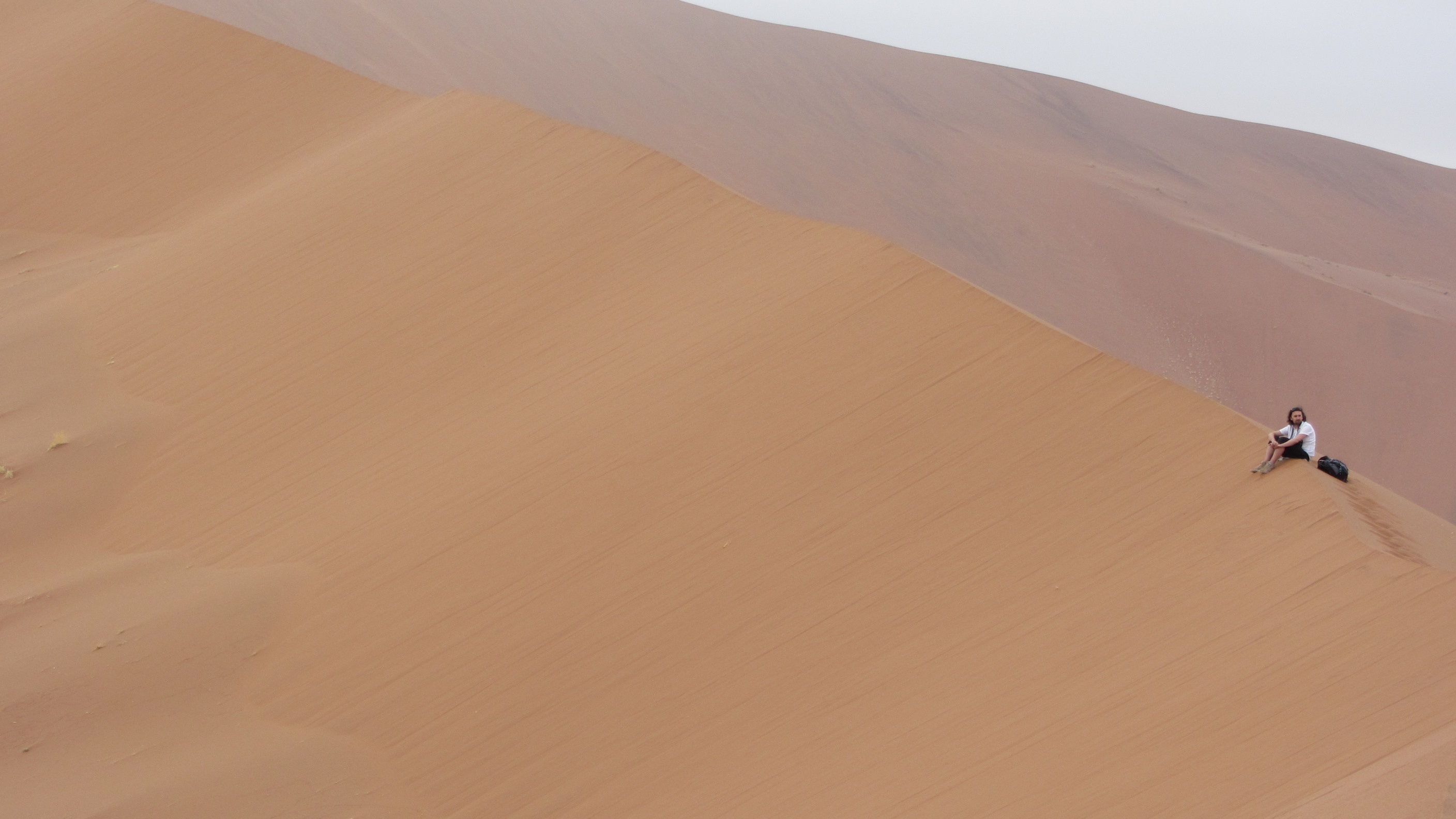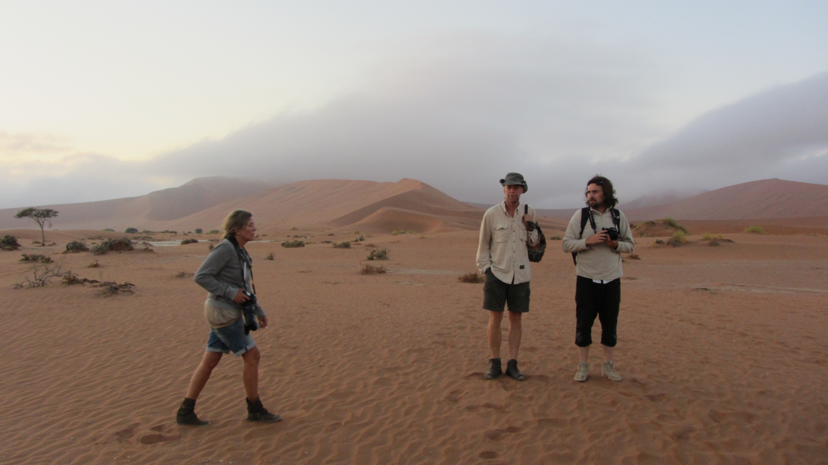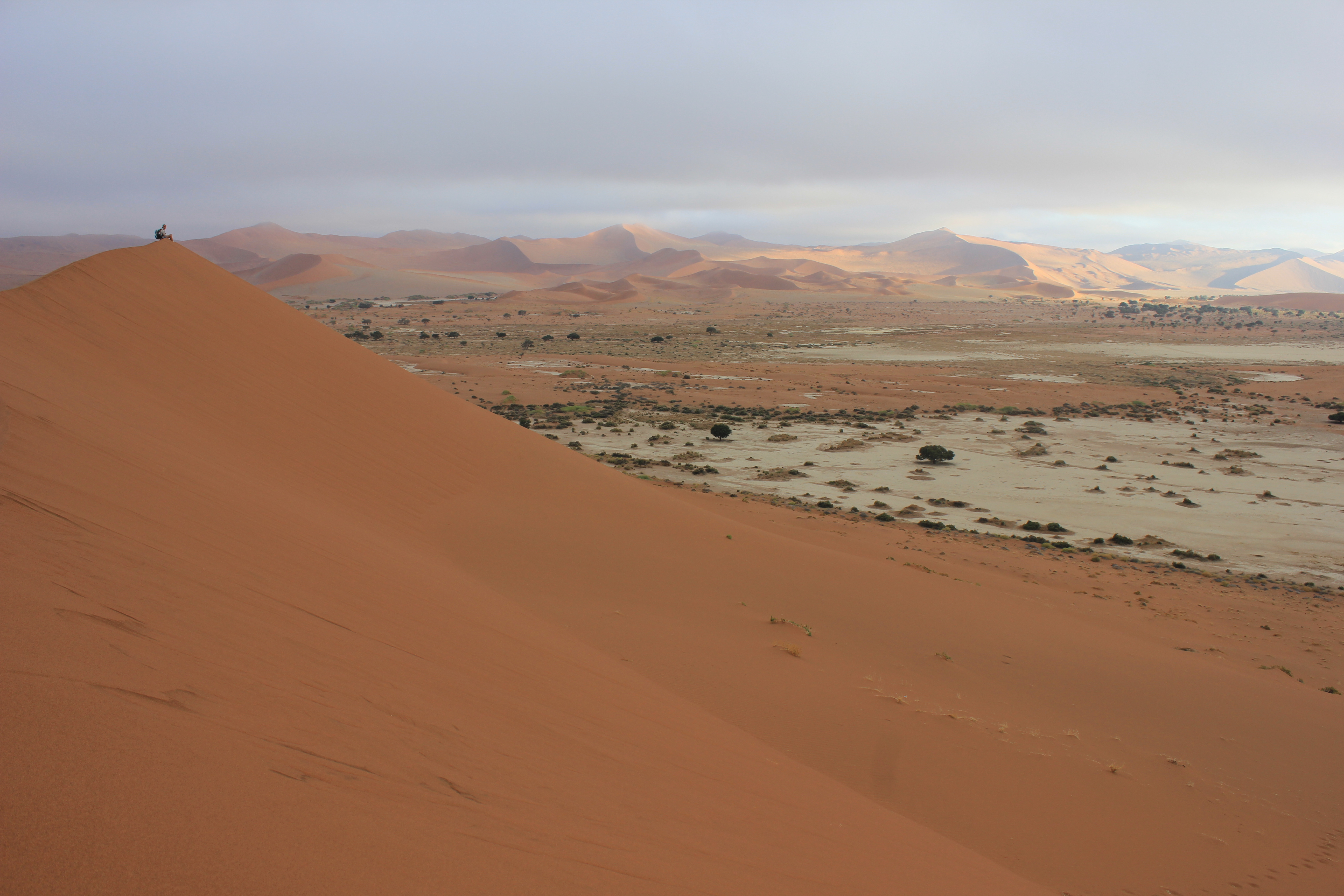 Il fait encore un petit peu frais quand nous nous mettons en route en direction de Big Daddy, la fameuse dune de Sossusvlei, qui n’est ni plus ni moins que la plus haute dune du monde avec une hauteur estimée à 400m… Mais nous ne nous chargeons pas trop, la chaleur va venir rapidement avec le soleil. Nous commençons à parcourir les premiers mètres sur la dune, et sommes envahis d’une irrésistible impression de grandeur. En effet, comme nous le pressentions, nous avons tout le site pour nous 4, soit un véritable privilège. Le calme est assourdissant, au même titre que les dunes de sable rouge, qui se dévoilent au fur et à mesure de notre ascension. Nous marchons donc sur la crête de la dune, et longeons Deadvlei, autre site au combien célèbre de la Namibie. Mais nous ne nous arrêtons pas pour le moment, les premières lueurs du soleil pointent à l’horizon, et malgré un ciel un peu nuageux, les couleurs se dévoilent au fil des minutes. Nous finissons par nous arrêter, pour nous installer à cheval sur le flanc de la dune, et admirer le soleil pointer le bout de ses rayons sur les dunes de Sossusvlei. Silence, magnificence du paysage, impression de grandeur… le temps semble s’arrêter littéralement pour nous, et nous contemplons les dunes pendant de longs moments. Même si nous sommes entre nous, nous chuchotons l’un à l’autre, pour ne pas troubler le calme ambiant. Il m’est difficile de mettre des mots sur ce que j’ai en face de moi à ce moment là, tant tout est grand, majestueux, et impressionnant. J’attendais avec beaucoup d’impatience de découvrir le site de Sossuvlei, et la surprise est à la hauteur de mes attentes. MAGIQUE!