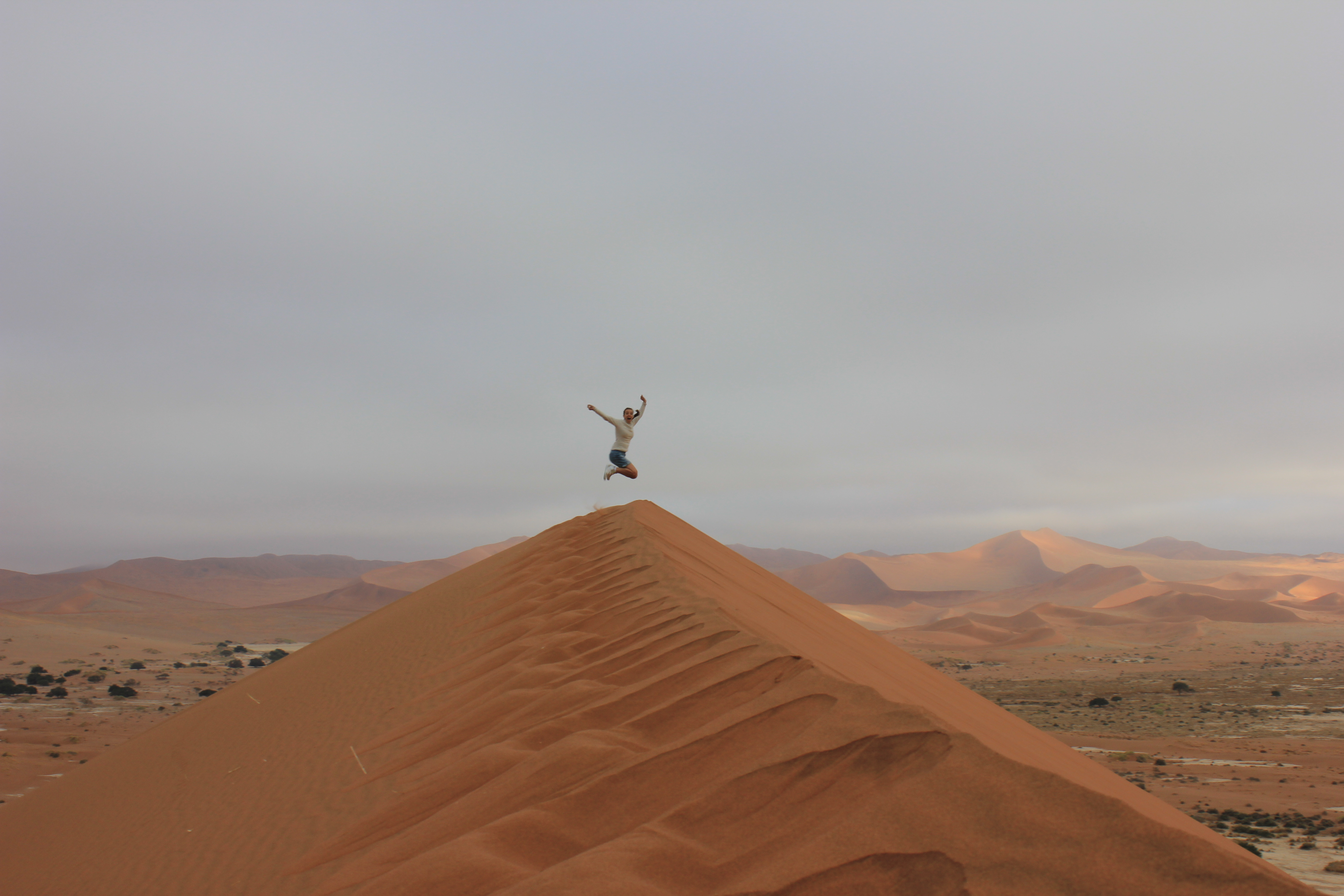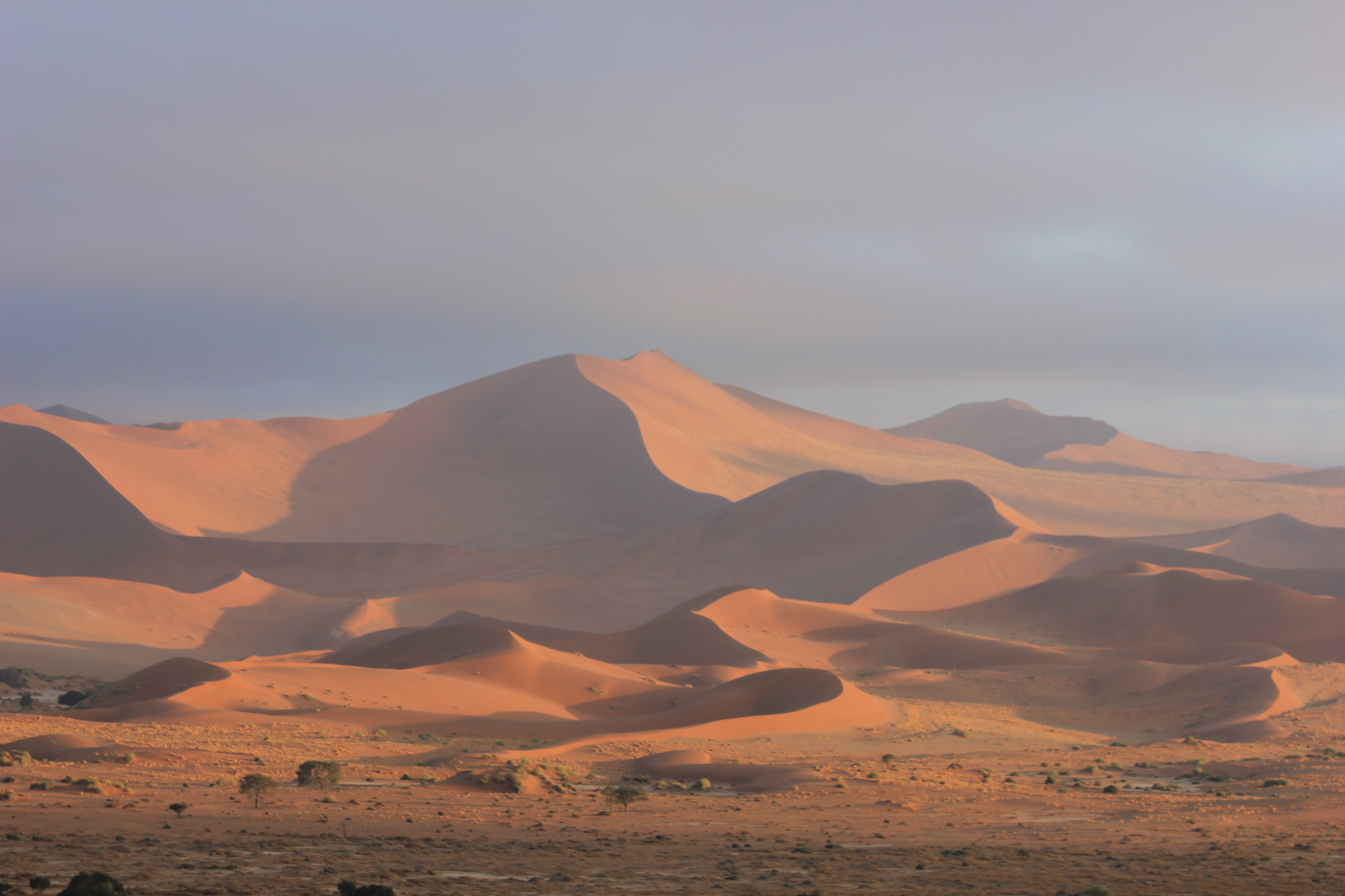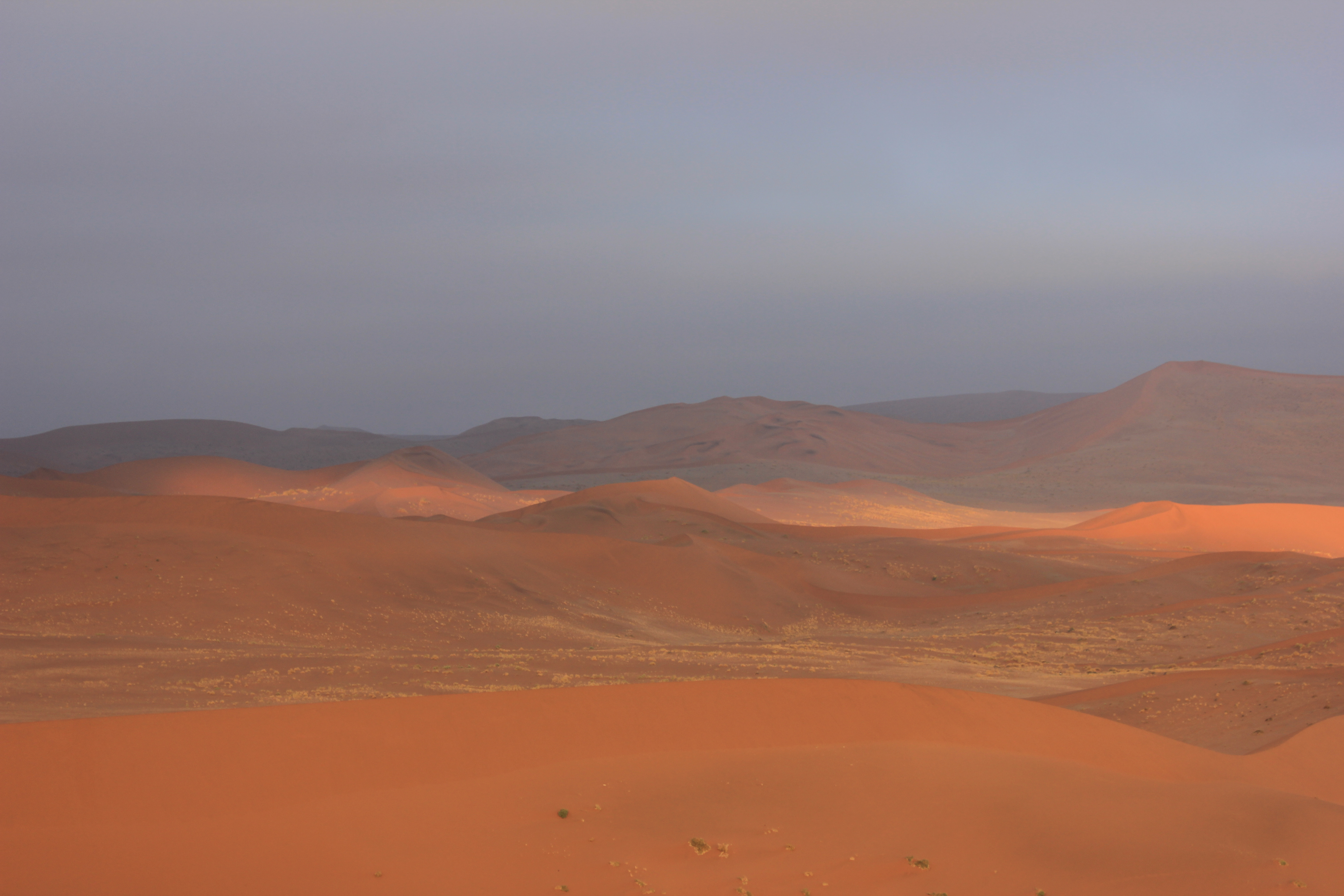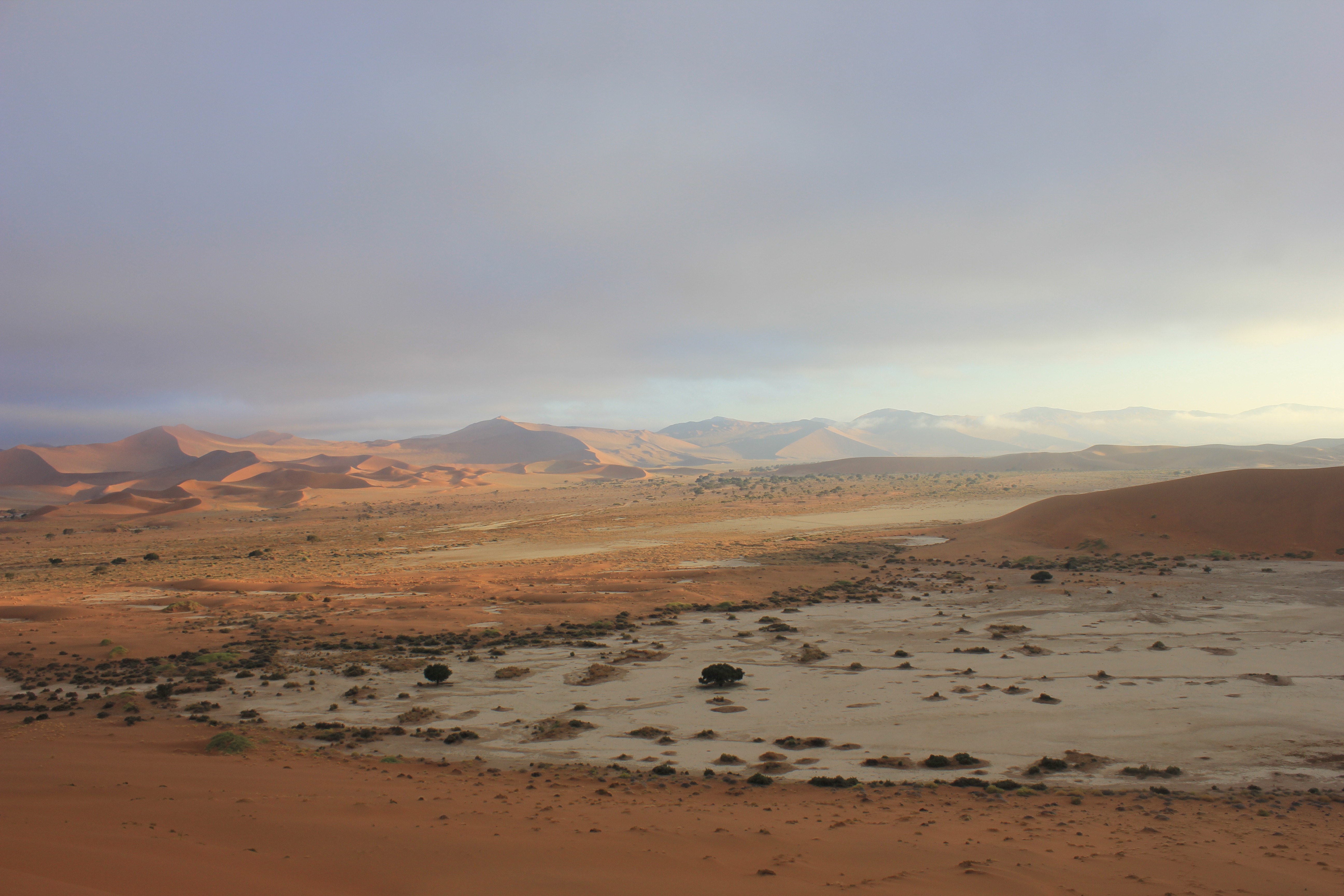 Il fait encore un petit peu frais quand nous nous mettons en route en direction de Big Daddy, la fameuse dune de Sossusvlei, qui n’est ni plus ni moins que la plus haute dune du monde avec une hauteur estimée à 400m… Mais nous ne nous chargeons pas trop, la chaleur va venir rapidement avec le soleil. Nous commençons à parcourir les premiers mètres sur la dune, et sommes envahis d’une irrésistible impression de grandeur. En effet, comme nous le pressentions, nous avons tout le site pour nous 4, soit un véritable privilège. Le calme est assourdissant, au même titre que les dunes de sable rouge, qui se dévoilent au fur et à mesure de notre ascension. Nous marchons donc sur la crête de la dune, et longeons Deadvlei, autre site au combien célèbre de la Namibie. Mais nous ne nous arrêtons pas pour le moment, les premières lueurs du soleil pointent à l’horizon, et malgré un ciel un peu nuageux, les couleurs se dévoilent au fil des minutes. Nous finissons par nous arrêter, pour nous installer à cheval sur le flanc de la dune, et admirer le soleil pointer le bout de ses rayons sur les dunes de Sossusvlei. Silence, magnificence du paysage, impression de grandeur… le temps semble s’arrêter littéralement pour nous, et nous contemplons les dunes pendant de longs moments. Même si nous sommes entre nous, nous chuchotons l’un à l’autre, pour ne pas troubler le calme ambiant. Il m’est difficile de mettre des mots sur ce que j’ai en face de moi à ce moment là, tant tout est grand, majestueux, et impressionnant. J’attendais avec beaucoup d’impatience de découvrir le site de Sossuvlei, et la surprise est à la hauteur de mes attentes. MAGIQUE!