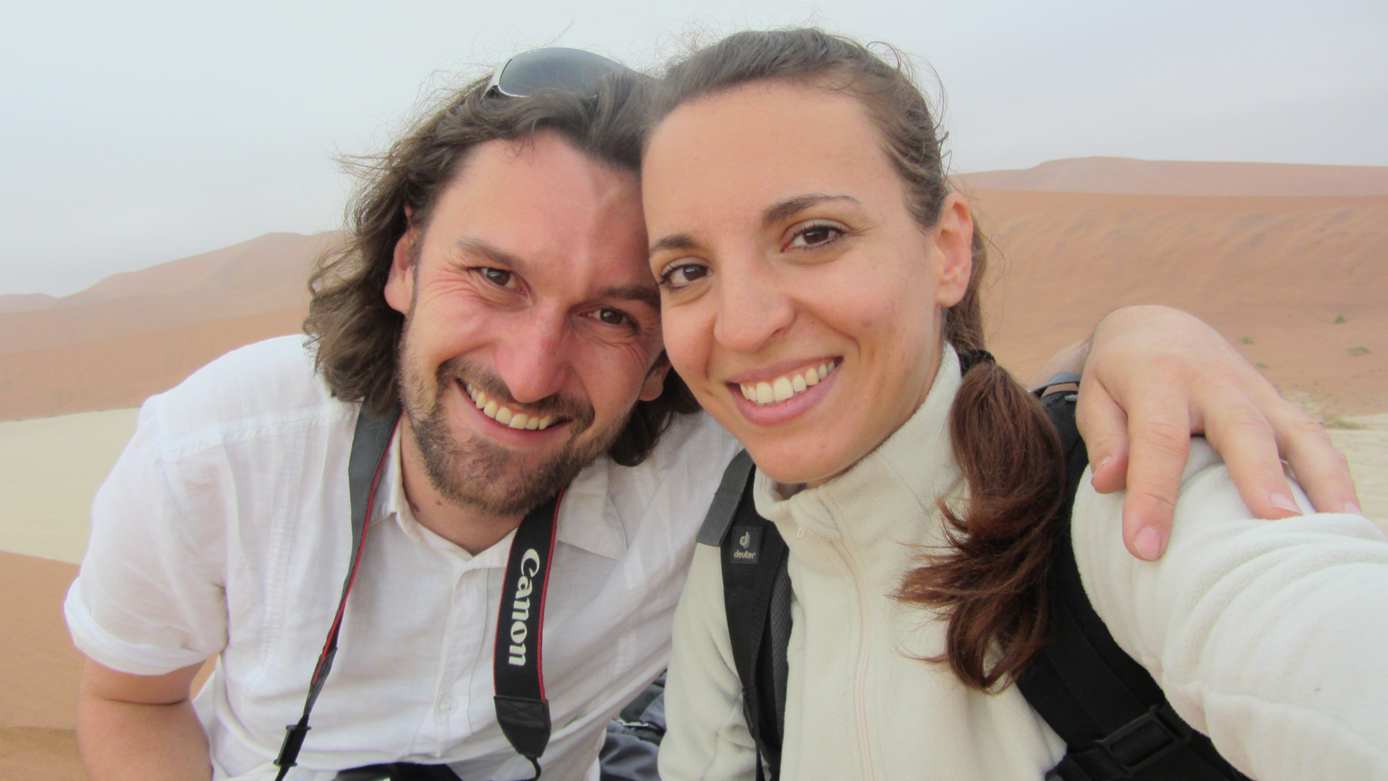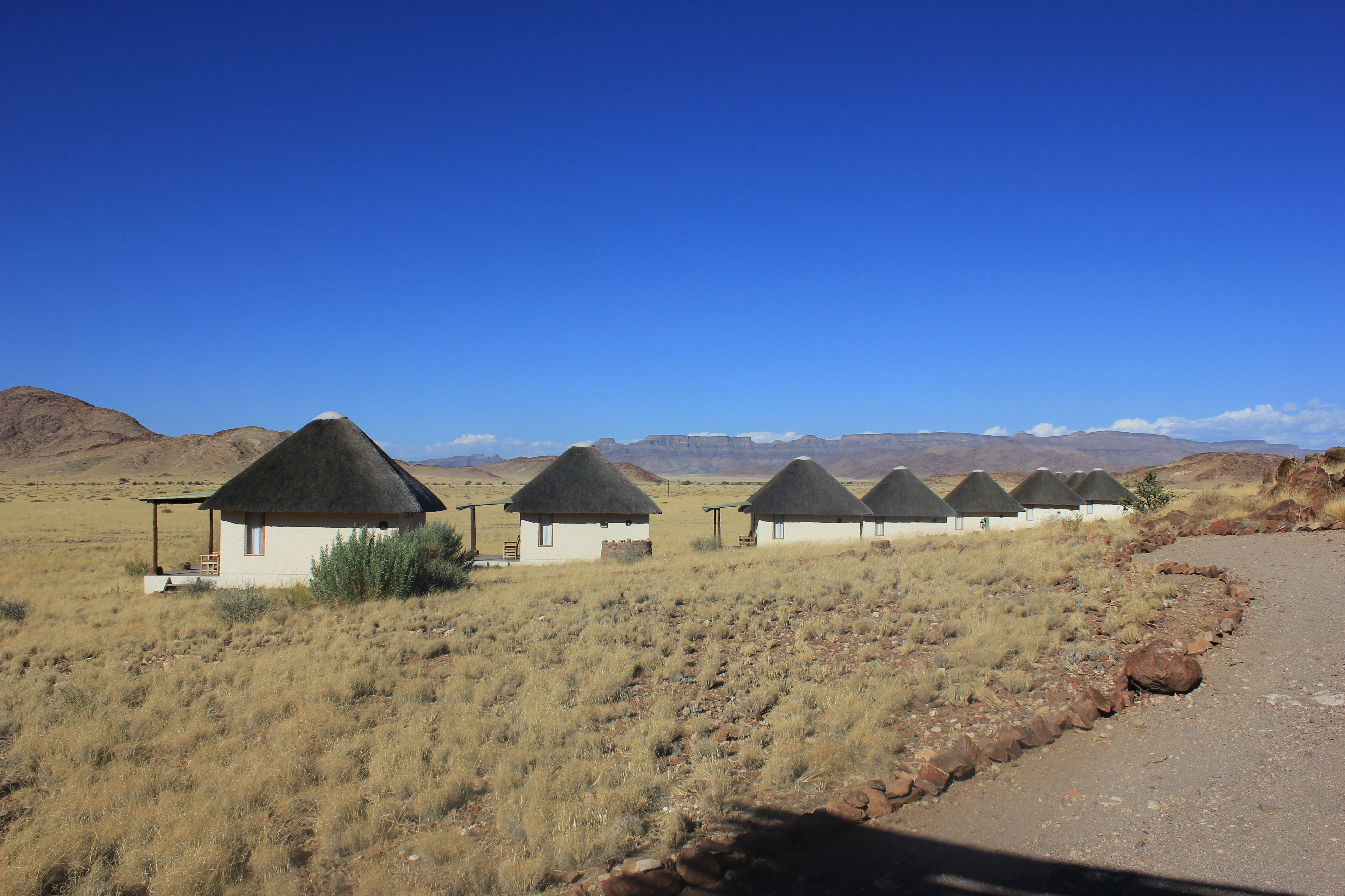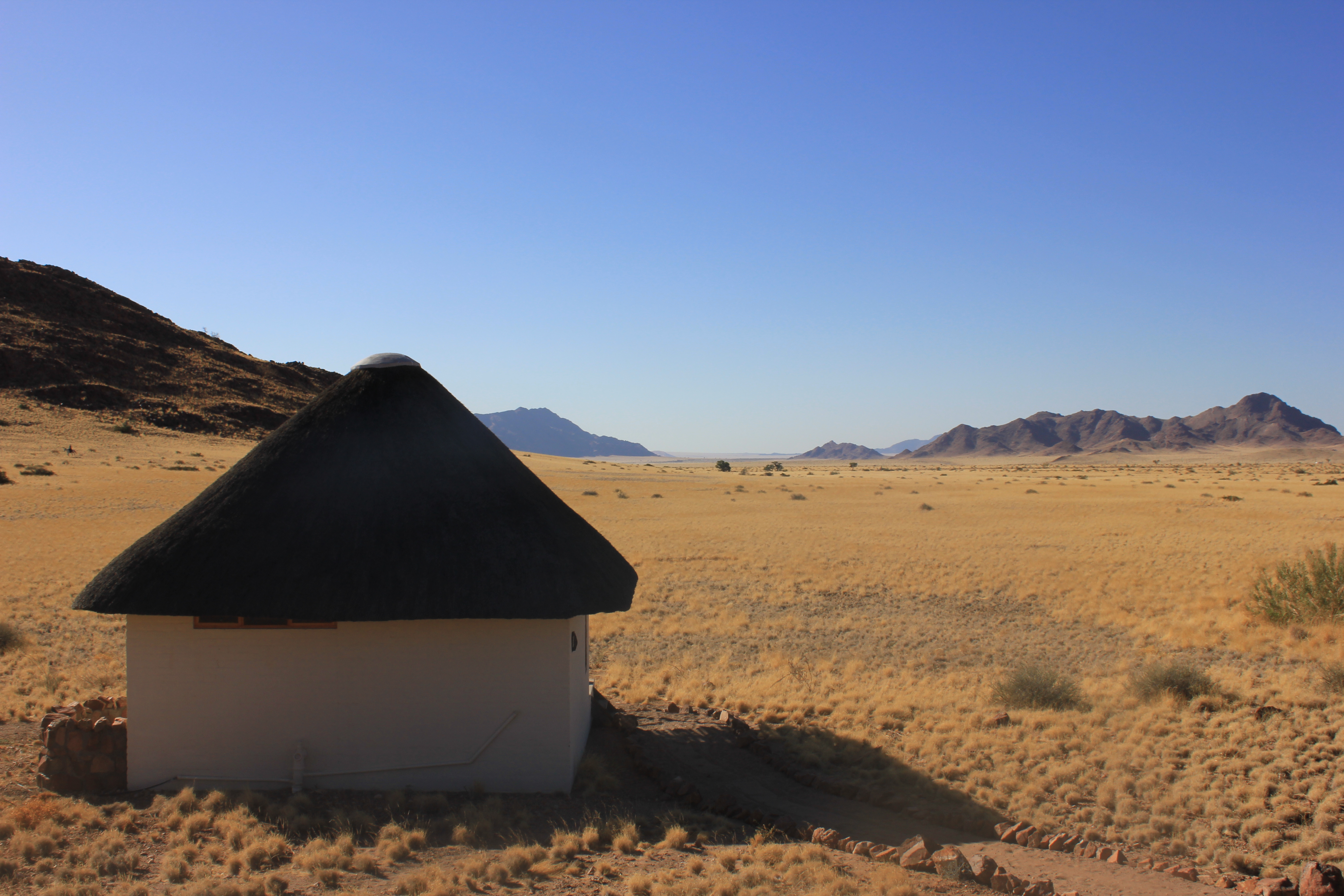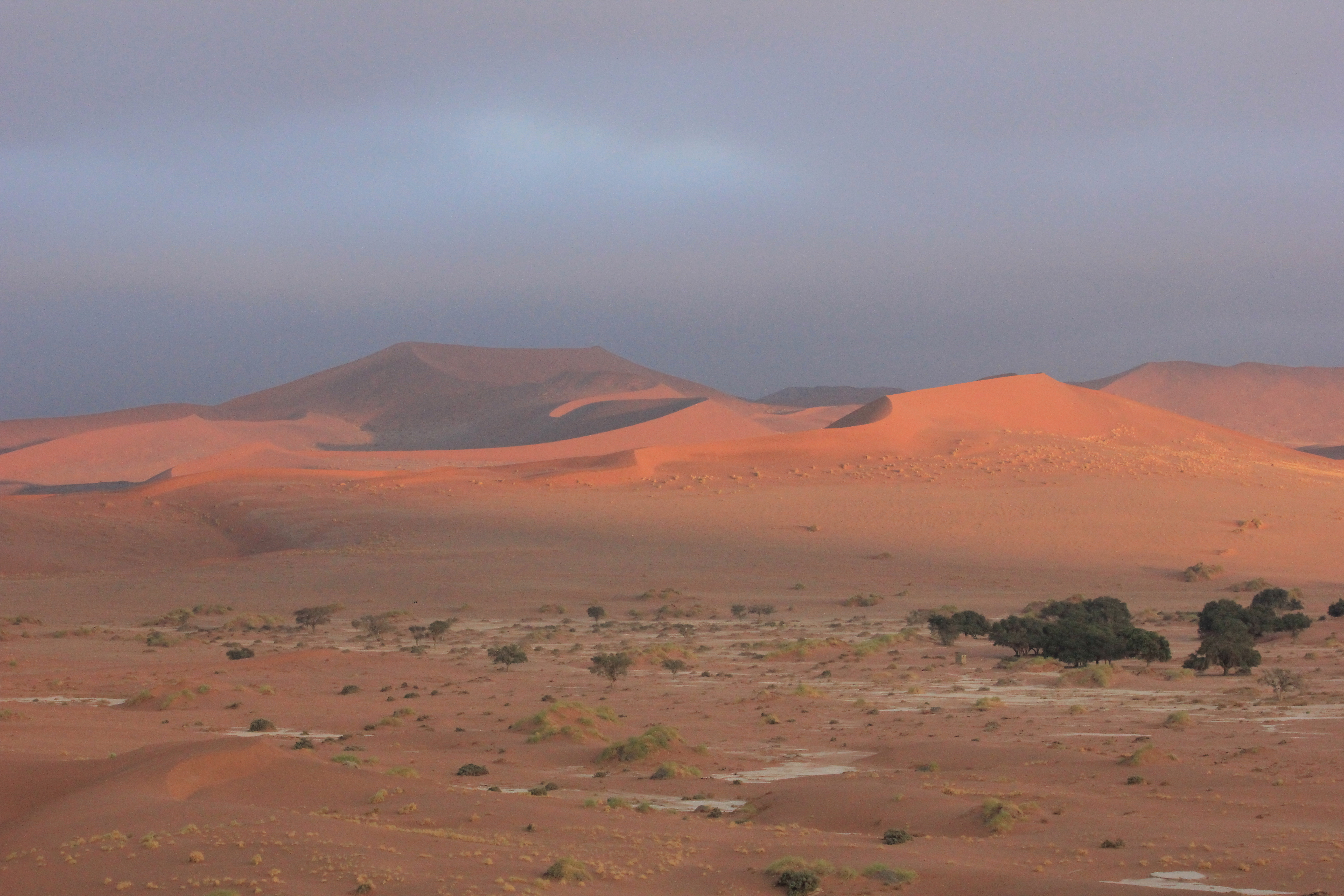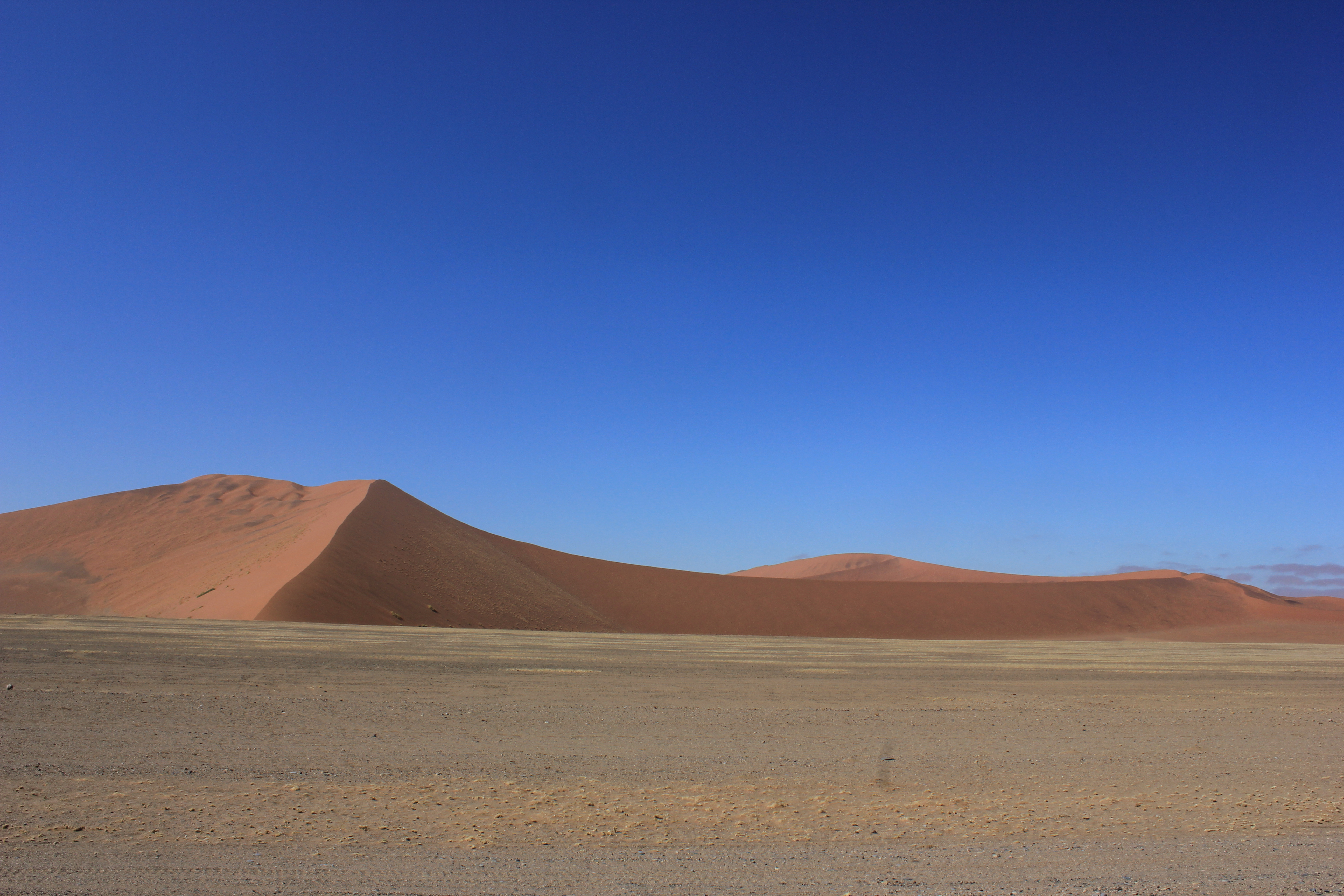 Pour cette nouvelle journée de notre voyage de noces en Namibie, la découverte du site de Sossusvlei et de Deadvlei constituait un point culminant pour nous, au même titre que la découverte du parc d’Etosha. Il faut dire que rien qu’en se renseignant sur internet, il est possible de trouver des photos absolument splendides et qui laissent rêveuses. C’est donc dans un contexte d’impatience mêlée à de la curiosité que nous nous réveillons comme prévu à 4H45. Ayant l’habitude de me réveiller à des heures bien matinales dans le cadre de mon travail, je ne suis pas trop perturbé par ce réveil, par contre pour les personnes non initiées à ce genre de petits plaisirs, les réflexes sont difficiles à prendre. Je prends donc naturellement les choses en main pour laisser Nathalie se réveiller calmement, et prépare un petit déjeuner light. Il faut dire qu’à cette heure-ci, nos estomacs ne réclament pas pitance, et qu’un bon café couplé avec un jus d’orange bien frais feront largement l’affaire pour le moment. Nous apercevons également les premiers signes de vie sur le campement voisin, signe que nous sommes dans les temps et que tout se passe bien.